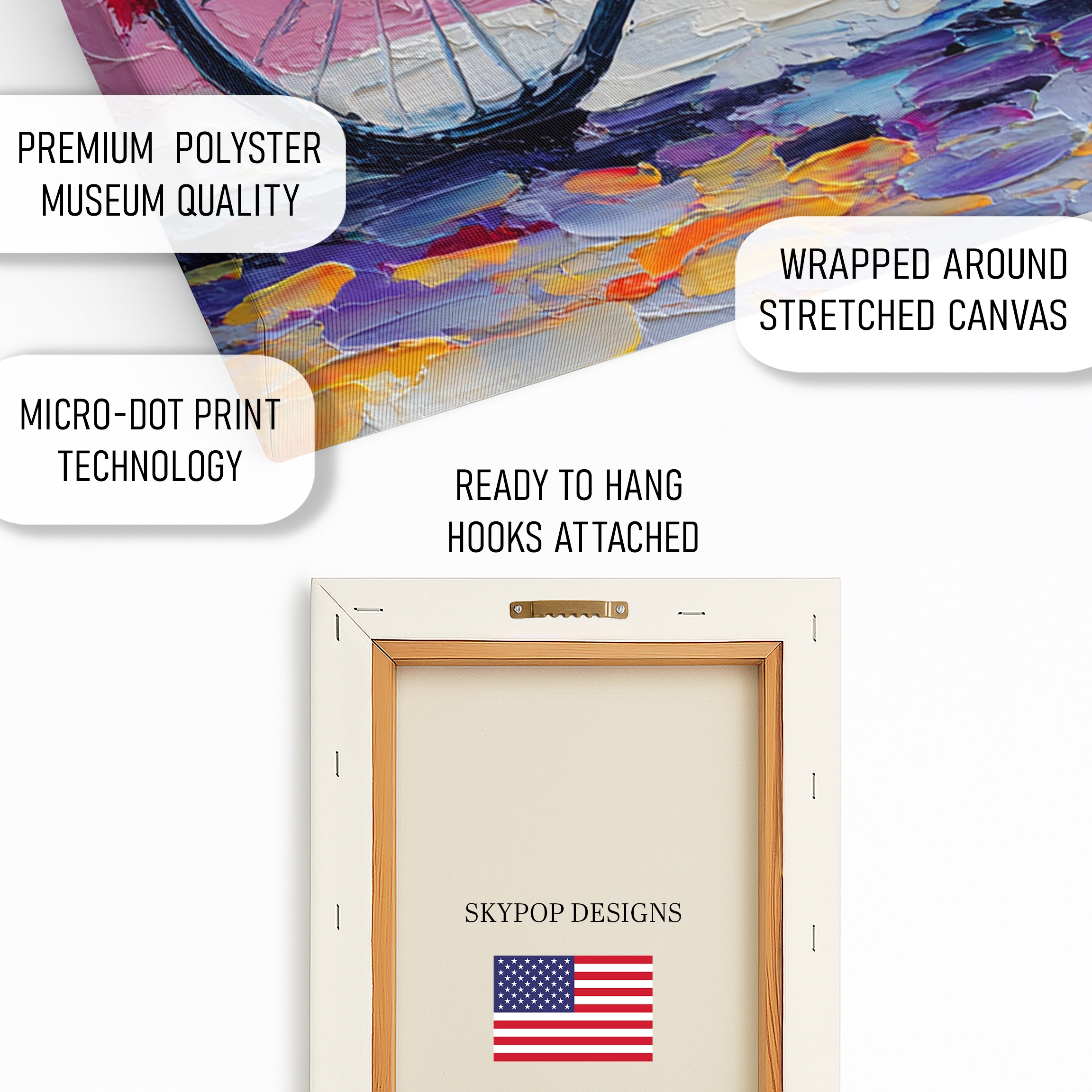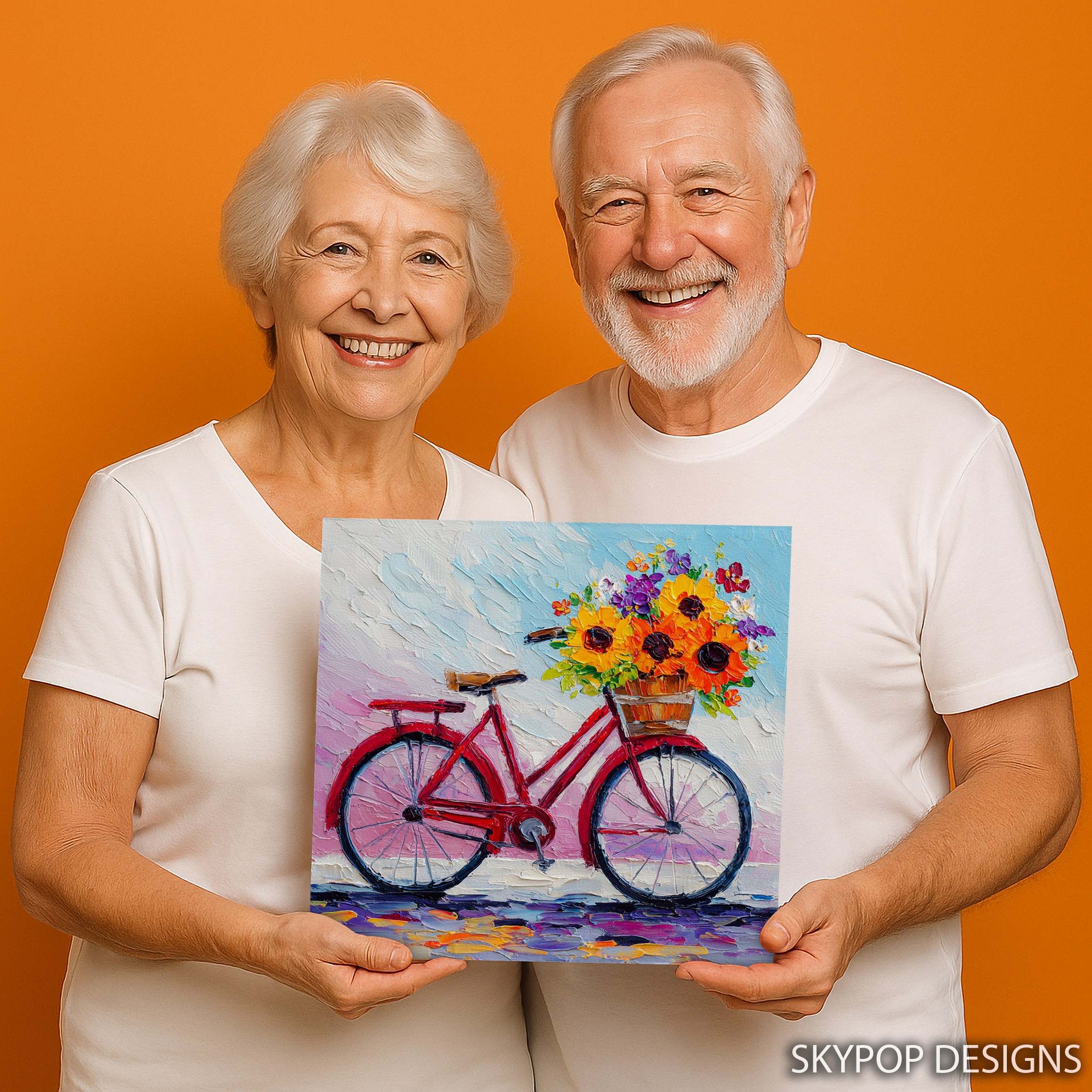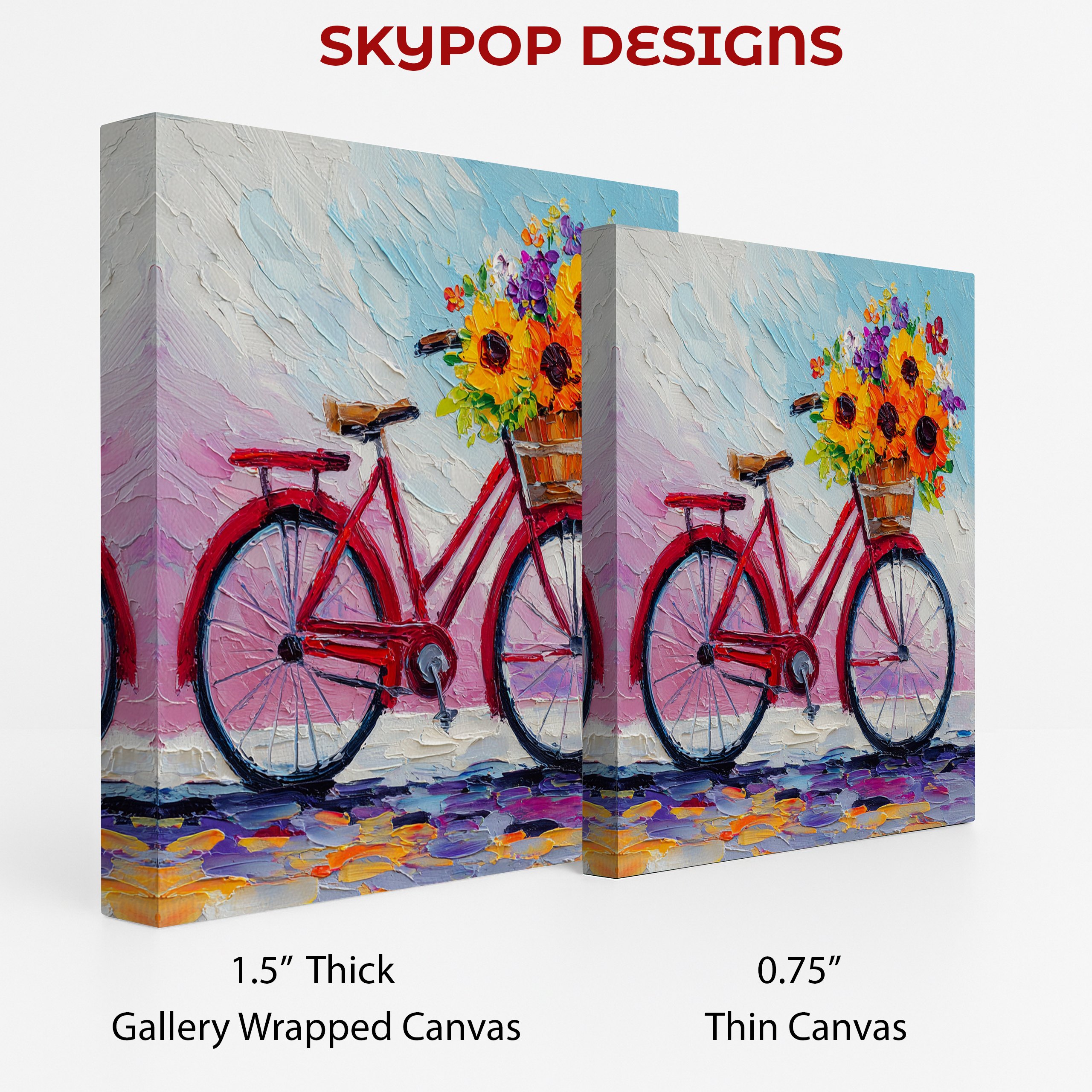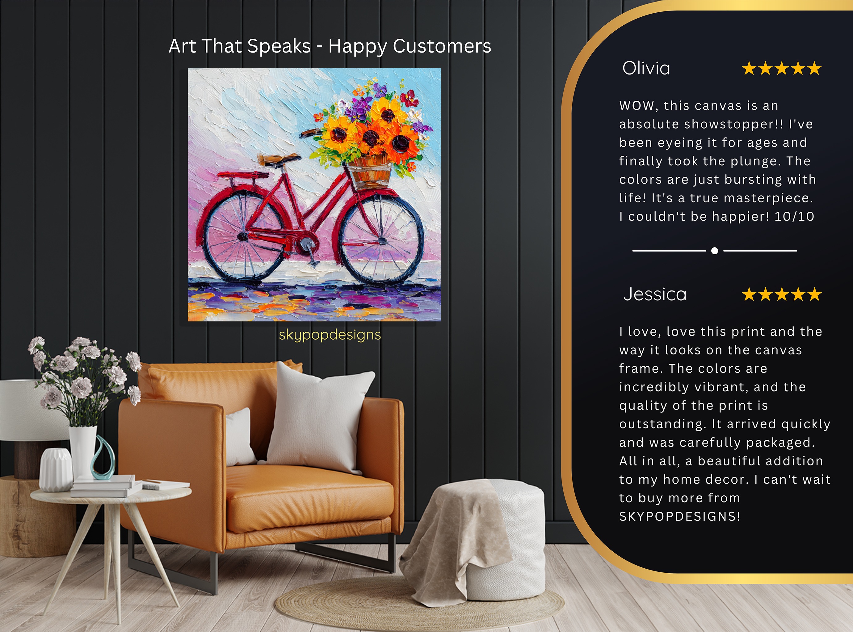 Brighten your space with this vibrant sunflower bicycle canvas wall art that instantly transports you to a cheerful countryside scene. This eye-catching poster or canvas print features a bold red bicycle adorned with a basket overflowing with radiant sunflowers and colorful wildflowers. The textured brushstrokes and vivid palette create a stunning focal point, perfect for adding a pop of color to farmhouse-style living rooms or rustic bedrooms. The combination of the classic bicycle and lush florals evokes a sense of carefree summer days, making it an ideal piece for sunrooms or entryways seeking a touch of whimsy. The impressionistic style captures the play of light and shadow, giving depth and movement to the scene. This versatile artwork complements shabby chic decor, infusing spaces with warmth and charm. The striking red bicycle against a soft pastel background creates a delightful contrast that draws the eye and lifts the mood. Whether you’re looking to refresh your seasonal decor or searching for the perfect housewarming gift, this canvas wall art offers a timeless appeal that celebrates the simple joys of life. The high-quality printing ensures every detail, from the delicate flower petals to the bicycle’s rustic texture, is beautifully preserved. Transform your home with this enchanting blend of floral beauty and nostalgic charm – add this delightful bicycle art to your wall today and let its joyful energy brighten your everyday moments.