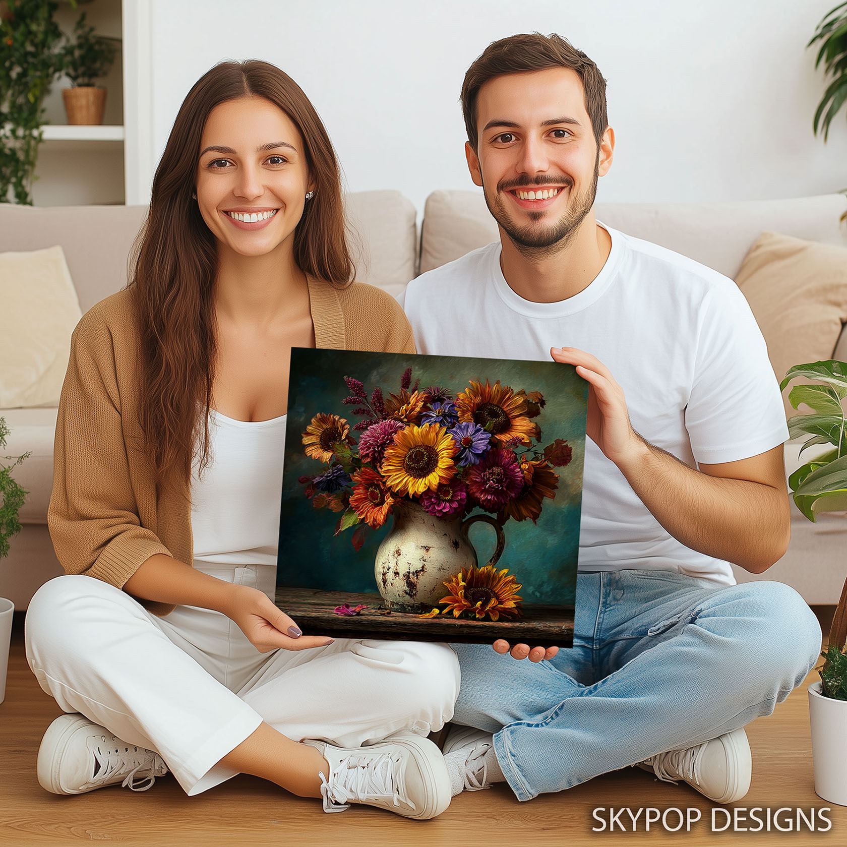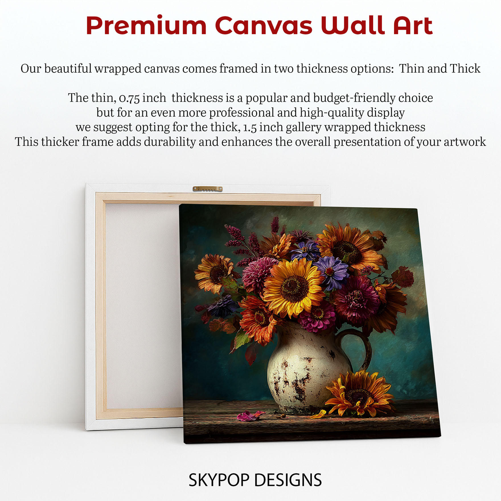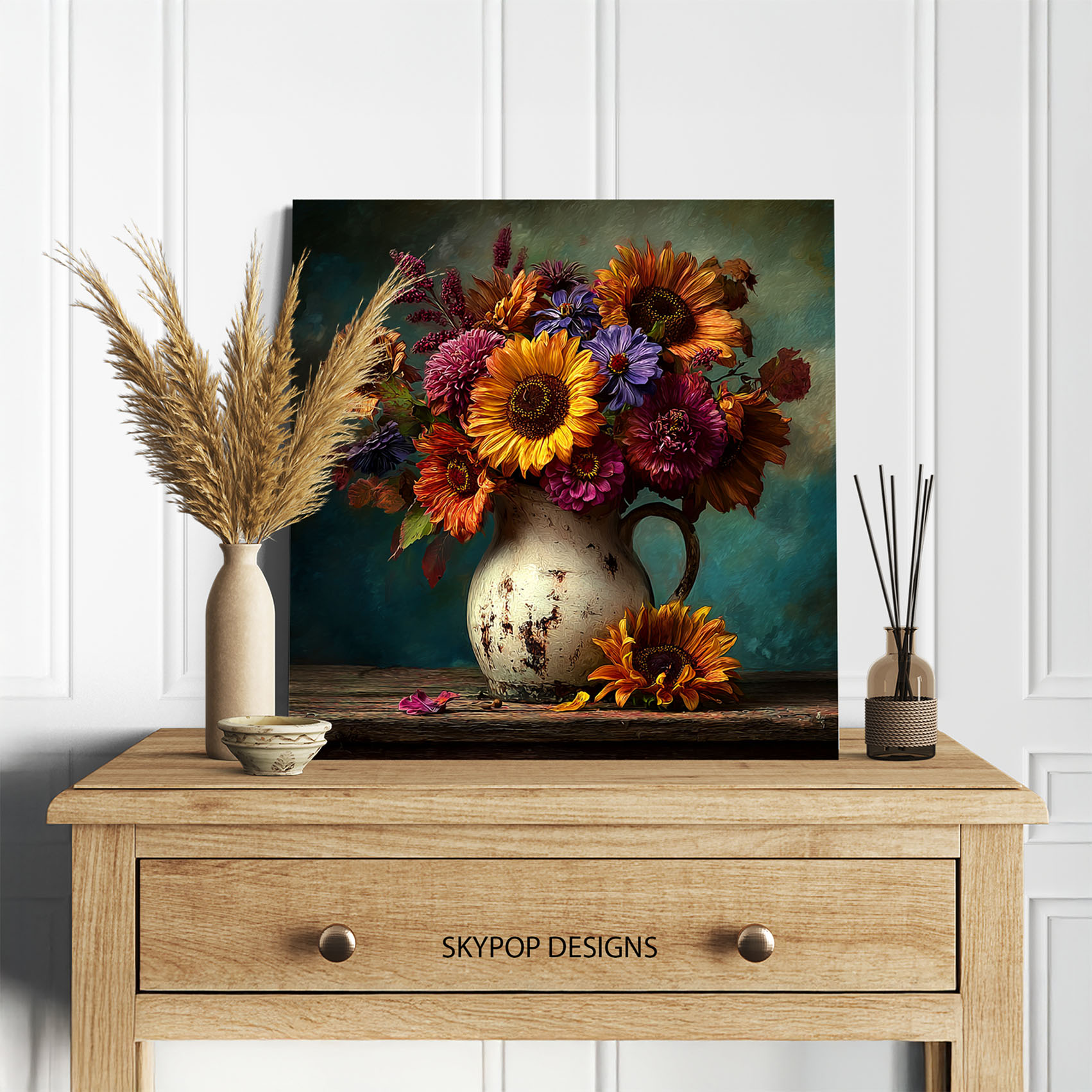 Transform your space with this stunning sunflower canvas wall art, showcasing a vibrant harvest bouquet in a rustic pitcher. This poster or canvas wall art is perfect for creating a warm and inviting atmosphere in your living room or dining room. The rich oranges, yellows, and teals of the sunflowers and dahlias create a striking visual, invoking feelings of abundance and natural beauty. Ideal for farmhouse and rustic decor styles, this floral artwork adds a touch of country charm to any home. Bohemian enthusiasts will appreciate the eclectic mix of colors and the textured, painterly quality of this wall art. The striking sunflower blooms, surrounded by complementary dahlias and foliage, make a captivating focal point in any room. High-quality printing ensures all the intricate details and vibrant hues of this floral canvas art are beautifully preserved on your chosen canvas or poster. This versatile piece works wonderfully as entryway decor or as a cheerful addition to your kitchen, enhancing rustic kitchen wall decor. It’s a perfect gift for housewarmings, birthdays, or fall holidays, bringing lasting beauty and warmth to a loved one’s home. The bold color palette complements a variety of interiors, from cozy farmhouse settings to eclectic bohemian spaces. Elevate your home’s aesthetic with this beautiful floral wall art collection, celebrating the enduring beauty of nature’s bounty. Add a harvest of joy to your walls today.