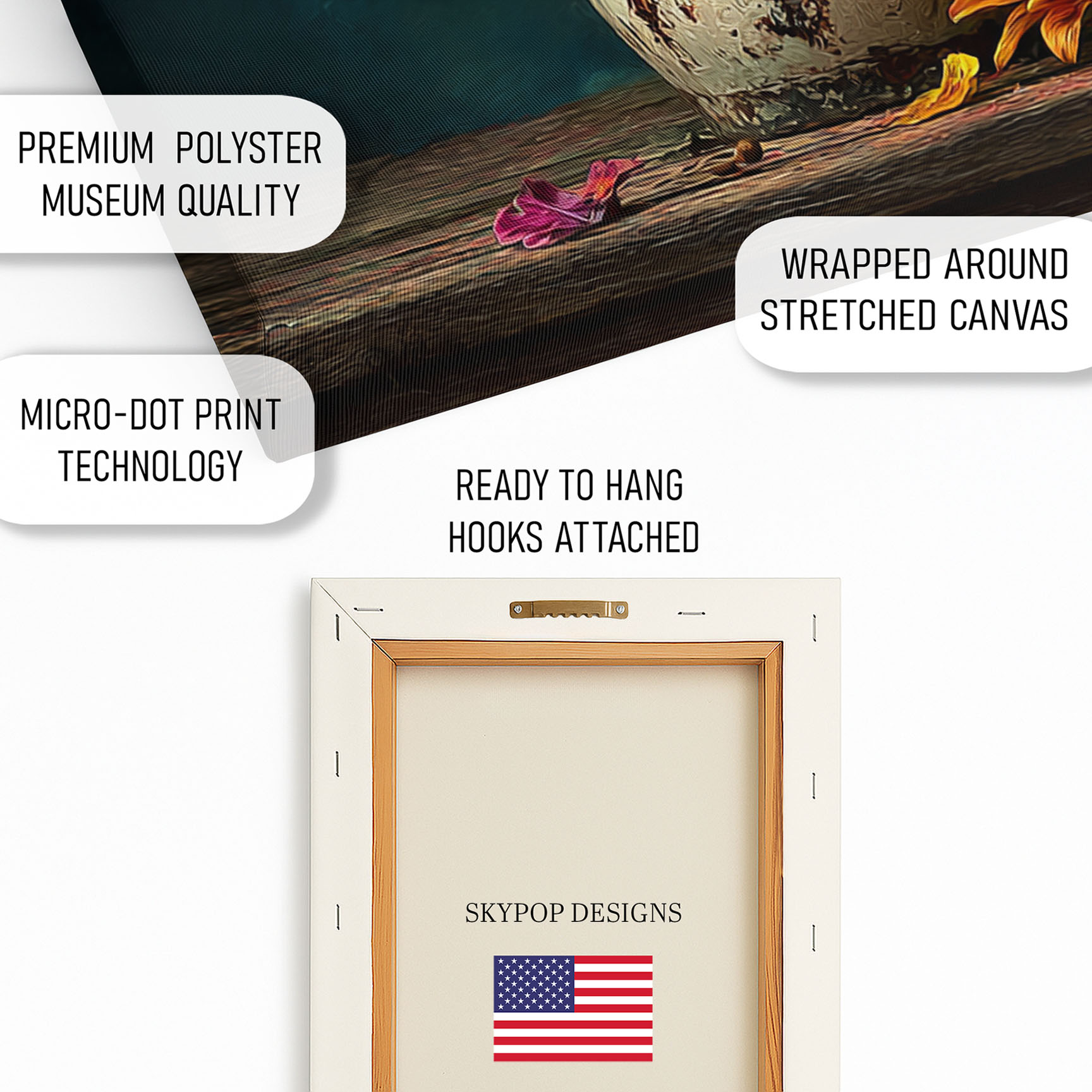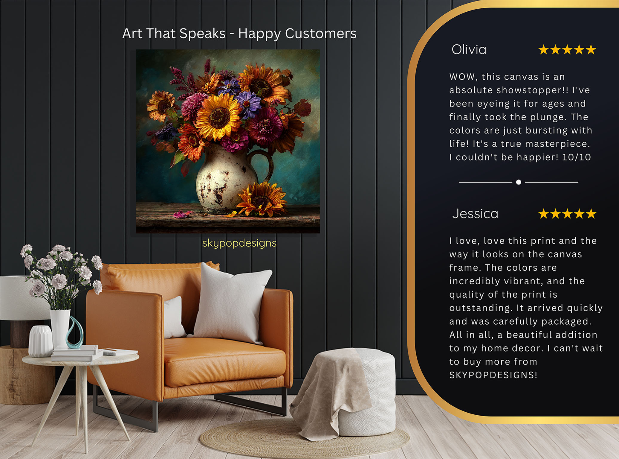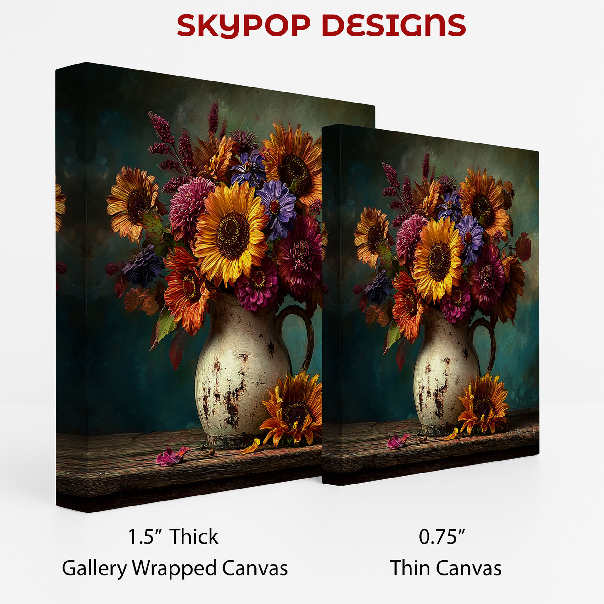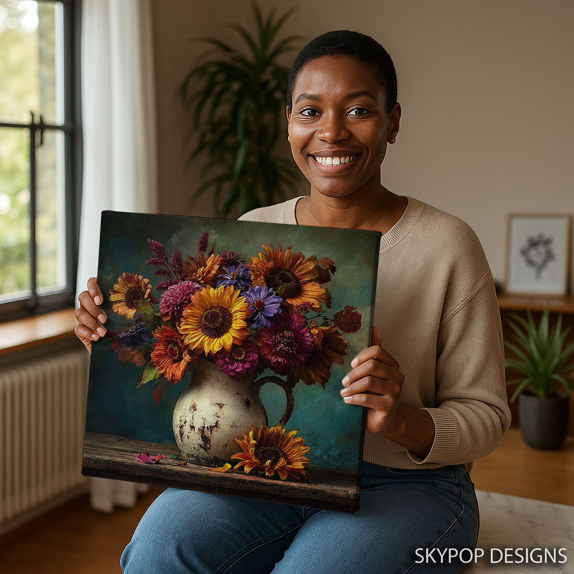 Transform your space with this stunning sunflower canvas wall art, showcasing a vibrant harvest bouquet in a rustic pitcher. This poster or canvas wall art is perfect for creating a warm and inviting atmosphere in your living room or dining room. The rich oranges, yellows, and teals of the sunflowers and dahlias create a striking visual, invoking feelings of abundance and natural beauty. Ideal for farmhouse and rustic decor styles, this floral artwork adds a touch of country charm to any home. Bohemian enthusiasts will appreciate the eclectic mix of colors and the textured, painterly quality of this wall art. The striking sunflower blooms, surrounded by complementary dahlias and foliage, make a captivating focal point in any room. High-quality printing ensures all the intricate details and vibrant hues of this floral canvas art are beautifully preserved on your chosen canvas or poster. This versatile piece works wonderfully as entryway decor or as a cheerful addition to your kitchen, enhancing rustic kitchen wall decor. It’s a perfect gift for housewarmings, birthdays, or fall holidays, bringing lasting beauty and warmth to a loved one’s home. The bold color palette complements a variety of interiors, from cozy farmhouse settings to eclectic bohemian spaces. Elevate your home’s aesthetic with this beautiful floral wall art collection, celebrating the enduring beauty of nature’s bounty. Add a harvest of joy to your walls today.