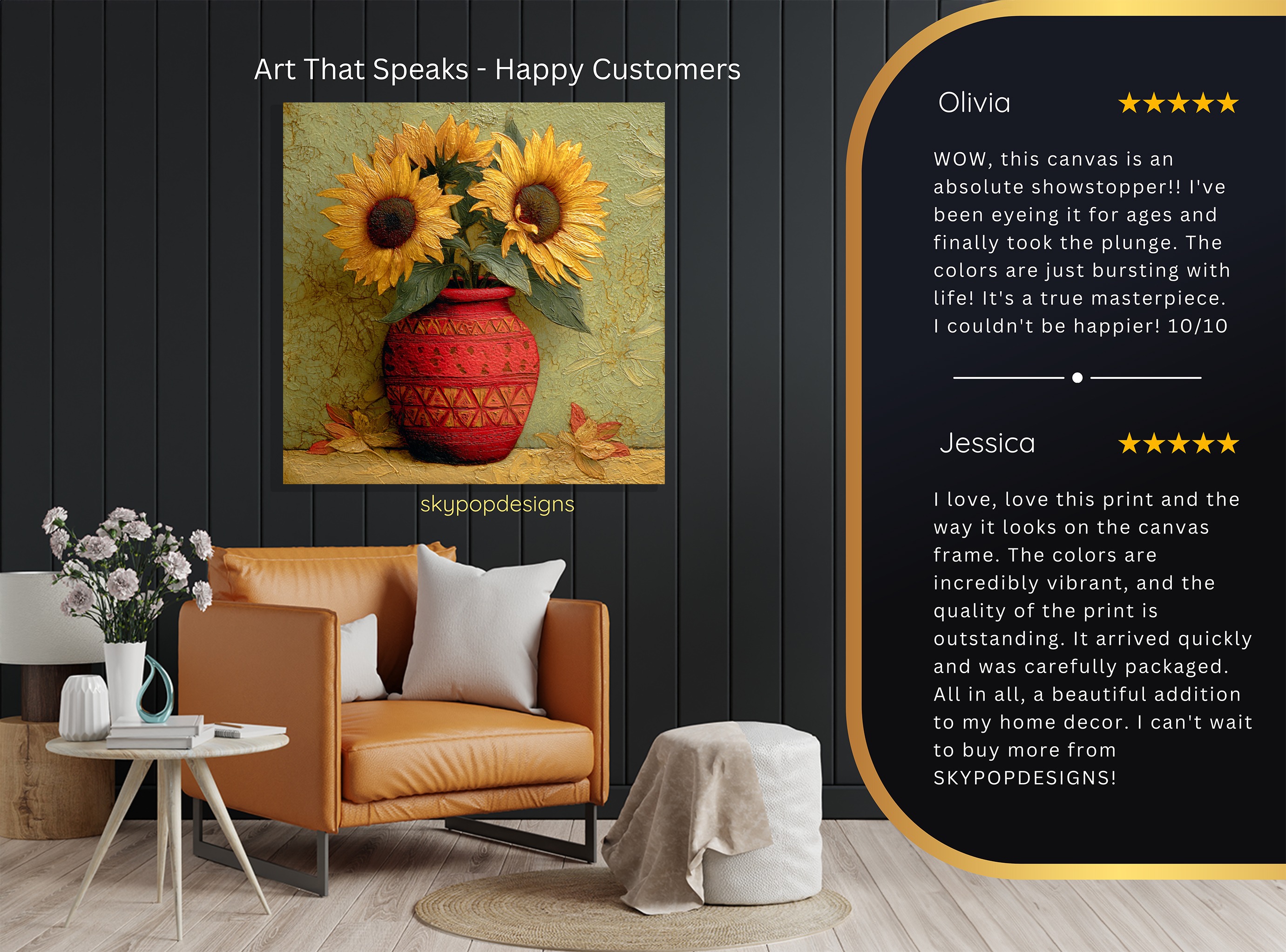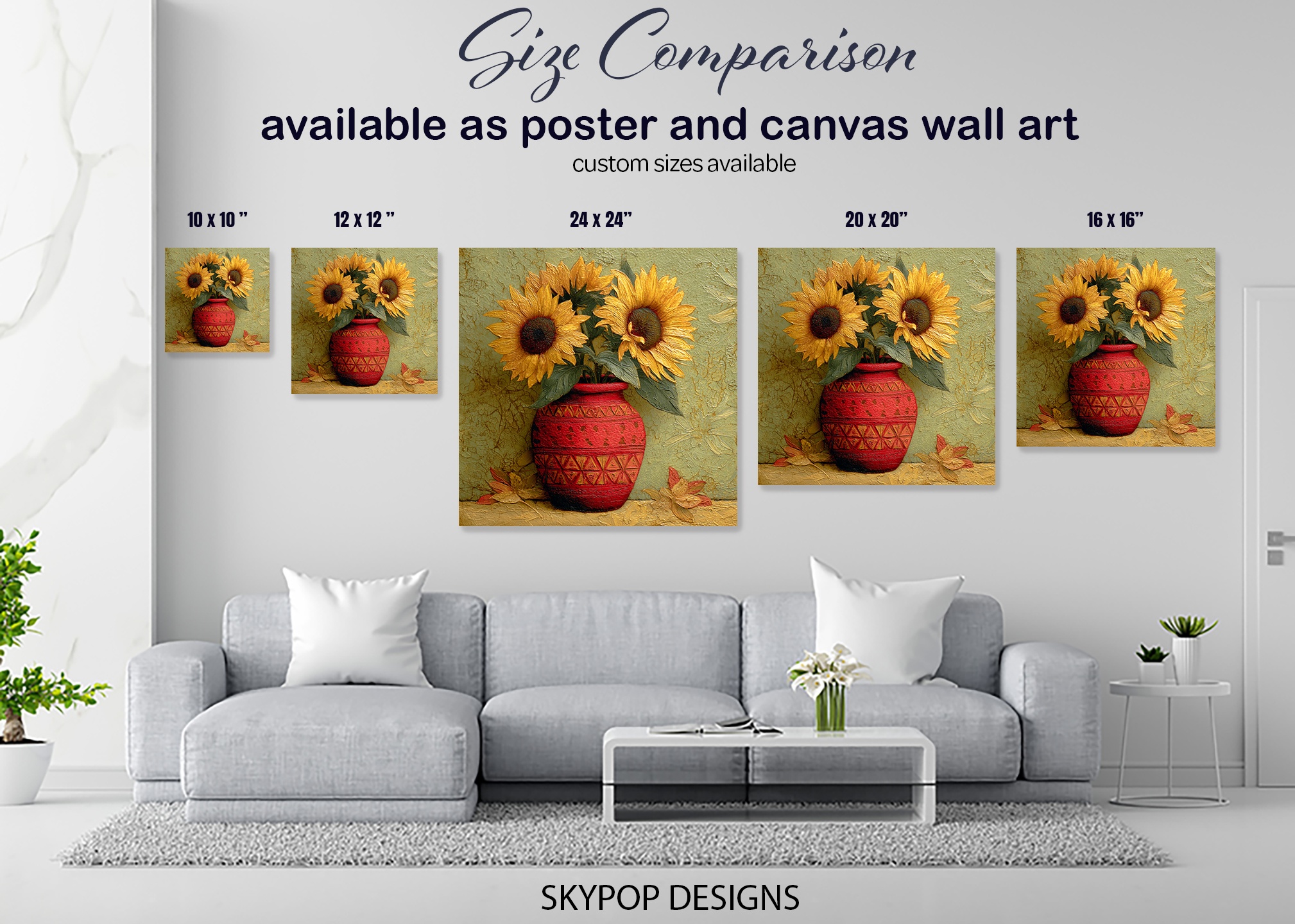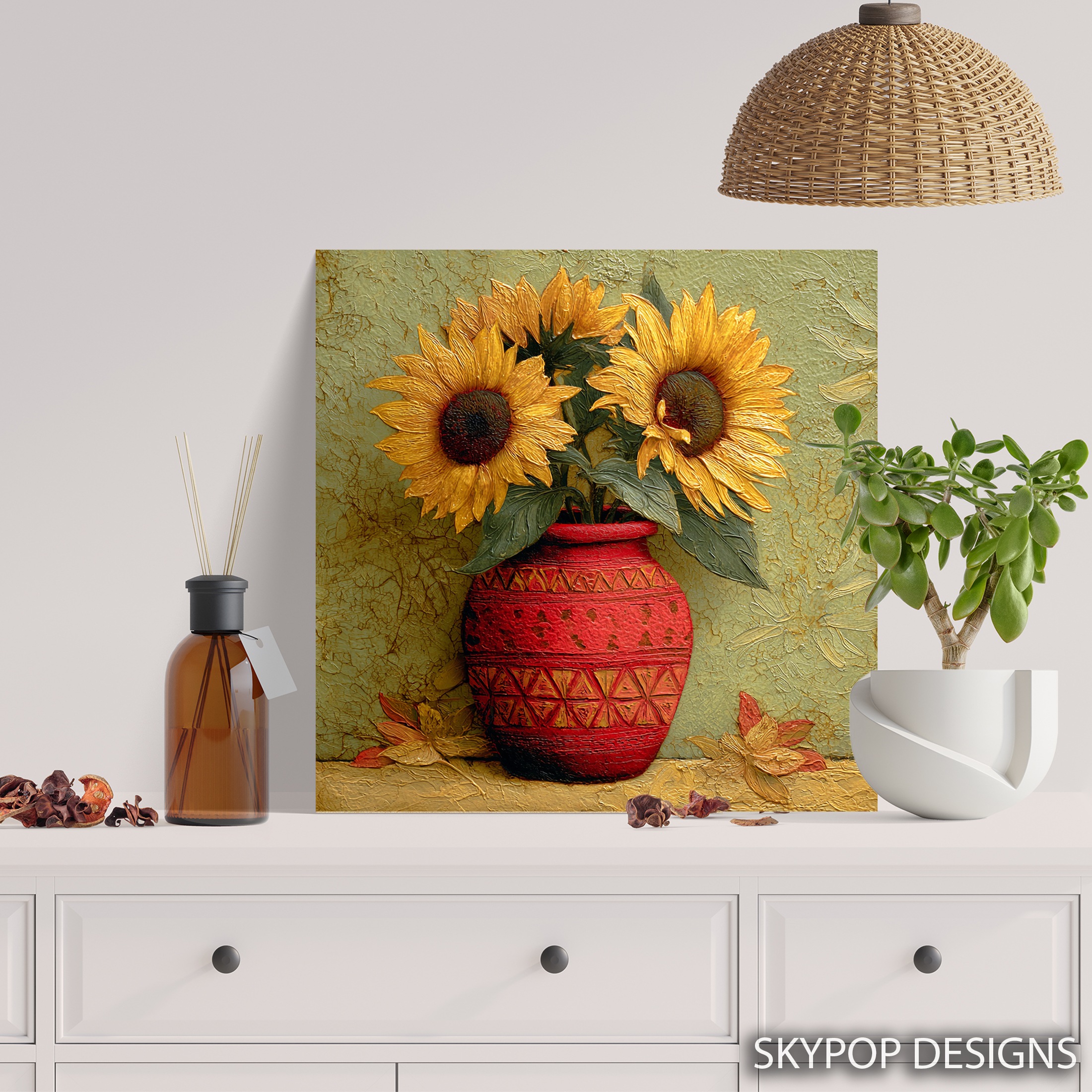 Bring the warmth of a summer day into your home with this stunning sunflower canvas wall art. The vibrant yellow petals of two large sunflowers burst from a richly detailed red vase, creating an eye-catching focal point for any room. This rustic-inspired poster perfectly captures the essence of farmhouse charm and traditional elegance. The textured background adds depth and character, making this piece ideal for living room wall decor or as a statement piece in your dining area. The bold red vase with intricate patterns contrasts beautifully with the golden sunflowers, symbolizing joy and positivity in your space. Perfect for nature lovers and those who appreciate classic still life compositions, this canvas art brings a touch of the outdoors inside. The high-quality printing ensures every brushstroke and detail is faithfully reproduced, from the delicate sunflower petals to the rustic pottery texture. Whether you’re looking to refresh your kitchen decor or add a pop of color to your entryway, this versatile artwork adapts seamlessly to various interior styles. Gift this timeless piece for housewarming celebrations or to brighten a loved one’s day. Transform your living space with this captivating sunflower wall art that celebrates the beauty of nature and traditional artistry.