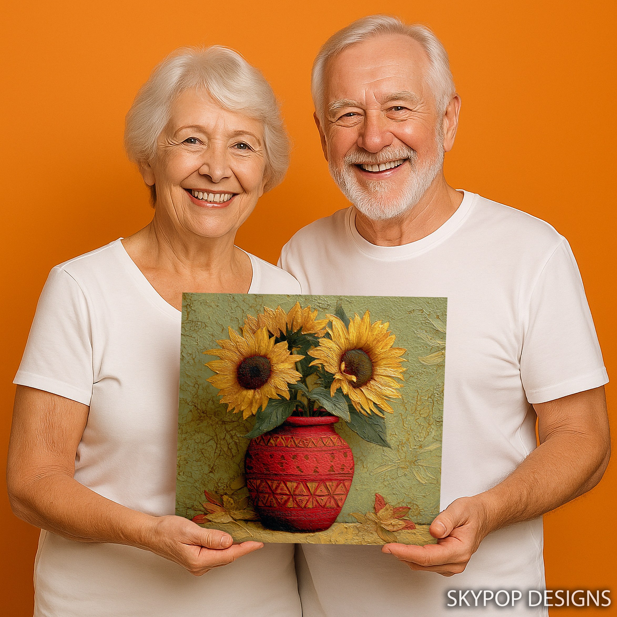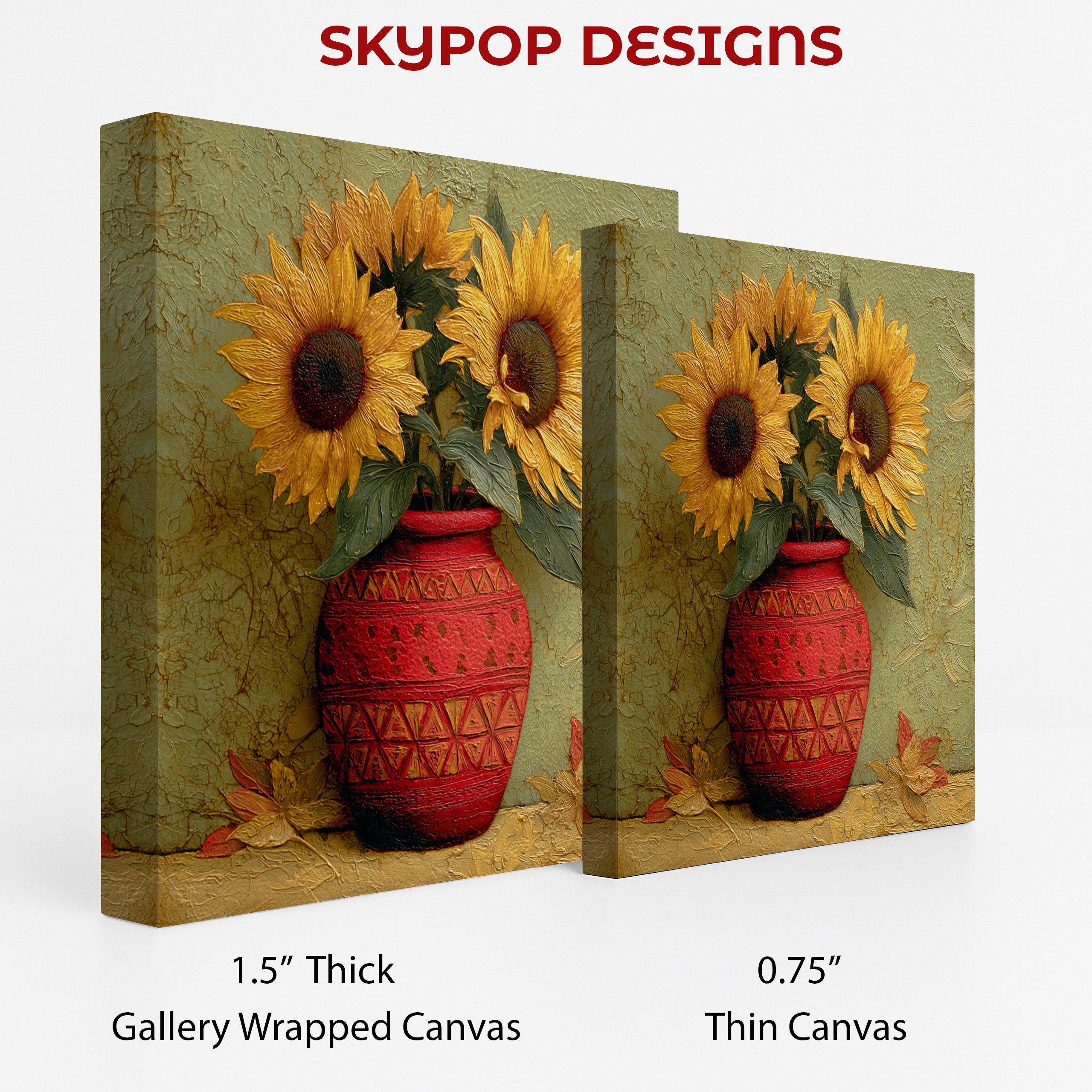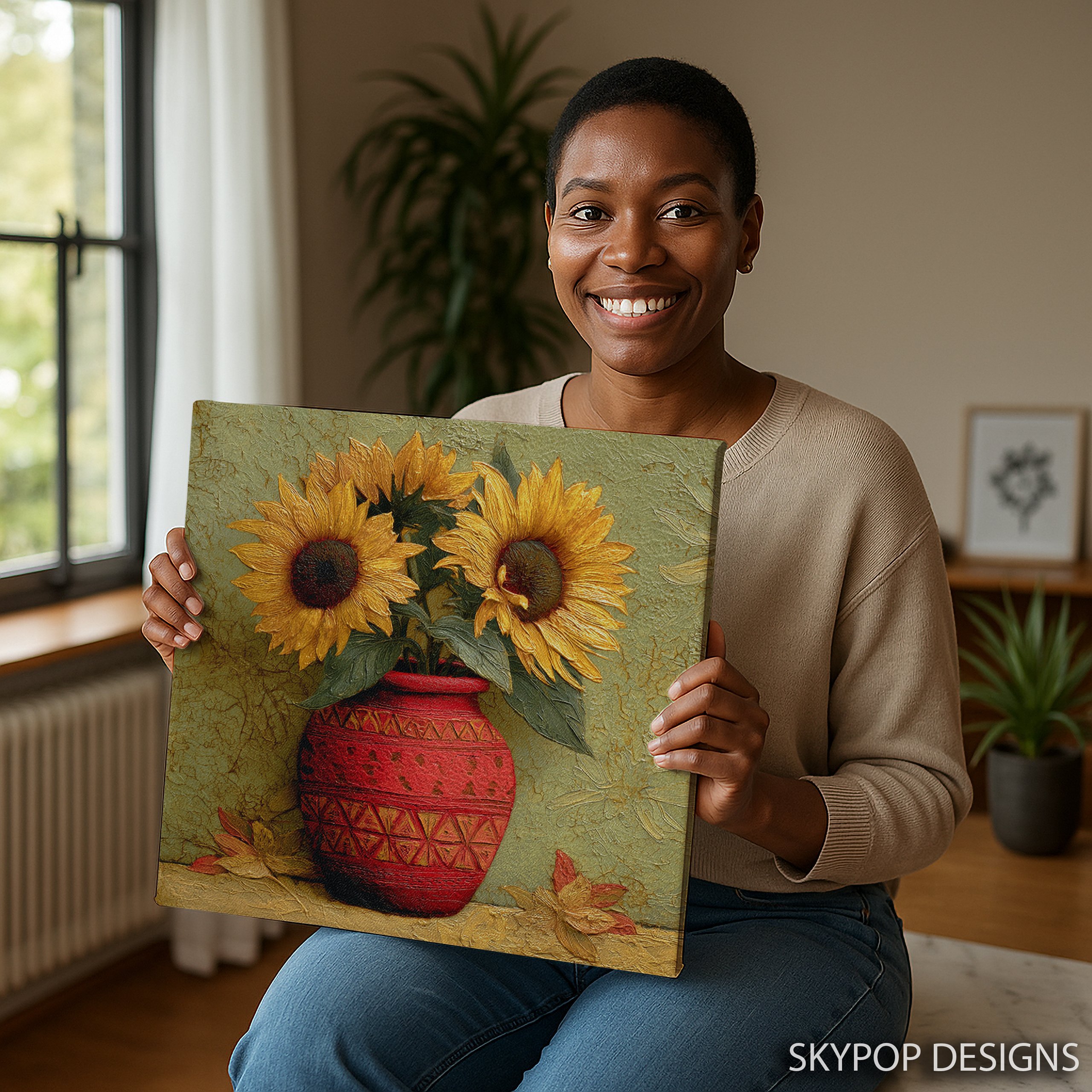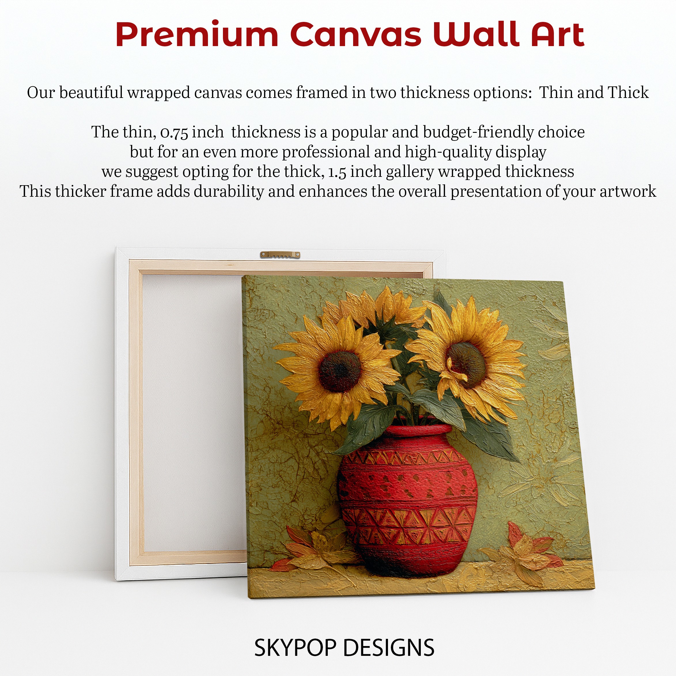 Bring the warmth of a summer day into your home with this stunning sunflower canvas wall art. The vibrant yellow petals of two large sunflowers burst from a richly detailed red vase, creating an eye-catching focal point for any room. This rustic-inspired poster perfectly captures the essence of farmhouse charm and traditional elegance. The textured background adds depth and character, making this piece ideal for living room wall decor or as a statement piece in your dining area. The bold red vase with intricate patterns contrasts beautifully with the golden sunflowers, symbolizing joy and positivity in your space. Perfect for nature lovers and those who appreciate classic still life compositions, this canvas art brings a touch of the outdoors inside. The high-quality printing ensures every brushstroke and detail is faithfully reproduced, from the delicate sunflower petals to the rustic pottery texture. Whether you’re looking to refresh your kitchen decor or add a pop of color to your entryway, this versatile artwork adapts seamlessly to various interior styles. Gift this timeless piece for housewarming celebrations or to brighten a loved one’s day. Transform your living space with this captivating sunflower wall art that celebrates the beauty of nature and traditional artistry.