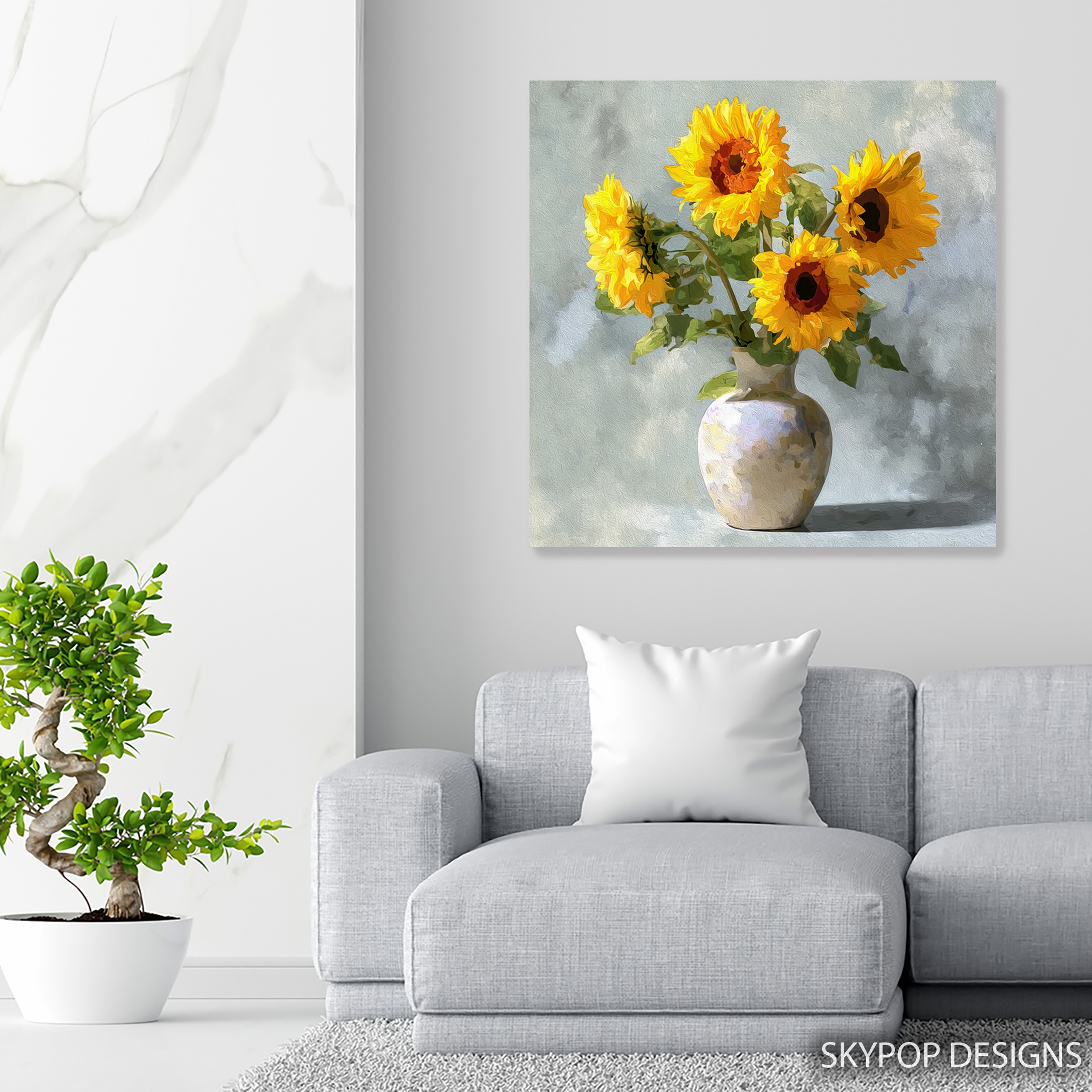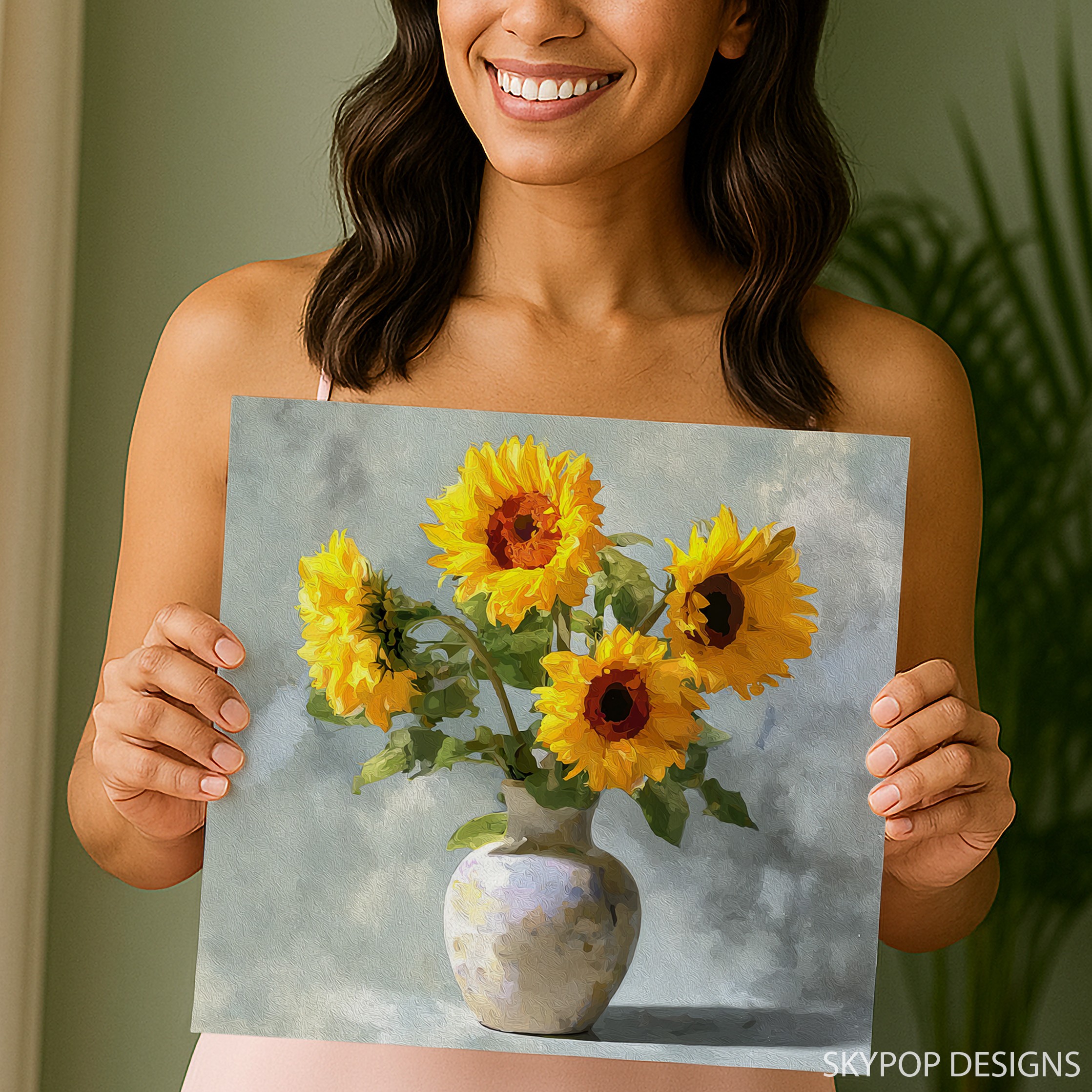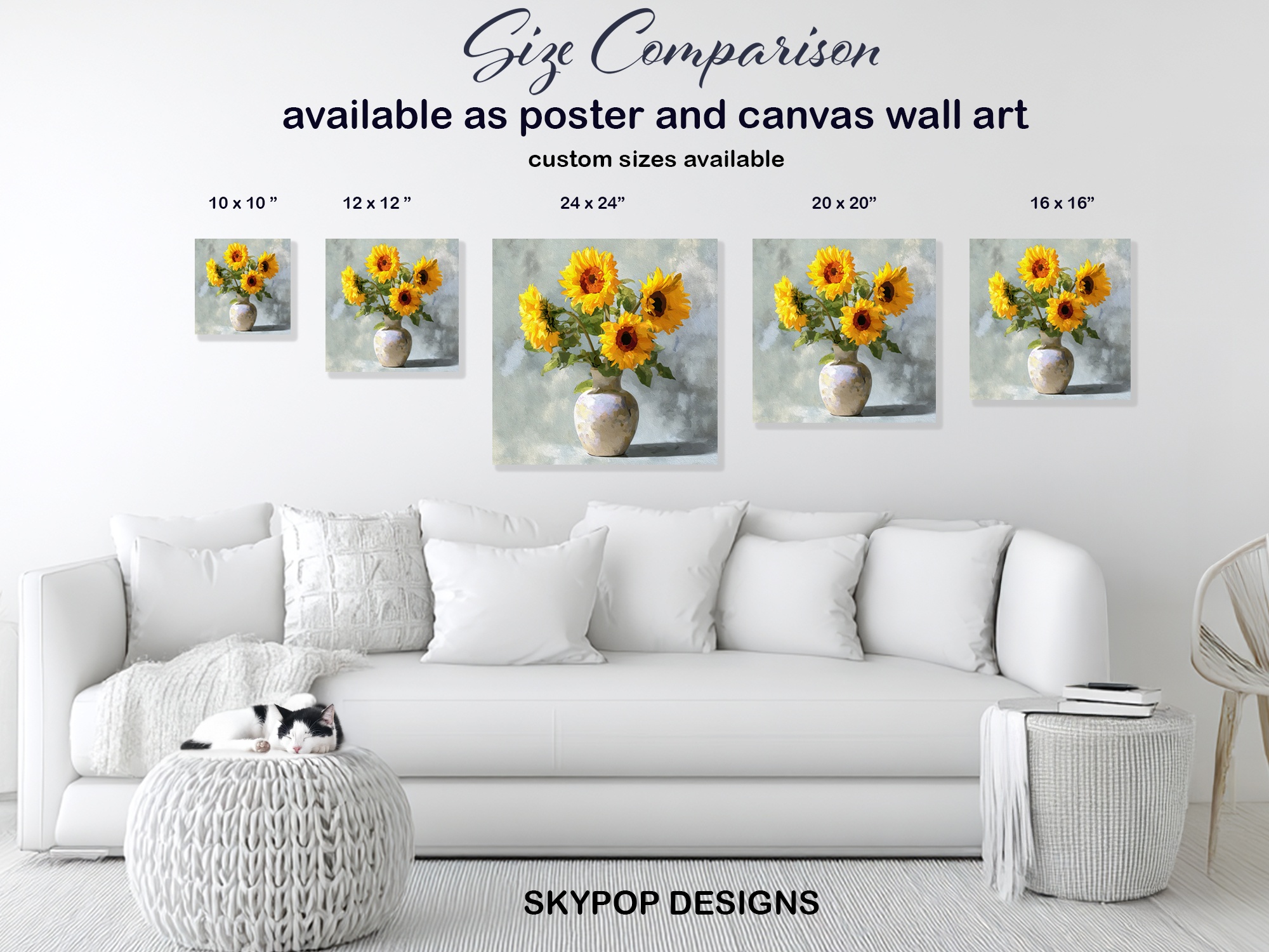 Brighten your home with this stunning sunflower canvas wall art, showcasing a vibrant bouquet of golden blooms in a classic white vase. This eye-catching poster transforms any space with its warm, cheerful energy and timeless appeal. Perfect for farmhouse kitchens or rustic dining rooms, the artwork celebrates nature’s beauty in rich, textured detail. The sunflowers’ bold yellow petals pop against lush green leaves, creating a focal point that draws the eye and lifts the mood. Ideal for traditional living rooms or cozy bedrooms, this versatile piece adapts to various decor styles while adding a touch of summer all year round. The neutral background enhances the flowers’ radiance, making this canvas art a standout in any setting. Whether you’re looking to refresh your seasonal decor or searching for the perfect housewarming gift, this sunflower wall art delivers instant charm and character. High-quality printing captures every brushstroke, bringing the sunflowers to life with incredible depth and dimension. Hang this artwork in your home office for a dose of natural inspiration, or make it the centerpiece of your dining area for a warm, inviting atmosphere. Transform your space today with this captivating sunflower canvas that brightens rooms and spirits alike.