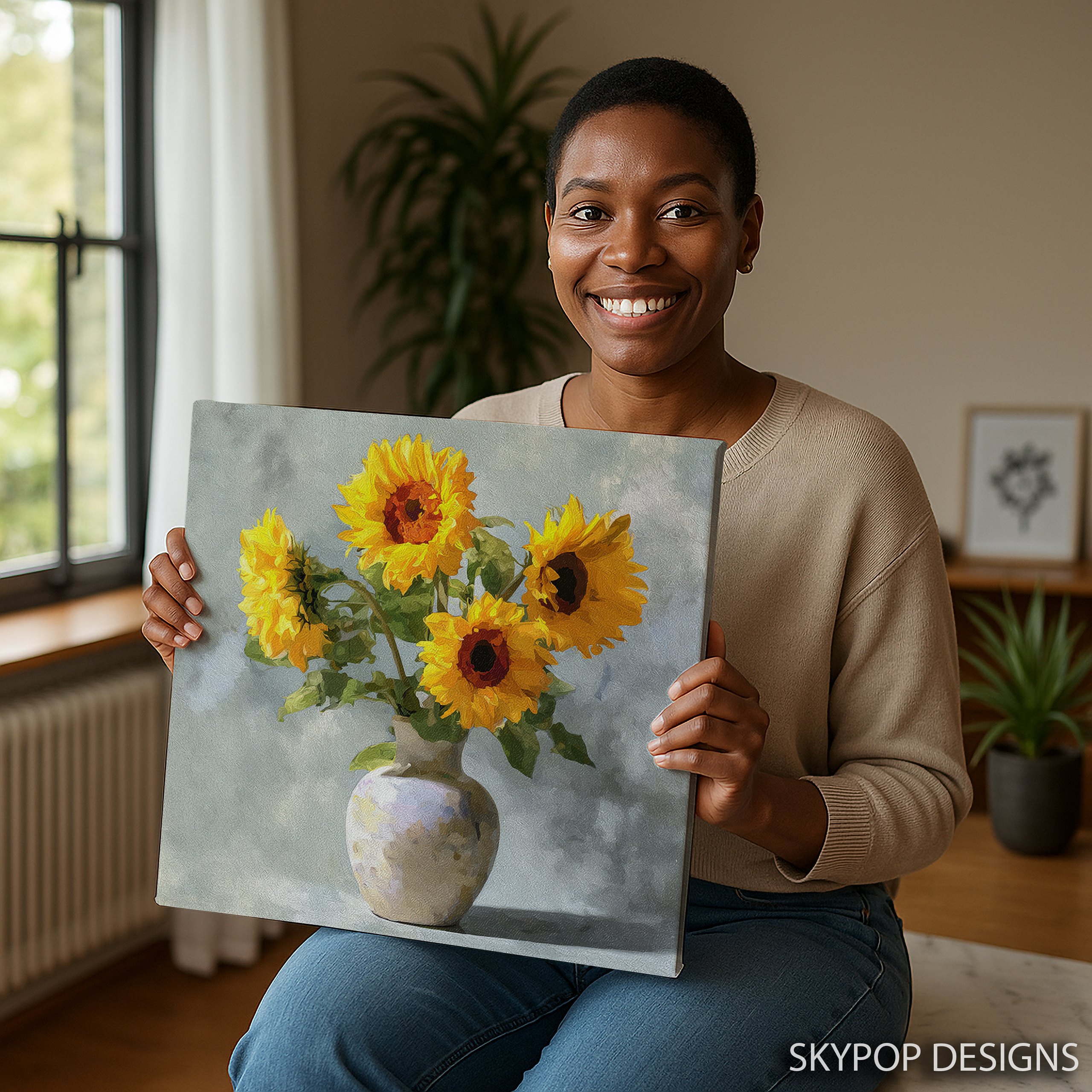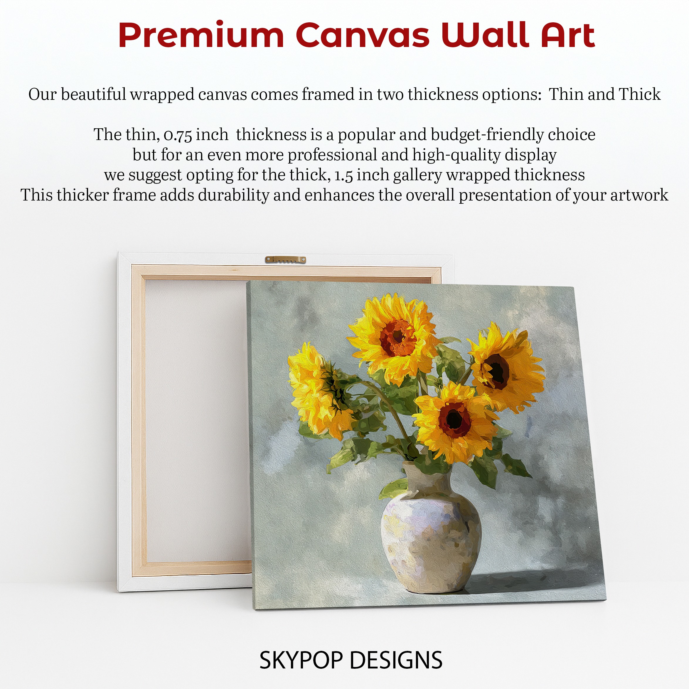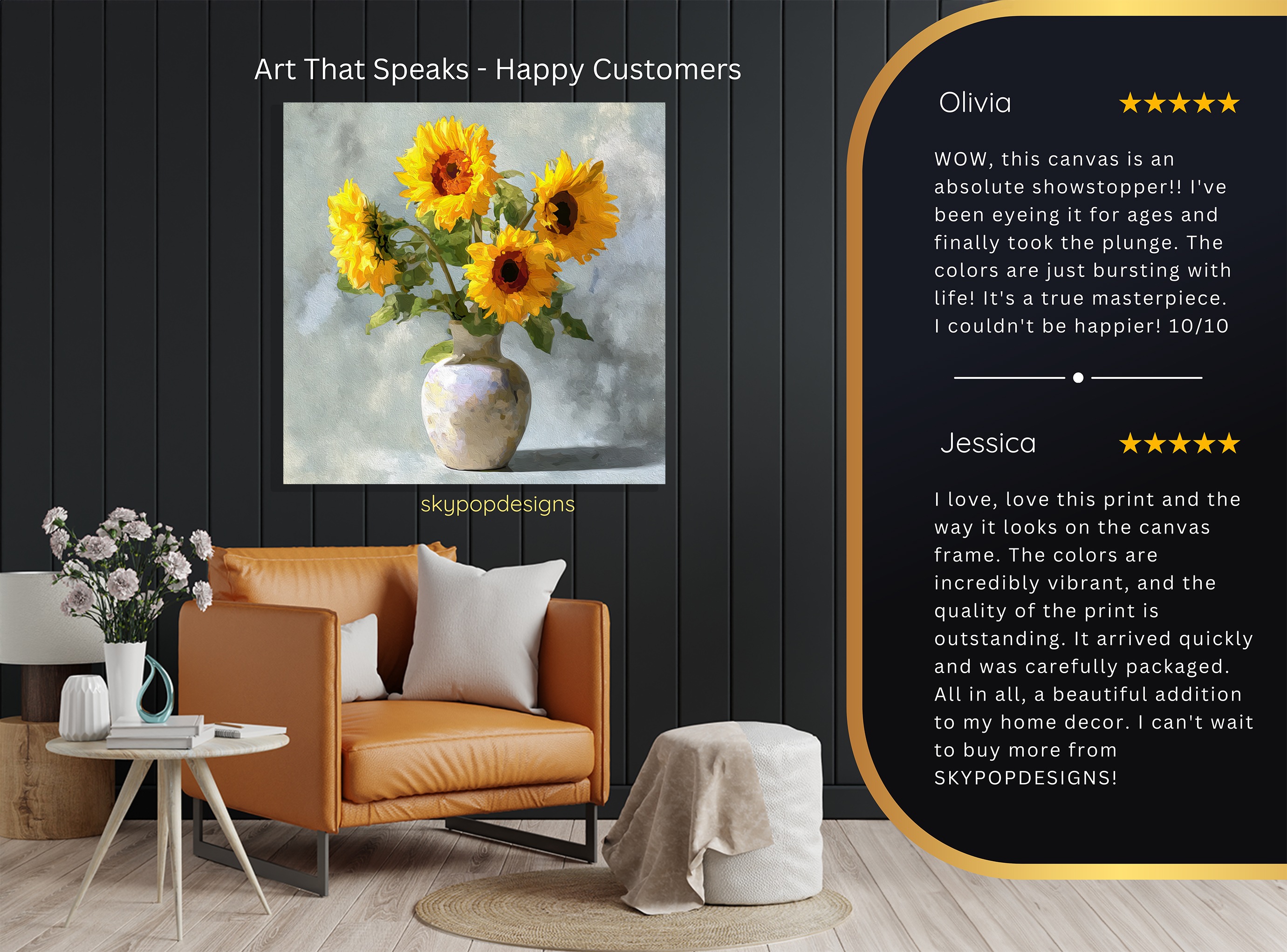 Brighten your home with this stunning sunflower canvas wall art, showcasing a vibrant bouquet of golden blooms in a classic white vase. This eye-catching poster transforms any space with its warm, cheerful energy and timeless appeal. Perfect for farmhouse kitchens or rustic dining rooms, the artwork celebrates nature’s beauty in rich, textured detail. The sunflowers’ bold yellow petals pop against lush green leaves, creating a focal point that draws the eye and lifts the mood. Ideal for traditional living rooms or cozy bedrooms, this versatile piece adapts to various decor styles while adding a touch of summer all year round. The neutral background enhances the flowers’ radiance, making this canvas art a standout in any setting. Whether you’re looking to refresh your seasonal decor or searching for the perfect housewarming gift, this sunflower wall art delivers instant charm and character. High-quality printing captures every brushstroke, bringing the sunflowers to life with incredible depth and dimension. Hang this artwork in your home office for a dose of natural inspiration, or make it the centerpiece of your dining area for a warm, inviting atmosphere. Transform your space today with this captivating sunflower canvas that brightens rooms and spirits alike.