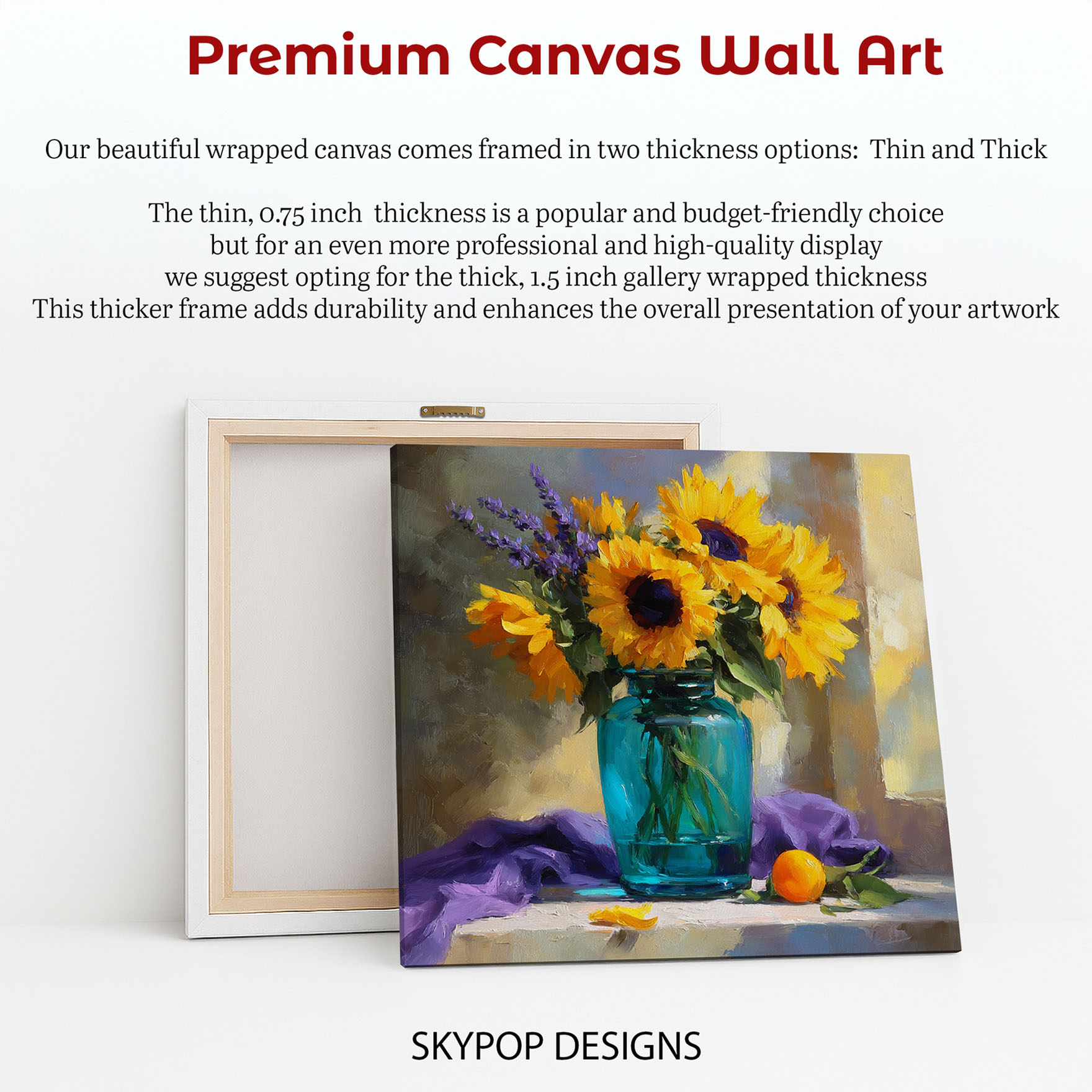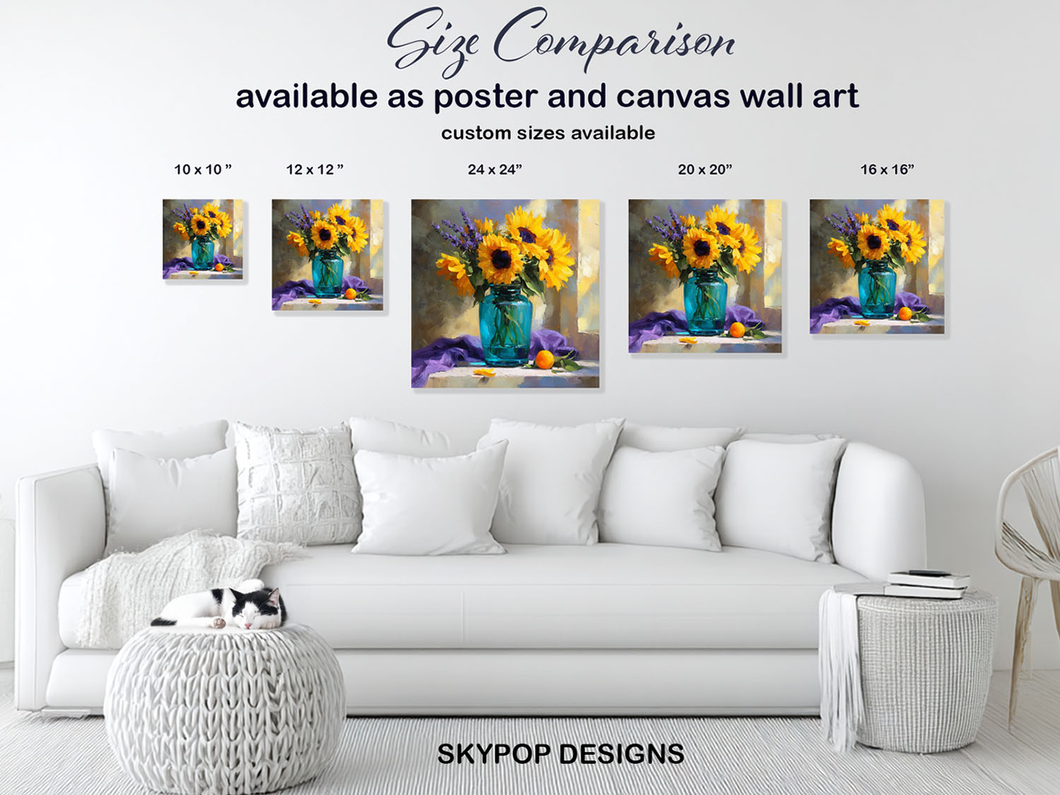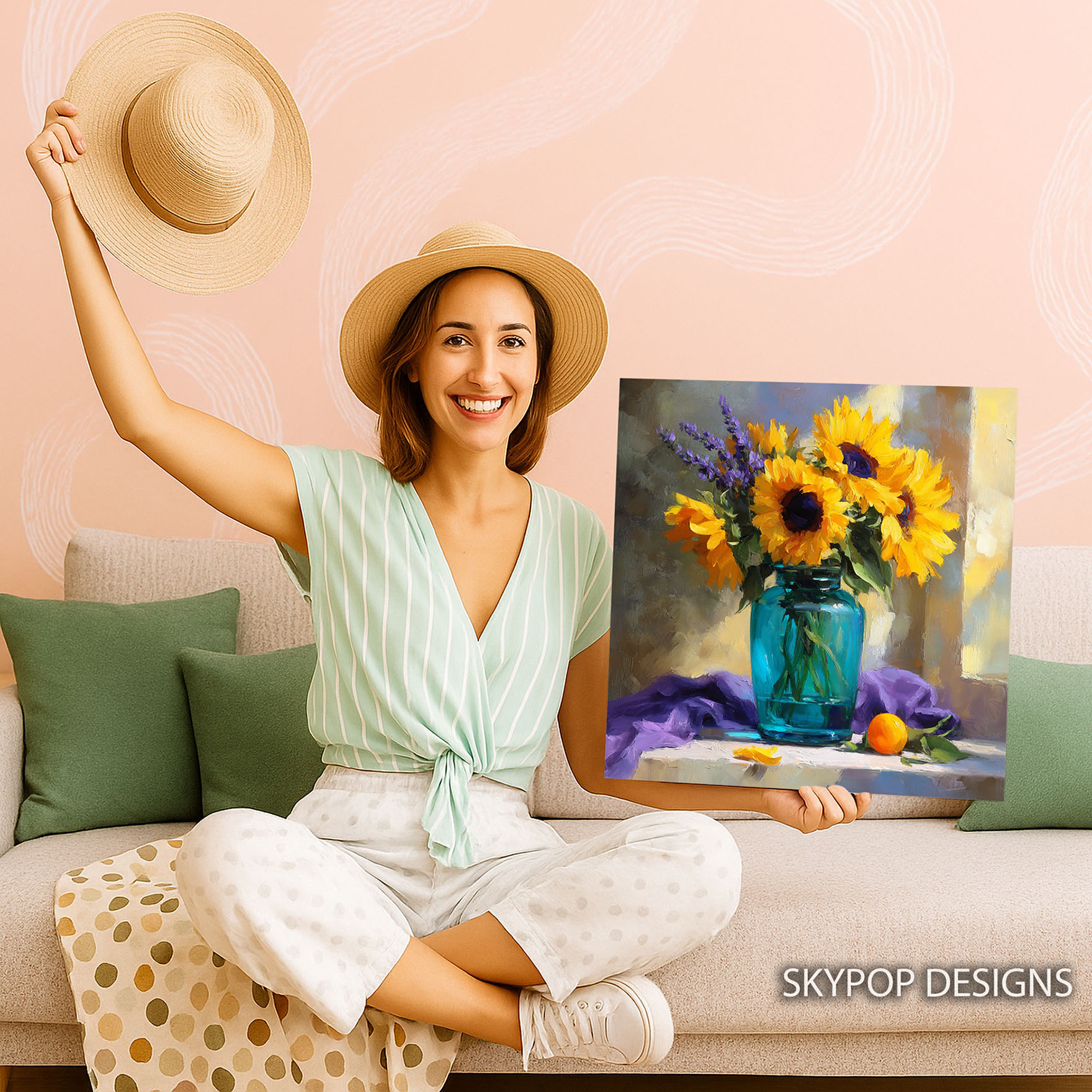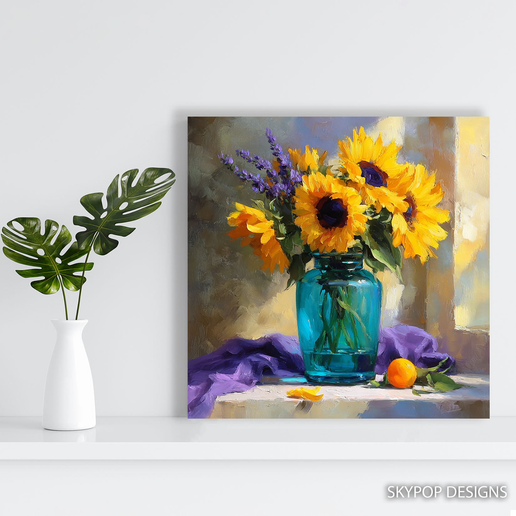 Elevate your space with this breathtaking sunflower and lavender canvas wall art, a vibrant still life that brings the beauty of nature indoors. This stunning poster or canvas wall art embodies impressionistic charm, perfect for transforming your living room or dining room into a more inviting and artistic domain. The radiant yellow sunflowers and delicate purple lavender bursts of color bring warmth and cheer, complemented by the striking teal vase and deep purple fabric accents. Ideal for bohemian, Tuscan, or rustic decor styles, this floral artwork adds a touch of natural elegance to any kitchen or entryway. The painterly brushstrokes create a sense of depth and texture, making this canvas wall art a captivating focal point that inspires joy and tranquility. Showcase your appreciation for nature’s bounty with this vibrant poster or canvas wall art, designed to enhance any home decor with its rich color palette and artistic flair. It’s a perfect housewarming gift or a delightful addition to your seasonal decor, bringing a touch of sunshine and calm. The interplay of warm yellows and cool blues and purples creates a visually dynamic composition, perfect for evoking a sense of joy and relaxation. High-quality printing captures the essence of the original artwork, ensuring this sunflower wall art remains a cherished piece for years to come. Make a statement in your home with this exquisite Floral Art canvas wall art that celebrates the beauty of everyday moments. Transform your home with this captivating piece and let the vibrant hues inspire your senses today.