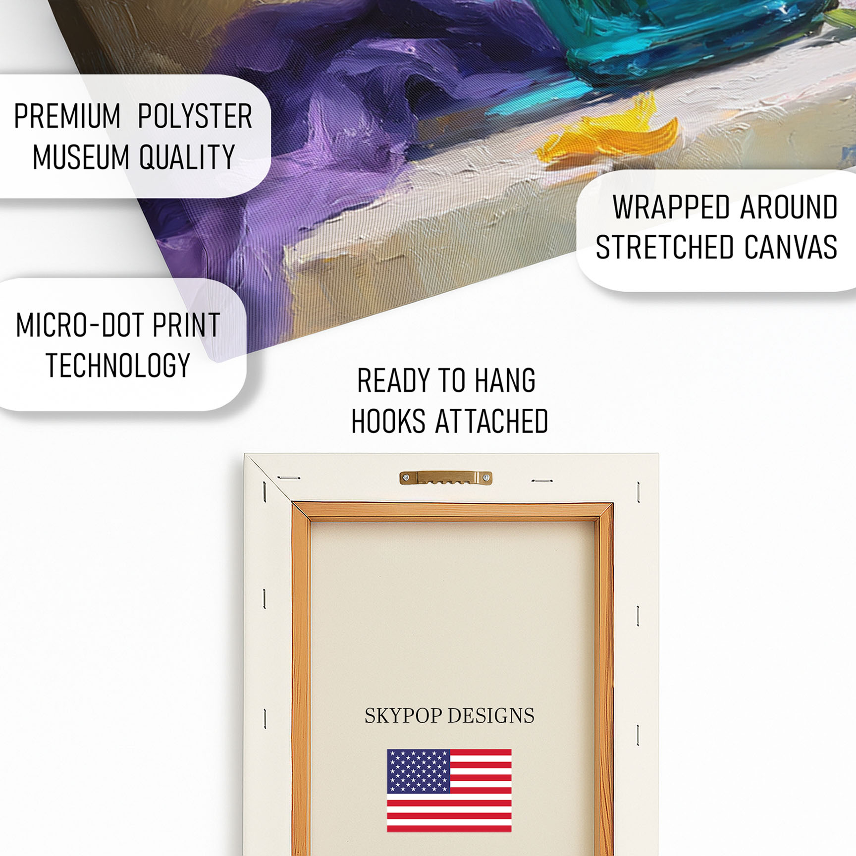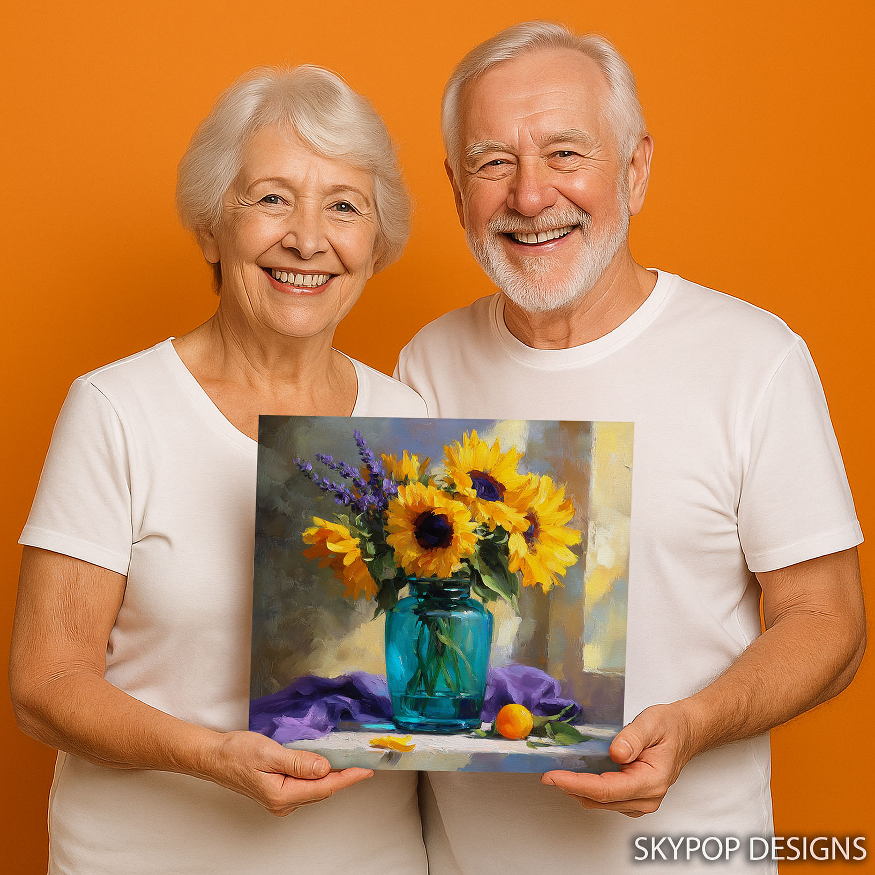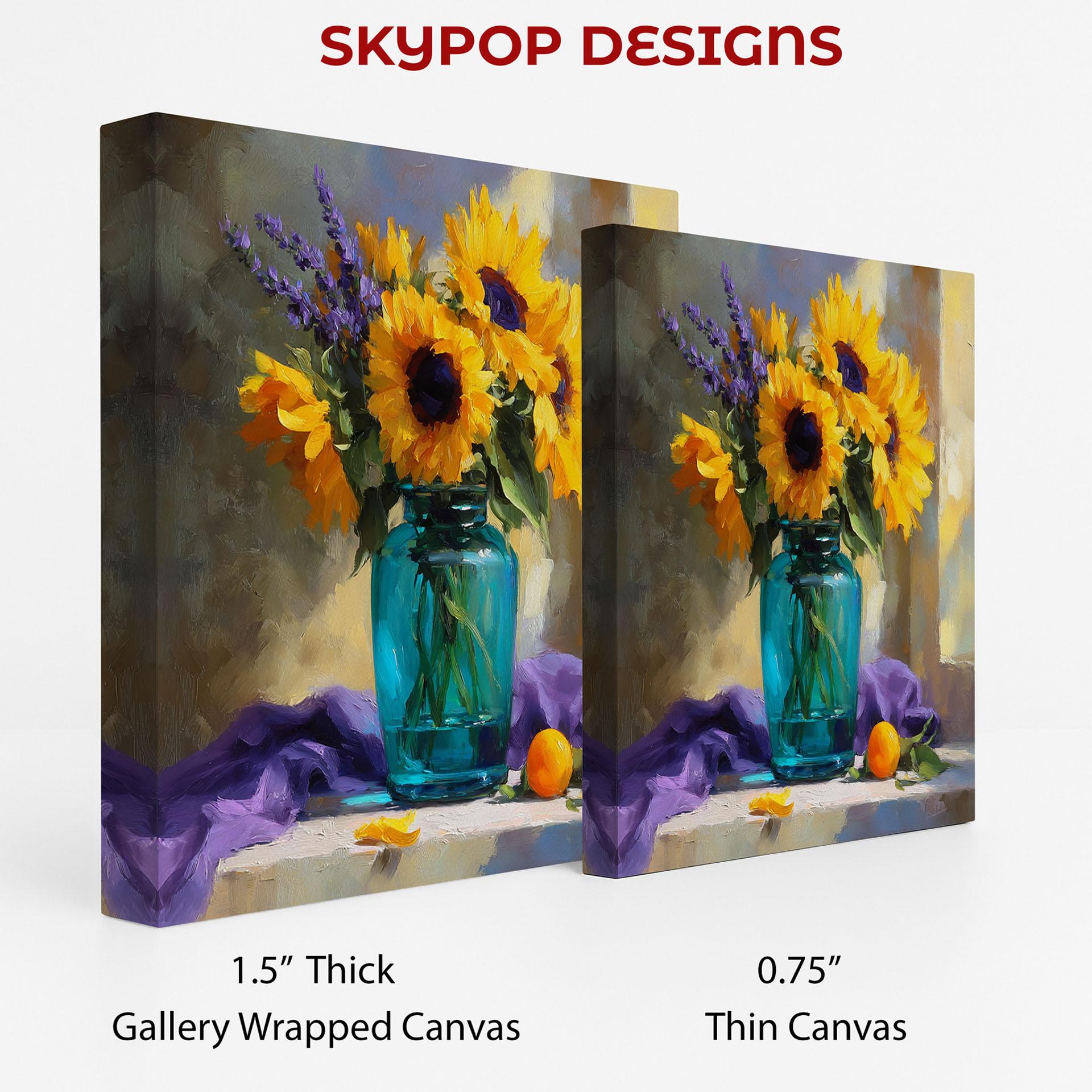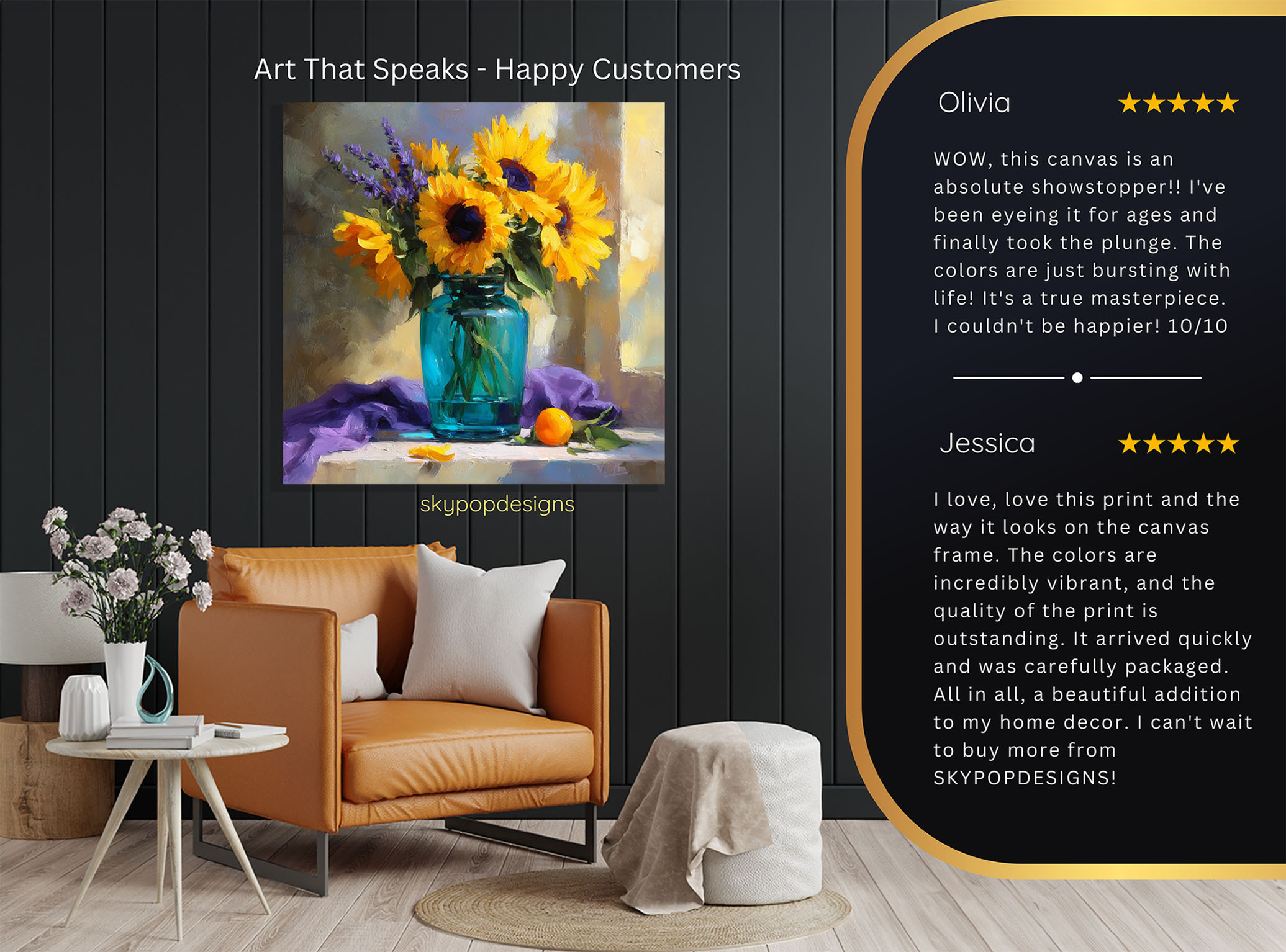 Elevate your space with this breathtaking sunflower and lavender canvas wall art, a vibrant still life that brings the beauty of nature indoors. This stunning poster or canvas wall art embodies impressionistic charm, perfect for transforming your living room or dining room into a more inviting and artistic domain. The radiant yellow sunflowers and delicate purple lavender bursts of color bring warmth and cheer, complemented by the striking teal vase and deep purple fabric accents. Ideal for bohemian, Tuscan, or rustic decor styles, this floral artwork adds a touch of natural elegance to any kitchen or entryway. The painterly brushstrokes create a sense of depth and texture, making this canvas wall art a captivating focal point that inspires joy and tranquility. Showcase your appreciation for nature’s bounty with this vibrant poster or canvas wall art, designed to enhance any home decor with its rich color palette and artistic flair. It’s a perfect housewarming gift or a delightful addition to your seasonal decor, bringing a touch of sunshine and calm. The interplay of warm yellows and cool blues and purples creates a visually dynamic composition, perfect for evoking a sense of joy and relaxation. High-quality printing captures the essence of the original artwork, ensuring this sunflower wall art remains a cherished piece for years to come. Make a statement in your home with this exquisite Floral Art canvas wall art that celebrates the beauty of everyday moments. Transform your home with this captivating piece and let the vibrant hues inspire your senses today.
