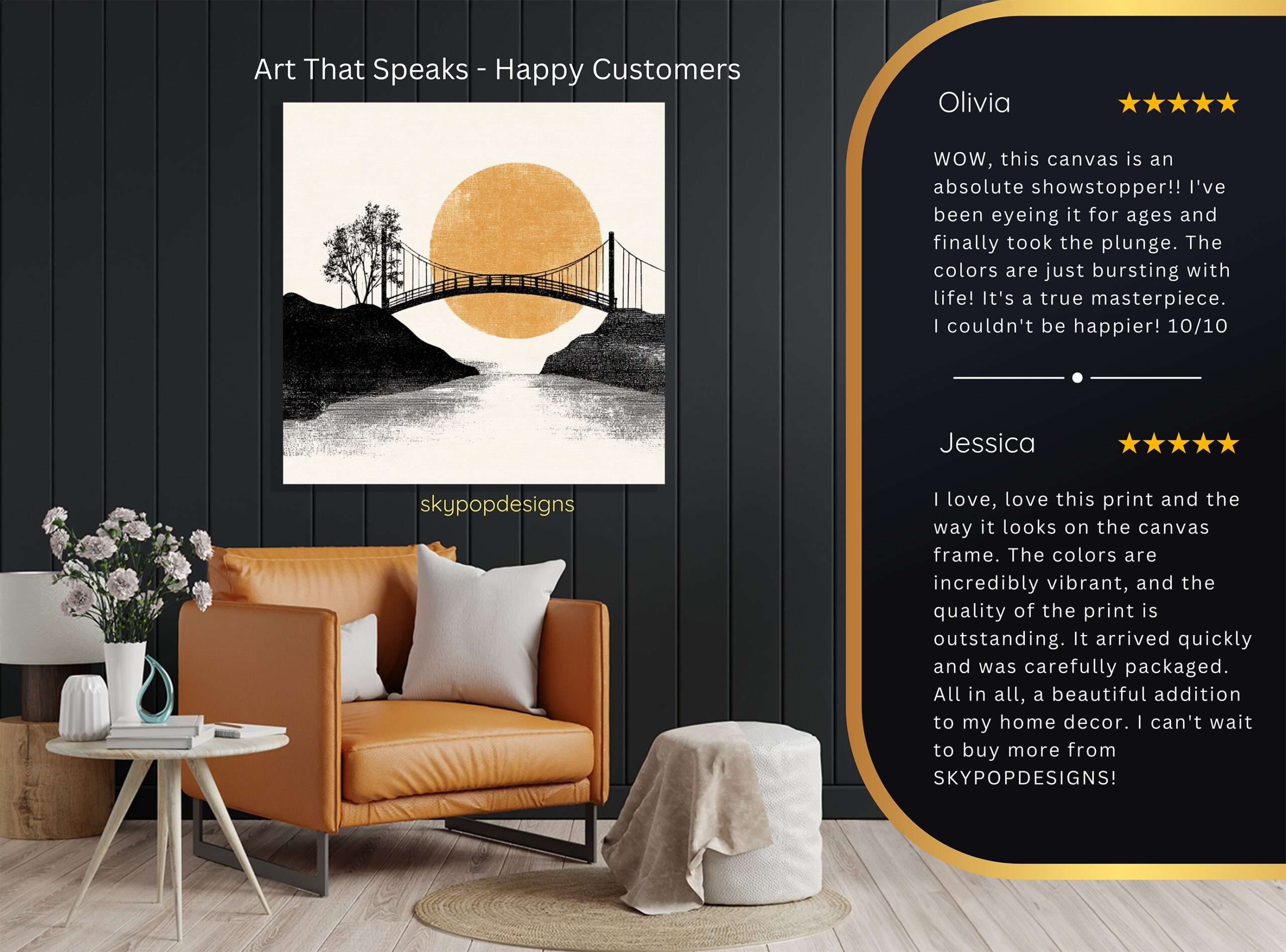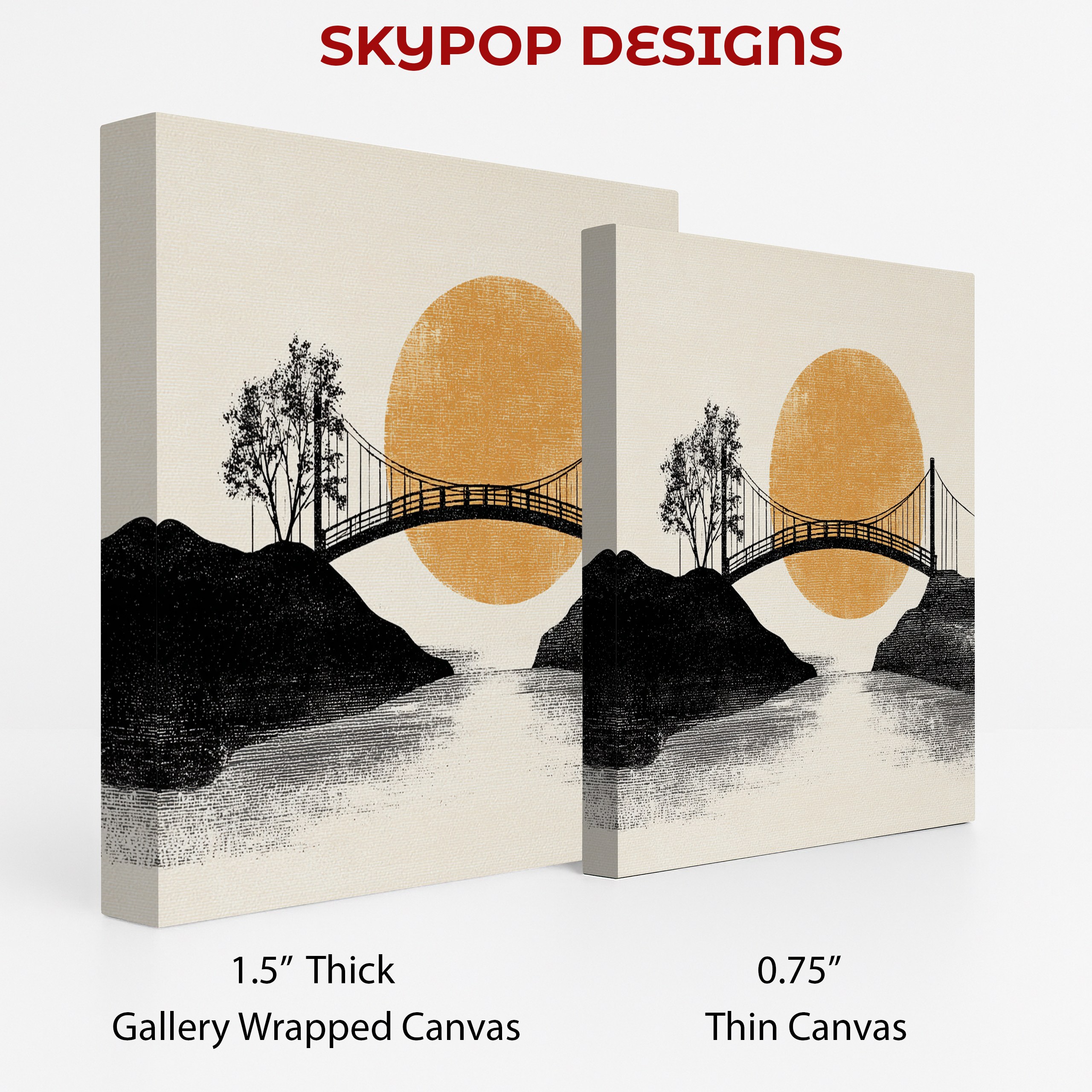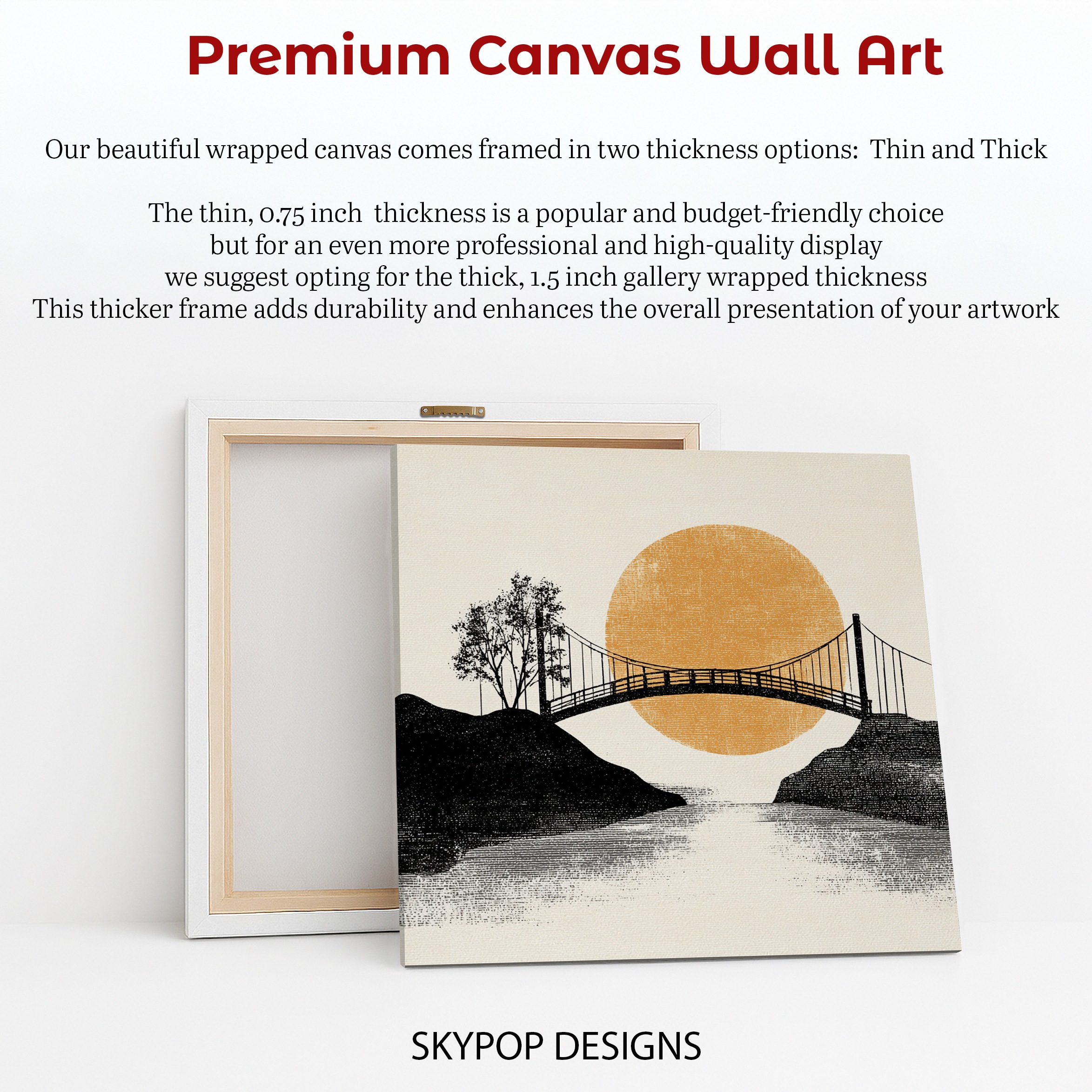 Elevate your space with this stunning minimalist canvas wall art featuring a serene sunset bridge scene. The striking composition combines bold geometric shapes with a warm orange sun, creating a captivating focal point for any room. Perfect for modern living rooms or Scandinavian-inspired offices, this poster seamlessly blends nature-inspired elements with contemporary design. The black silhouette of the suspension bridge stretches across the canvas, symbolizing connection and progress against the backdrop of a mesmerizing sunset. Ideal for those who appreciate clean lines and simplified forms, this piece adds a touch of sophistication to mid-century modern decor. The textured orange circle representing the sun provides a vibrant pop of color, instantly brightening your space and creating a warm, inviting atmosphere. Whether displayed in a minimalist bedroom or a sleek dining area, this versatile canvas art adapts effortlessly to various interior styles. The high-quality printing captures every subtle detail, from the delicate tree silhouette to the textured appearance of the sun. This eye-catching wall art serves as a conversation starter and a daily source of inspiration, reminding you to appreciate life’s simple beauty. Transform your home or office with this modern bridge sunset artwork that celebrates the harmony between nature and human engineering. Add this striking piece to your wall art collection today and create a serene, contemporary ambiance in any room.