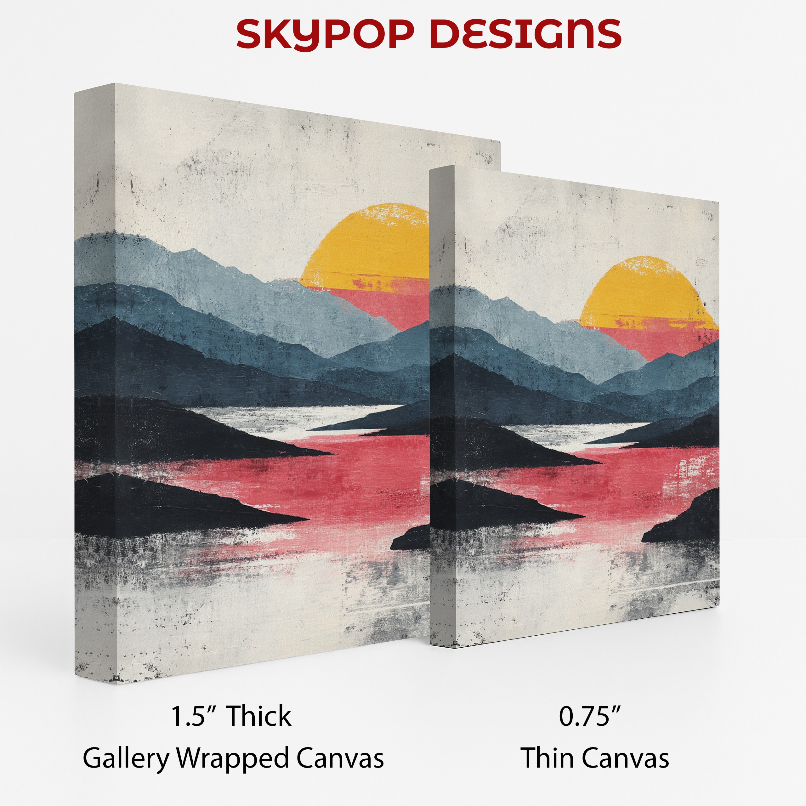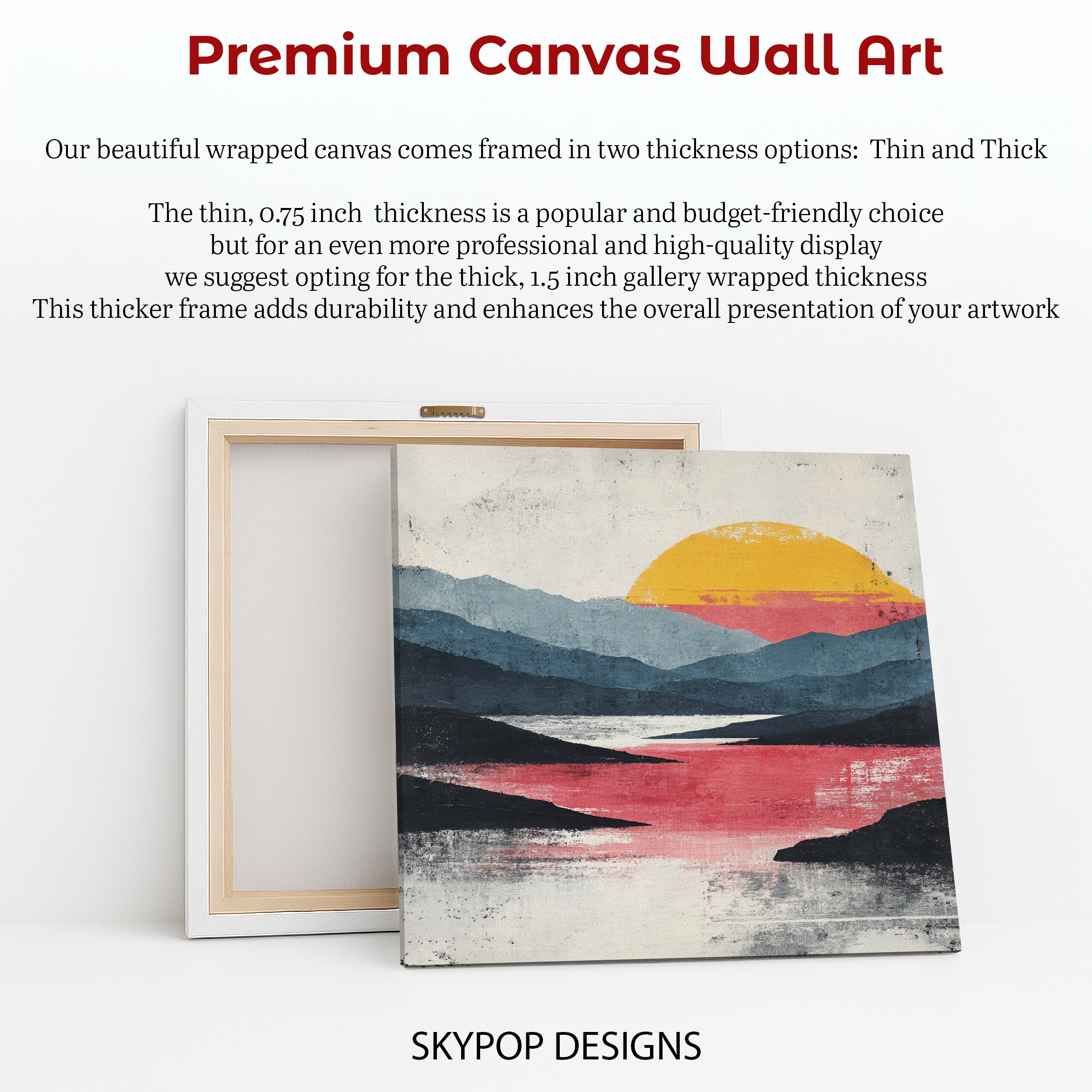 Transform your space with this stunning canvas wall art featuring a minimalist mountain landscape at sunset. This contemporary poster captures the serene beauty of nature with its bold, geometric shapes and vibrant color palette. The striking yellow sun sets behind blue mountain silhouettes, casting a warm glow across a pink lake, creating a mesmerizing focal point for any room. Perfect for modern living room wall decor or as a calming addition to a minimalist bedroom, this piece adds depth and tranquility to your space. The simple yet powerful composition evokes a sense of peace and wonder, making it ideal for meditation spaces or home offices where focus and inspiration are key. The high-quality canvas art showcases rich, fade-resistant colors that maintain their vibrancy over time. Whether you’re looking to refresh your dining room decor or add a touch of Scandinavian simplicity to your hallway, this versatile artwork adapts beautifully to various interior styles. The large-scale design makes a bold statement, while the soothing color scheme promotes relaxation and positive energy. Elevate your home’s atmosphere with this eye-catching sunset mountain lake art that celebrates the beauty of natural landscapes in a contemporary style. Transform your walls and create a serene retreat in your home today with this captivating canvas wall art.