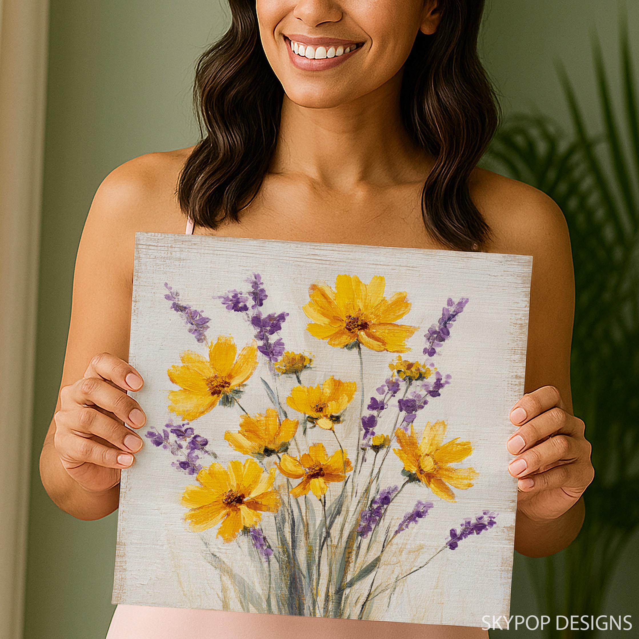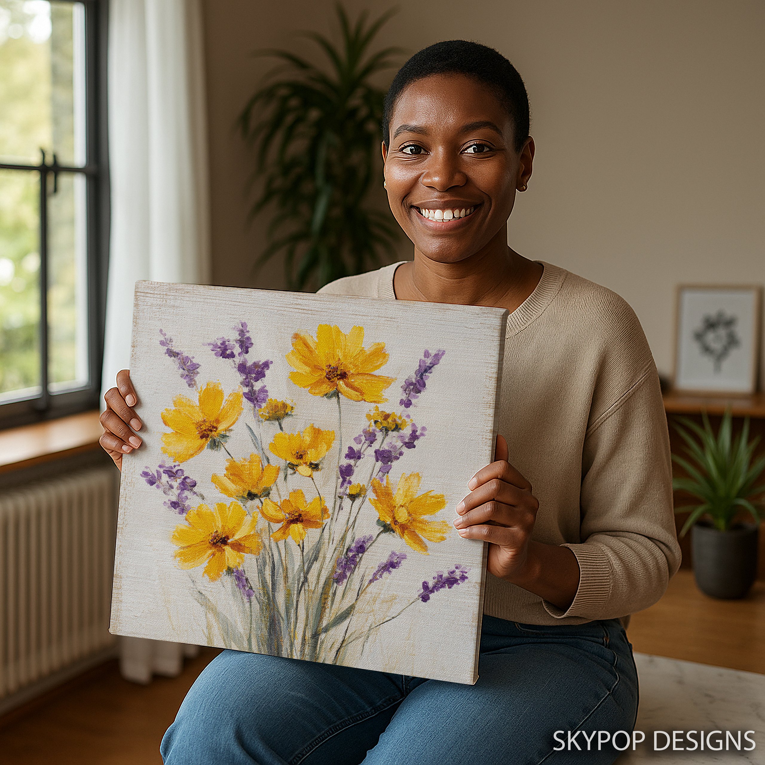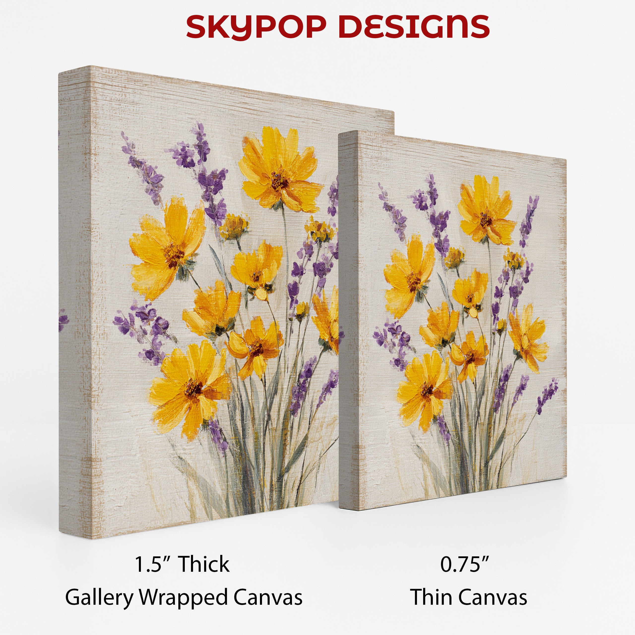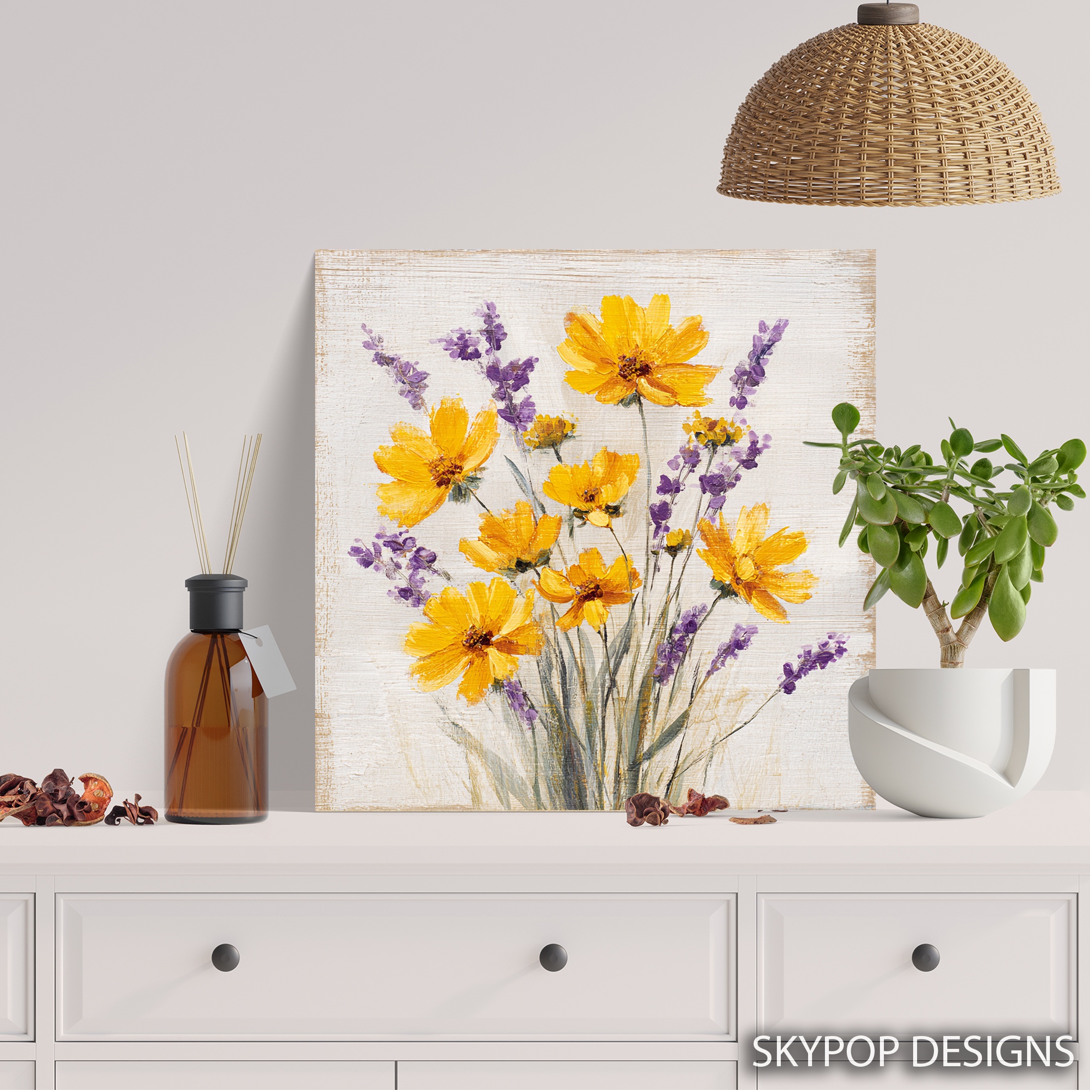 Bring the beauty of a summer meadow into your home with this stunning yellow and purple floral canvas wall art. This vibrant poster features cheerful yellow coreopsis flowers alongside delicate sprigs of lavender, creating a perfect balance of warm and cool tones. The contemporary brushstroke style adds texture and movement, making this piece a captivating focal point for any room. Ideal for modern farmhouse decor or bohemian-inspired spaces, this canvas art instantly brightens up living rooms, bedrooms, or dining areas. The combination of sunny yellow blooms and soothing purple lavender evokes feelings of joy and relaxation, enhancing the mood of your space. Perfect as a housewarming gift or to refresh your own seasonal decor, this versatile artwork adapts beautifully to various interior styles. The high-quality printing captures every detail of the delicate petals and stems, ensuring this piece looks stunning from any angle. Whether displayed above a couch, in a bedroom, or as part of a gallery wall, this floral canvas art brings a touch of nature’s beauty indoors. The white background gives a clean, fresh feel that complements both minimalist and eclectic decor schemes. Transform your living space with this eye-catching blend of yellow and purple florals – a timeless yet trendy addition to your wall art collection. Elevate your home’s atmosphere with this charming botanical print today!