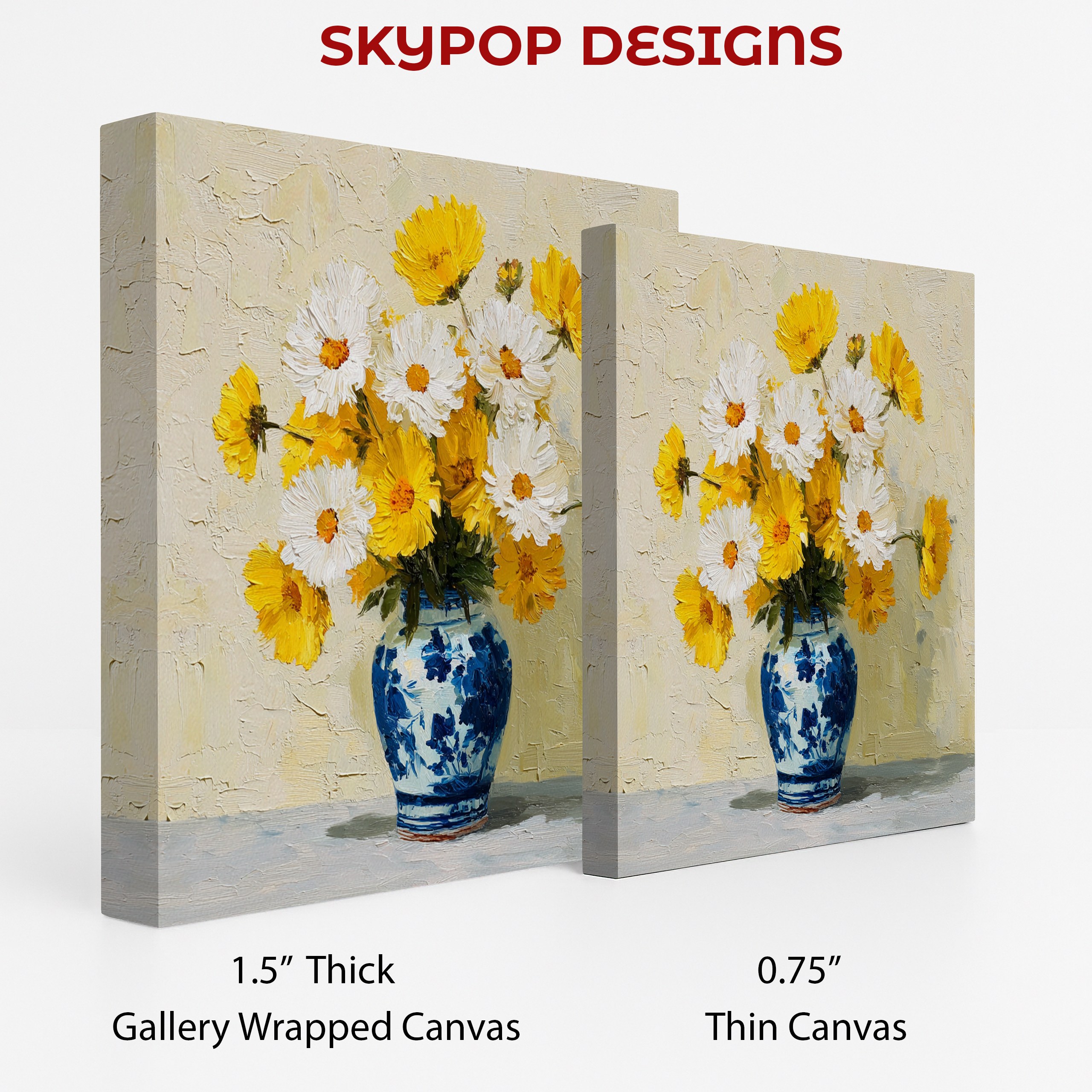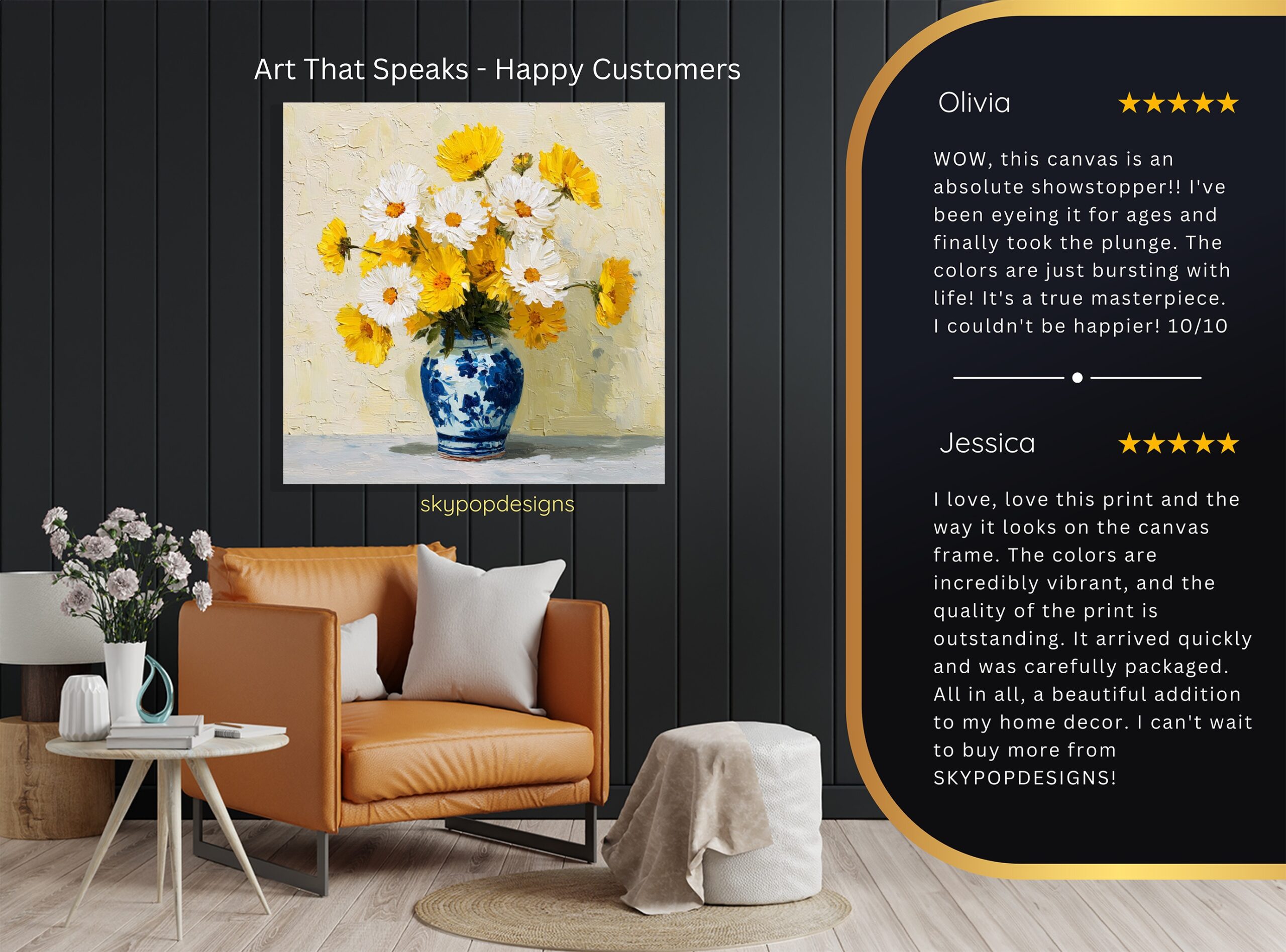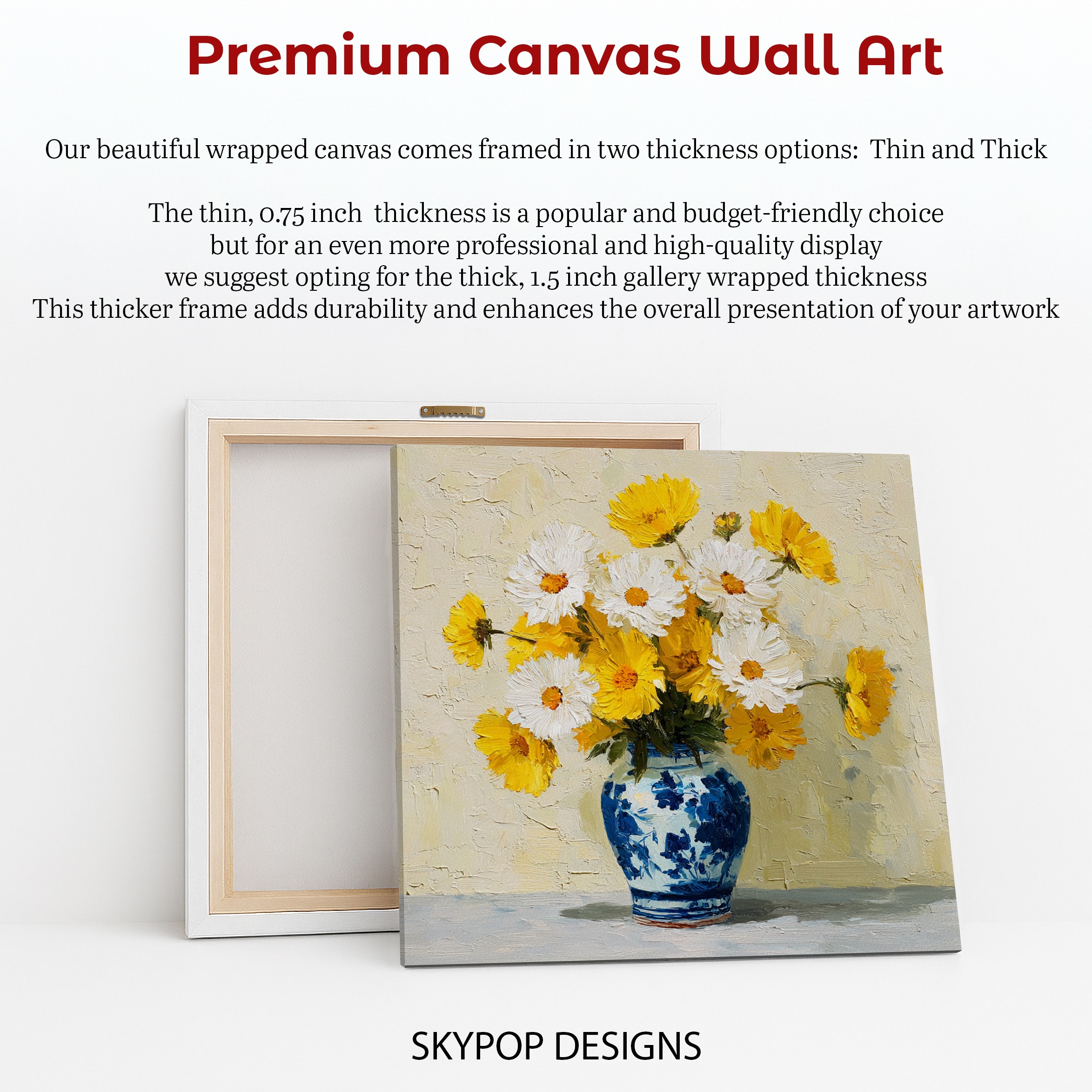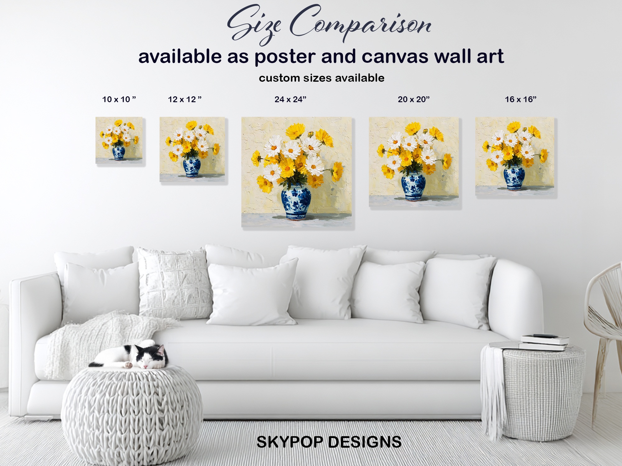 Brighten your home with this stunning floral canvas wall art featuring a vibrant bouquet of cheerful daisies and golden blooms. This eye-catching poster transforms any space into a sunny oasis, perfect for farmhouse or traditional decor styles. The textured brushstrokes and rich colors bring the flowers to life, creating a focal point that instantly elevates your living room or dining area. Ideal for nature lovers and those seeking to add a touch of warmth to their interiors, this canvas art showcases the beauty of summer all year round. The contrast between the crisp white daisies and the bold yellow flowers creates a dynamic composition that draws the eye and lifts the mood. The classic blue and white vase adds a timeless element, making this piece versatile enough to complement various color schemes. Whether displayed in a cozy kitchen nook or as a statement piece in your bedroom, this floral artwork infuses your space with joy and vitality. The high-quality canvas ensures every detail of the petals and leaves is captured, bringing a touch of nature’s beauty indoors. Perfect as a housewarming gift or to refresh your own decor, this still life art piece celebrates the simple elegance of fresh flowers. Enhance your home’s atmosphere with this charming floral canvas that brings the outdoors in and creates a welcoming ambiance in any room.