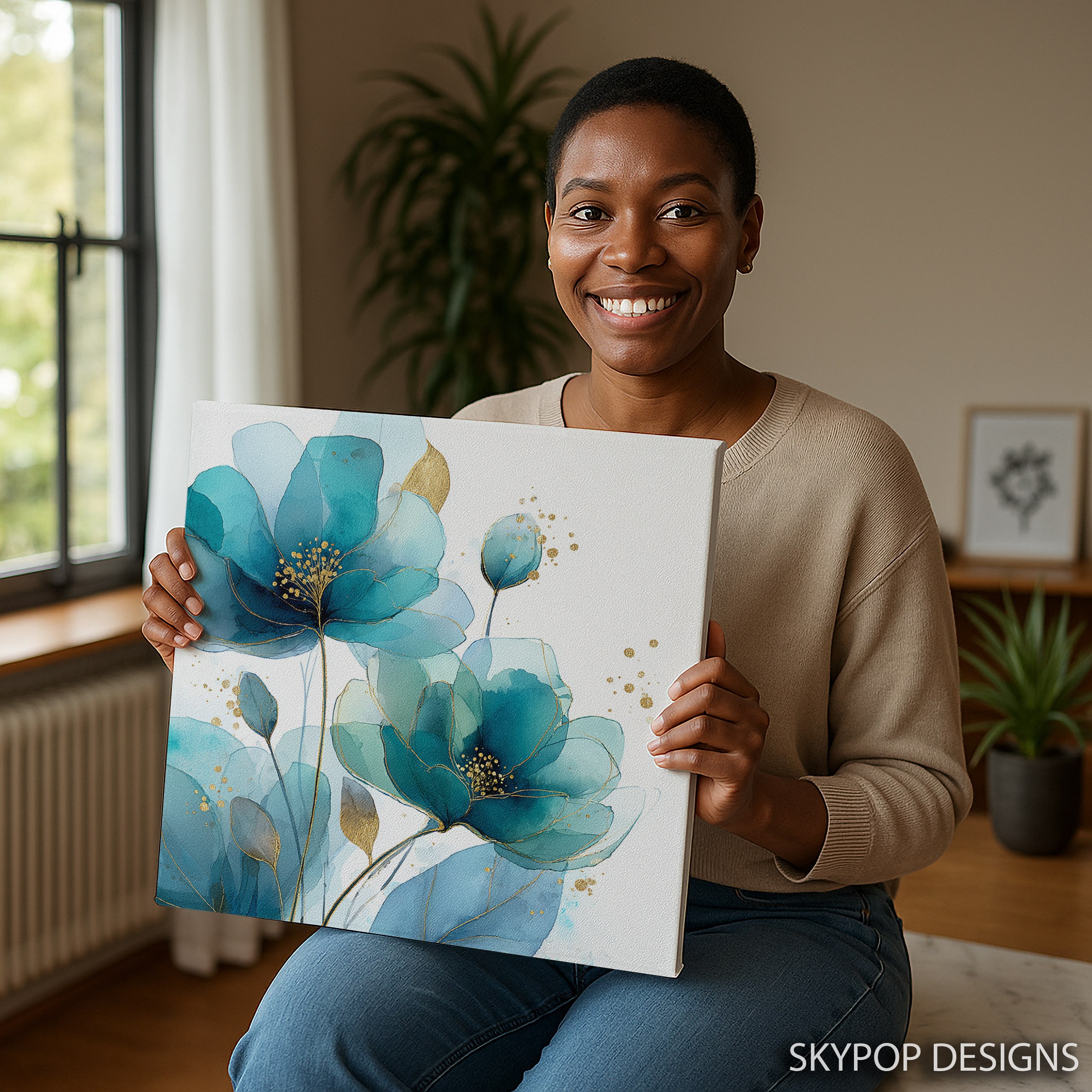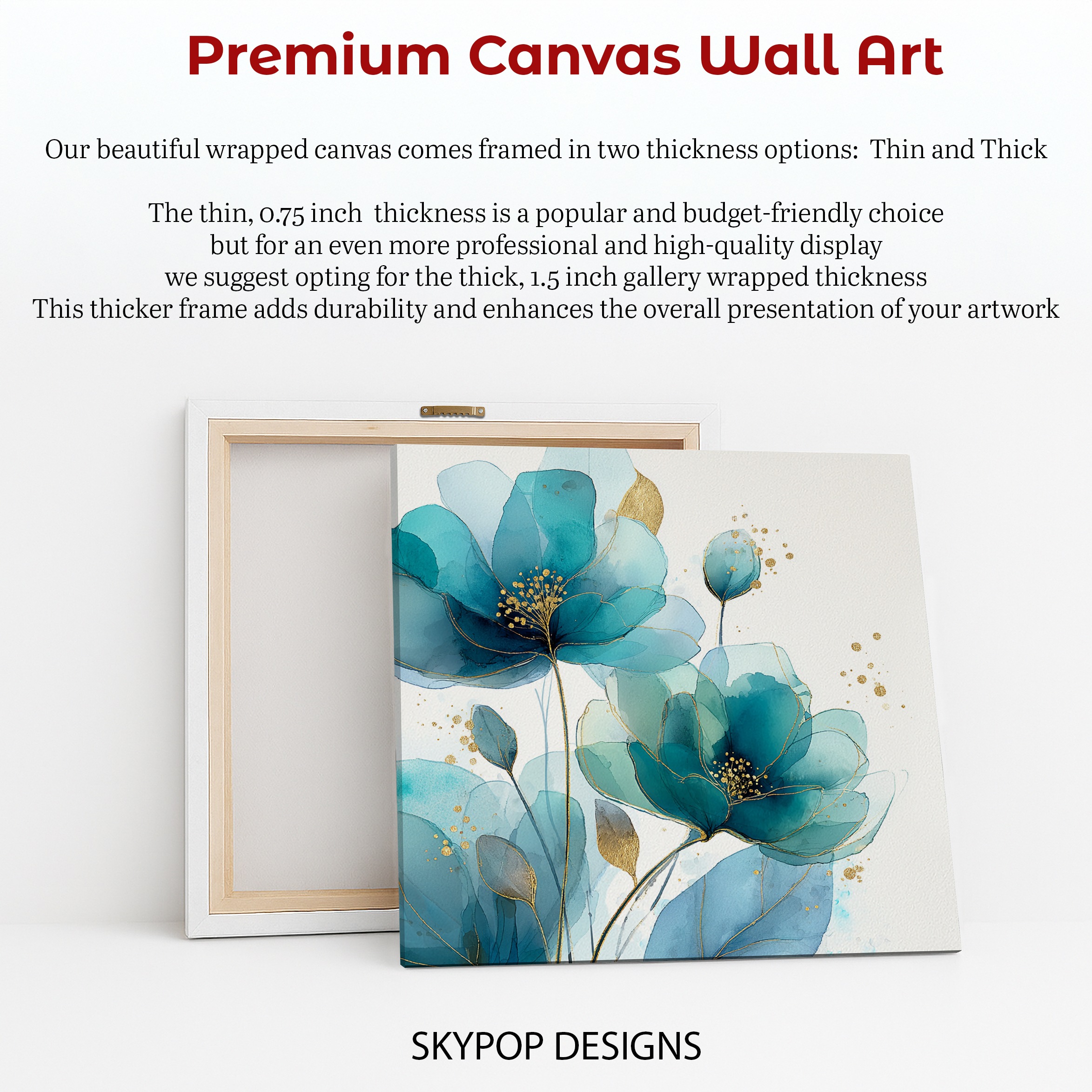 Transform your space with this stunning teal floral canvas wall art, perfect for adding a touch of elegance to any room. The vibrant watercolor-style blooms in shades of teal and blue create a captivating focal point that instantly refreshes your decor. This modern poster or canvas wall art combines contemporary floral design with a minimalist aesthetic, making it ideal for coastal-inspired living rooms or serene bedroom spaces. The delicate gold accents add a luxurious touch, enhancing the artwork’s visual appeal and complementing various color schemes. Great for those who love nature-inspired decor, this piece brings a sense of calm and beauty to your home or office. The translucent layers of color give depth and movement to the composition, ensuring this wall art remains engaging from every angle. Perfect as a thoughtful housewarming gift or to elevate your seasonal decor, this versatile artwork adapts to various interior styles. High-quality printing captures every intricate detail, from the subtle watercolor textures to the shimmering gold highlights. Whether displayed in a modern bathroom, minimalist office, or as part of a gallery wall, this piece creates a soothing atmosphere and adds a touch of sophistication. Enhance your home’s ambiance with this unique blend of floral art and contemporary style that celebrates nature’s beauty. Make this eye-catching teal bloom artwork the centerpiece of your wall decor collection today.