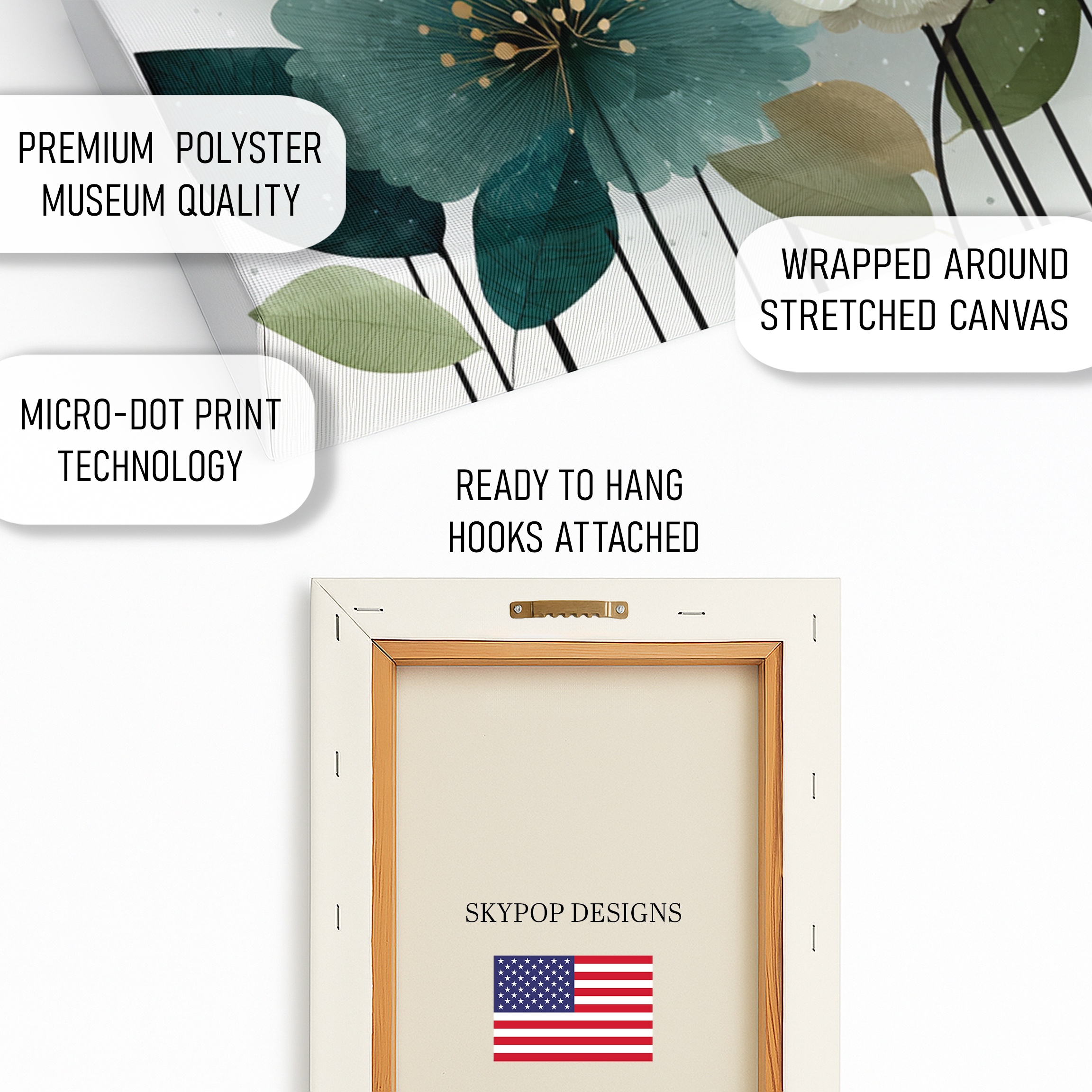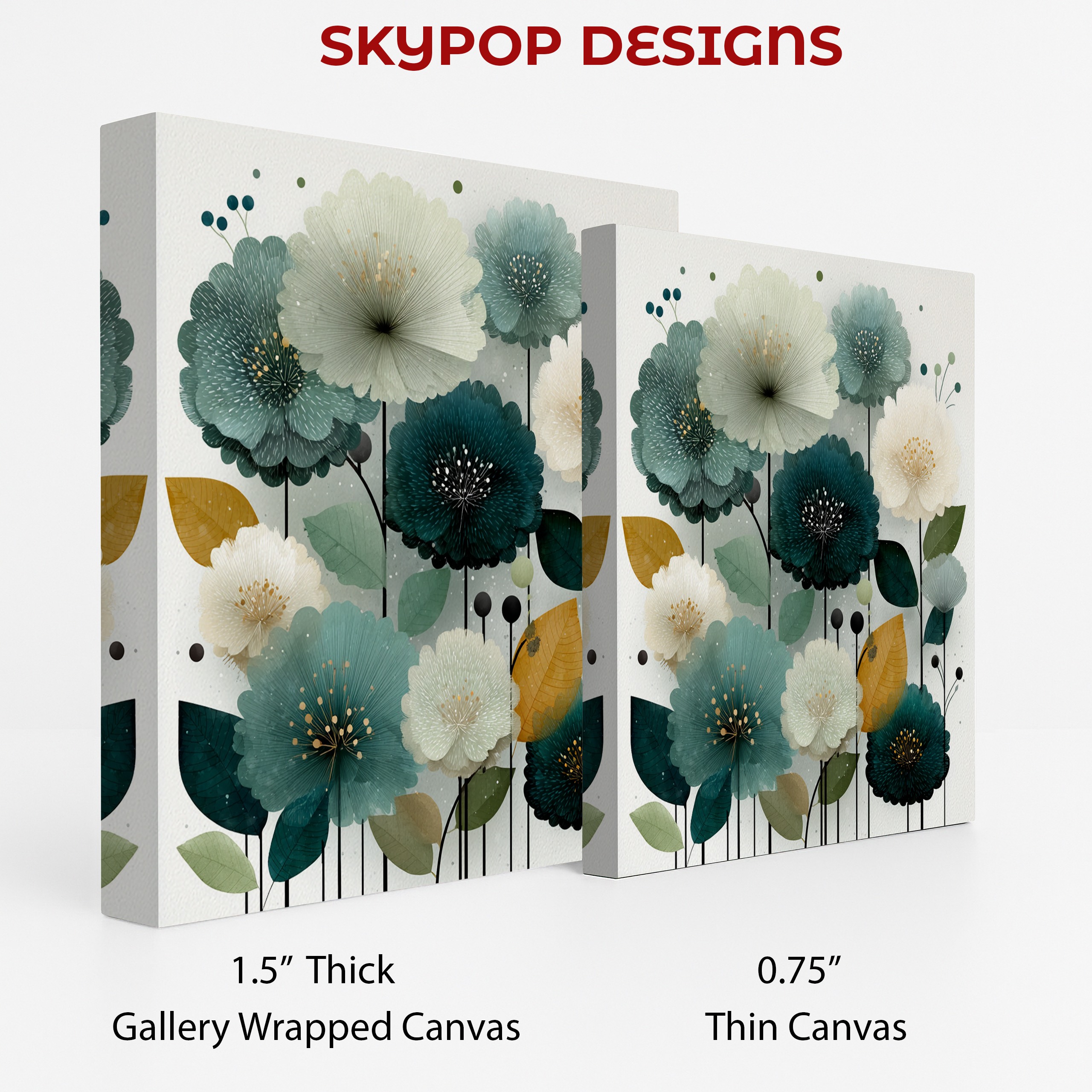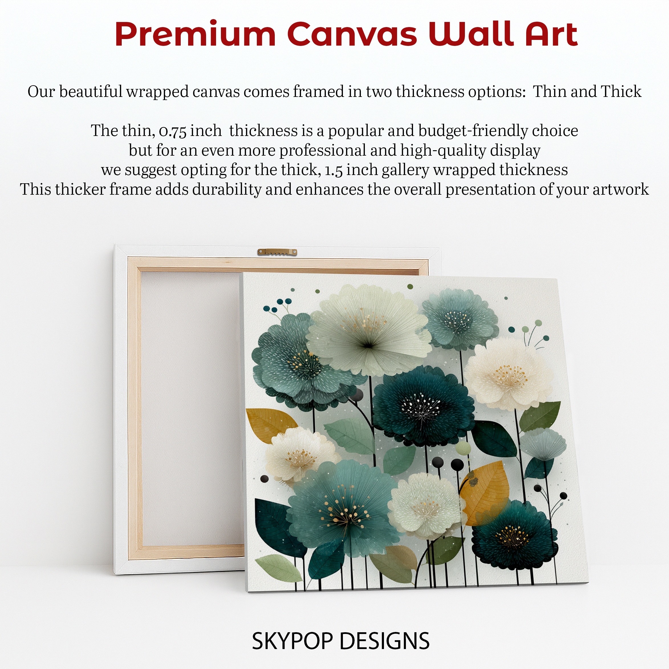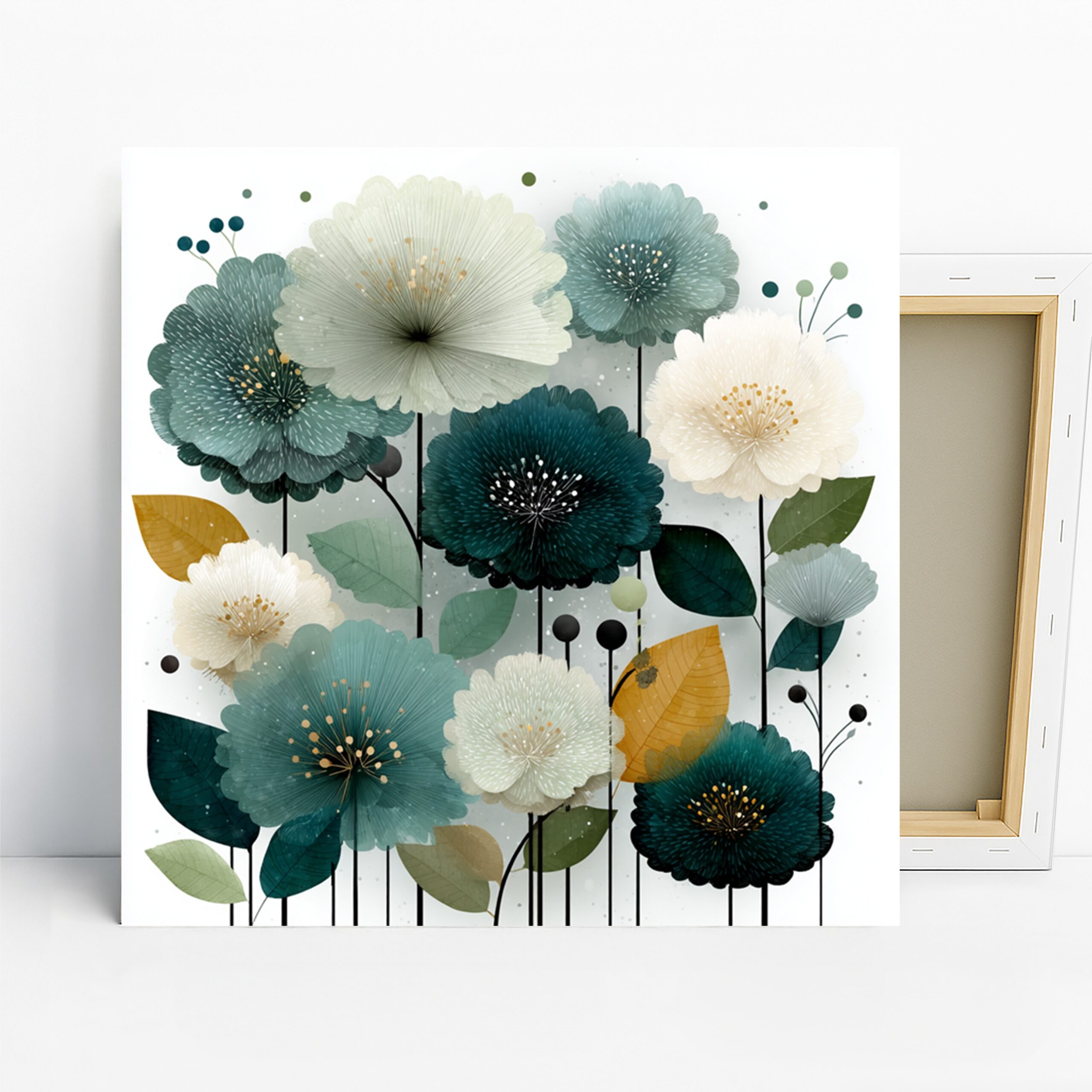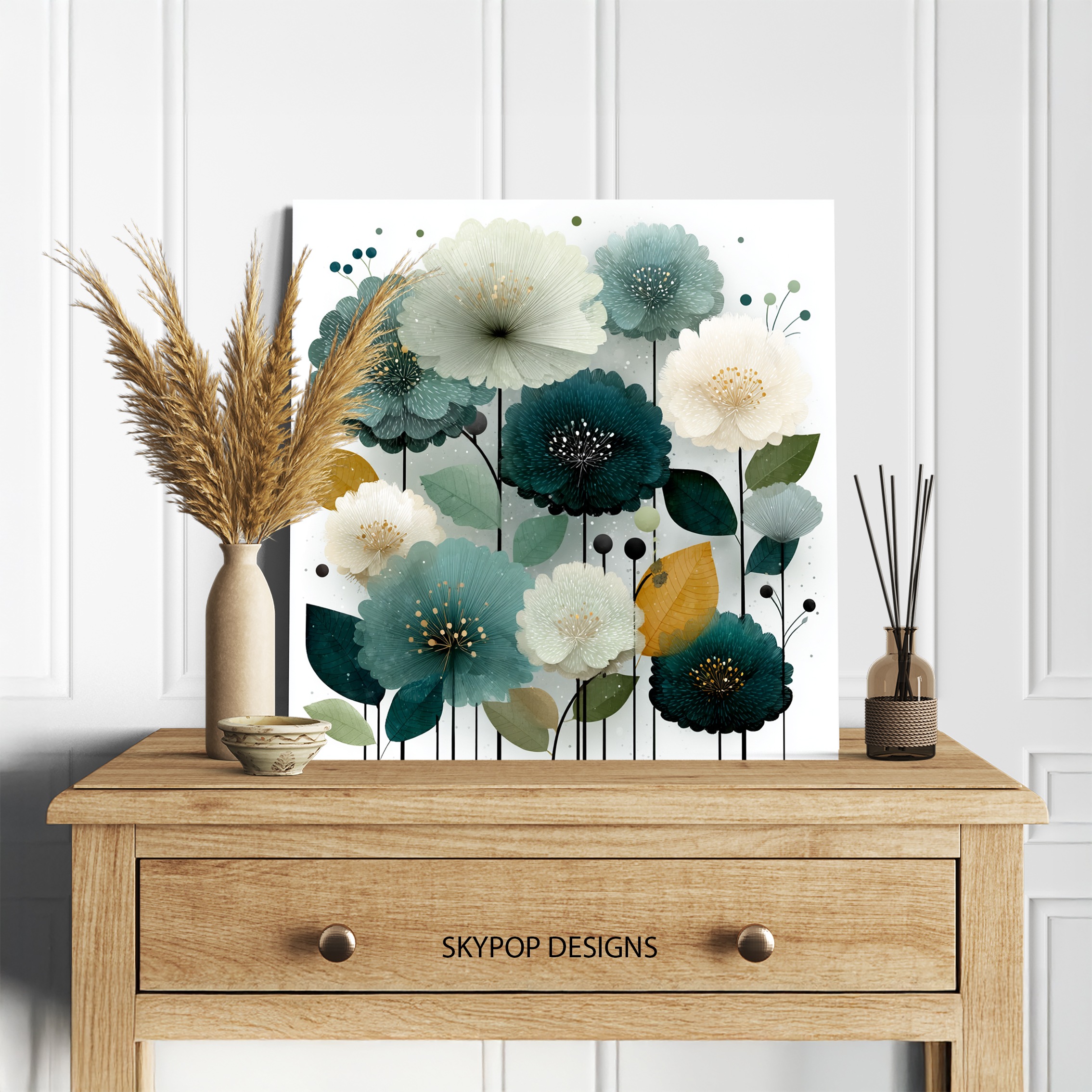 Transform your space with this stunning teal floral canvas wall art, perfect for adding a touch of modern elegance to any room. The striking composition features large, stylized blooms in various shades of teal, white, and green, creating a captivating focal point that instantly elevates your decor. This contemporary floral poster seamlessly blends nature-inspired elements with a sleek, minimalist aesthetic, making it ideal for modern living rooms or Scandinavian-style bedrooms. The cool teal palette evokes a sense of calm and tranquility, while pops of yellow add warmth and energy to the overall design. Ideal for those who love botanical themes without overwhelming traditional floral motifs, this piece brings a fresh, contemporary vibe to your walls. The abstract quality of the flowers allows for versatile placement, whether as a statement piece in your dining room or as part of a gallery wall in your home office. High-quality printing ensures every delicate detail and brushstroke is captured, from the intricate flower centers to the subtle leaf textures. This canvas art adapts beautifully to various color schemes and decor styles, making it a perfect housewarming gift or a treat for yourself to refresh your space. Whether you’re looking to create a serene bedroom retreat or a inspiring home office environment, this teal bloom artwork delivers both style and sophistication. Enhance your home’s atmosphere with this unique blend of floral beauty and modern design. Add this versatile and eye-catching canvas to your wall art collection today and watch your space bloom with contemporary charm.