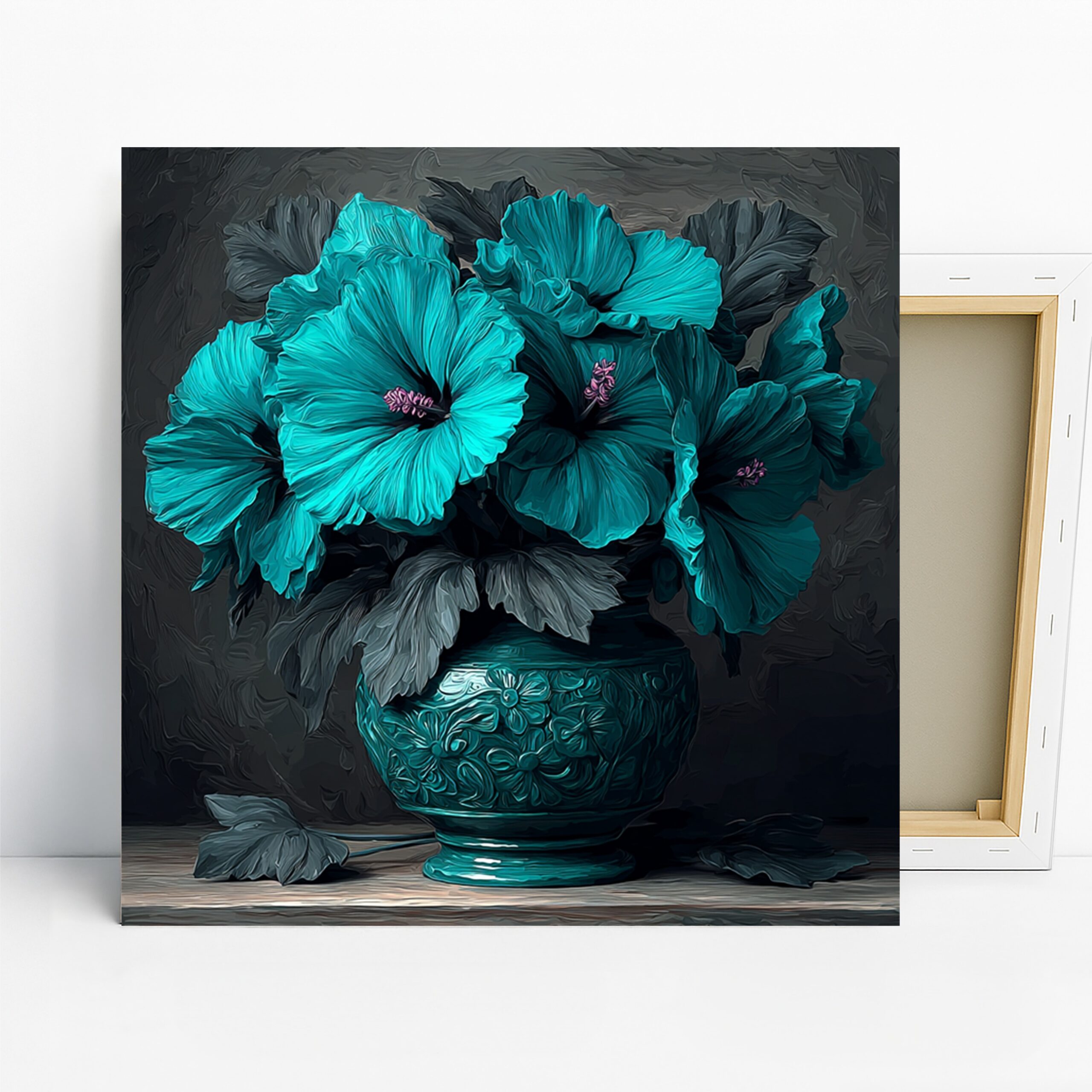 Elevate your home with this striking teal hibiscus canvas wall art, a captivating piece that transforms any space. The vibrant, oversized hibiscus blooms in a rich teal hue are artfully arranged in an ornate vase, creating a luxurious focal point. This stunning poster or canvas wall art showcases the beauty of nature with a contemporary twist, perfect for modern living rooms or elegant bedrooms. The deep teal colors evoke feelings of tranquility and sophistication, adding a splash of vibrant energy to your interior design. Ideal for those who appreciate floral art and glam decor, this artwork is a versatile choice that enhances both minimalist and opulent settings. The detailed rendering of the hibiscus petals and the textured vase make this canvas art a true statement piece. It’s a perfect gift for housewarmings, birthdays, or holidays, bringing a touch of natural elegance to any home. This high-quality canvas wall art offers a captivating visual experience, ideal for creating a sophisticated ambiance in your dining room or entryway. The interplay of vibrant teal against a subtly dark background creates a dramatic and memorable effect, making this poster a must-have for your wall decor collection. Add a touch of refined beauty and timeless appeal to your living space with this exquisite hibiscus artwork today.