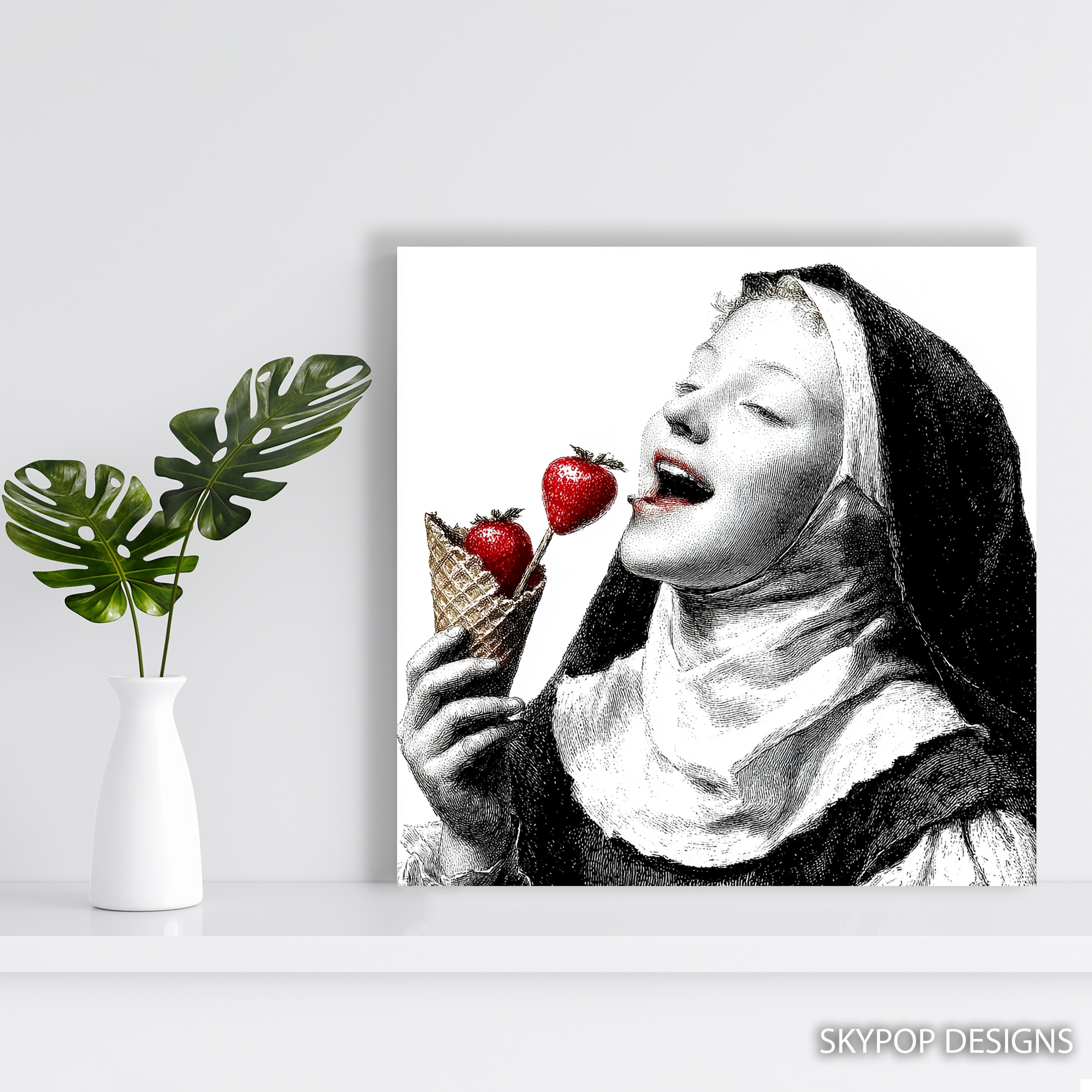 Indulge your senses with this striking canvas wall art that blends classic imagery with a contemporary twist. This captivating poster features a dramatic black and white portrait with a pop of vibrant red strawberries, creating an eye-catching contrast that demands attention. Perfect for adding a touch of mystery and allure to your dining room or kitchen decor, this unique piece seamlessly combines gothic aesthetics with modern minimalism. The juxtaposition of the monochromatic figure against the luscious red fruit creates a powerful visual statement, ideal for those seeking to elevate their space with thought-provoking wall art. Whether displayed in a sleek office setting or as a focal point in your living room, this canvas art sparks conversation and adds depth to any interior design scheme. The high-quality printing captures every intricate detail, from the delicate linework to the textured appearance of the strawberries. This versatile artwork adapts effortlessly to various decor styles, making it a perfect gift for art enthusiasts or a stunning addition to your own collection. Transform your walls with this bold and evocative piece that celebrates the timeless allure of classic portraiture with a surrealist edge. Embrace the power of contrast and bring a touch of intrigue to your home or workspace with this unforgettable strawberry-themed wall art today.