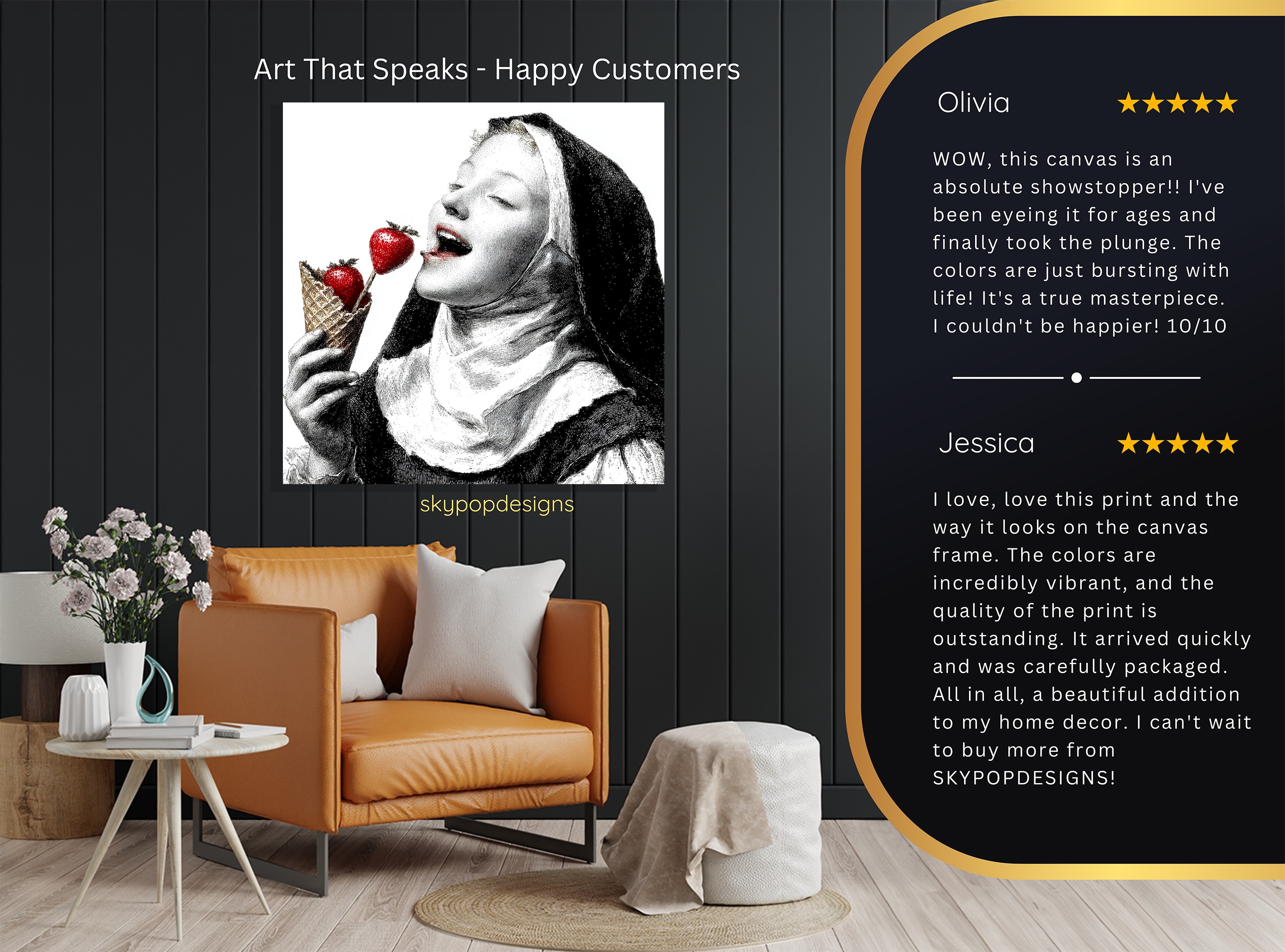 At SKYPOPDESIGNS, we specialize in high-quality canvas and poster prints designed to bring sophistication and style to your space. Please note that our designs are not created with 3D textures or as original oil, acrylic, or watercolor paintings; they are instead HD reproductions of original artwork. This approach allows us to offer these visually stunning pieces at competitive prices, ensuring you receive top-tier, maintenance-free art that’s easy to enjoy.