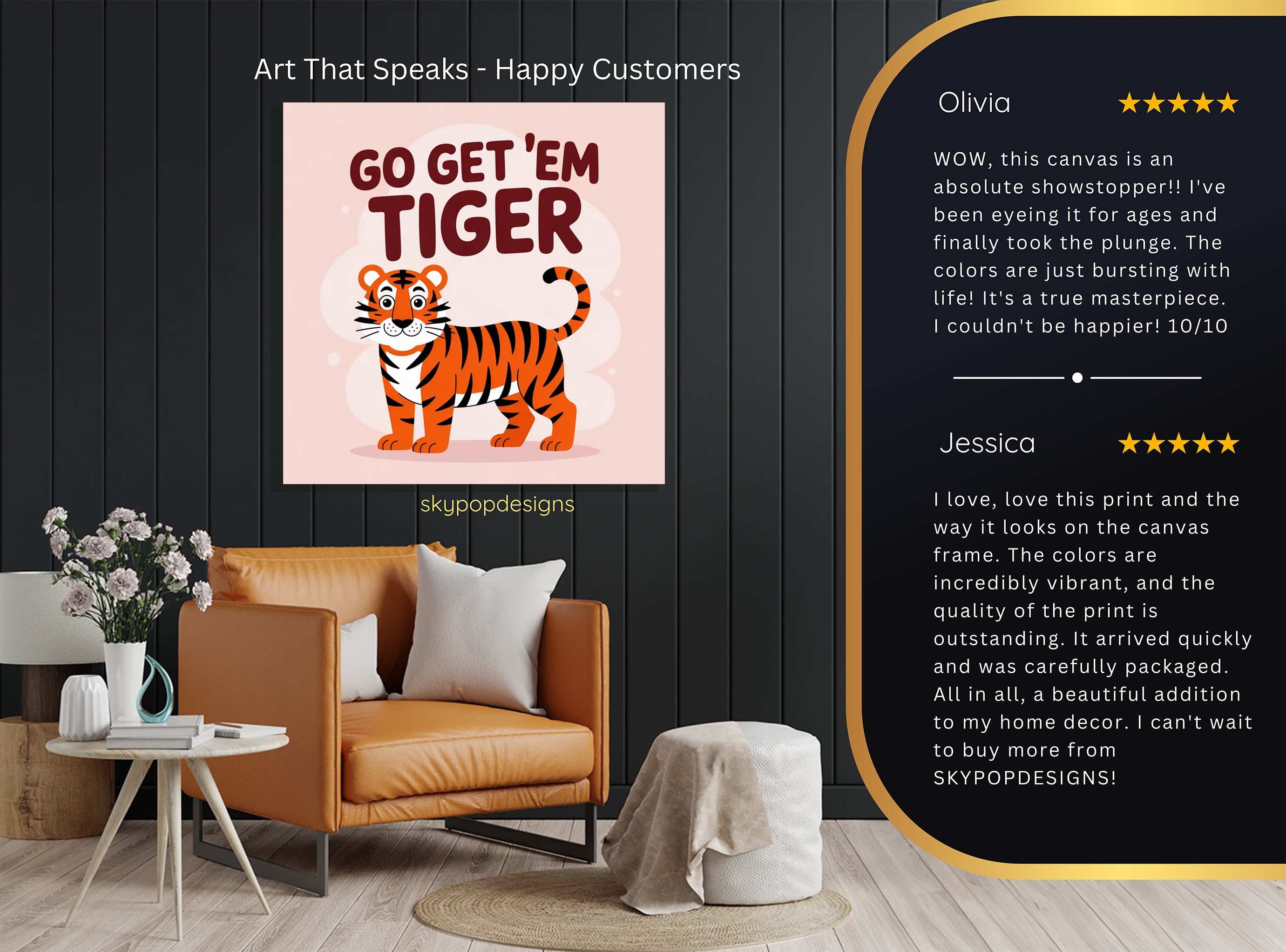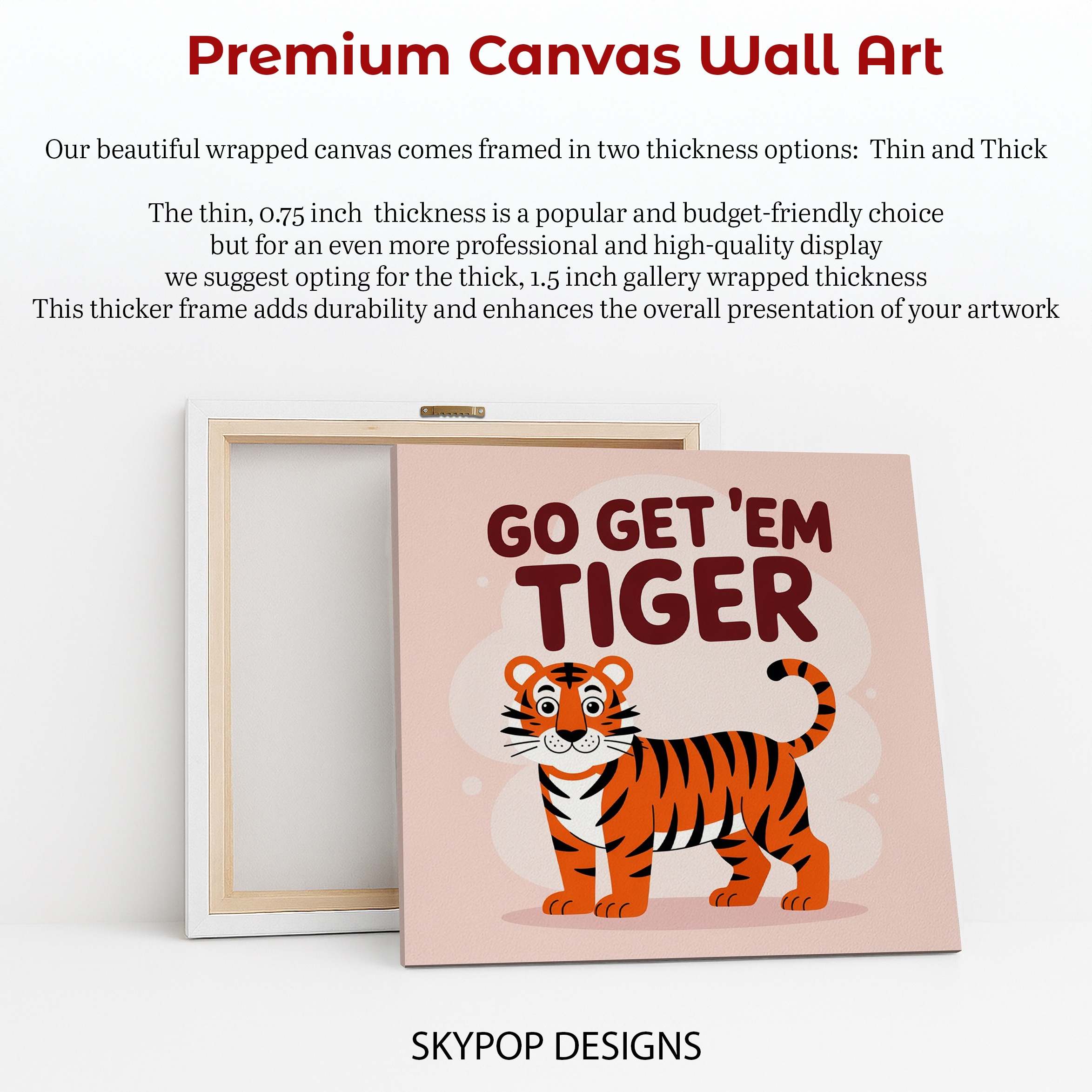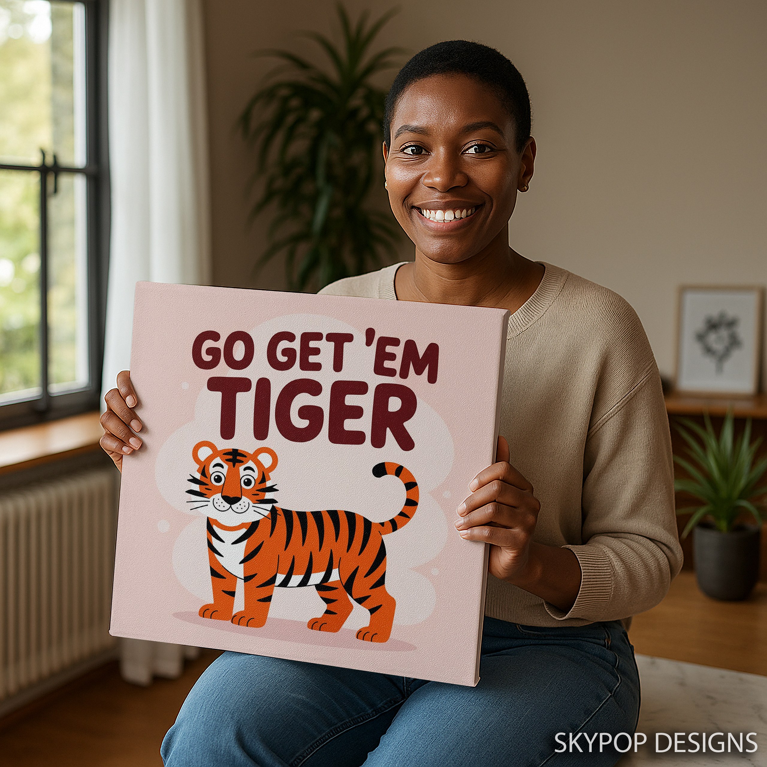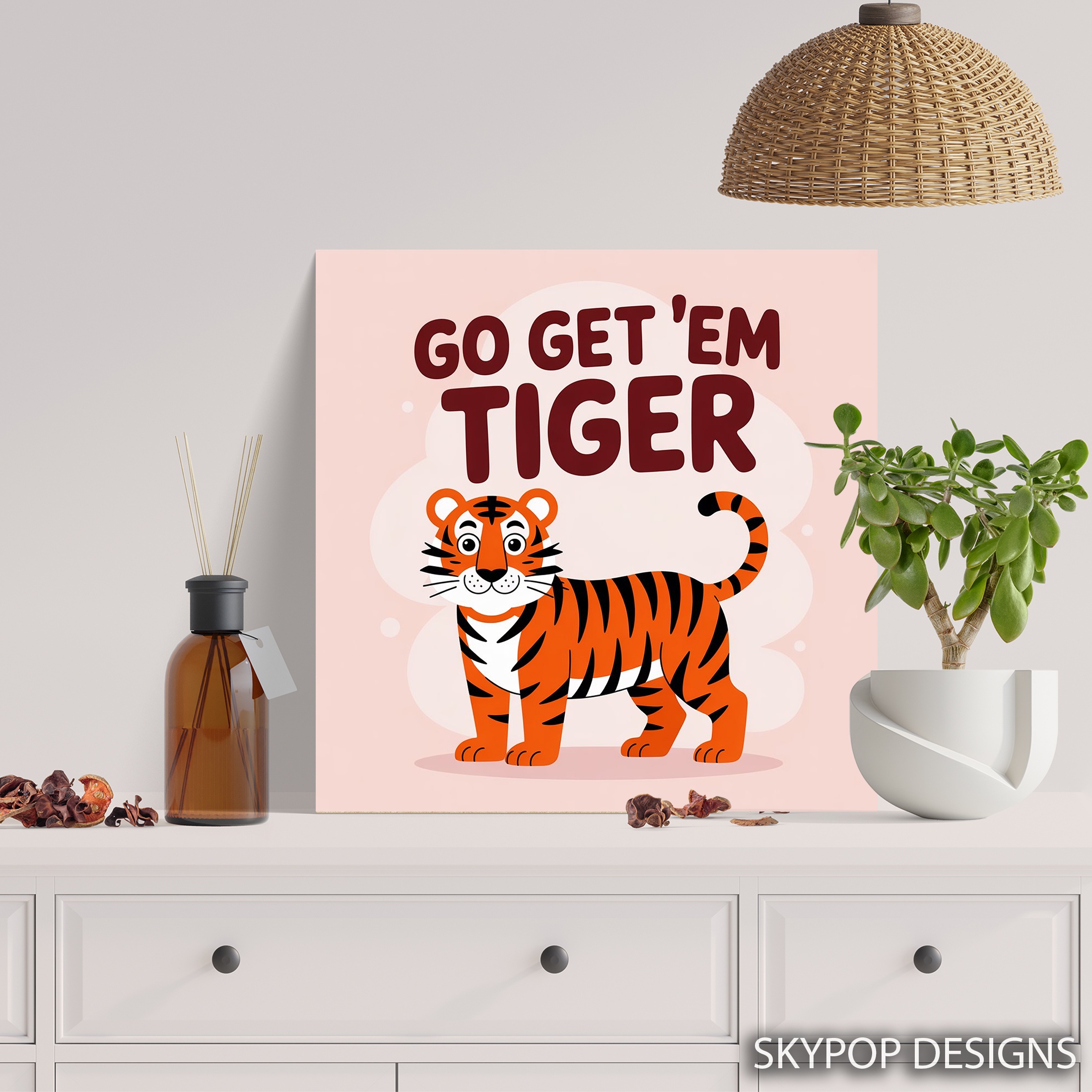 Energize your space with this vibrant “Go Get ‘Em Tiger” canvas wall art, perfect for adding a playful and motivational touch to any room. This striking poster features a charming cartoon tiger with expressive eyes and a friendly smile, set against a soft pink background. The bold red text above the tiger creates an eye-catching contrast, making this piece a standout in contemporary and modern interiors. Ideal for children’s rooms or nurseries, this whimsical animal art inspires confidence and encouragement. The retro-inspired design adds a touch of nostalgia, making it equally appealing in living rooms or home offices. The bright orange tiger with black stripes pops against the pastel backdrop, creating a visually engaging focal point. This canvas art is perfect for those looking to incorporate uplifting messages into their decor. The minimalist style ensures it complements a variety of color schemes and design aesthetics. Whether you’re decorating a new home or refreshing your current space, this tiger artwork adds personality and warmth. The high-quality printing captures every detail, from the tiger’s whiskers to the subtle texture in the background. Give your walls a boost of positivity and charm with this delightful tiger-themed wall art. Transform your room today with this versatile and inspiring piece that’s sure to bring smiles and motivation to all who see it.