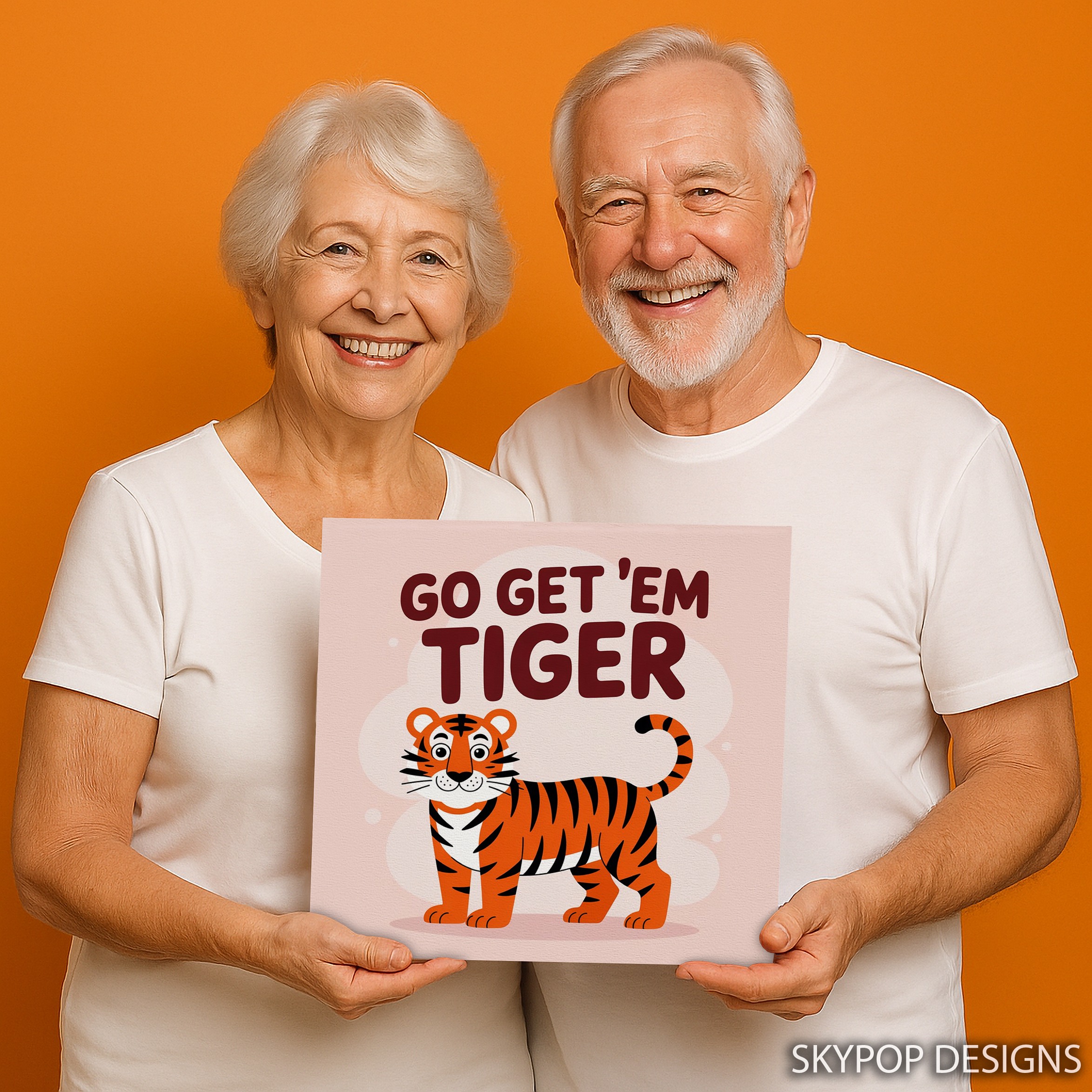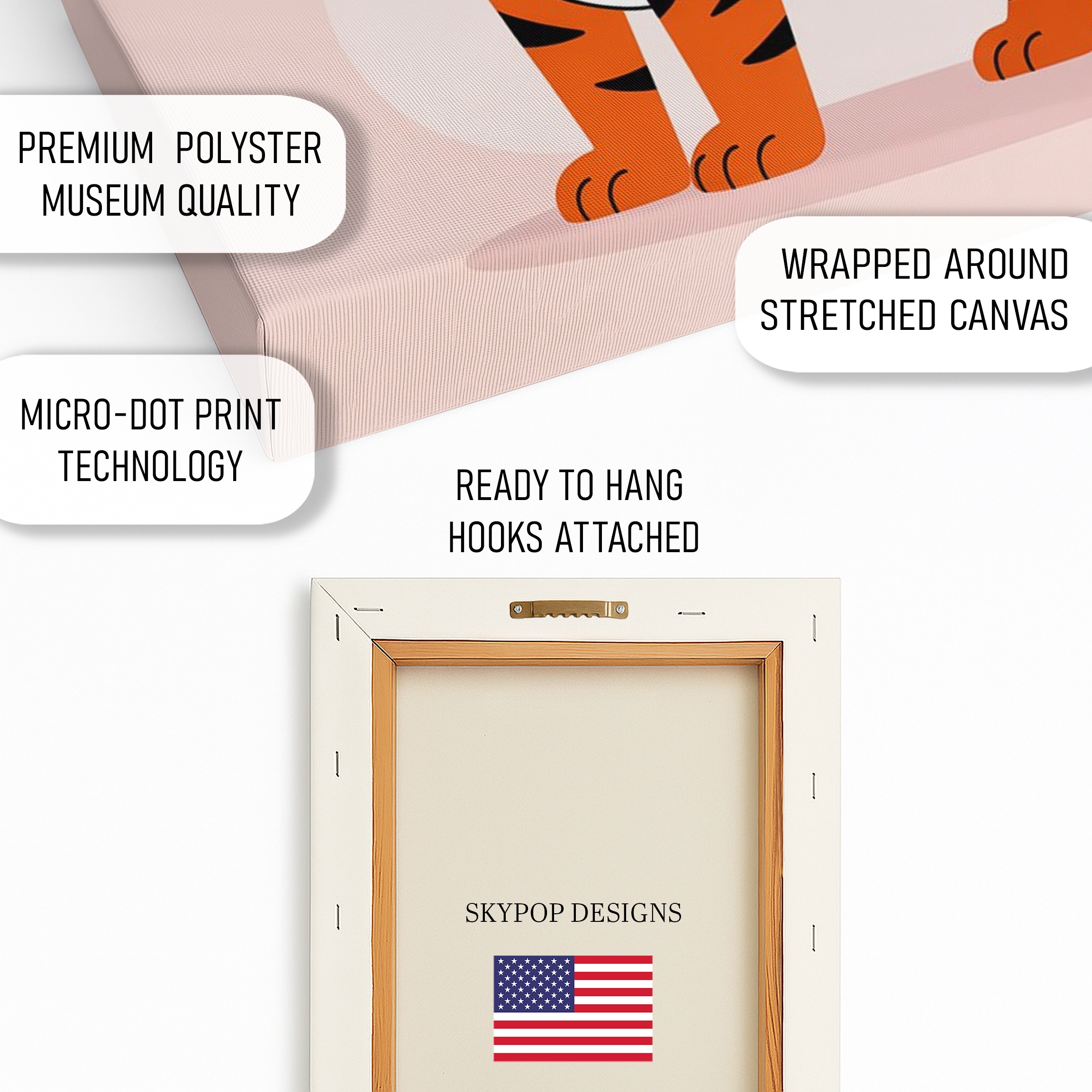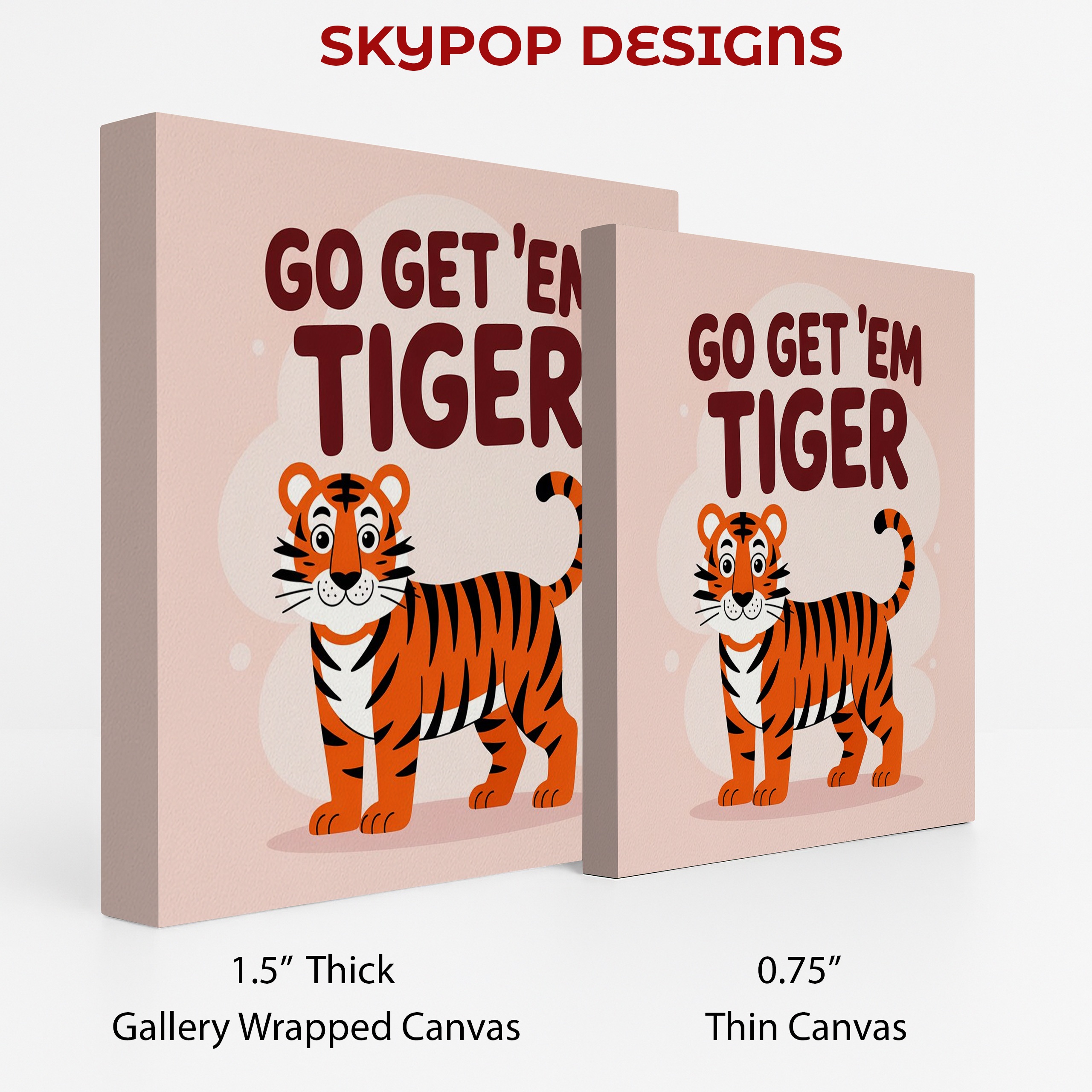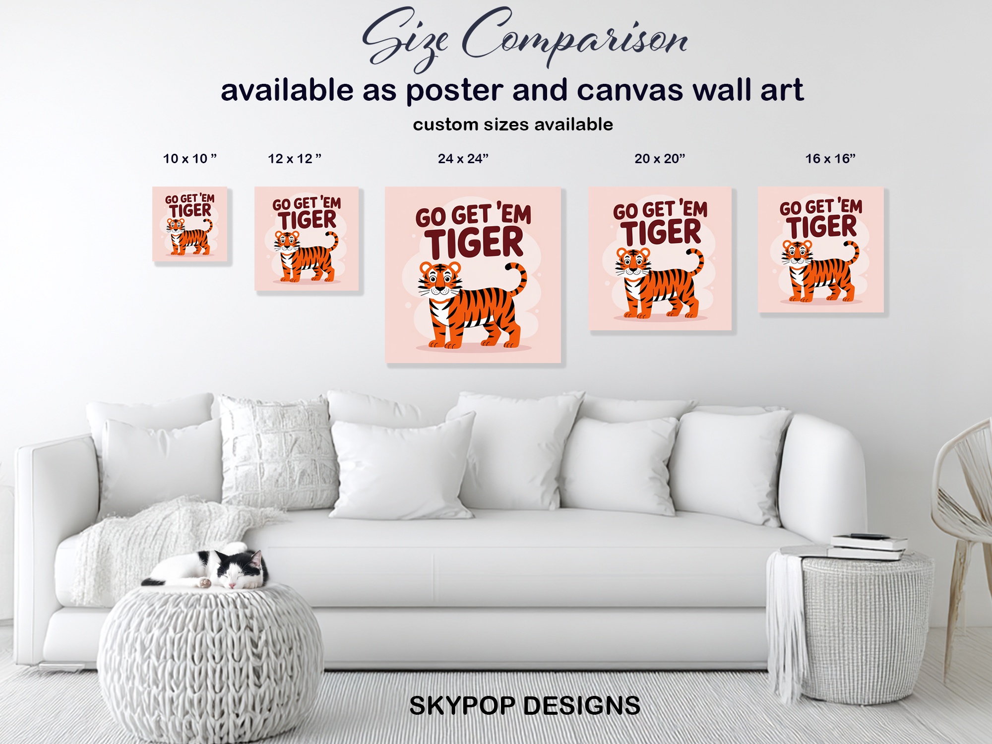 Energize your space with this vibrant “Go Get ‘Em Tiger” canvas wall art, perfect for adding a playful and motivational touch to any room. This striking poster features a charming cartoon tiger with expressive eyes and a friendly smile, set against a soft pink background. The bold red text above the tiger creates an eye-catching contrast, making this piece a standout in contemporary and modern interiors. Ideal for children’s rooms or nurseries, this whimsical animal art inspires confidence and encouragement. The retro-inspired design adds a touch of nostalgia, making it equally appealing in living rooms or home offices. The bright orange tiger with black stripes pops against the pastel backdrop, creating a visually engaging focal point. This canvas art is perfect for those looking to incorporate uplifting messages into their decor. The minimalist style ensures it complements a variety of color schemes and design aesthetics. Whether you’re decorating a new home or refreshing your current space, this tiger artwork adds personality and warmth. The high-quality printing captures every detail, from the tiger’s whiskers to the subtle texture in the background. Give your walls a boost of positivity and charm with this delightful tiger-themed wall art. Transform your room today with this versatile and inspiring piece that’s sure to bring smiles and motivation to all who see it.