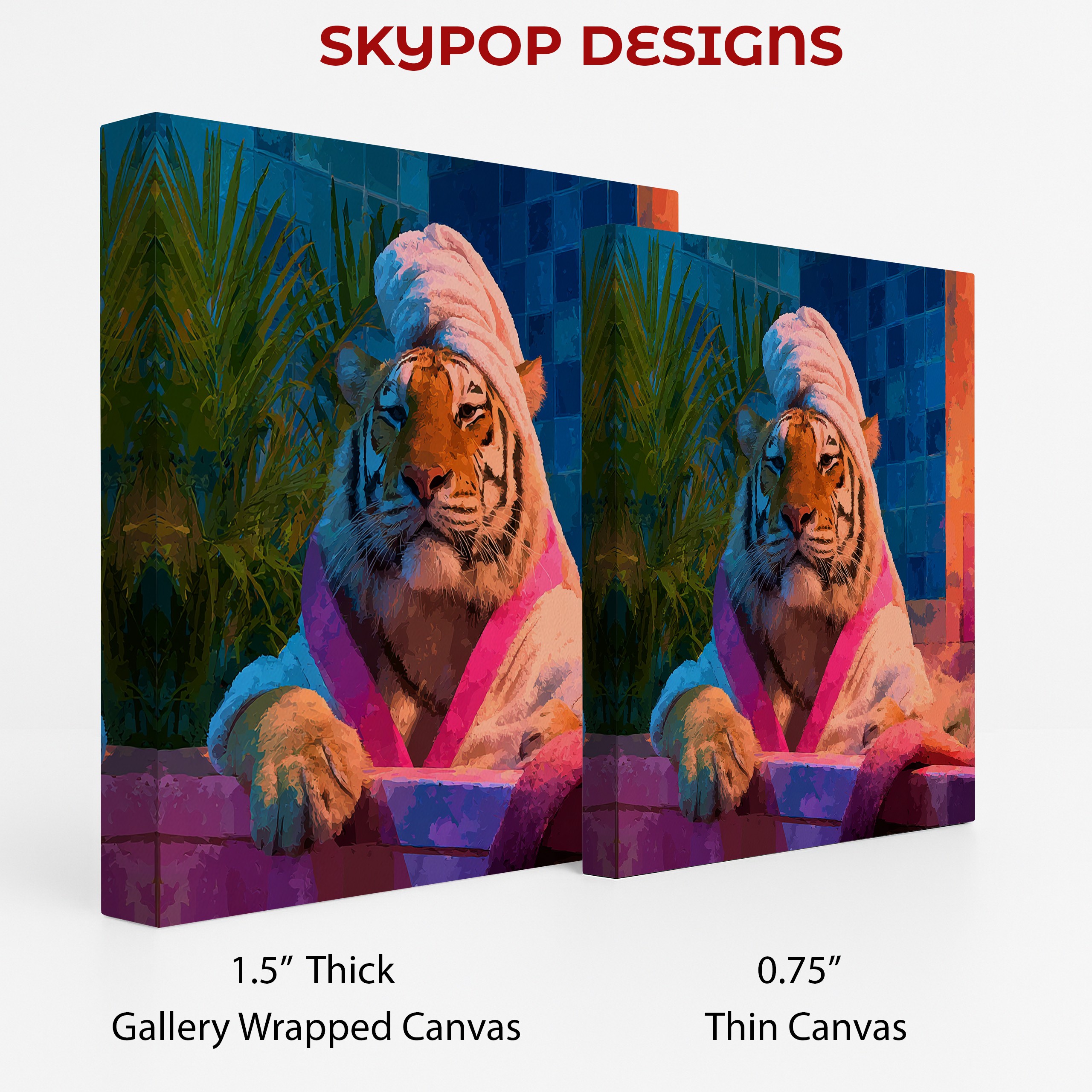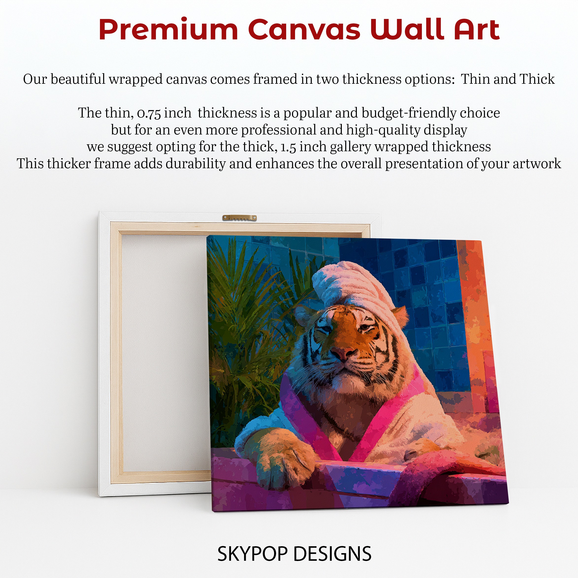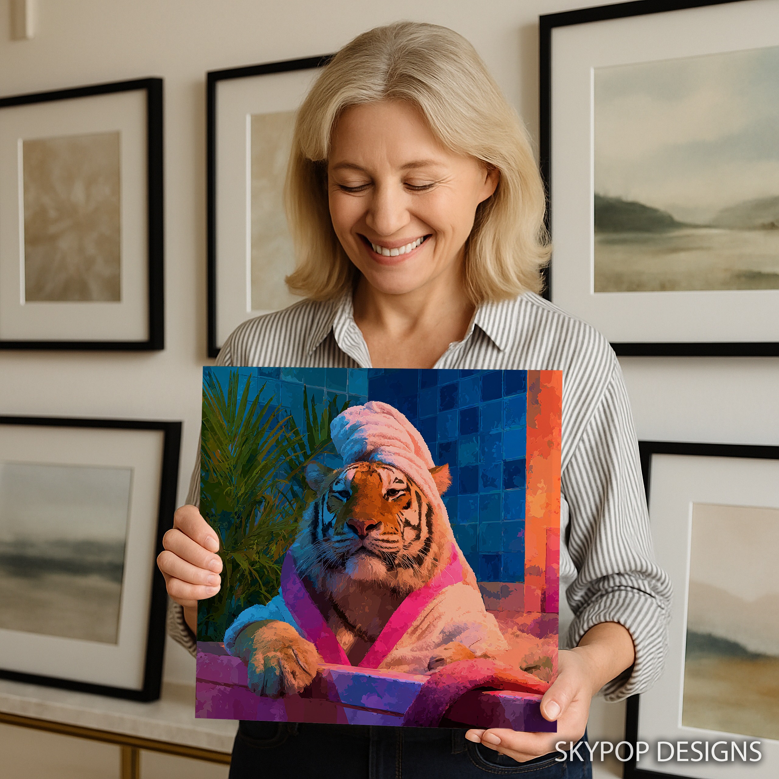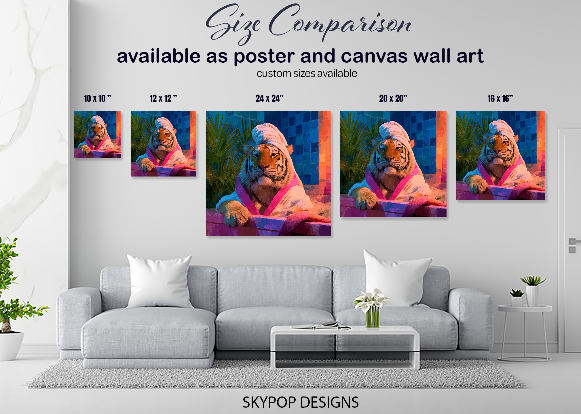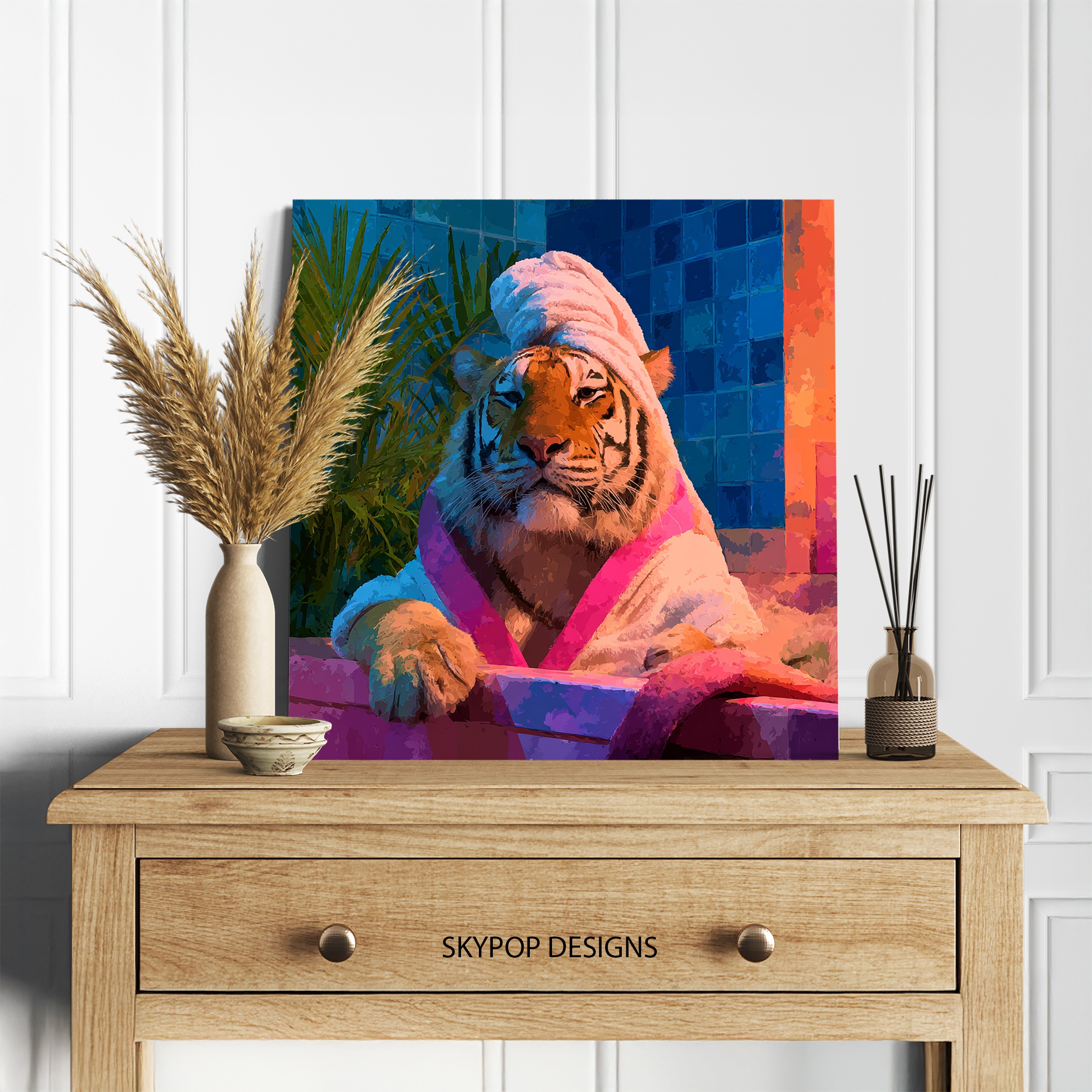 Transform your space with this captivating tiger canvas wall art that brings a playful twist to animal-inspired decor. This unique poster features a majestic tiger wrapped in a plush pink towel, embodying the ultimate spa day relaxation. The vibrant color palette of pink, blue, orange, and purple creates a striking contrast against the tiger’s natural stripes, making this piece a true conversation starter. Perfect for contemporary bathrooms or bohemian bedrooms, this whimsical wall art adds a touch of humor and personality to any room. The unexpected combination of a fierce predator in a pampering scenario offers a delightful juxtaposition that’s sure to bring smiles and intrigue. Ideal for animal lovers or those seeking to inject fun into their modern living spaces, this canvas art seamlessly blends pop culture with nature-inspired themes. The high-quality printing captures every detail, from the tiger’s expressive eyes to the texture of the towel, ensuring this piece remains a focal point in your home for years to come. Whether you’re looking to create a quirky accent in your office or add a splash of color to your living room, this tiger artwork offers versatile appeal. Give your walls a refresh with this imaginative and eye-catching canvas that celebrates the lighter side of wildlife. Elevate your home decor today with this unique blend of humor, art, and animal magnetism.
