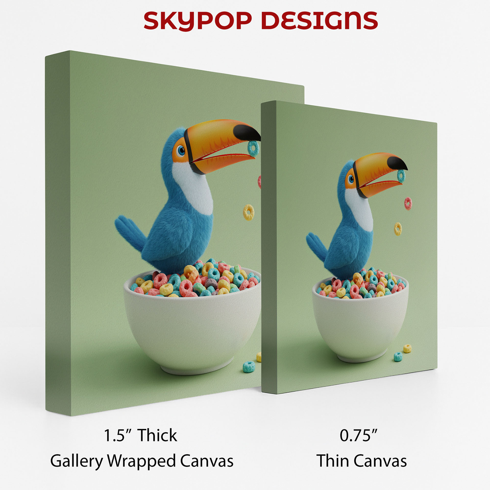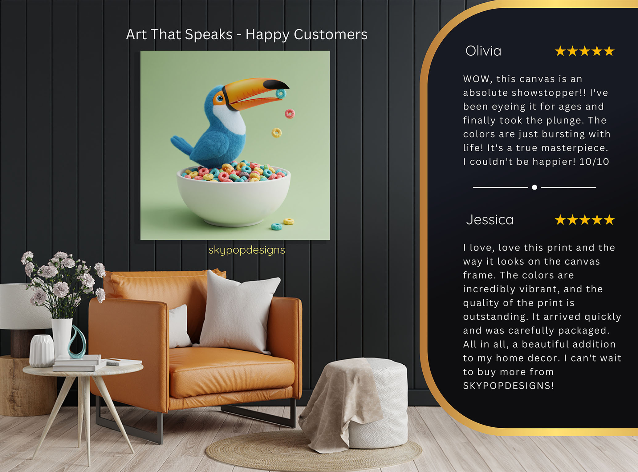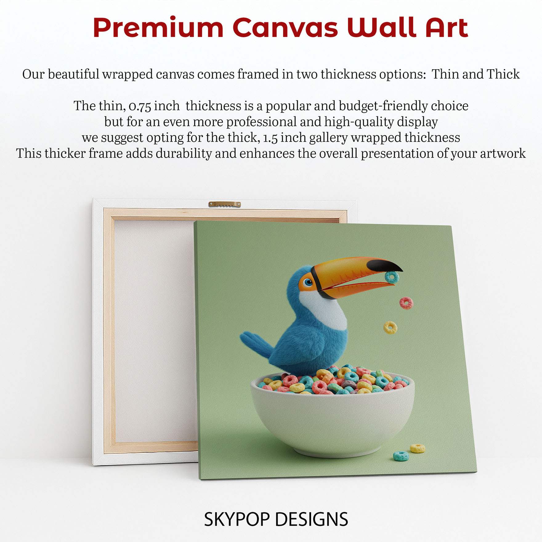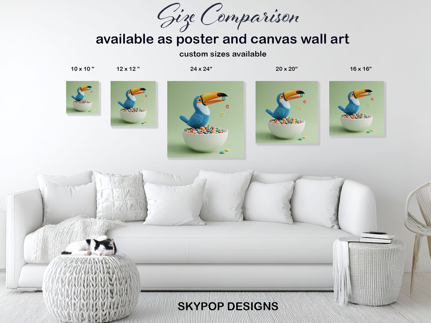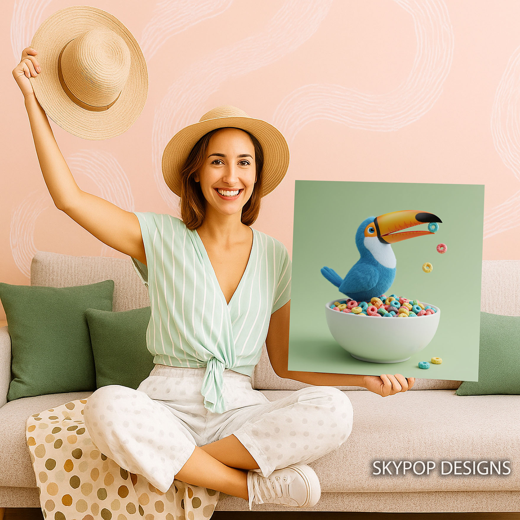 Bring a burst of joy and whimsy to your home with this vibrant Toucan canvas wall art, perfect for adding a fun focal point to any room. This delightful poster or canvas wall art showcases a cheerful toucan enjoying a bowl of colorful cereal, making it an ideal addition for a children’s room, kitchen, or entryway decor. The striking blues and vibrant oranges of the toucan, contrasted with the multicolor cereal, create a captivating and playful scene that’s sure to spark conversation. This animal art piece is perfect for bohemian or modern decor styles, adding personality and a touch of coastal charm to your living space. The high-quality canvas print captures the playful texture of the toucan’s feathers and the glossy sheen of the cereal, making this artwork a true standout. It’s a fantastic way to enhance your dining room with a touch of lightheartedness or bring an uplifting mood to any corner of your home. This versatile canvas wall art makes an excellent gift for birthdays, housewarmings, or any occasion, bringing smiles and cheer to recipients. The bright and energizing color palette is known to uplift moods and create a welcoming atmosphere. Elevate your wall decor with this unique and eye-catching toucan artwork that celebrates the fun in everyday moments. Add this charming toucan cereal art to your collection and transform your space with its undeniable charm and playful spirit. Make your walls smile today with this exciting canvas print.