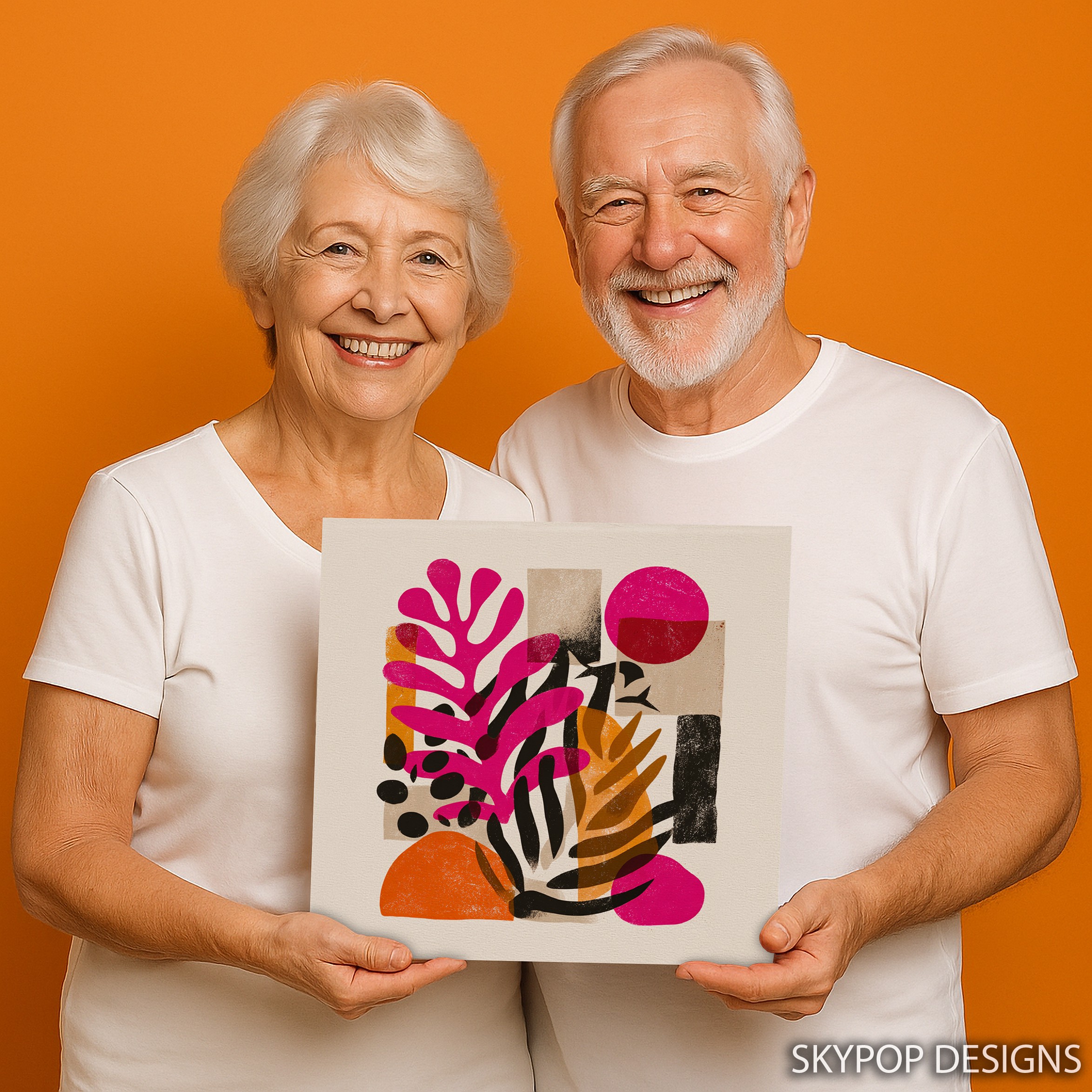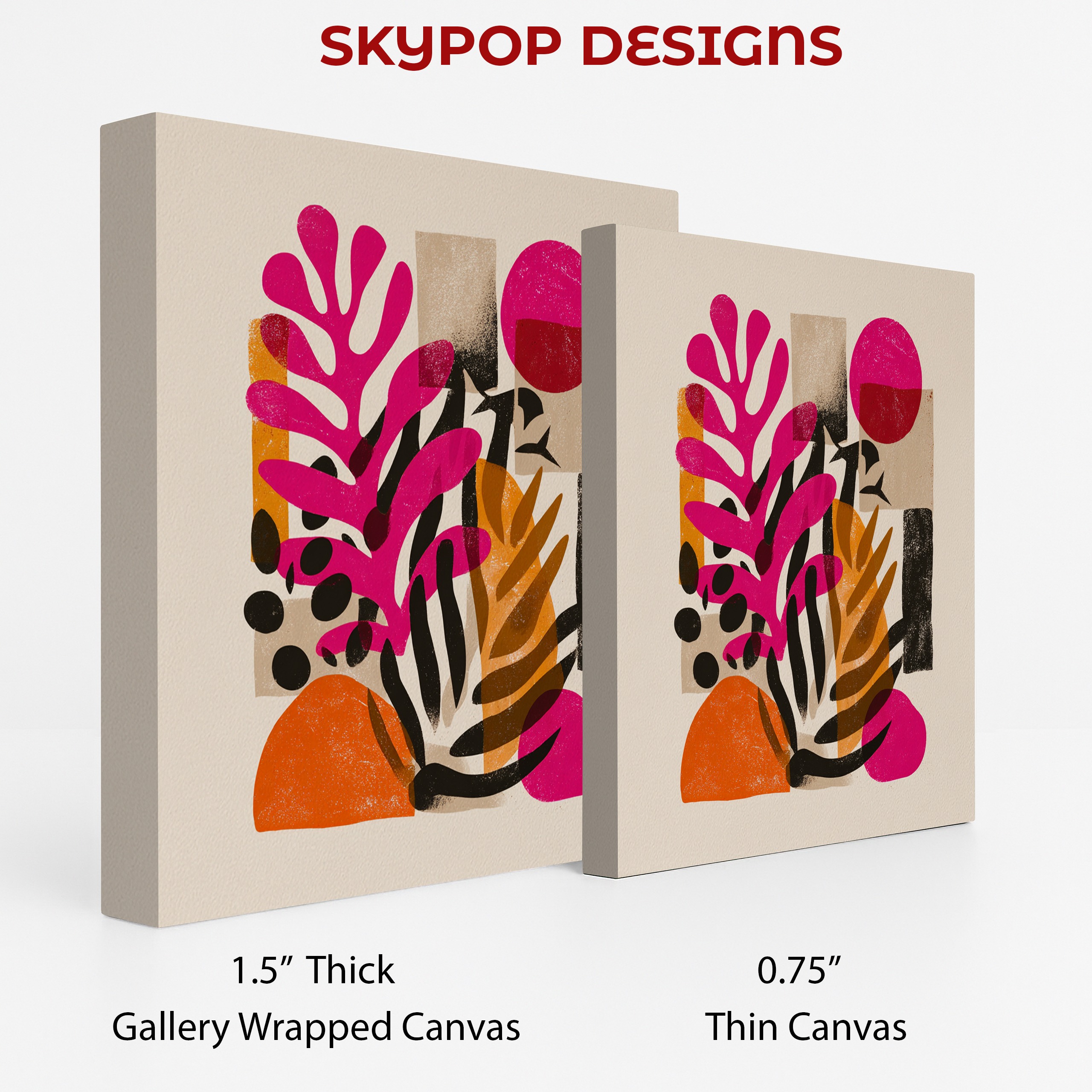 Elevate your space with this vibrant abstract canvas wall art, featuring a bold composition of tropical-inspired shapes and colors. This striking poster or canvas piece instantly transforms any room with its energetic blend of hot pink, warm orange, and sleek black forms. Perfect for modern living room wall decor or as a statement piece in a mid-century modern office, this artwork adds a pop of color and contemporary flair to your space. The minimalist design elements create a sense of balance and harmony, making it an ideal choice for Scandinavian-inspired interiors. The textured appearance adds depth and visual interest, inviting viewers to explore the intricate details up close. This versatile canvas art works beautifully as a focal point in a dining room or as part of a gallery wall in a bedroom. The abstract nature of the piece allows for personal interpretation, sparking conversation and adding a touch of sophistication to your decor. High-quality printing ensures that every brushstroke and color gradient is captured in stunning detail, making this a long-lasting addition to your art collection. Whether you’re looking to refresh your home’s atmosphere or searching for the perfect housewarming gift, this tropical abstract shapes artwork is sure to impress. Embrace the energy and creativity of contemporary design with this eye-catching canvas wall art today.