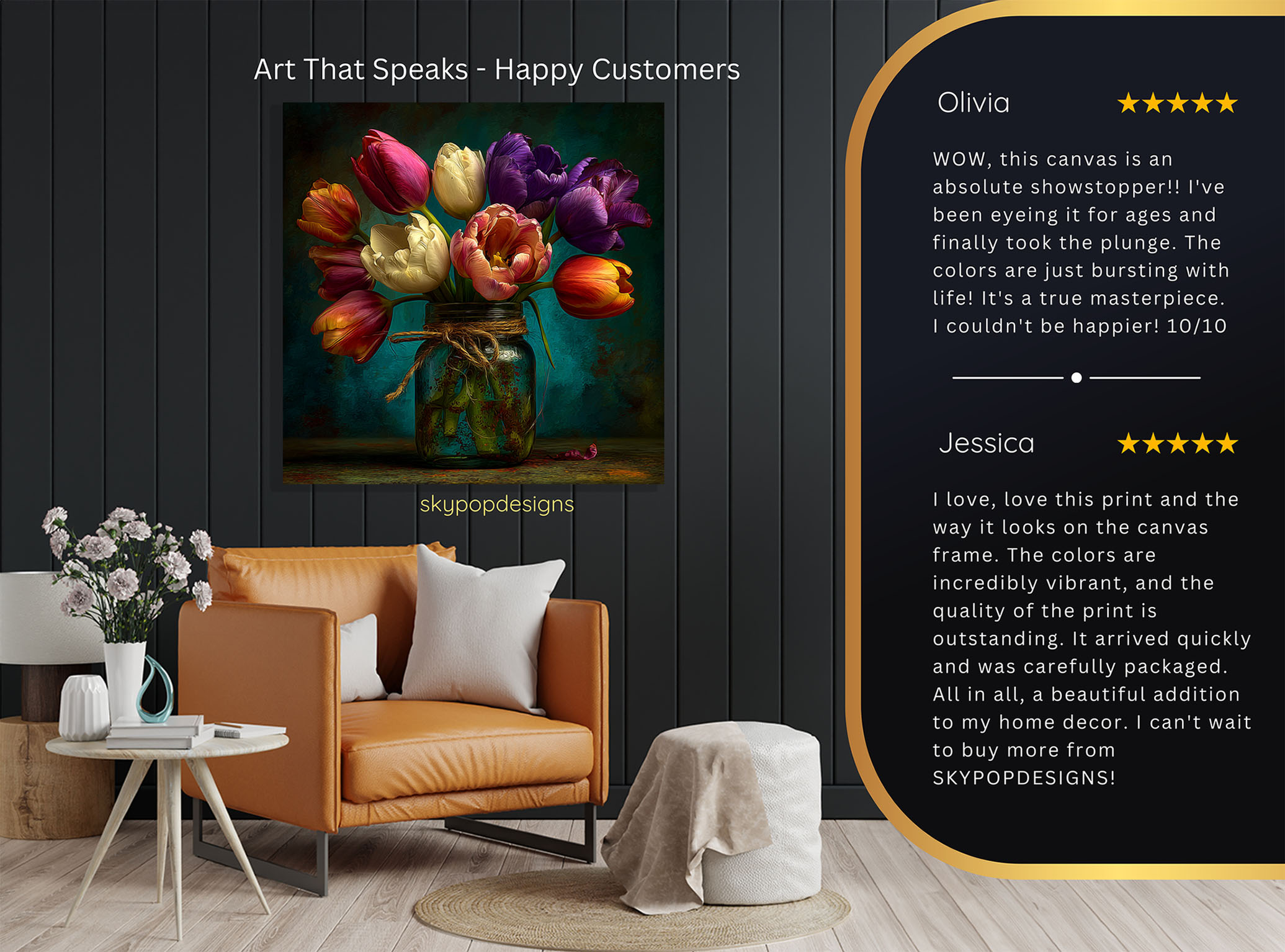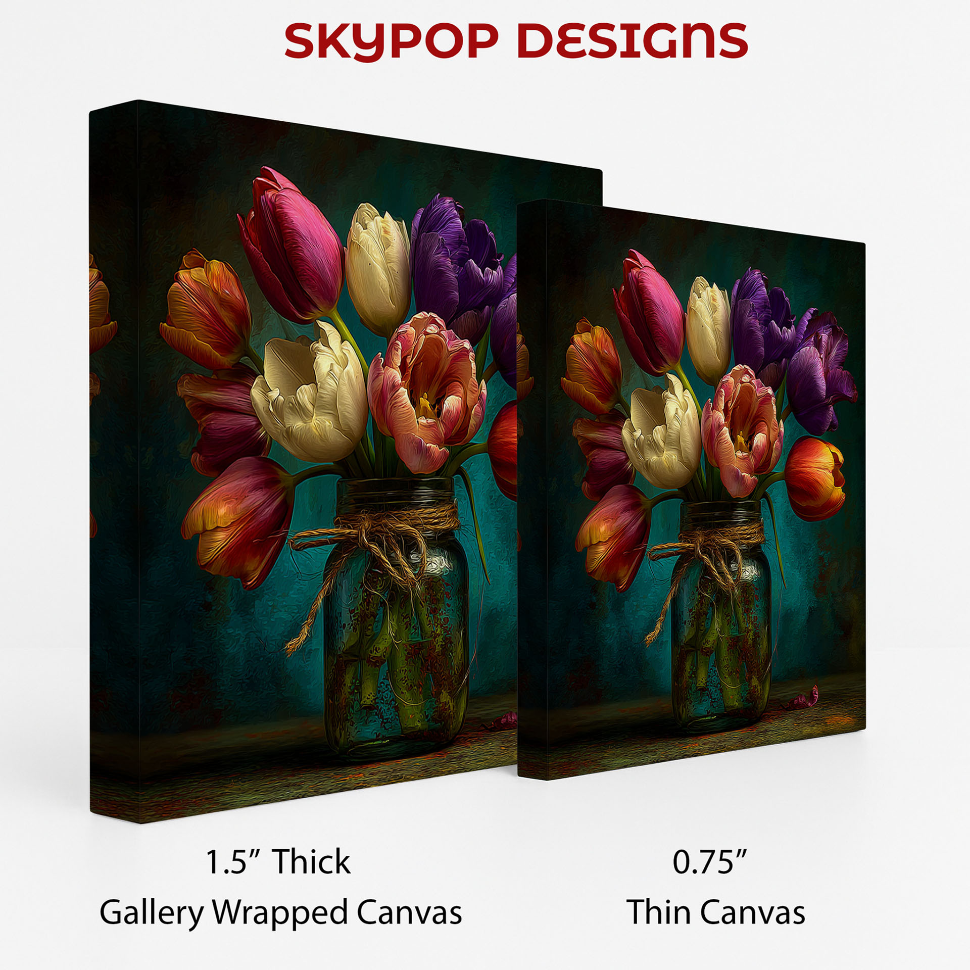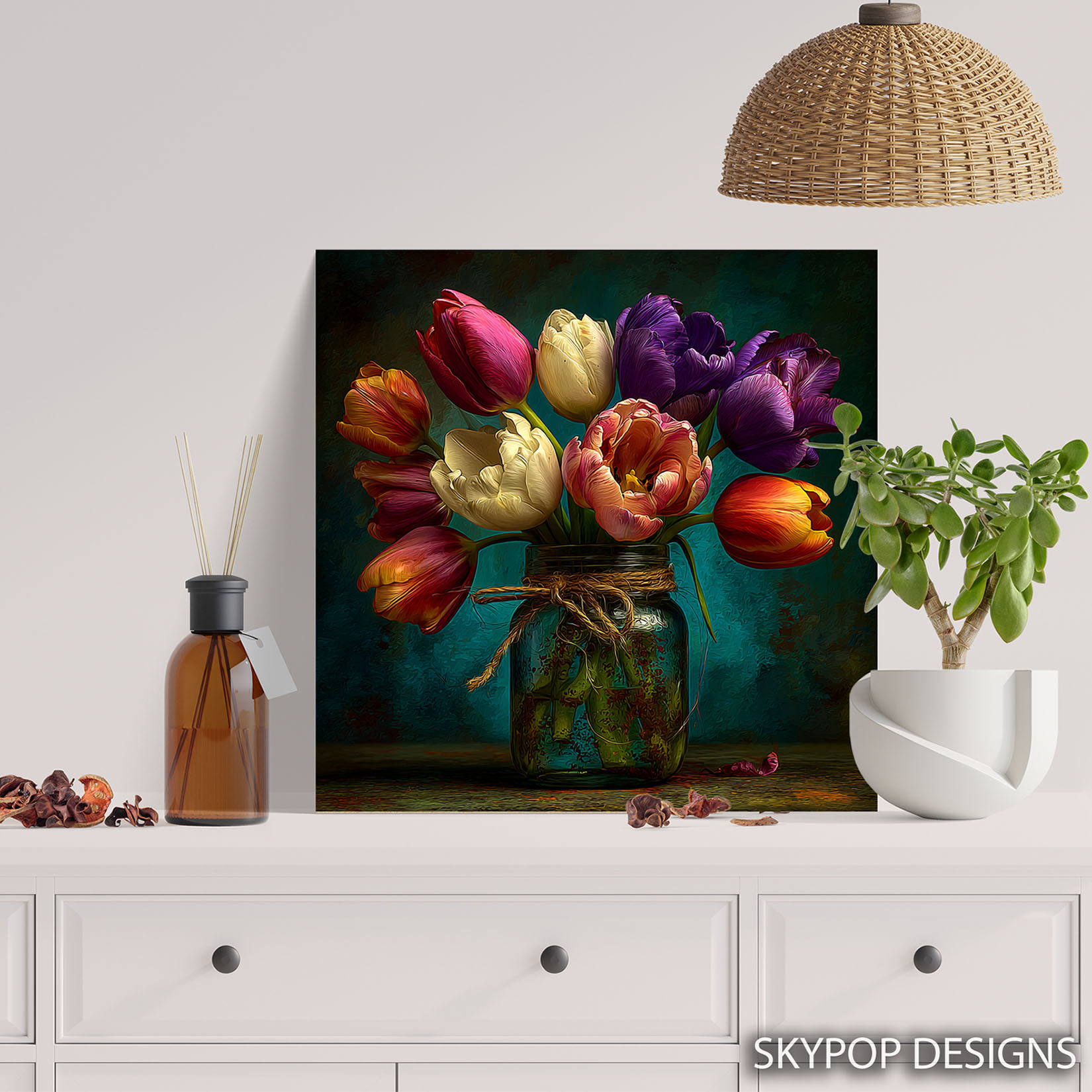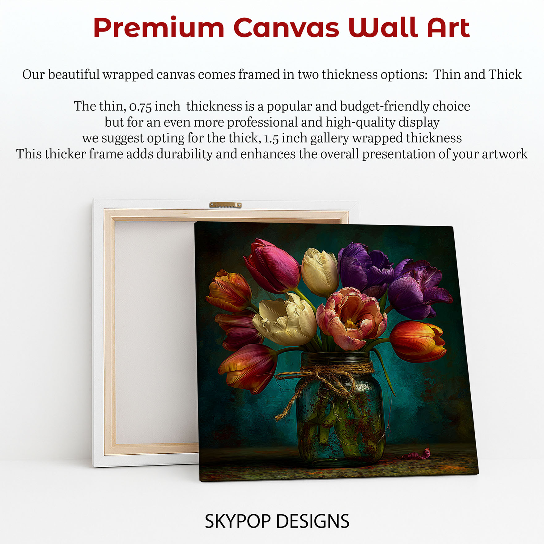 Transform your home with this stunning tulip canvas wall art, capturing the vibrant beauty of a multicolor bouquet in a rustic jar.