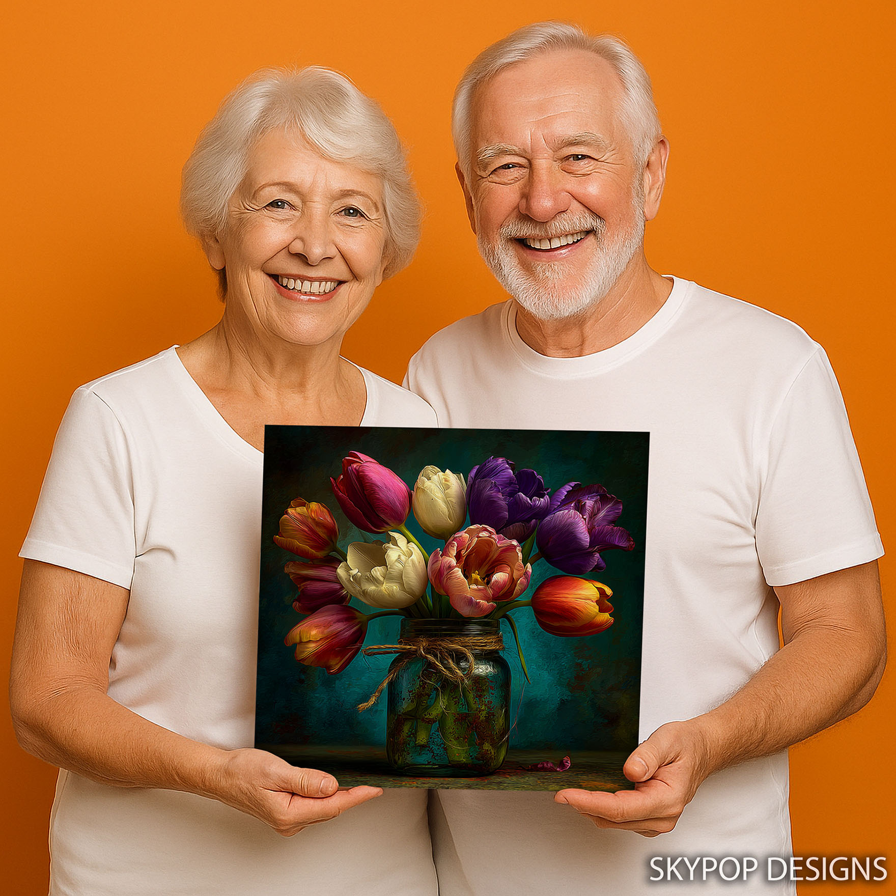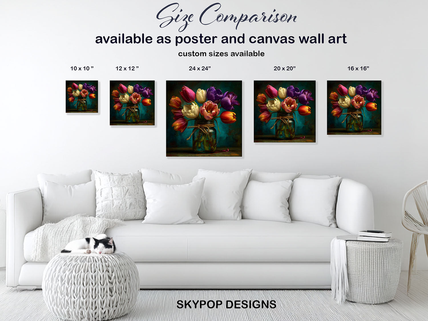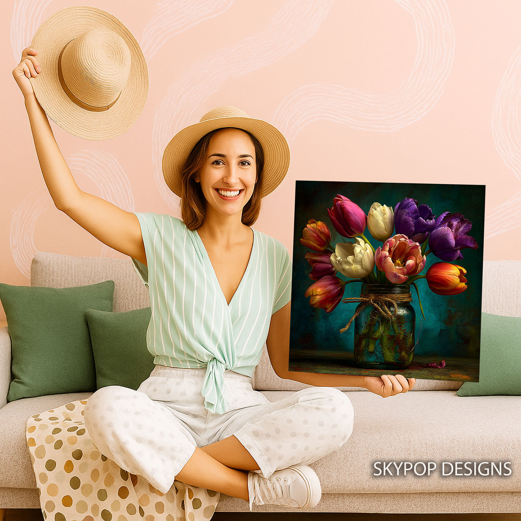 Transform your home with this stunning tulip canvas wall art, capturing the vibrant beauty of a multicolor bouquet in a rustic jar. This captivating poster or canvas wall art brings the fresh elegance of a spring garden into your living room, bedroom, or dining room. The rich teal background and the medley of tulip colors-including pops of purple, pink, orange, and creamy white-create a striking visual statement. Ideal for bohemian, farmhouse, or modern decor styles, this floral art piece adds a touch of natural charm and sophistication to any space. The Impressionist-inspired brushstrokes lend a painterly quality, making this canvas wall art a piece of art that evokes emotion and inspires joy. Its versatility makes it a perfect addition to an entryway, greeting guests with warmth and style. High-quality printing ensures the vibrant colors and intricate details of each tulip are beautifully preserved on this poster or canvas. This artwork is also a thoughtful gift for housewarmings, birthdays, or holidays, bringing a piece of nature’s splendor to loved ones. Elevate your decor with this unique flower wall art that seamlessly blends classic floral motifs with contemporary design. Showcase your appreciation for nature’s artistry and enhance your home’s ambiance with this breathtaking tulip canvas art. Brighten your walls and lift your spirits with this exquisite floral wall art today.
