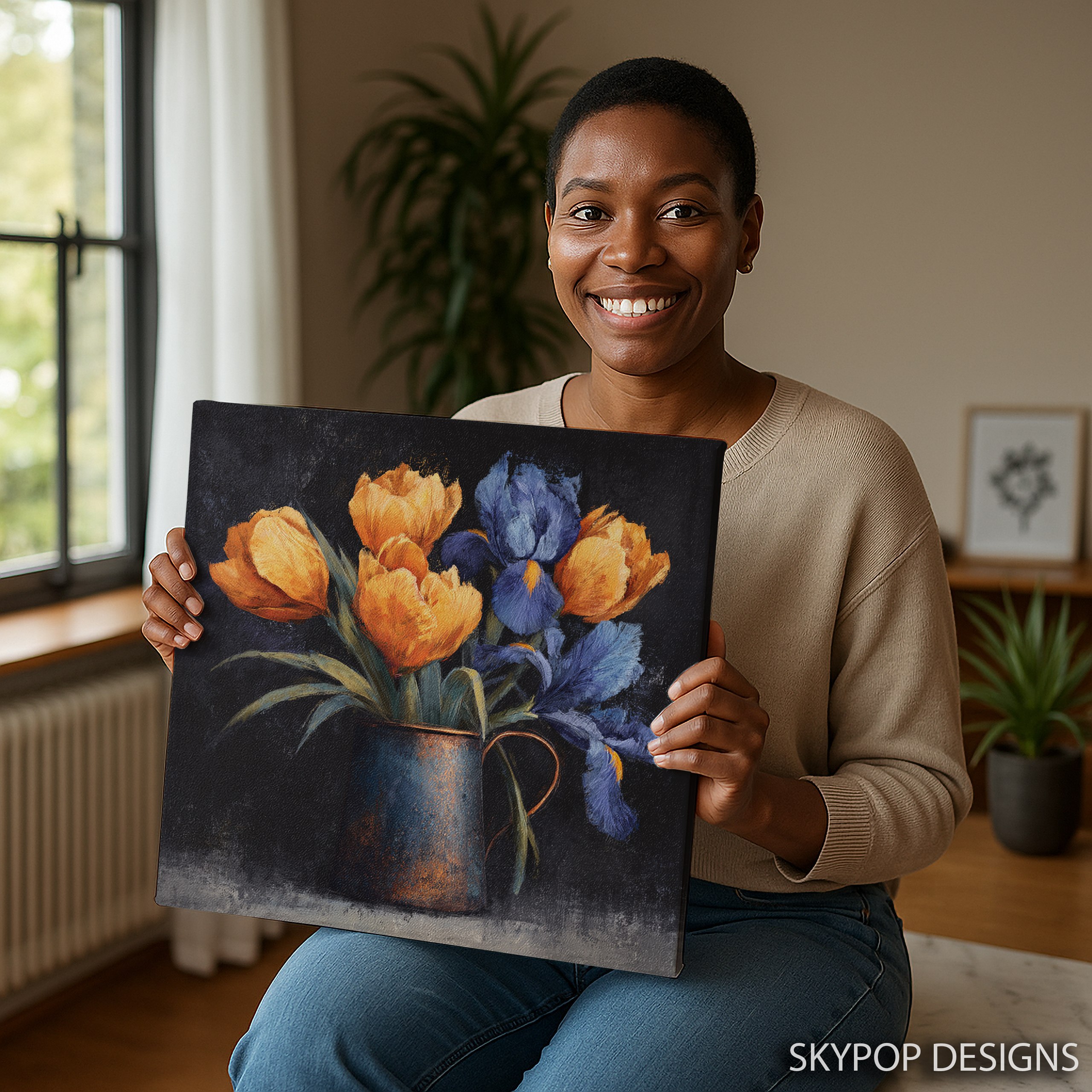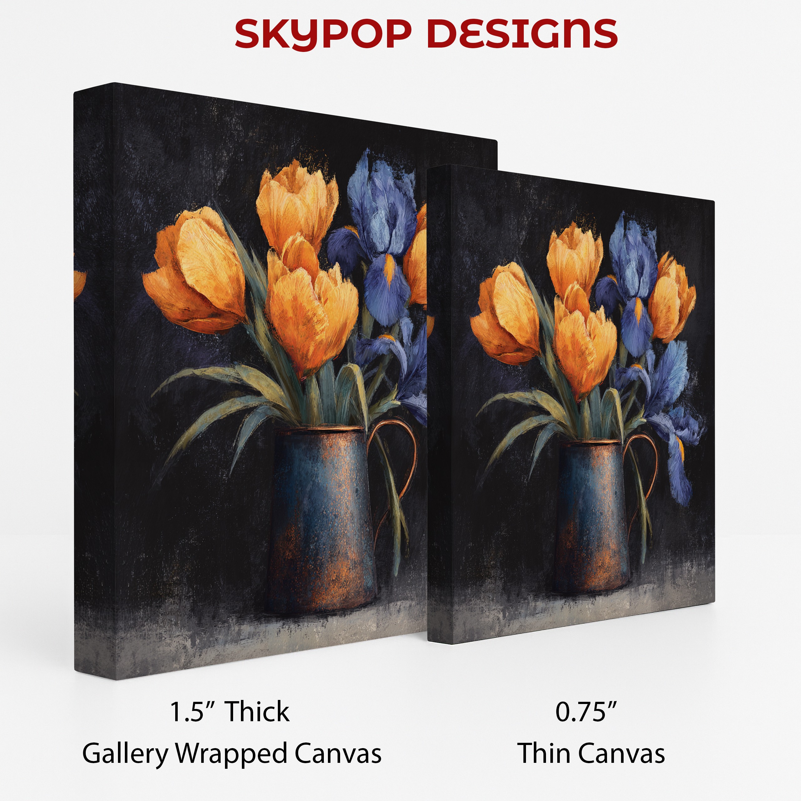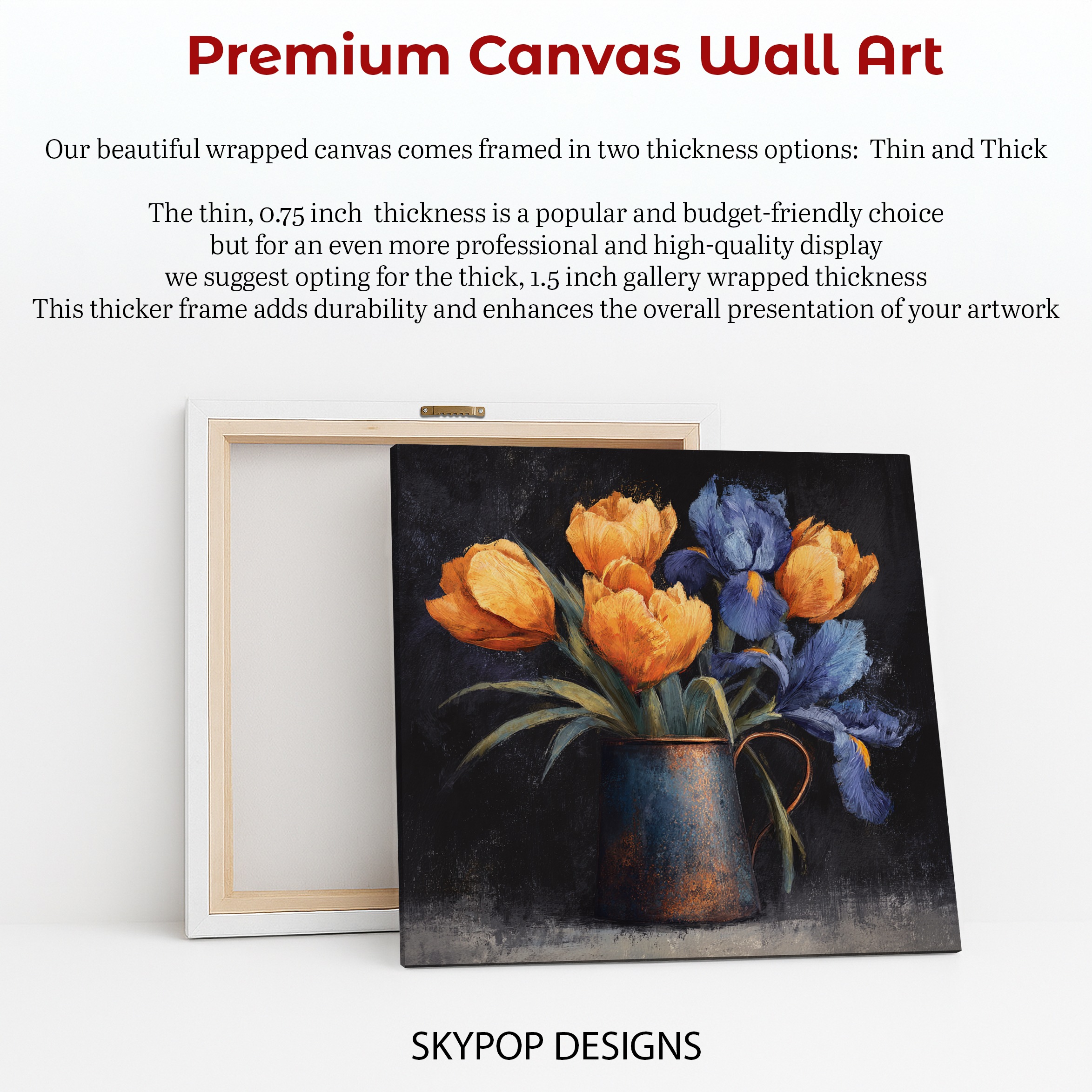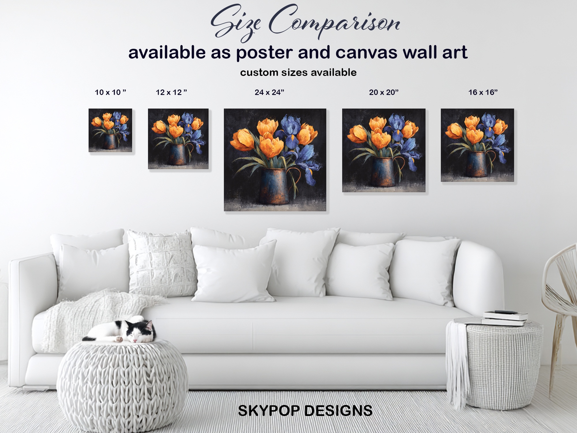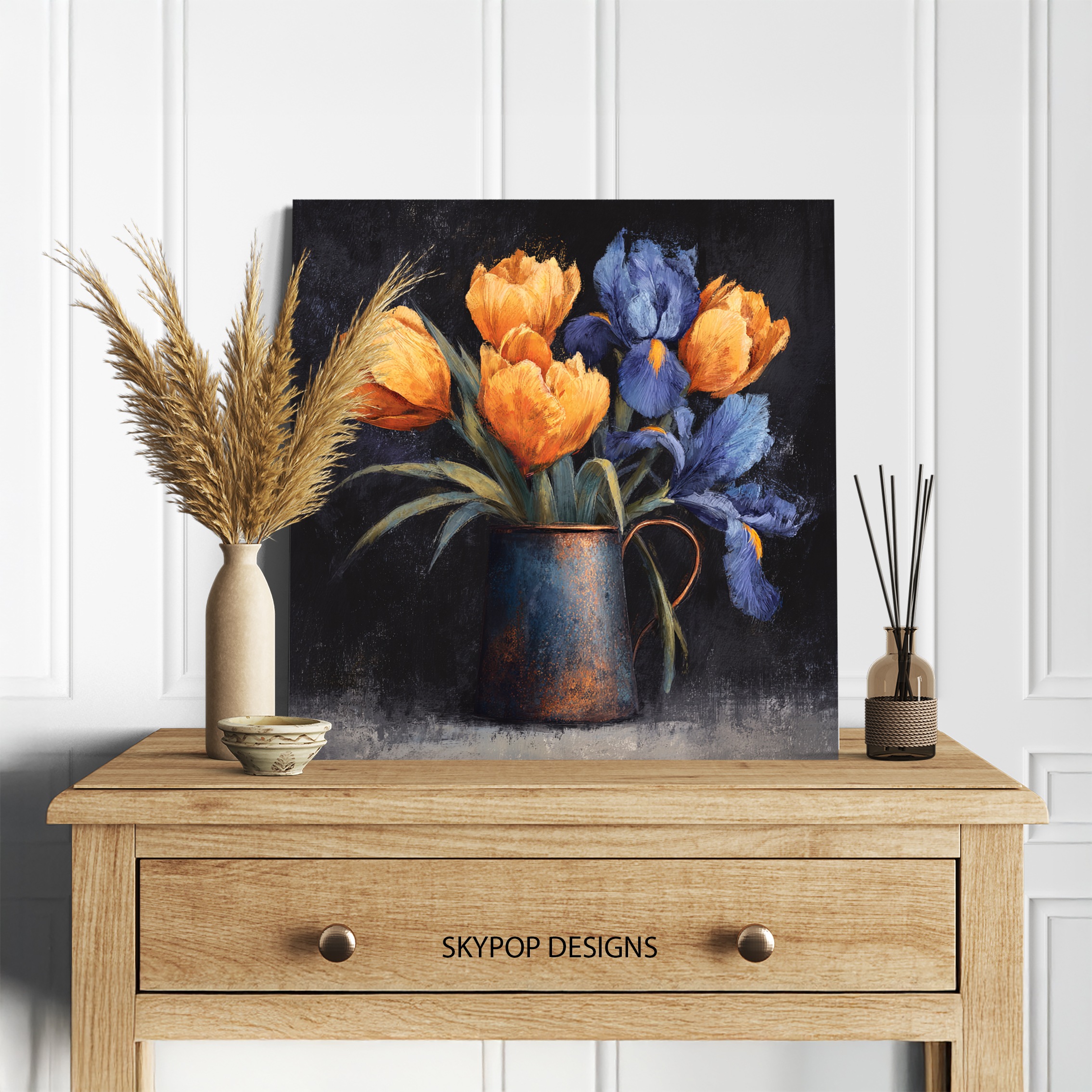 Bring the timeless beauty of a classic floral arrangement into your home with this stunning tulips and iris canvas wall art. This captivating still life poster showcases vibrant orange tulips and striking blue irises in a rustic copper pitcher, creating a perfect focal point for any room. The rich, warm colors and exquisite brushwork transport you to a cozy farmhouse or elegant country estate, making it ideal for traditional or rustic decor styles. Perfect for elevating your dining room ambiance or adding a touch of sophistication to your living room wall decor, this versatile piece complements various interior themes. The contrast between the bold orange tulips and the delicate blue irises creates a visually striking composition that draws the eye and sparks conversation. Ideal as a housewarming gift or to refresh your own space, this high-quality canvas art brings the beauty of nature indoors year-round. The textured brushstrokes and attention to detail in the flowers and weathered pitcher add depth and character to the artwork. Whether displayed in a bright entryway, above a fireplace, or as part of a gallery wall, this floral masterpiece instantly enhances the warmth and charm of your home. Transform your space today with this timeless tulip and iris bouquet art that celebrates the simple elegance of nature’s beauty.