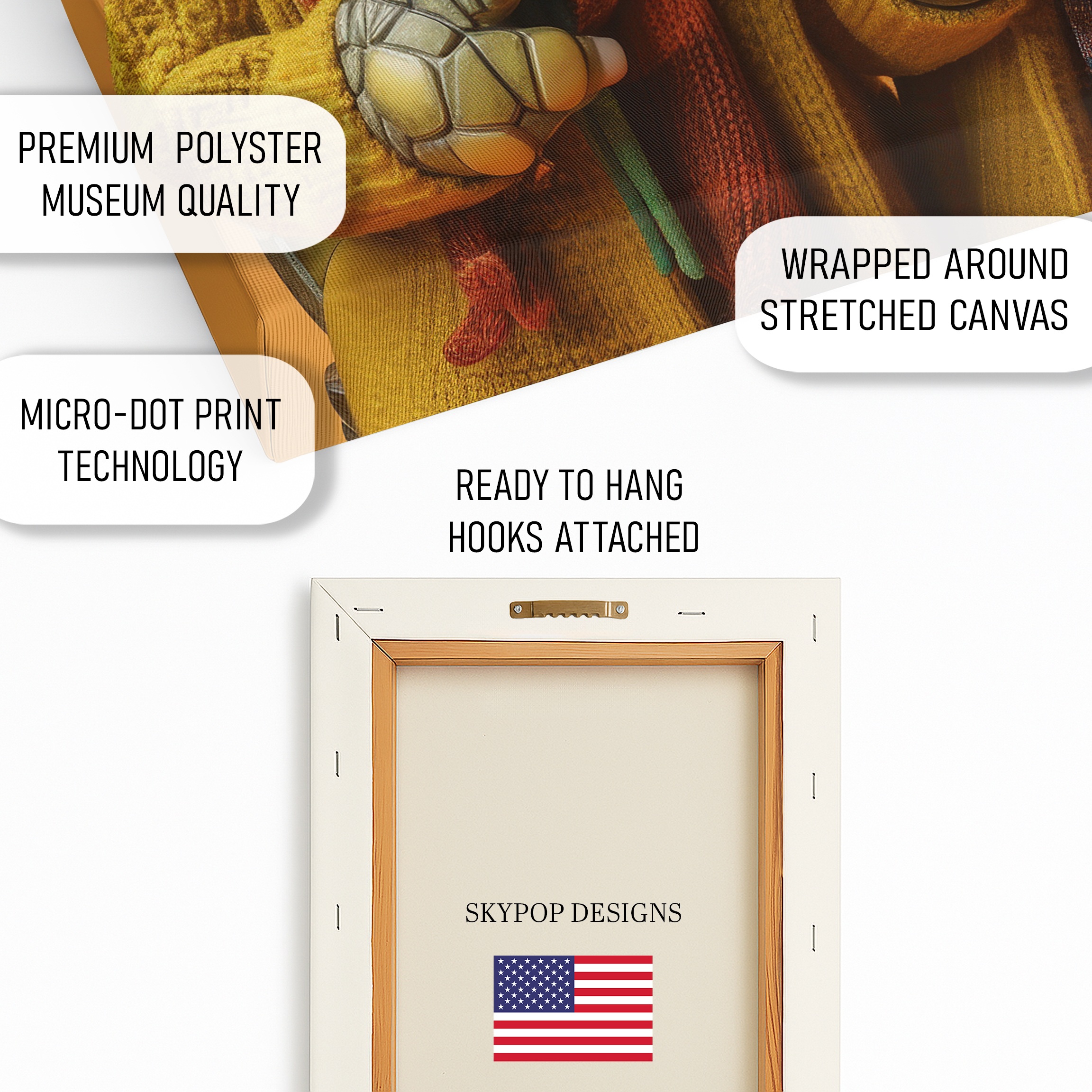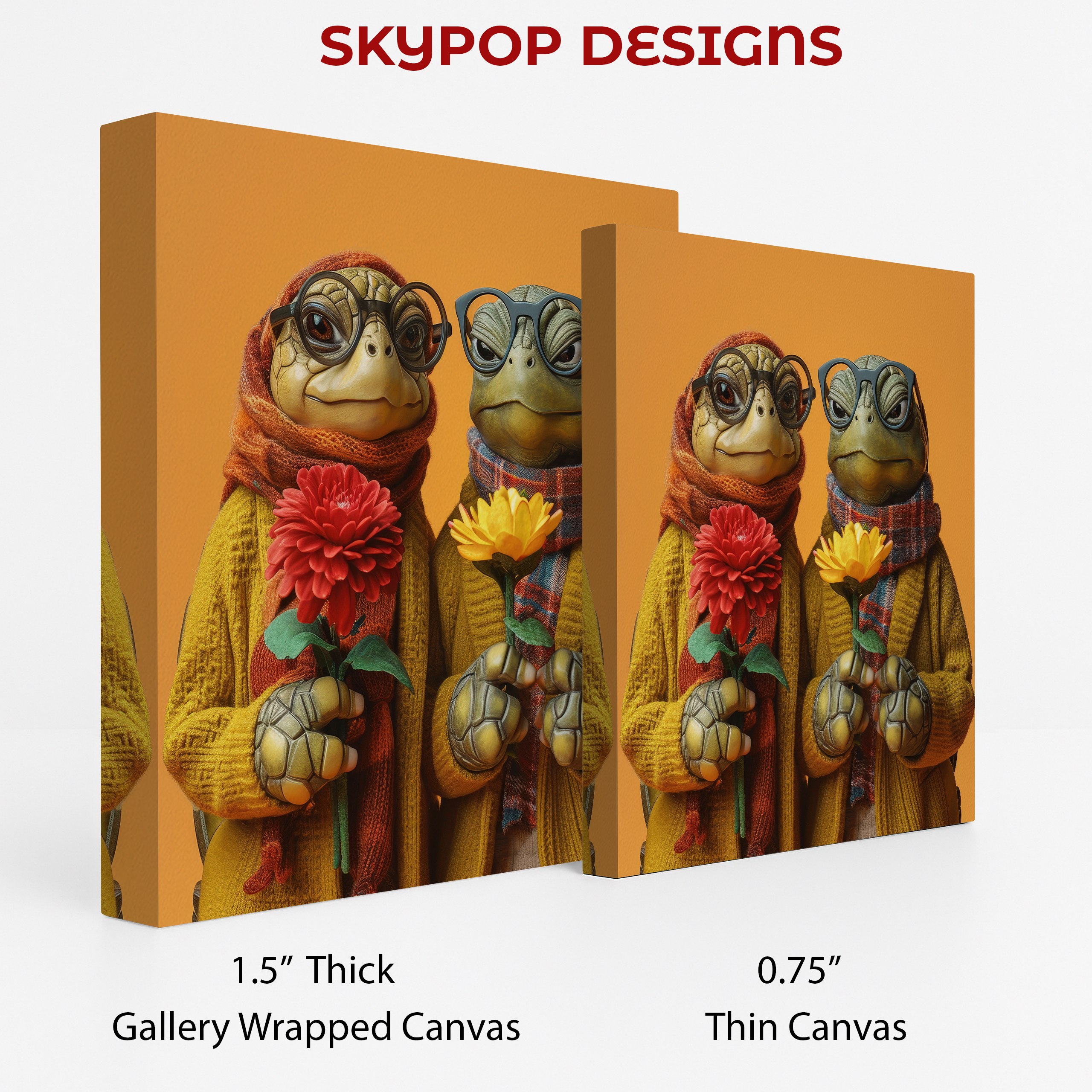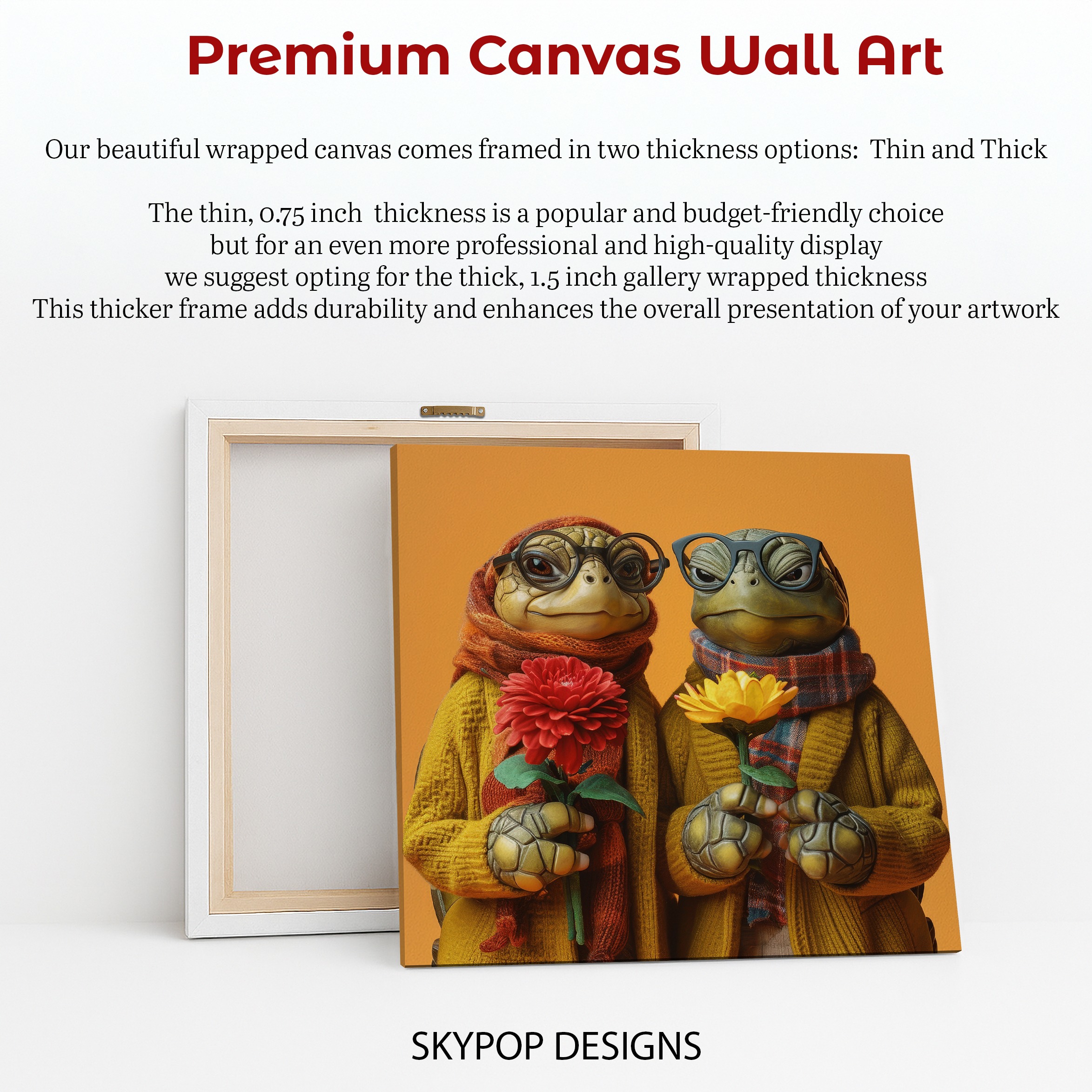 Transform your home with this charming turtle canvas wall art that captures a warm and inviting scene. This unique poster showcases two anthropomorphic turtles dressed in cozy sweaters and scarves, each holding a colorful flower, creating a sentimental and whimsical display. The art piece is perfect for bringing a touch of personality and warmth to any living room, bedroom, entryway, or even kitchen. The vibrant yellow and orange tones, along with the multicolor accents of the scarves, evoke a sense of comfort and cheer, making this canvas wall art an ideal choice for bohemian or contemporary decor styles. This stunning print easily elevates spaces, offering a captivating visual that complements rustic or eclectic interiors. It’s a fantastic gift idea for housewarmings, birthdays, or holidays, appreciated by anyone who loves unique animal art. The detailed rendering of the turtles’ expressions and textured clothing adds depth, making this poster a true conversation starter. The combination of animal art and soft, warm colors creates a cozy atmosphere, enhancing the emotional appeal of your wall decor. Consider this versatile canvas print to add a touch of gentle charm and artistic flair to your favorite room. Elevate your space with this endearing turtle artwork and embrace its heartwarming aesthetic today.