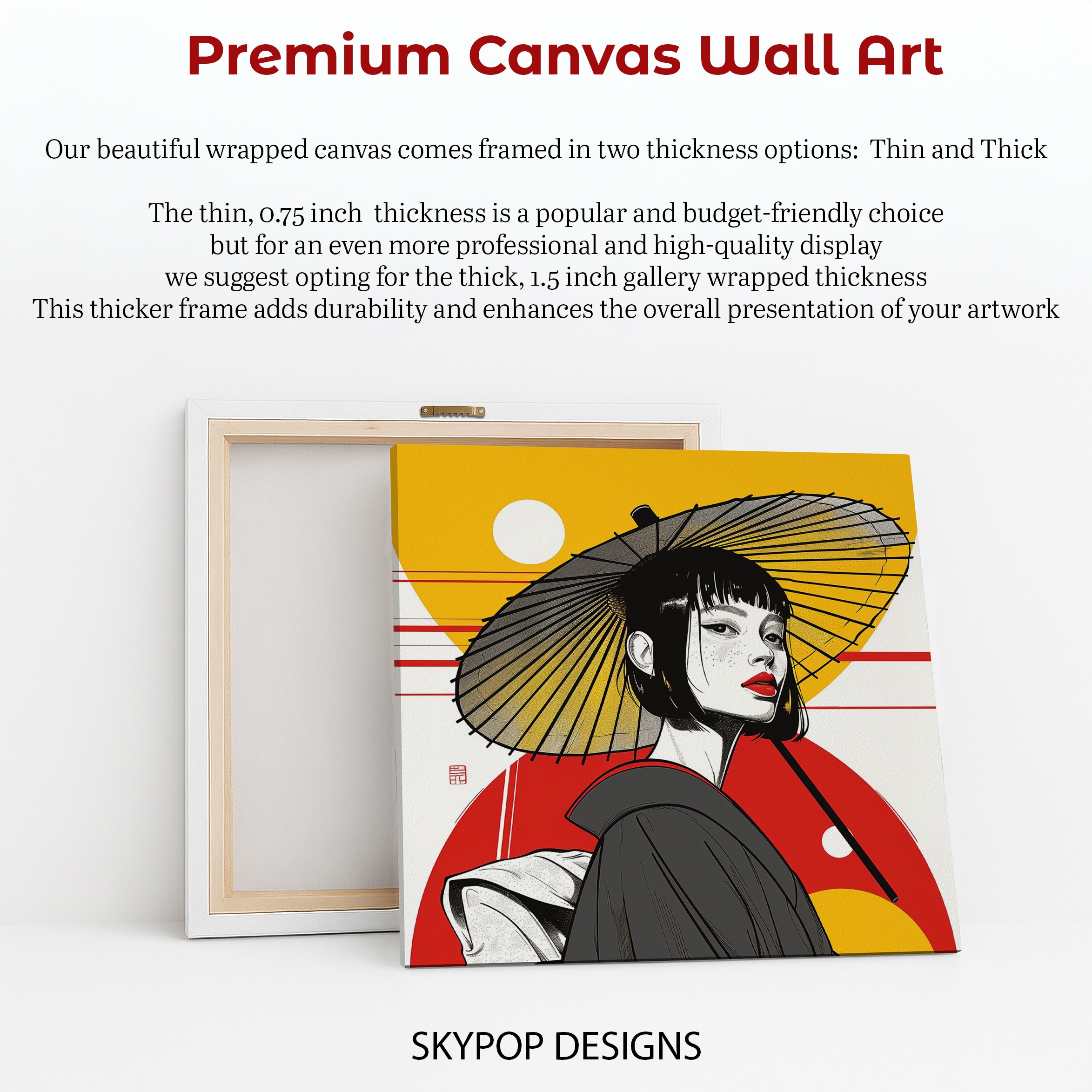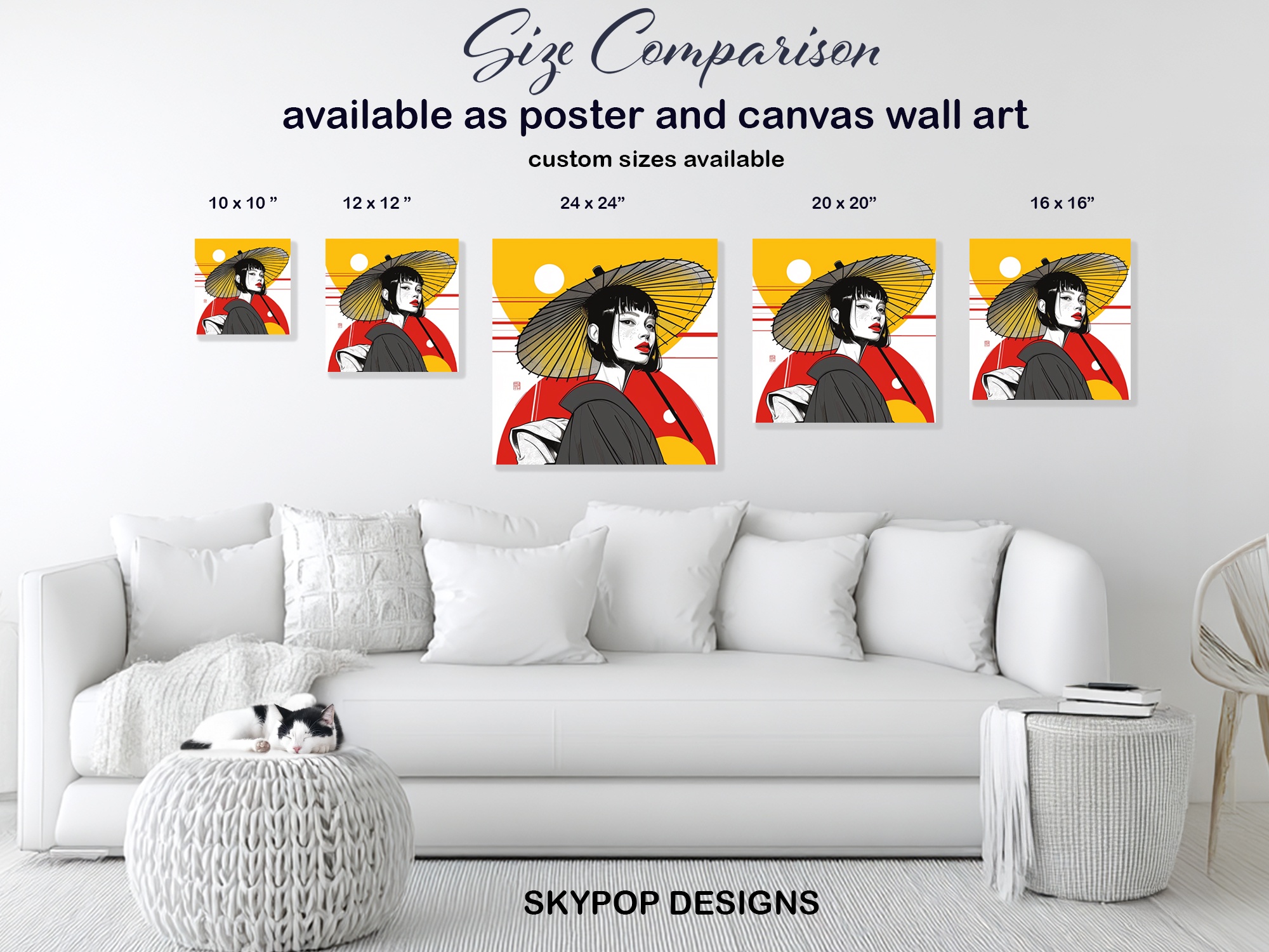 Elevate your space with this striking canvas wall art featuring a modern interpretation of a geisha with a traditional parasol. This eye-catching poster blends contemporary street art aesthetics with classic Japanese motifs, creating a powerful visual statement for any room. The bold color palette of vibrant red, sunny yellow, and stark black and white creates a dynamic contrast that immediately draws the eye. Perfect for modern living rooms or minimalist bedrooms, this canvas art piece adds a touch of urban sophistication and cultural flair. The stylized portrayal of the geisha, with her striking red lips and piercing gaze, exudes confidence and mystery. The large parasol frames the composition, adding depth and visual interest to the artwork. Ideal for Asian-inspired decor or as a focal point in contemporary spaces, this poster celebrates the fusion of traditional and modern elements. The clean lines and graphic style make it a versatile addition to various interior designs, from sleek offices to eclectic dining rooms. High-quality printing ensures every detail is captured, from the textured parasol to the subtle shading on the face. Whether you’re looking to add a pop of color or create a conversation piece, this urban geisha wall art delivers impact and style. Transform your home or office with this unique blend of cultural homage and modern artistry today.