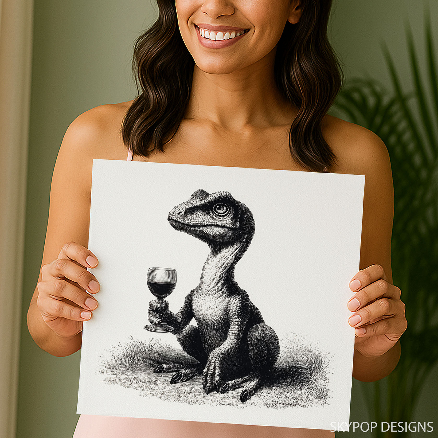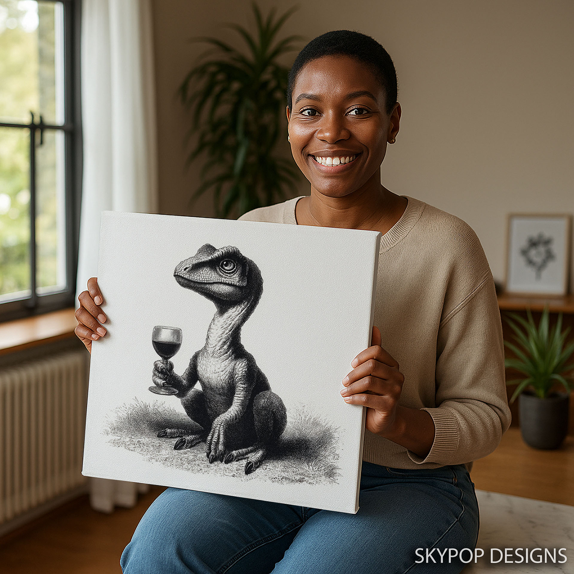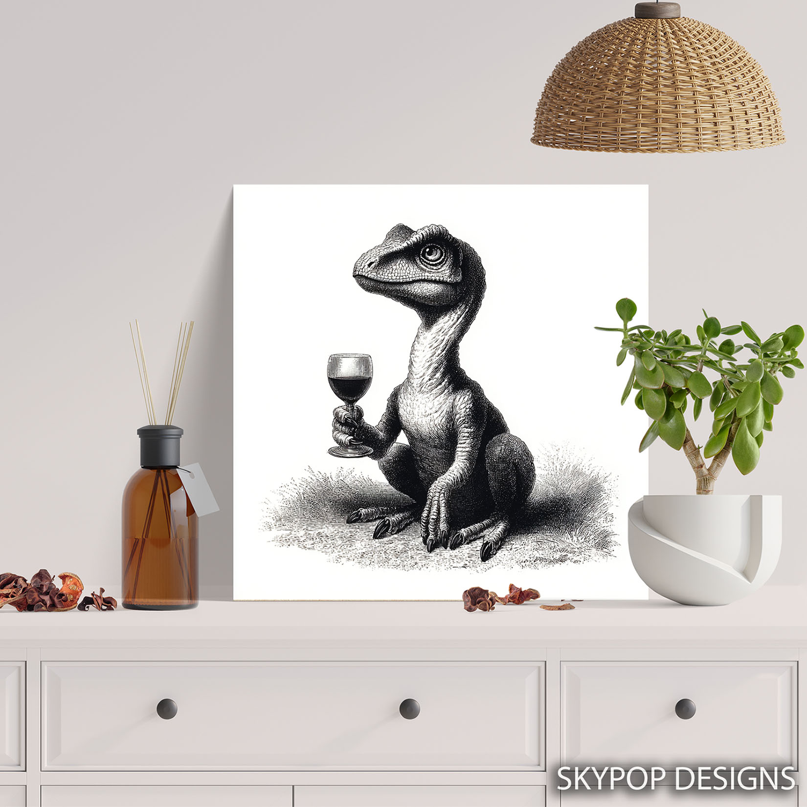 Cheers to that! Elevate your space with this captivating Velociraptor canvas wall art featuring a charming dinosaur enjoying a glass of wine. This unique poster or canvas wall art is perfect for adding a touch of humor and personality to your living room, game room, or office decor. The striking black and white illustration style, reminiscent of vintage scientific drawings, makes this piece a stand-out addition to any contemporary or bohemian interior. The deep red of the wine in the glass provides a subtle yet sophisticated pop of color, enhancing the overall allure of this whimsical animal art. Ideal for a home bar area or as a conversation starter in a modern living room, this artwork is sure to bring smiles and intrigue. The detailed rendering of the velociraptor, from its scaly skin to its expressive eye, showcases exceptional artistry that transforms any wall into a gallery. This canvas wall art is a perfect gift for dinosaur enthusiasts, wine lovers, or anyone who appreciates quirky and unique home decor. High-quality printing ensures that the intricate details and bold lines of this velociraptor artwork are preserved for years of enjoyment. Whether you’re looking to refresh your home office or add a distinctive touch to your entertainment space, this poster offers a creative and memorable solution. Celebrate your love for the prehistoric and the pleasure of a good vintage with this stunning wall art. Transform your room into a unique and inviting space that reflects your playful spirit. Add this extraordinary Velociraptor Wine Time Art to your collection today and let the fun begin.