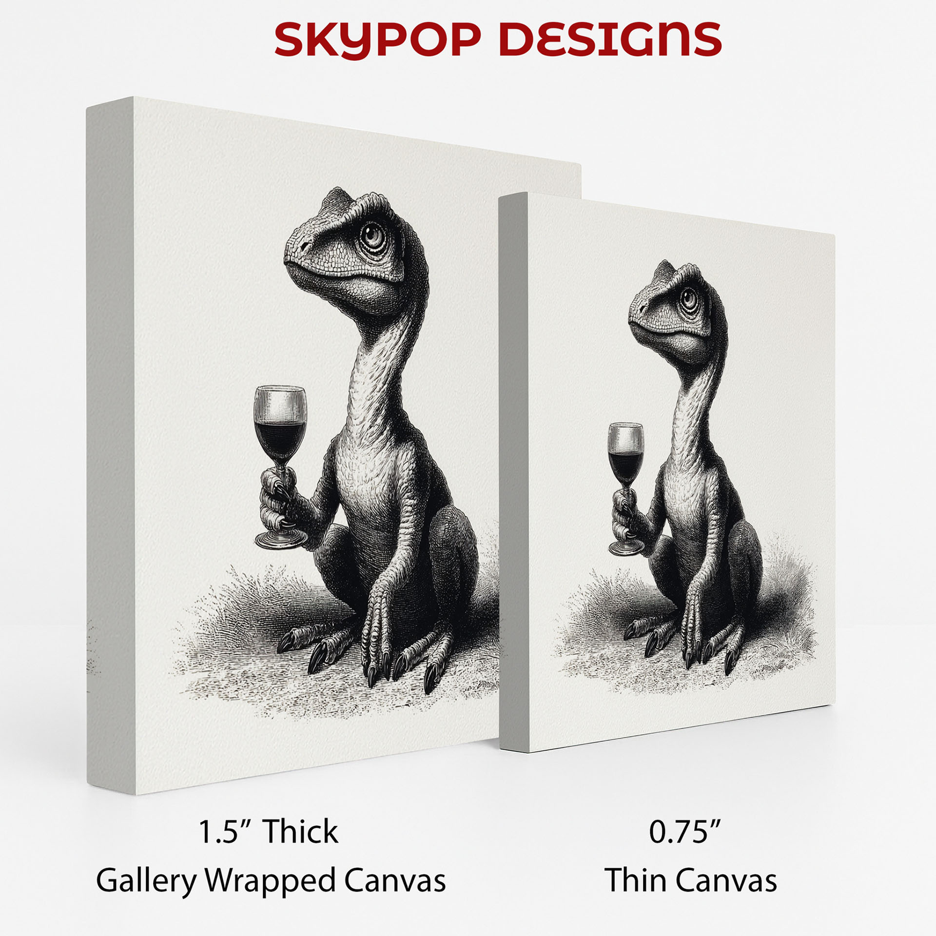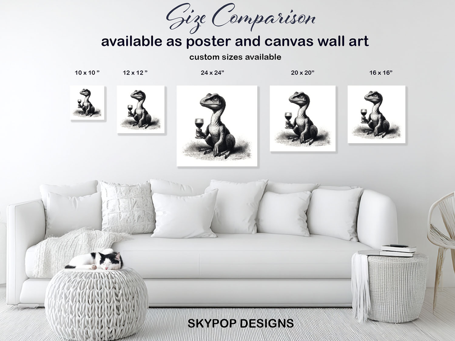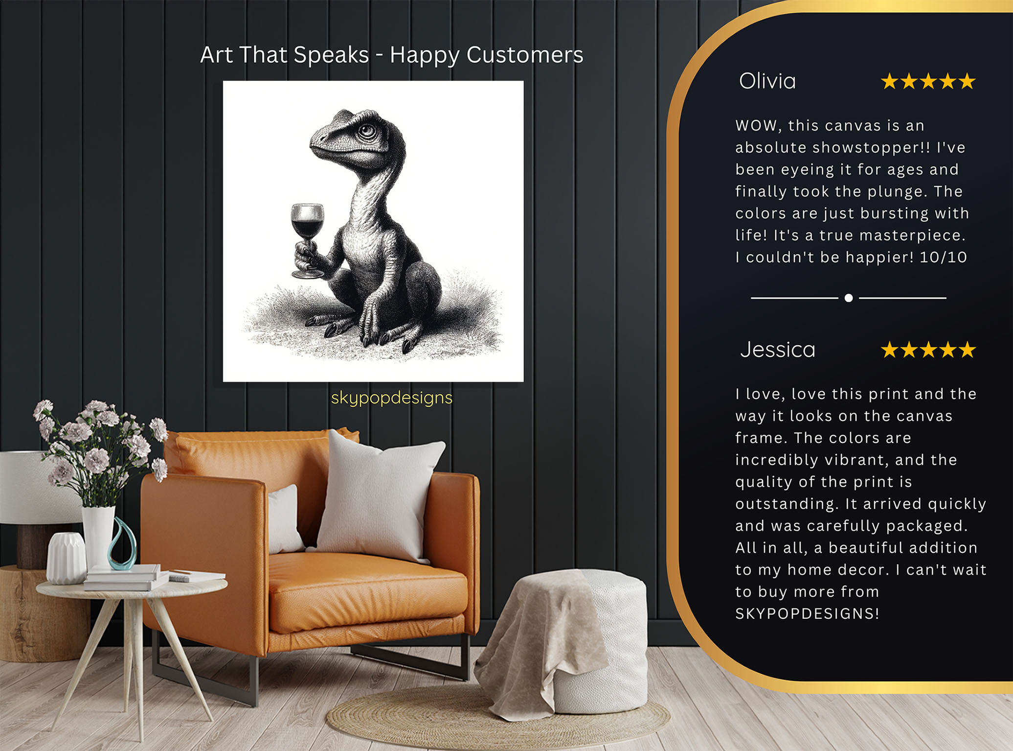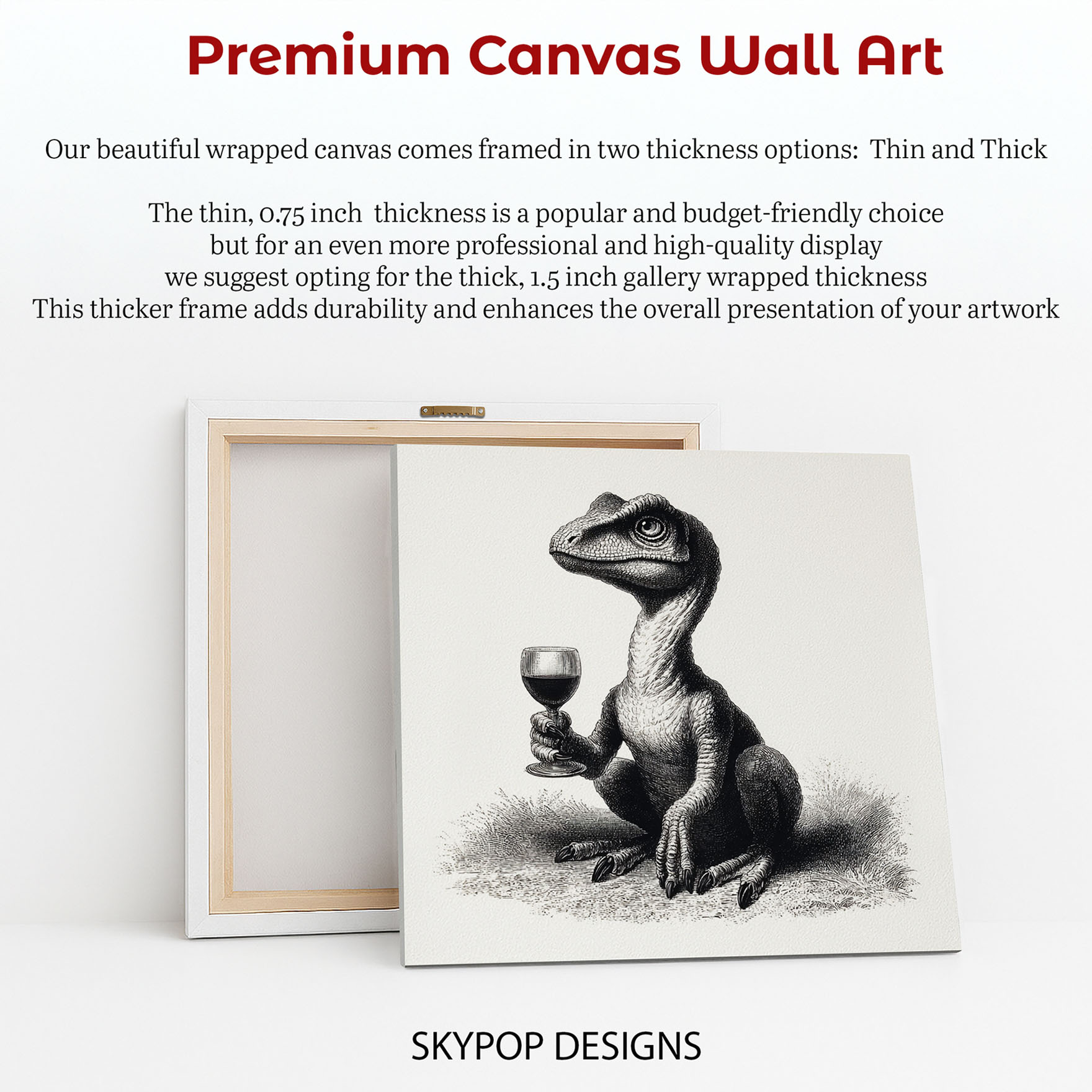 Cheers to that! Elevate your space with this captivating Velociraptor canvas wall art featuring a charming dinosaur enjoying a glass of wine. This unique poster or canvas wall art is perfect for adding a touch of humor and personality to your living room, game room, or office decor. The striking black and white illustration style, reminiscent of vintage scientific drawings, makes this piece a stand-out addition to any contemporary or bohemian interior. The deep red of the wine in the glass provides a subtle yet sophisticated pop of color, enhancing the overall allure of this whimsical animal art. Ideal for a home bar area or as a conversation starter in a modern living room, this artwork is sure to bring smiles and intrigue. The detailed rendering of the velociraptor, from its scaly skin to its expressive eye, showcases exceptional artistry that transforms any wall into a gallery. This canvas wall art is a perfect gift for dinosaur enthusiasts, wine lovers, or anyone who appreciates quirky and unique home decor. High-quality printing ensures that the intricate details and bold lines of this velociraptor artwork are preserved for years of enjoyment. Whether you’re looking to refresh your home office or add a distinctive touch to your entertainment space, this poster offers a creative and memorable solution. Celebrate your love for the prehistoric and the pleasure of a good vintage with this stunning wall art. Transform your room into a unique and inviting space that reflects your playful spirit. Add this extraordinary Velociraptor Wine Time Art to your collection today and let the fun begin.