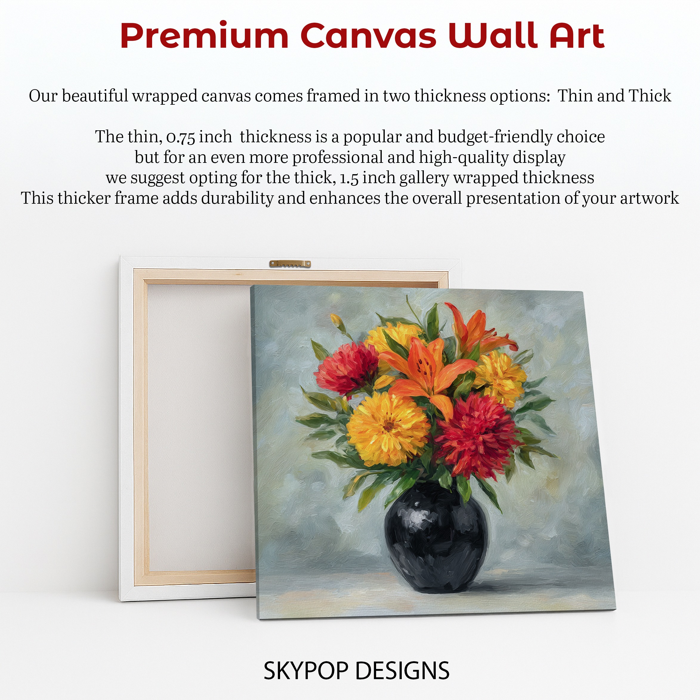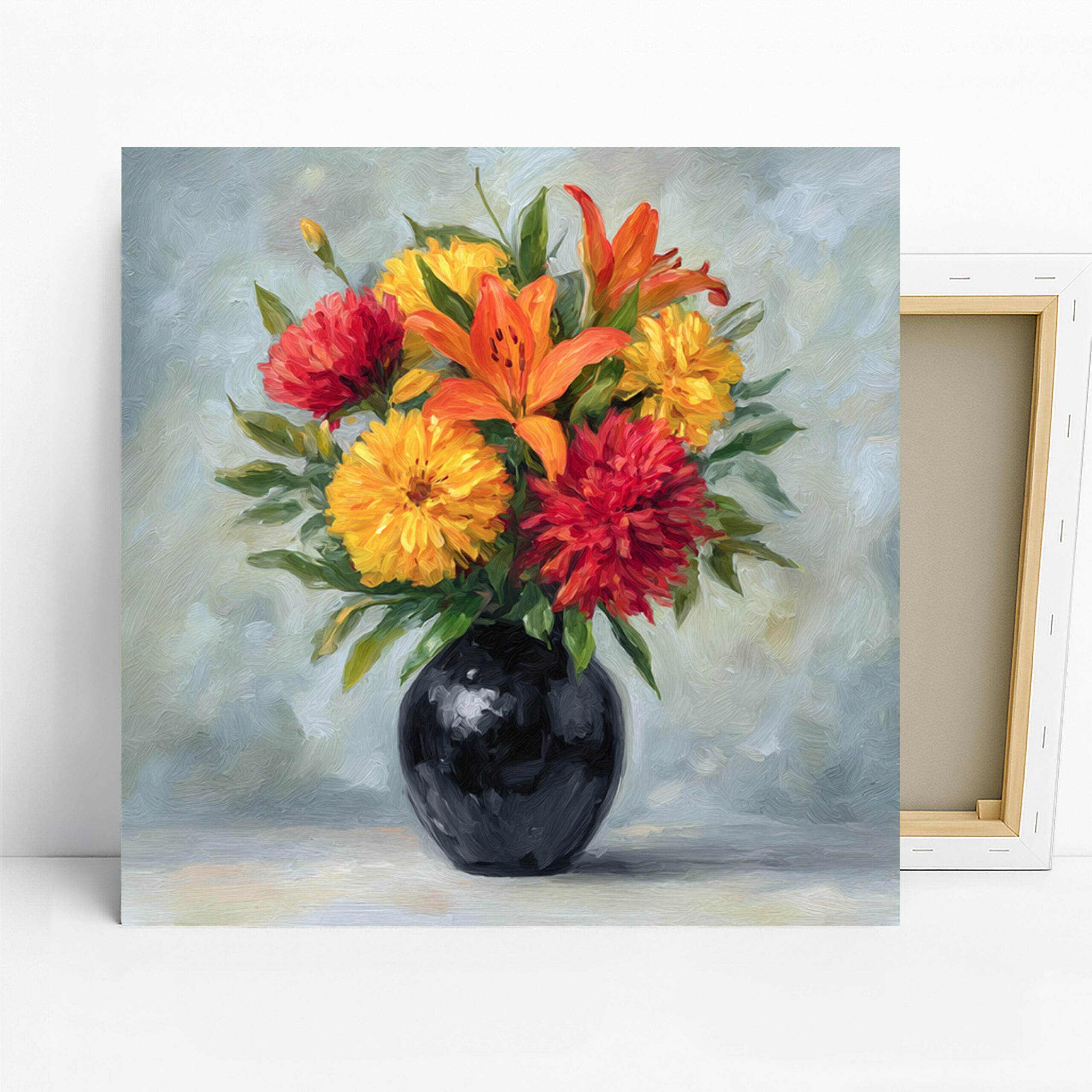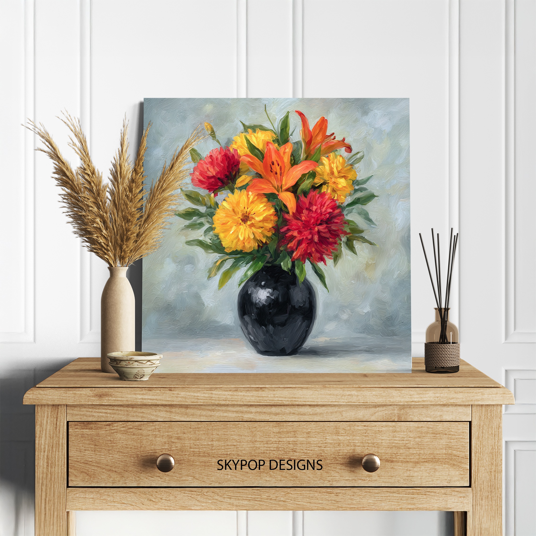 Transform your space with this stunning floral canvas wall art featuring a vibrant bouquet of colorful blooms. This eye-catching piece showcases a beautiful arrangement of red, yellow, and orange flowers in a sleek black vase, perfect for adding a pop of color to any room. The rich, warm hues and bold brushstrokes create a captivating focal point that instantly brightens your living room, dining area, or bedroom. Ideal for both traditional and modern decor styles, this versatile canvas art effortlessly blends classic still life elements with contemporary flair. The striking contrast between the dark vase and vibrant petals adds depth and drama to your wall decor. Whether you’re looking to refresh your home office or create a welcoming atmosphere in your entryway, this floral poster brings nature’s beauty indoors. The high-quality printing captures every intricate detail, from the delicate flower petals to the subtle reflections on the vase’s surface. This artwork is a perfect gift for flower lovers, art enthusiasts, or anyone looking to add a touch of elegance to their living space. Available in various sizes, this canvas wall art adapts seamlessly to different room layouts and complements a wide range of color schemes. Elevate your home decor today with this timeless floral masterpiece that celebrates the beauty of nature and adds a burst of joyful energy to any interior.