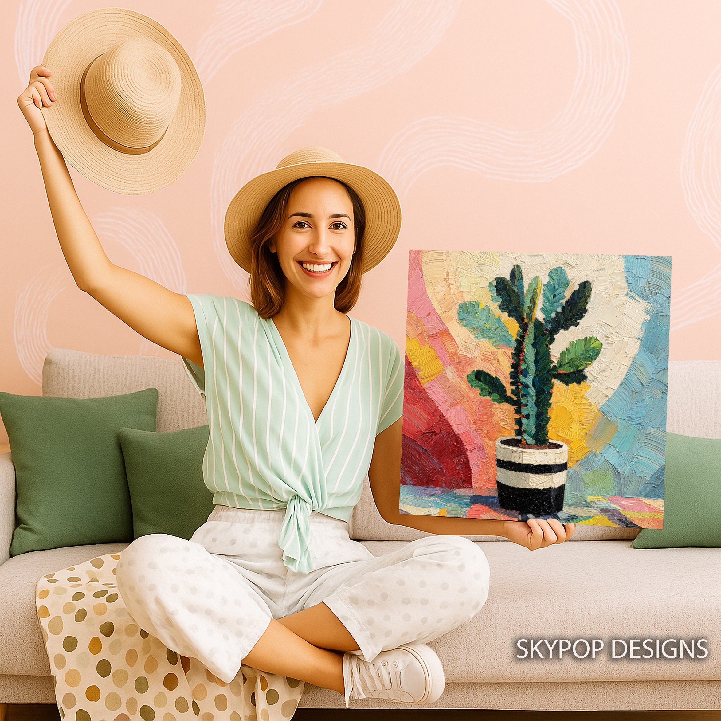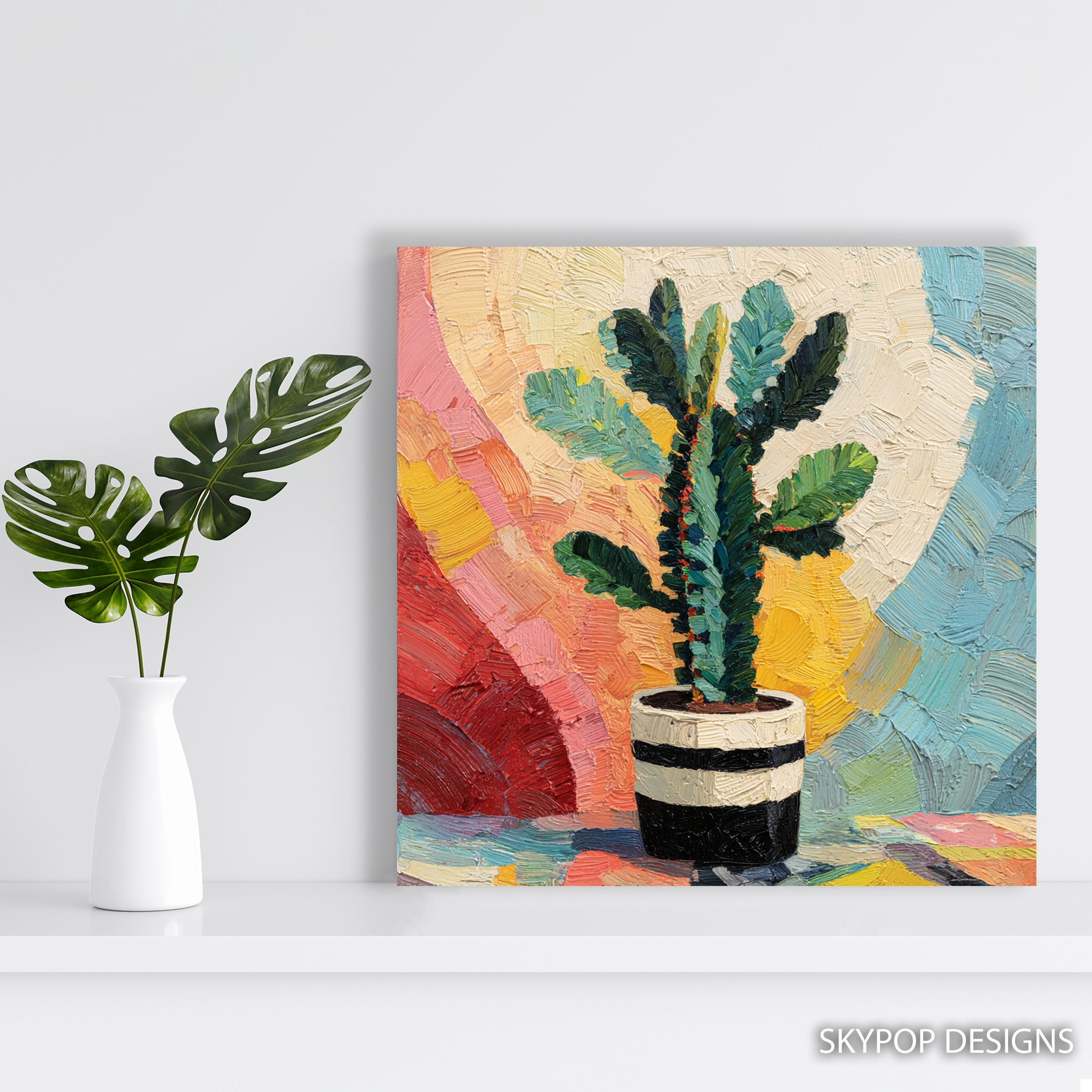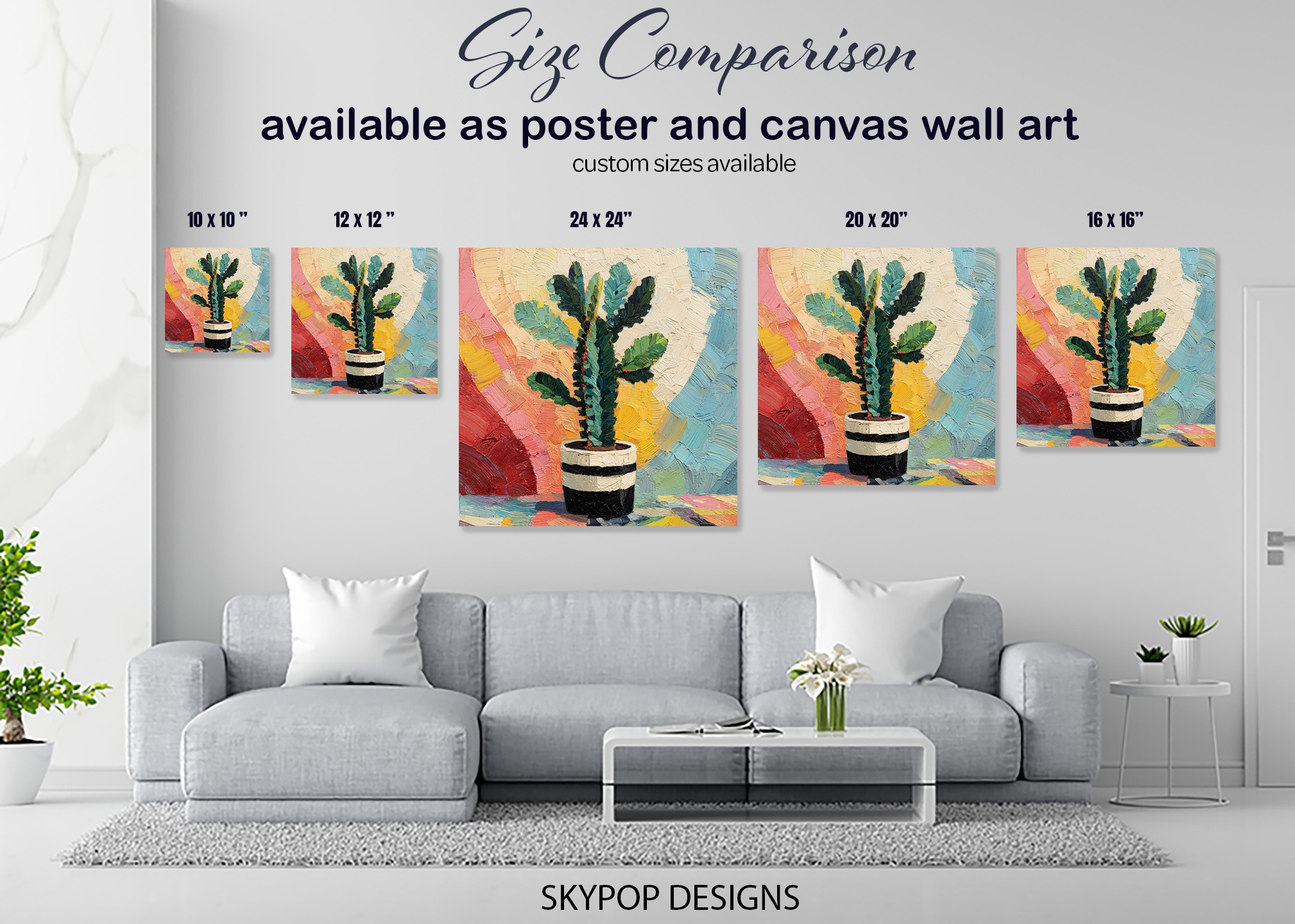 Bring the vibrant energy of a sun-drenched desert into your home with this striking cactus canvas wall art. The bold brushstrokes and vivid color palette create a captivating focal point that instantly transforms any room. Perfect for modern living room wall decor or as a statement piece in a bohemian bedroom, this artwork celebrates the beauty of nature with a contemporary twist. The lush green cactus pops against a backdrop of warm yellows, cool blues, and fiery reds, infusing your space with life and energy. Ideal for plant lovers and those seeking to add a touch of the outdoors to their interiors, this poster or canvas art piece works beautifully in Scandinavian-inspired spaces or as an accent in minimalist decor schemes. The textured impasto technique gives depth and dimension to the painting, making it a conversation starter in your dining room or a source of inspiration in your home office. Whether you’re looking to refresh your seasonal decor or searching for the perfect housewarming gift, this versatile artwork adapts effortlessly to various interior styles. The high-quality printing captures every nuance of the original brushwork, ensuring this piece remains stunning from every angle. Elevate your wall art collection with this eye-catching cactus painting that brings a slice of desert charm to your urban oasis. Transform your space today with this colorful and uplifting canvas art that celebrates the resilience and beauty of nature.
