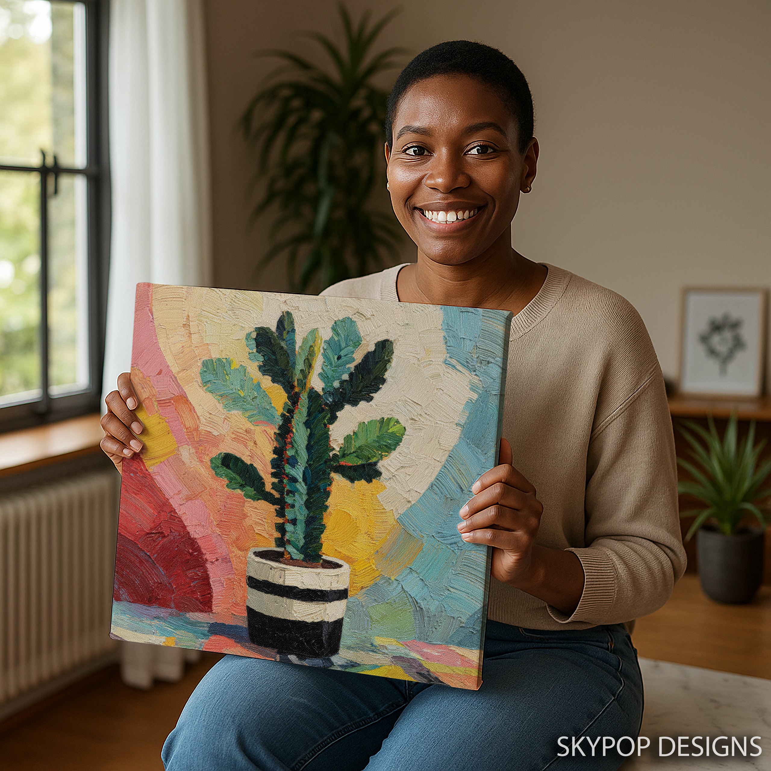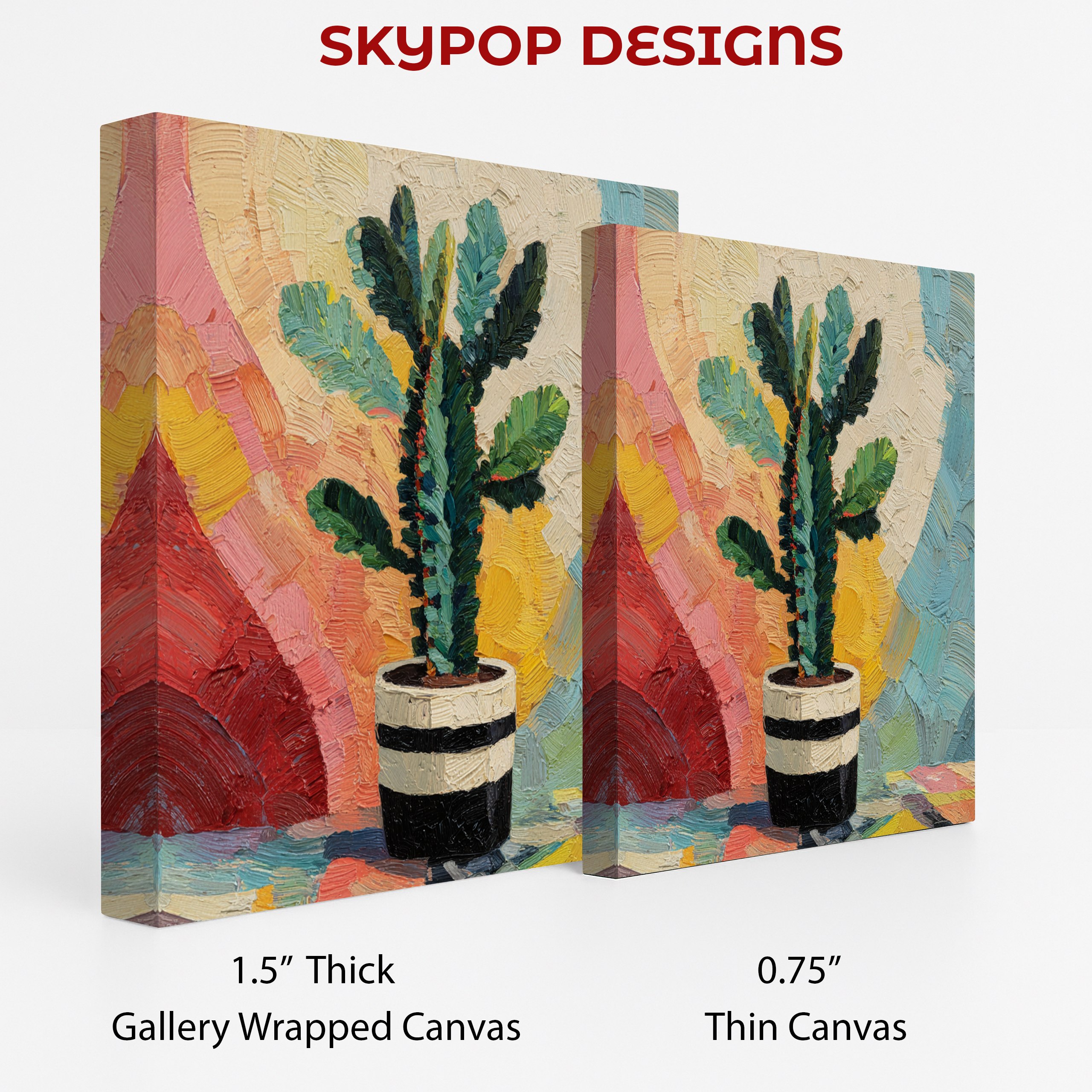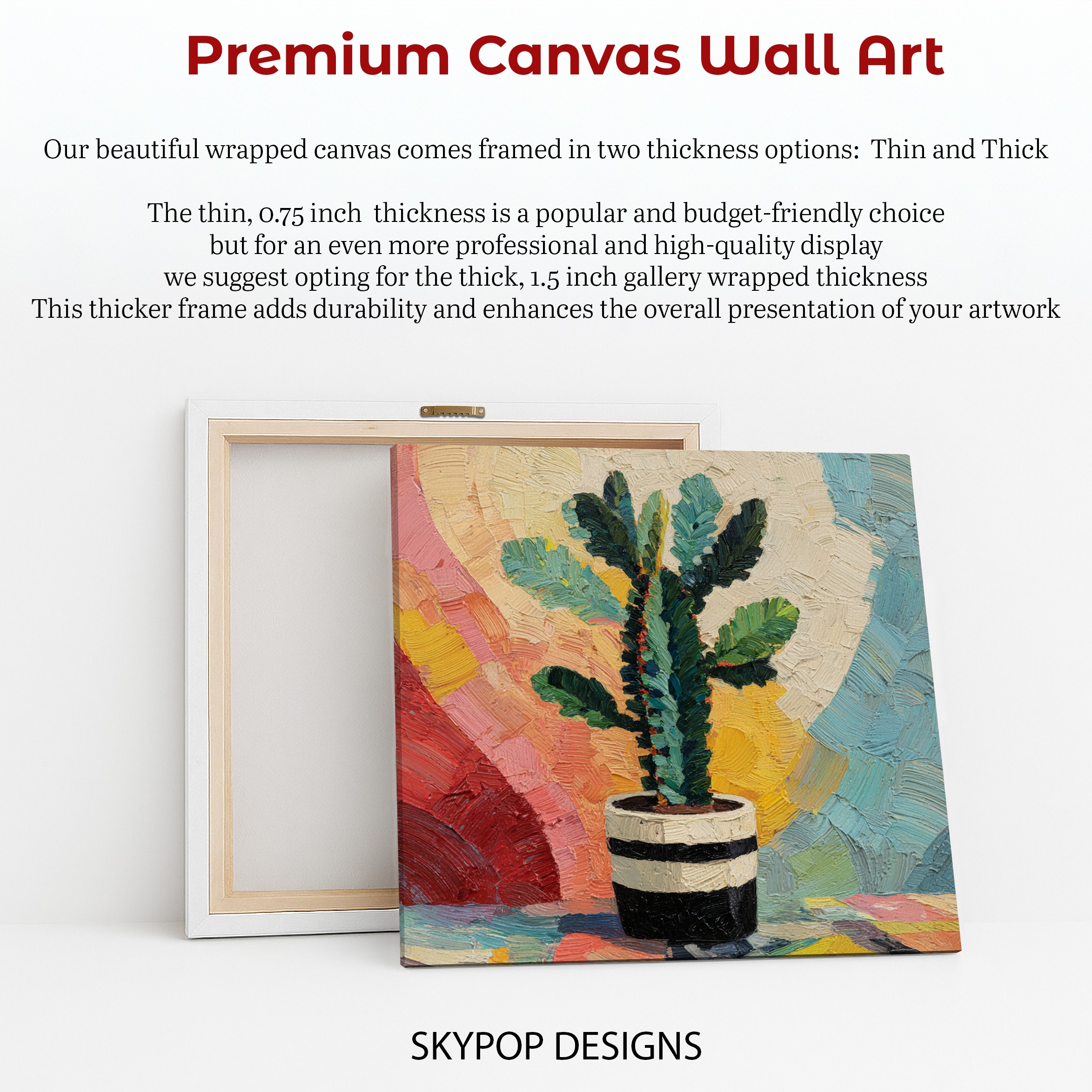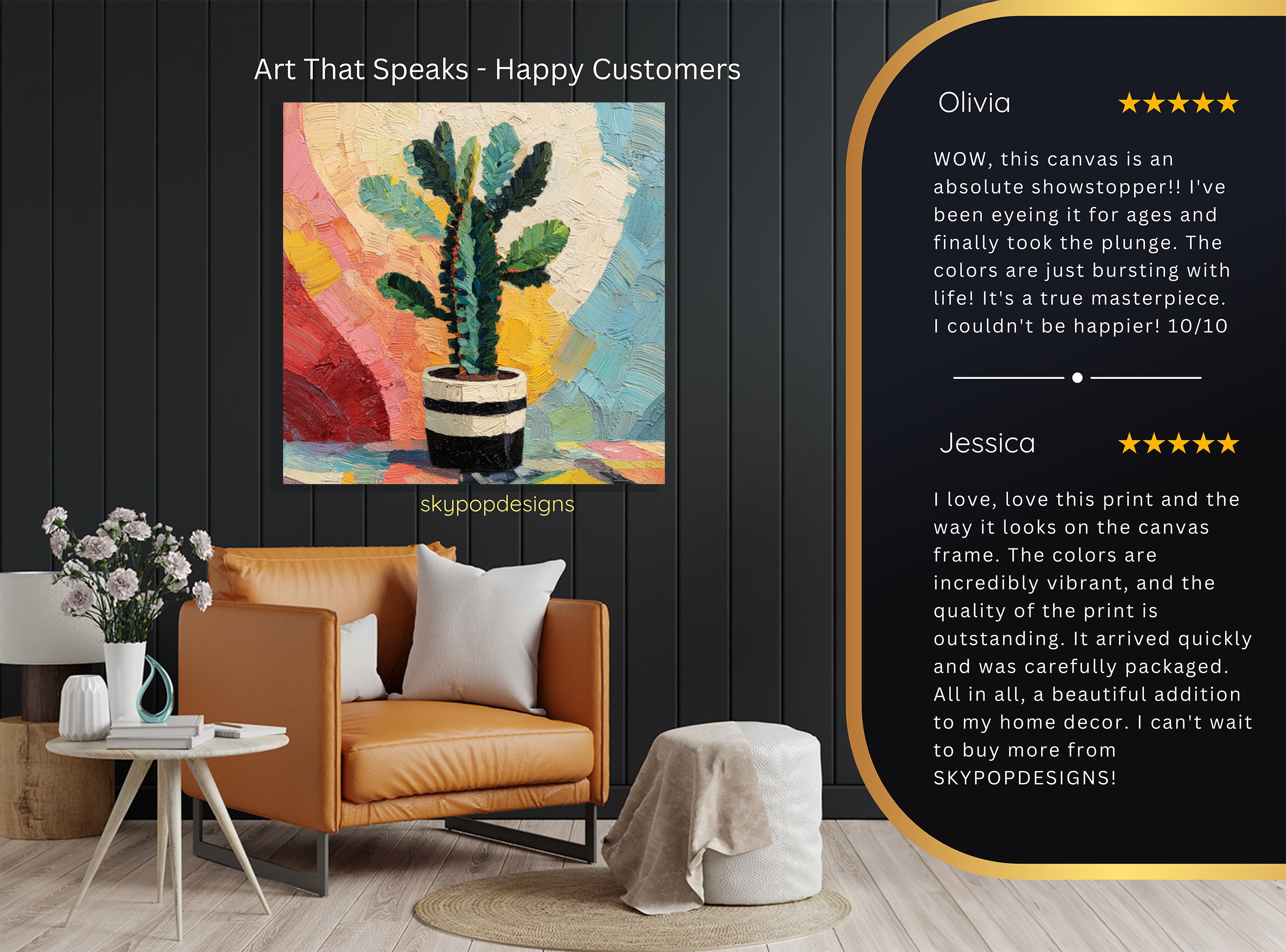 Bring the vibrant energy of a sun-drenched desert into your home with this striking cactus canvas wall art. The bold brushstrokes and vivid color palette create a captivating focal point that instantly transforms any room. Perfect for modern living room wall decor or as a statement piece in a bohemian bedroom, this artwork celebrates the beauty of nature with a contemporary twist. The lush green cactus pops against a backdrop of warm yellows, cool blues, and fiery reds, infusing your space with life and energy. Ideal for plant lovers and those seeking to add a touch of the outdoors to their interiors, this poster or canvas art piece works beautifully in Scandinavian-inspired spaces or as an accent in minimalist decor schemes. The textured impasto technique gives depth and dimension to the painting, making it a conversation starter in your dining room or a source of inspiration in your home office. Whether you’re looking to refresh your seasonal decor or searching for the perfect housewarming gift, this versatile artwork adapts effortlessly to various interior styles. The high-quality printing captures every nuance of the original brushwork, ensuring this piece remains stunning from every angle. Elevate your wall art collection with this eye-catching cactus painting that brings a slice of desert charm to your urban oasis. Transform your space today with this colorful and uplifting canvas art that celebrates the resilience and beauty of nature.