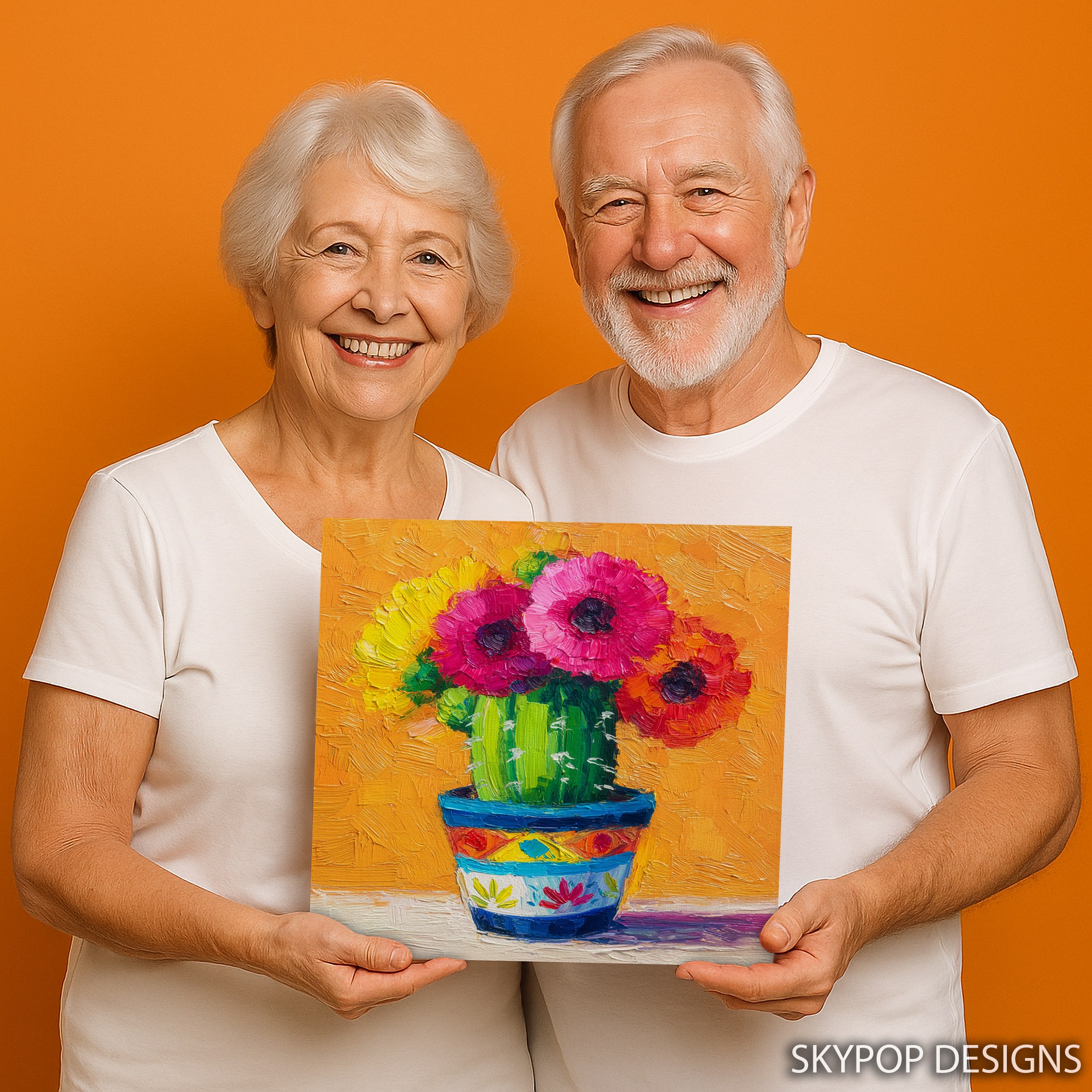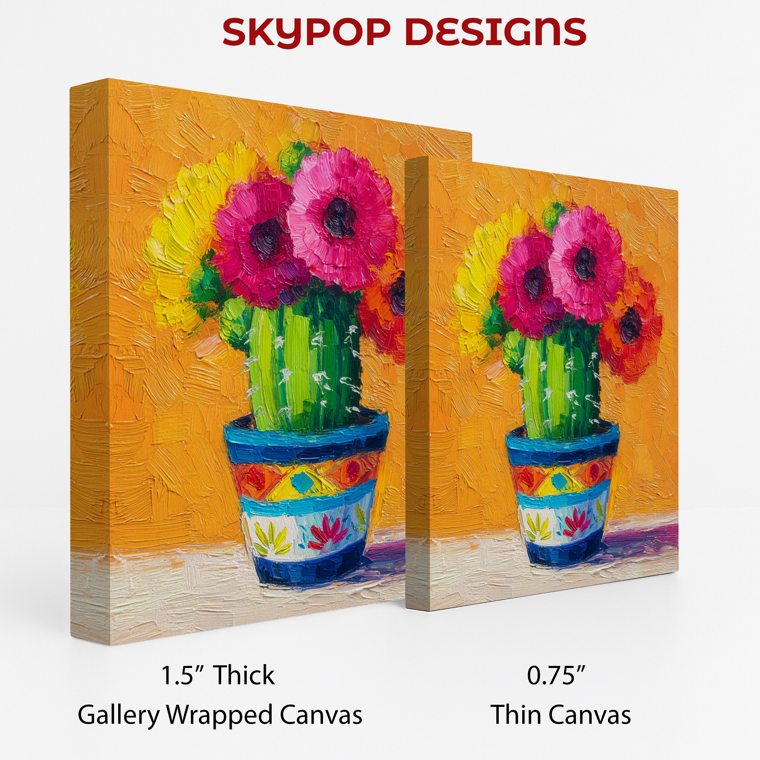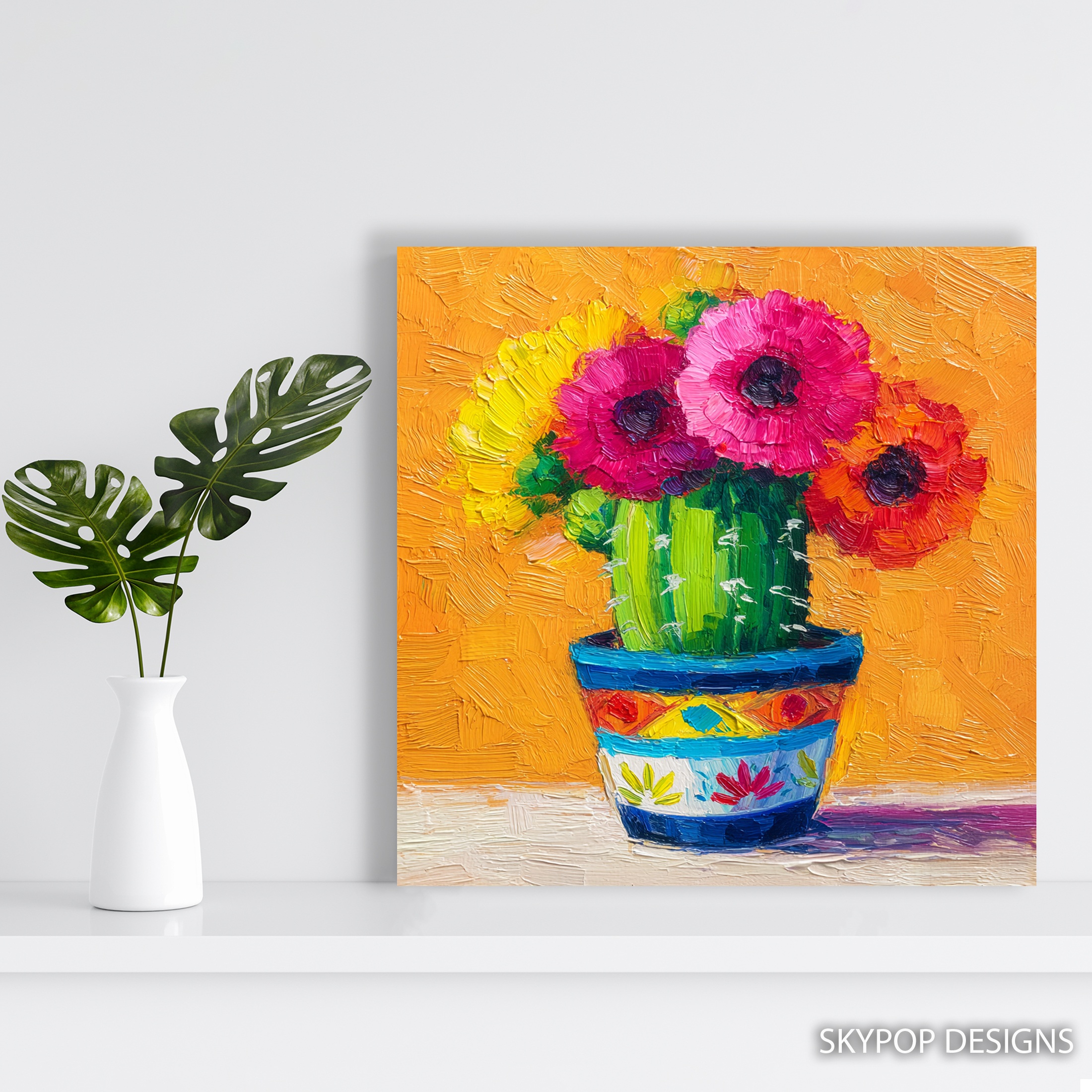 Bring a burst of vibrant energy into your home with this stunning cactus flower canvas wall art. The bold, textured brushstrokes capture the essence of a blooming cactus, with vibrant pink and red flowers contrasting beautifully against a lush green body. This eye-catching poster transforms any space with its rich, warm color palette set against a golden orange background. Perfect for bohemian living rooms or contemporary dining areas, this piece adds a touch of desert-inspired charm to your decor. The impressionistic style gives depth and movement to the composition, making it a captivating focal point that draws the eye. Ideal for nature lovers and those seeking to bring a touch of the outdoors inside, this canvas art celebrates the unexpected beauty of desert flora. The colorful pot adds a playful element, making it suitable for eclectic kitchens or cozy bedrooms. High-quality printing ensures every brushstroke is faithfully reproduced, creating a piece that looks hand-painted. Whether you’re looking to refresh your seasonal decor or searching for the perfect housewarming gift, this versatile artwork adapts beautifully to various interior styles. Elevate your wall art collection with this unique blend of floral beauty and contemporary flair that’s sure to spark joy and conversation in any room.