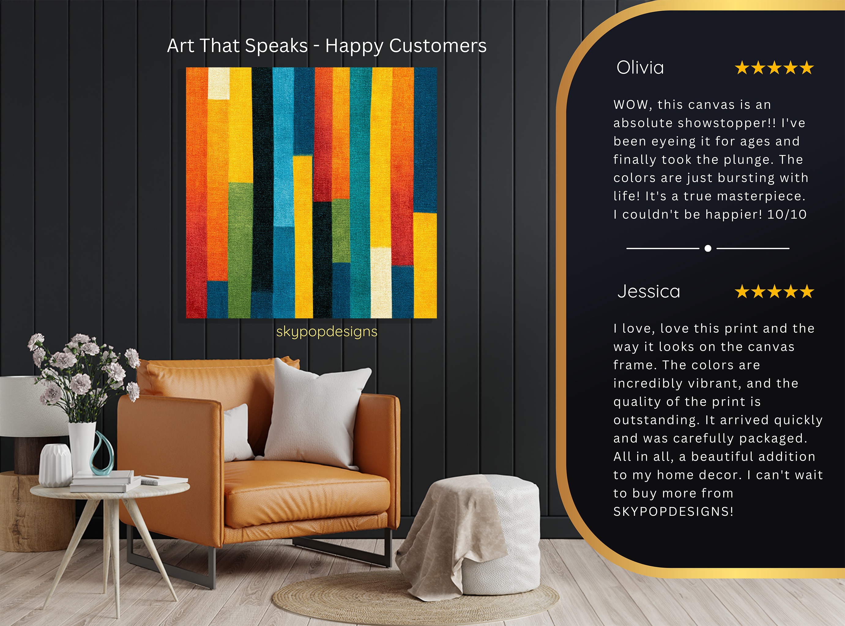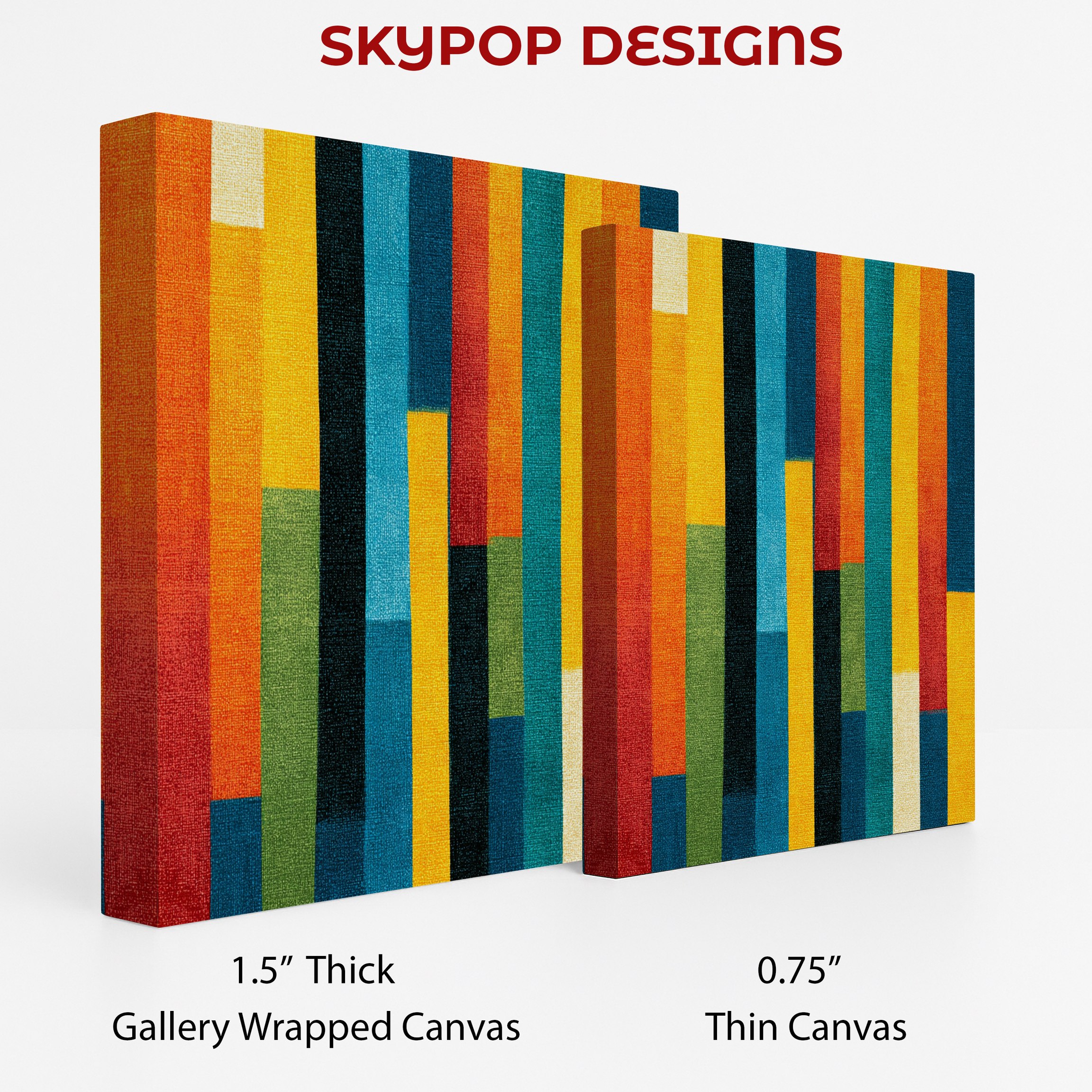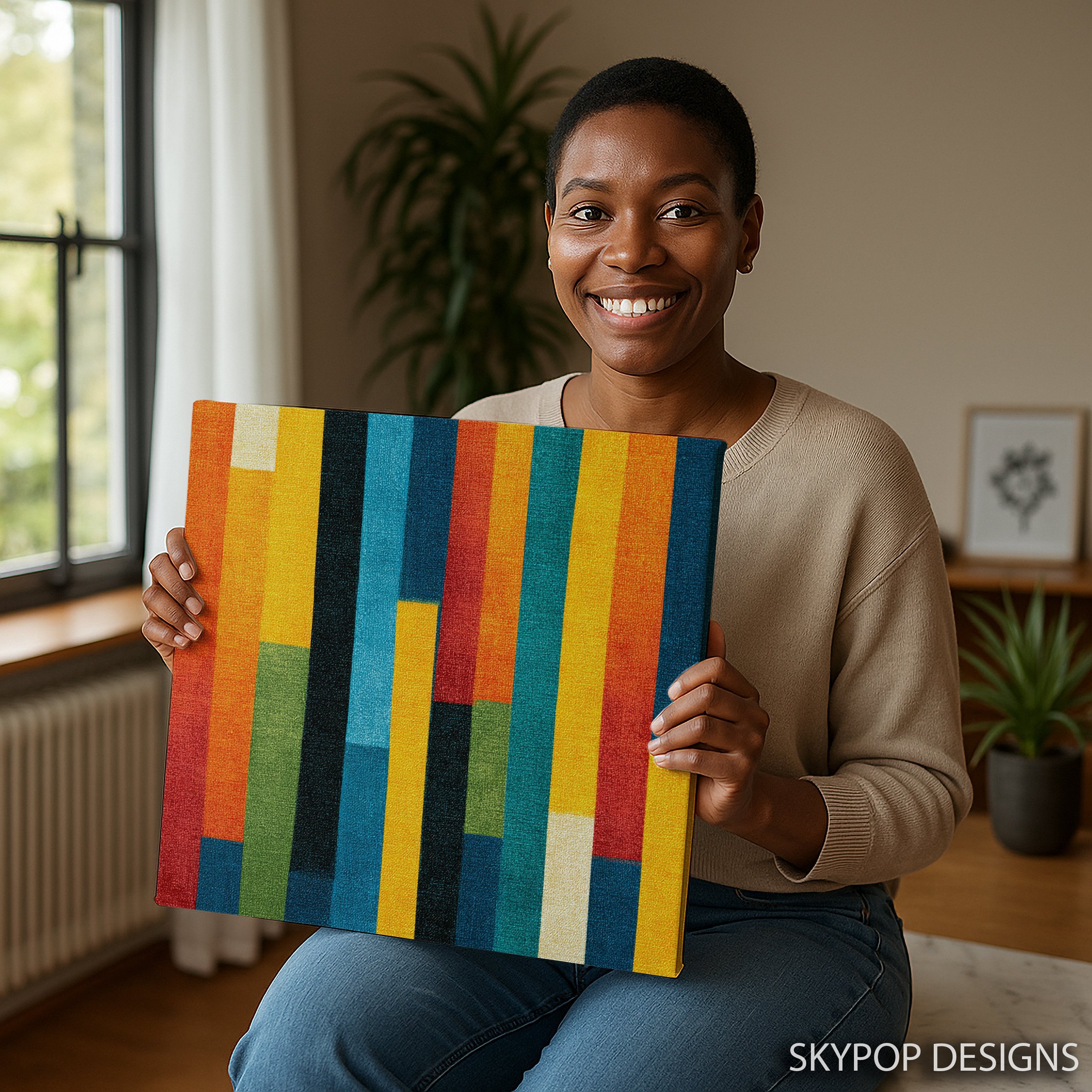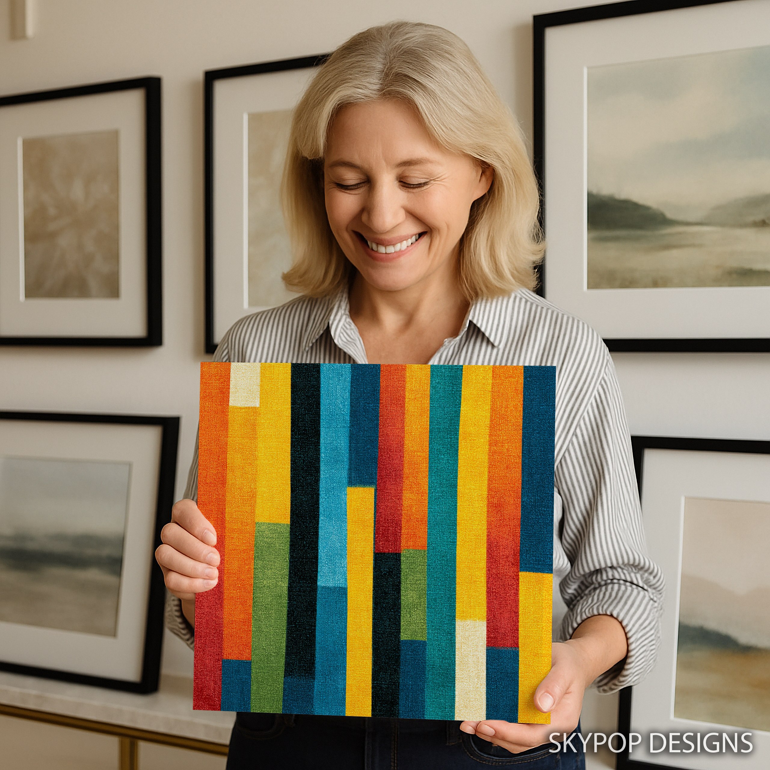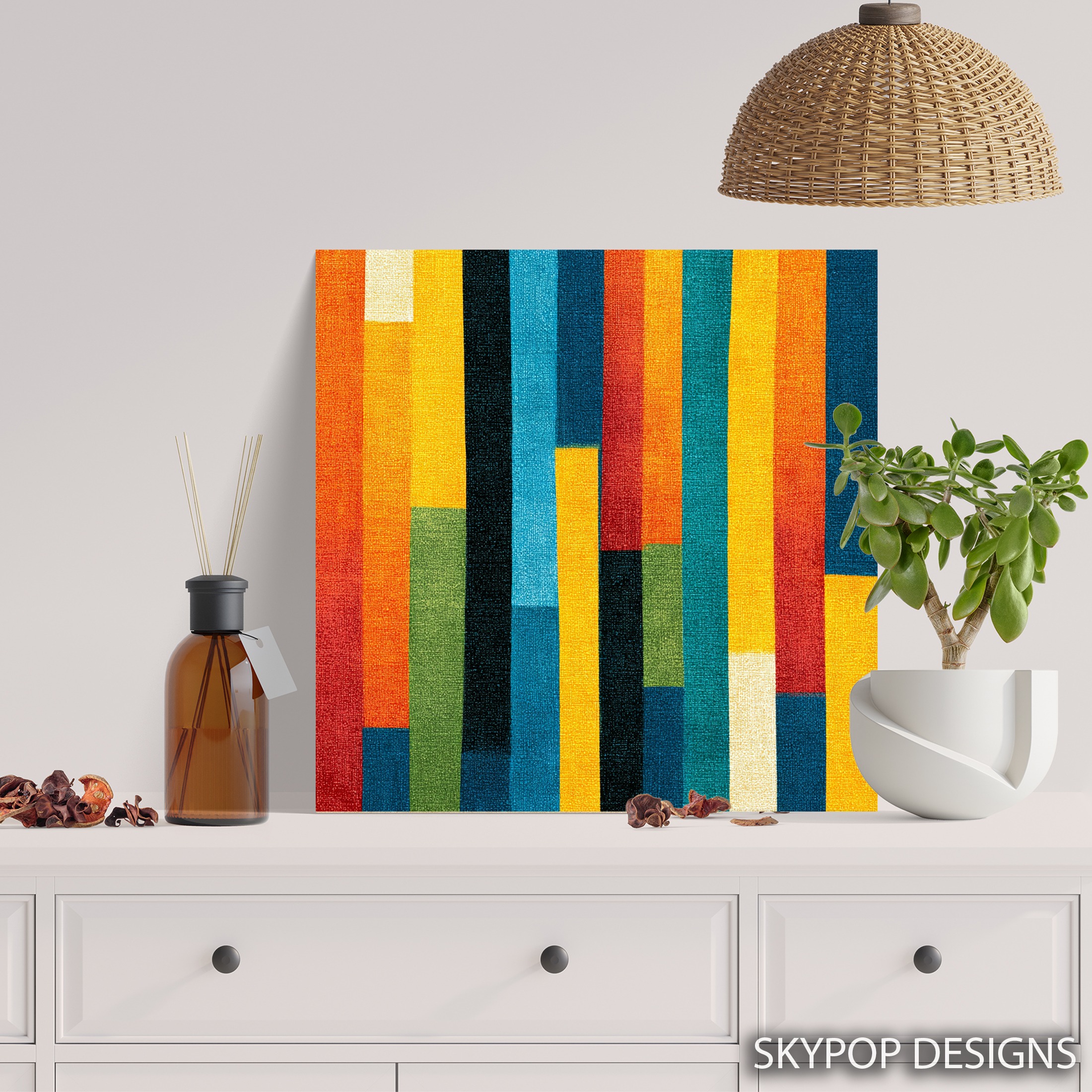 Transform your space with this striking geometric stripes canvas wall art, perfect for adding a bold pop of color to any room. The vibrant composition features vertical stripes in a rich palette of orange, blue, yellow, and green, creating a dynamic and eye-catching focal point. This modern poster or canvas print is ideal for contemporary living rooms, sleek office spaces, or minimalist bedrooms seeking a touch of artistic flair. The abstract design evokes the clean lines and color blocking popular in mid-century modern decor, while its Scandinavian-inspired simplicity ensures versatility across various interior styles. The textured appearance adds depth and visual interest, making this piece a conversation starter in any setting. Whether you’re looking to energize a neutral space or complement existing colorful decor, this artwork adapts beautifully to your vision. The high-quality printing captures every nuance of color and texture, ensuring this canvas art remains vibrant for years to come. Perfect as a statement piece in a hallway or as part of a gallery wall, this geometric print brings a sense of rhythm and movement to your home. Elevate your decor with this contemporary abstract art that celebrates color and form in its purest expression. Add a touch of modern sophistication to your walls and transform your living space today with this versatile and visually striking canvas wall art.