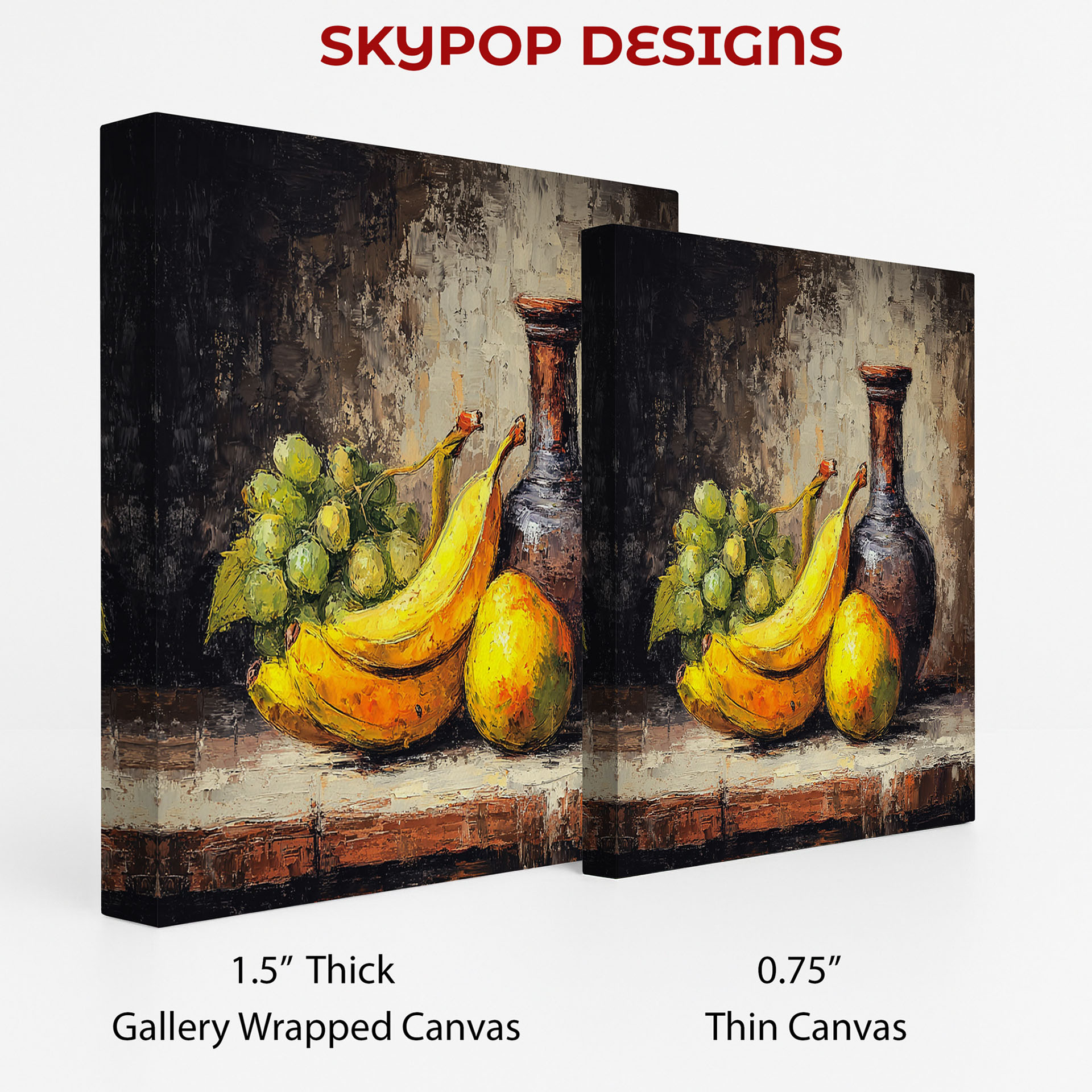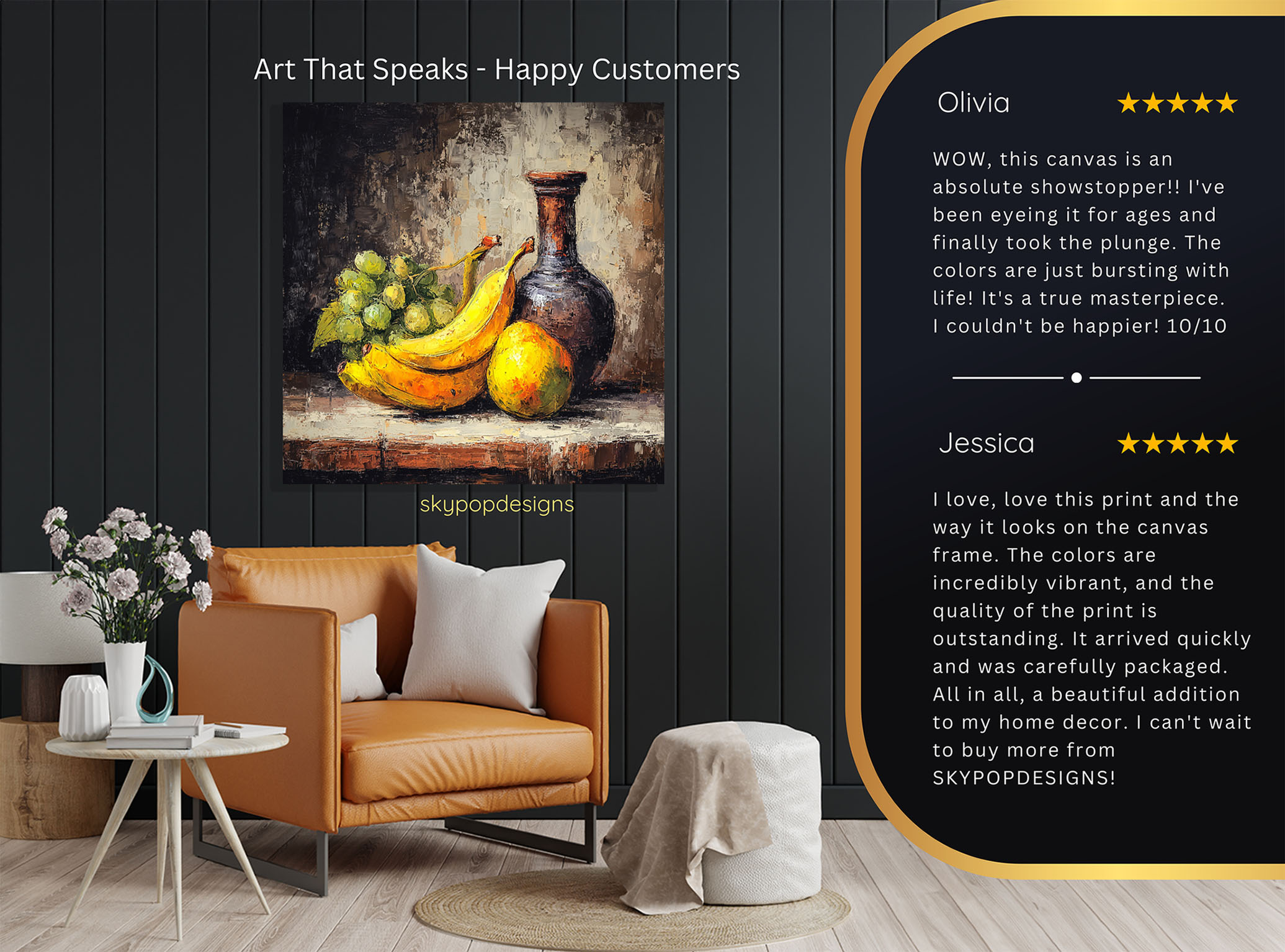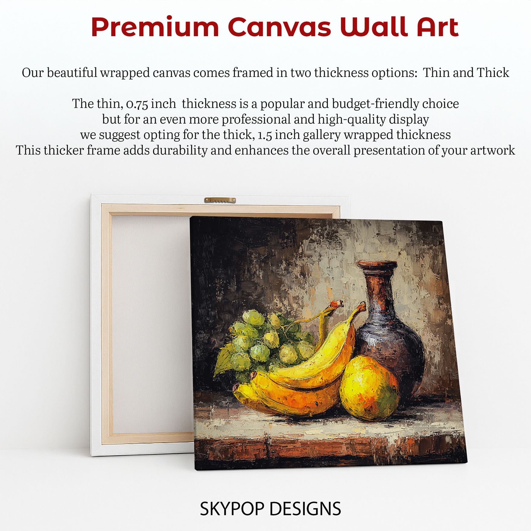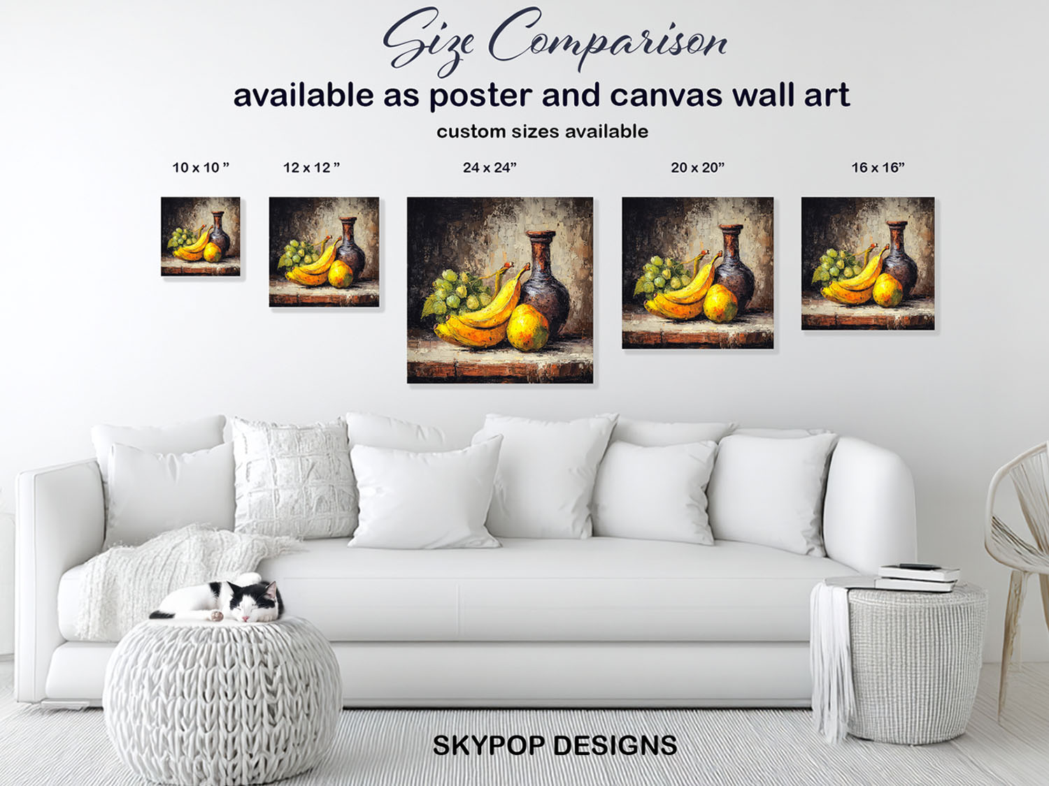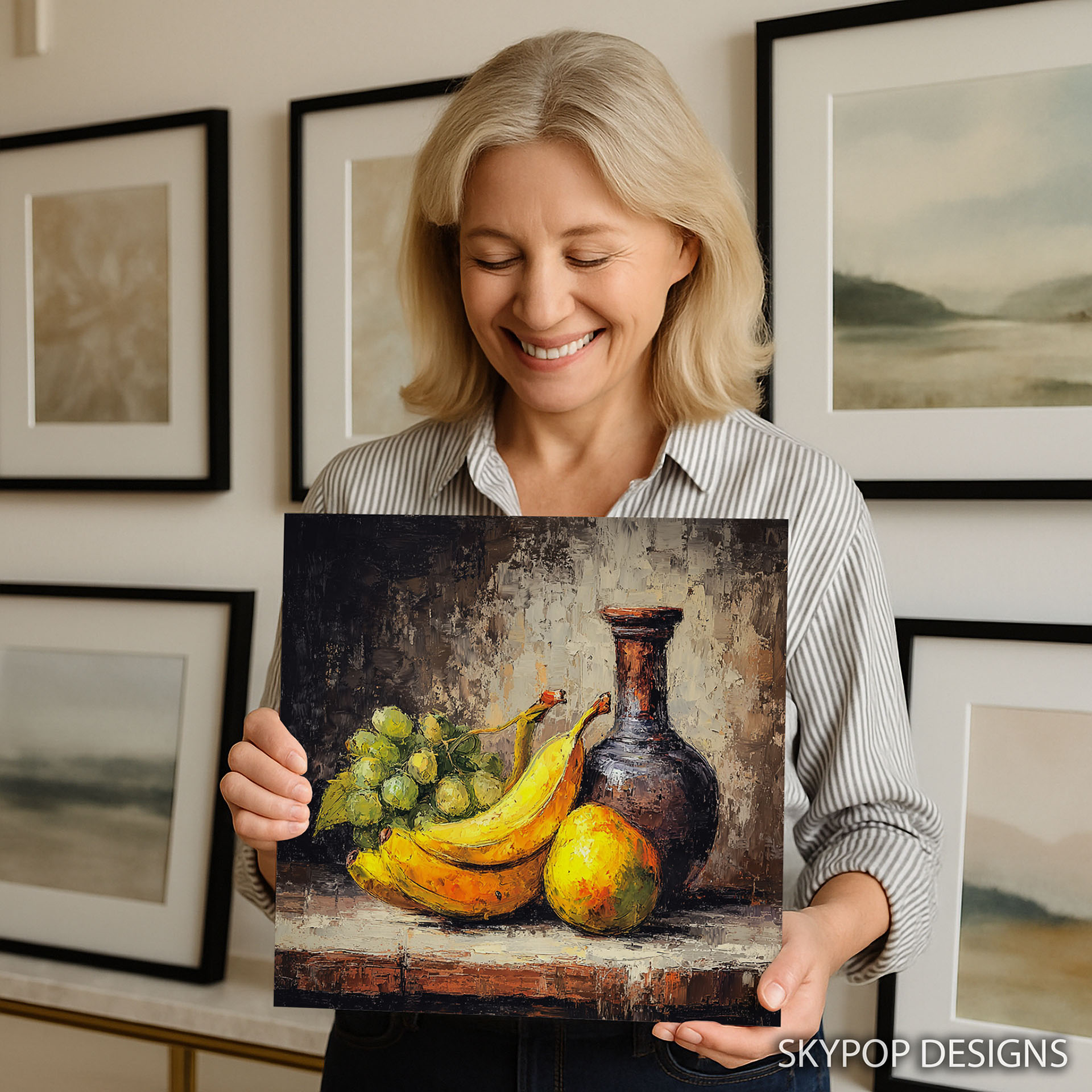 Transform your home with this vibrant still life canvas wall art, showcasing a bountiful harvest of fruits and a rustic vase. This striking poster or canvas wall art is perfect for adding a touch of classic charm to your kitchen or dining room decor. The warm yellow of the bananas and the rich tones of the vase evoke a sense of abundance and comfort, ideal for Tuscan-inspired or rustic interior styles. This artwork’s contemporary interpretation of traditional still life elevates any modern living room or entryway. The textured brushstrokes create a captivating visual experience, making this canvas wall art a focal point in any space. High-quality printing ensures the rich colors and intricate details of the fruits and vase are beautifully rendered. This versatile wall art piece is perfect for displaying in kitchens, dining rooms, or even as a welcoming accent in an entryway. It brings a sense of natural beauty and artistry to your home environment. Whether you’re looking to brighten up a bland wall or find the perfect housewarming gift, this still life poster or canvas wall art offers timeless appeal. Celebrate the beauty of nature and art with this stunning piece that inspires a sense of warmth and well-being. Elevate your decor and bring the feeling of a bountiful harvest into your home today with this captivating canvas art.