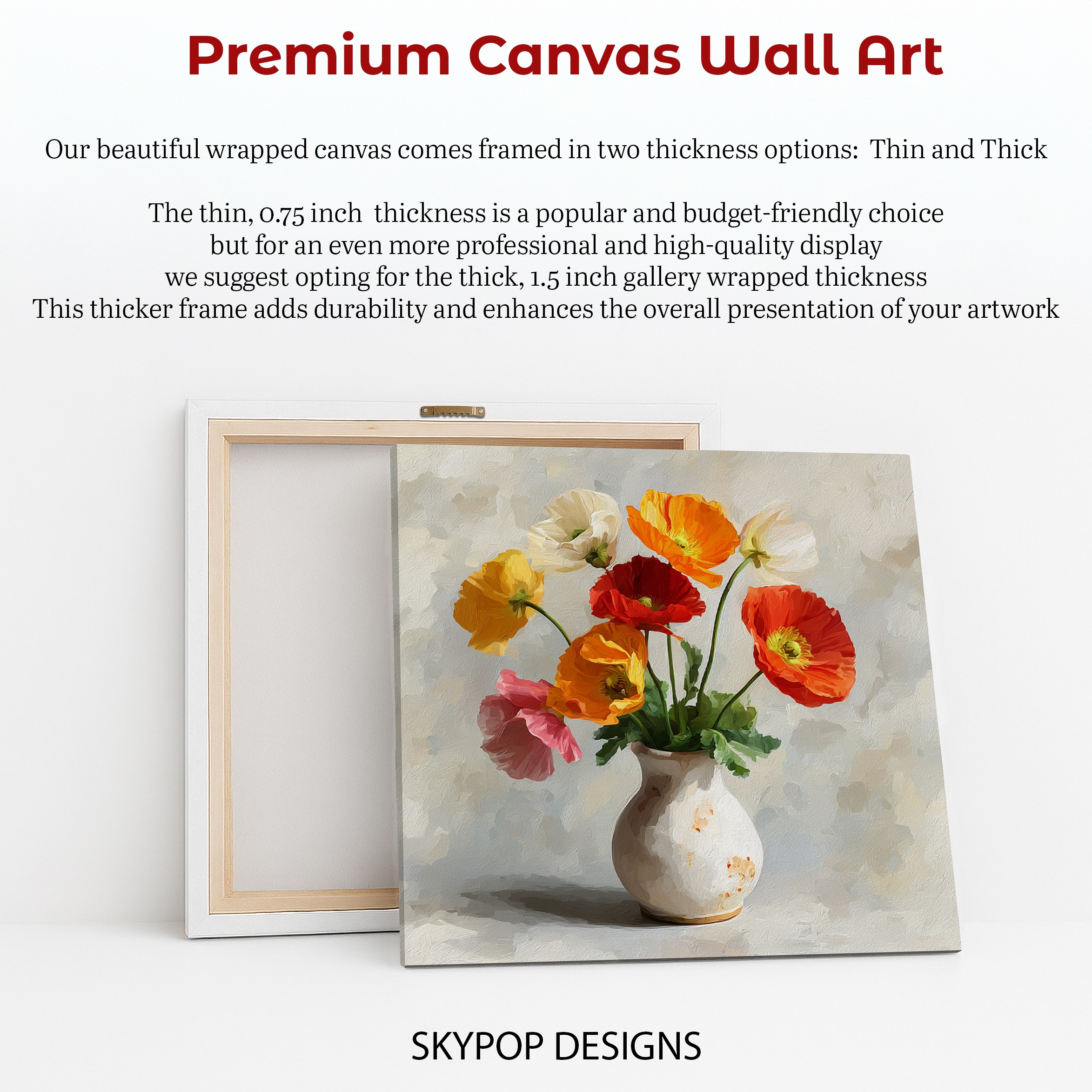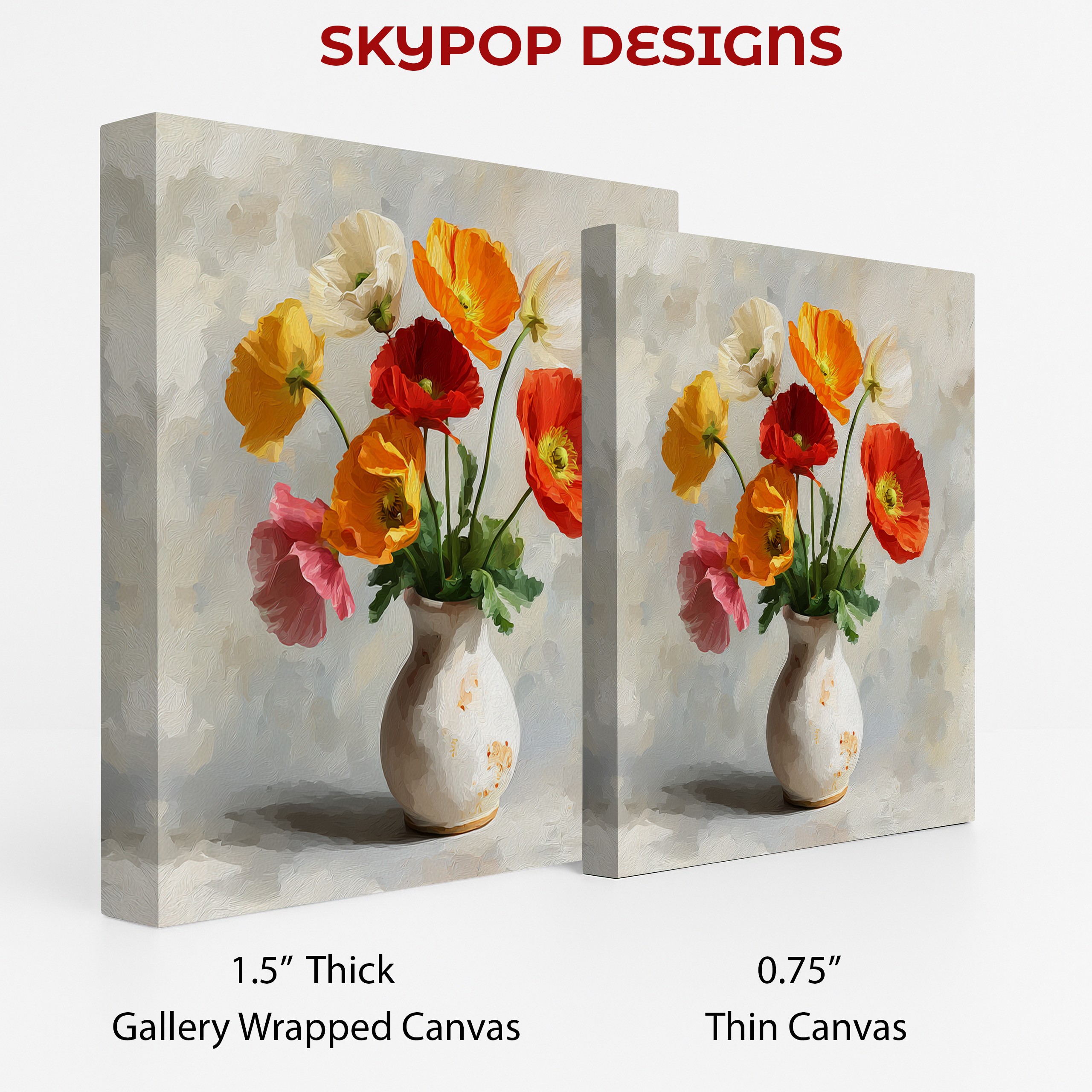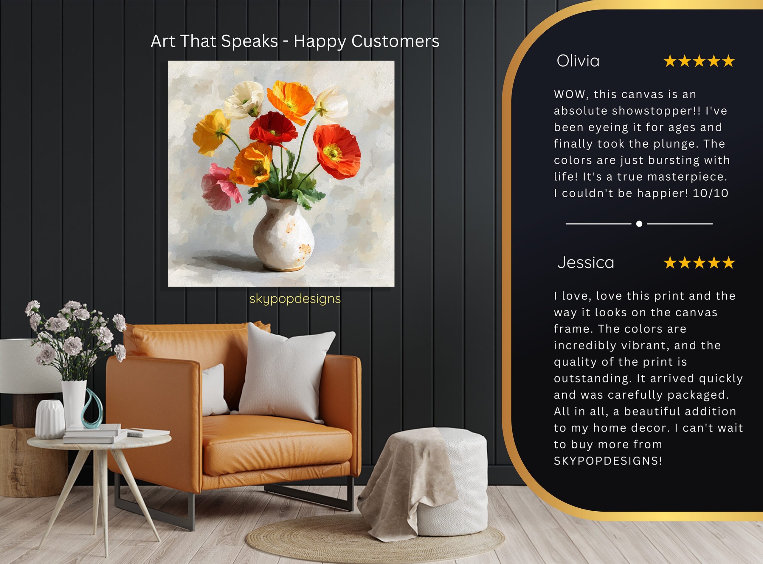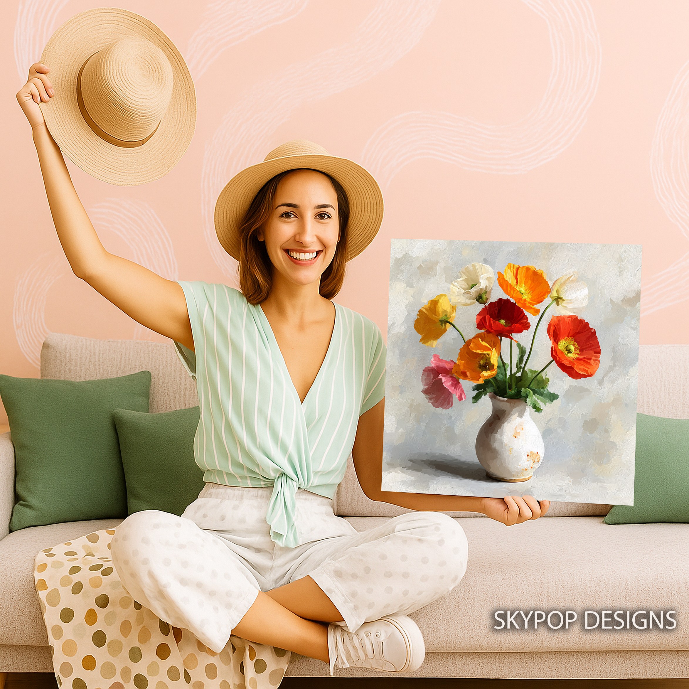 Bring the beauty of a summer garden into your home with this stunning poppy bouquet canvas wall art. The vibrant red, orange, and yellow poppies burst with life against a soft white background, creating a focal point that instantly brightens any room. This eye-catching poster or canvas print showcases a variety of poppy colors and shapes, from bold red blooms to delicate white petals, perfect for adding a pop of color to contemporary living rooms or farmhouse-style dining areas. The impressionistic brushstrokes give the artwork a dreamy, romantic quality that’s ideal for bedroom decor or creating a calming atmosphere in a home office. The white vase grounds the composition, making this piece versatile enough to complement both modern and rustic interiors. Whether you’re looking for a statement piece or a thoughtful housewarming gift, this poppy wall art delivers with its timeless appeal and high-quality printing that captures every detail of the flowers’ delicate texture. The artwork’s size versatility allows it to make an impact in small spaces or become a centerpiece in larger rooms. Transform your walls and elevate your decor with this cheerful and sophisticated floral canvas that celebrates the beauty of nature all year round. Add a touch of bohemian charm or farmhouse warmth to your space with this captivating poppy bouquet art today.