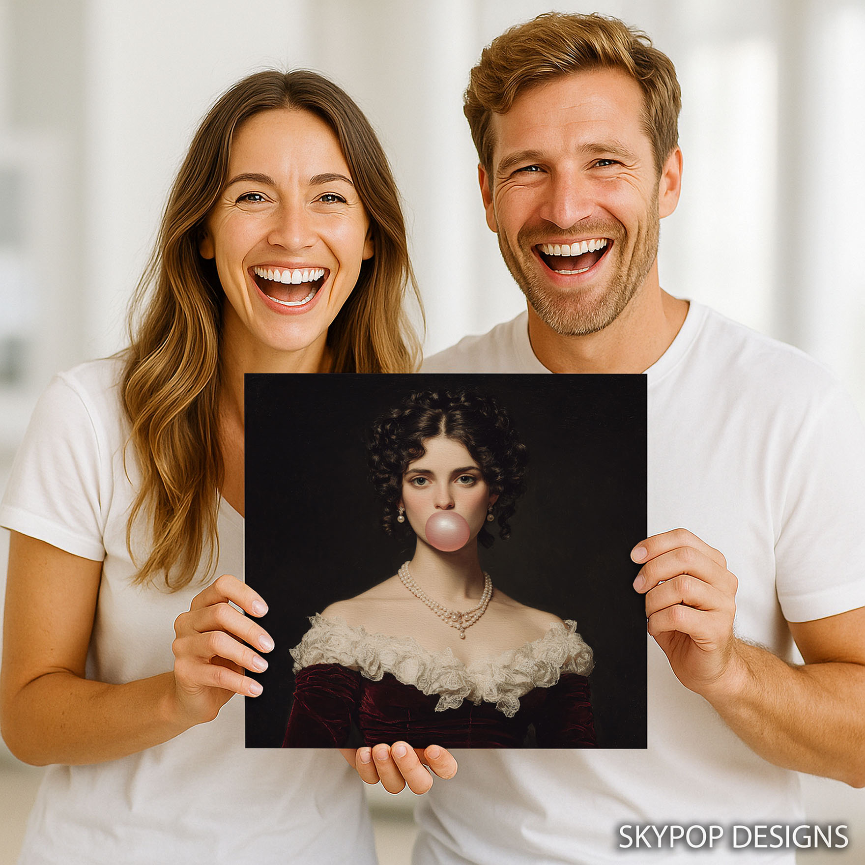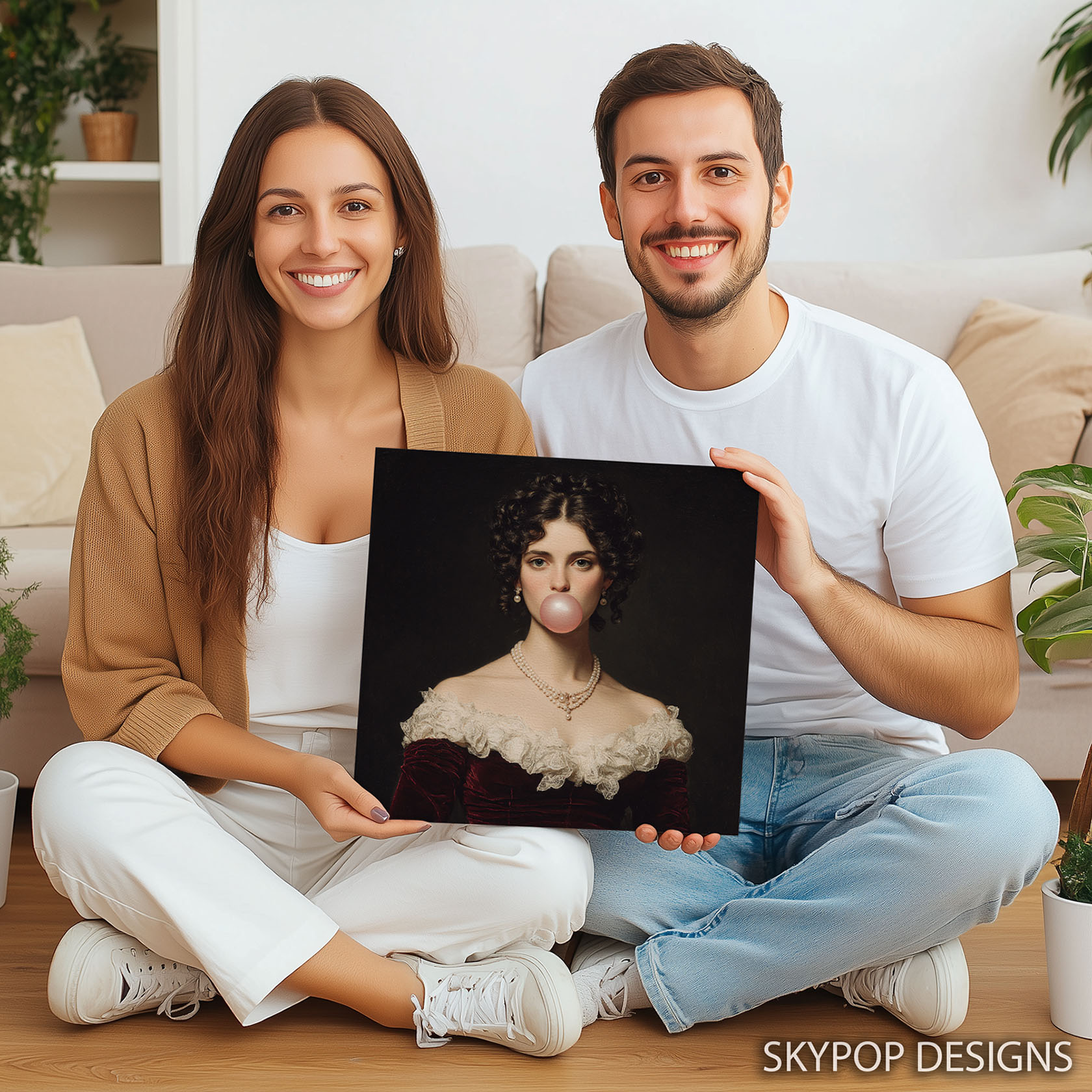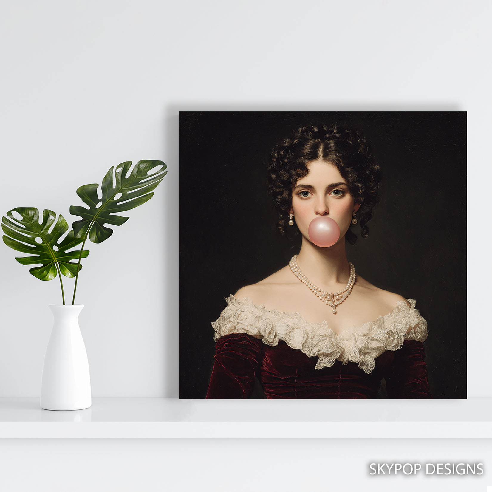 Transform your home with this eye-catching Victorian Lady Blowing Bubble Gum canvas wall art. This provocative poster or canvas wall art beautifully blends classic figurative art with a modern pop art twist, creating a truly unique statement piece. The striking contrast between the historical attire and the contemporary act of blowing bubble gum offers a playful yet sophisticated aesthetic. This vibrant artwork is perfect for adding a touch of glam to your living room wall decor or creating a bold focal point in your bedroom. The rich maroon of her dress and the soft pink of the bubble gum evoke a sense of playful luxury, while the dark background makes the subject pop. Ideal for bohemian interiors seeking an unexpected edge, this canvas wall art also complements modern and eclectic decor styles effortlessly. The detailed portrayal of the lady’s expression and the texture of her dress make this poster a captivating addition to any space. Its size versatility ensures a perfect fit for any wall, from a cozy entryway to a grand dining room. This striking piece also makes a memorable gift for art lovers, birthdays, or housewarmings, bringing a conversation-starting element to any decor. Elevate your space with this unique blend of old-world charm and modern sensibility, a true testament to timeless style with a contemporary flair. Showcase your personality and love for art with this stunning canvas wall art that inspires joy and intrigue. Add this unique poster to your collection and transform your environment today.