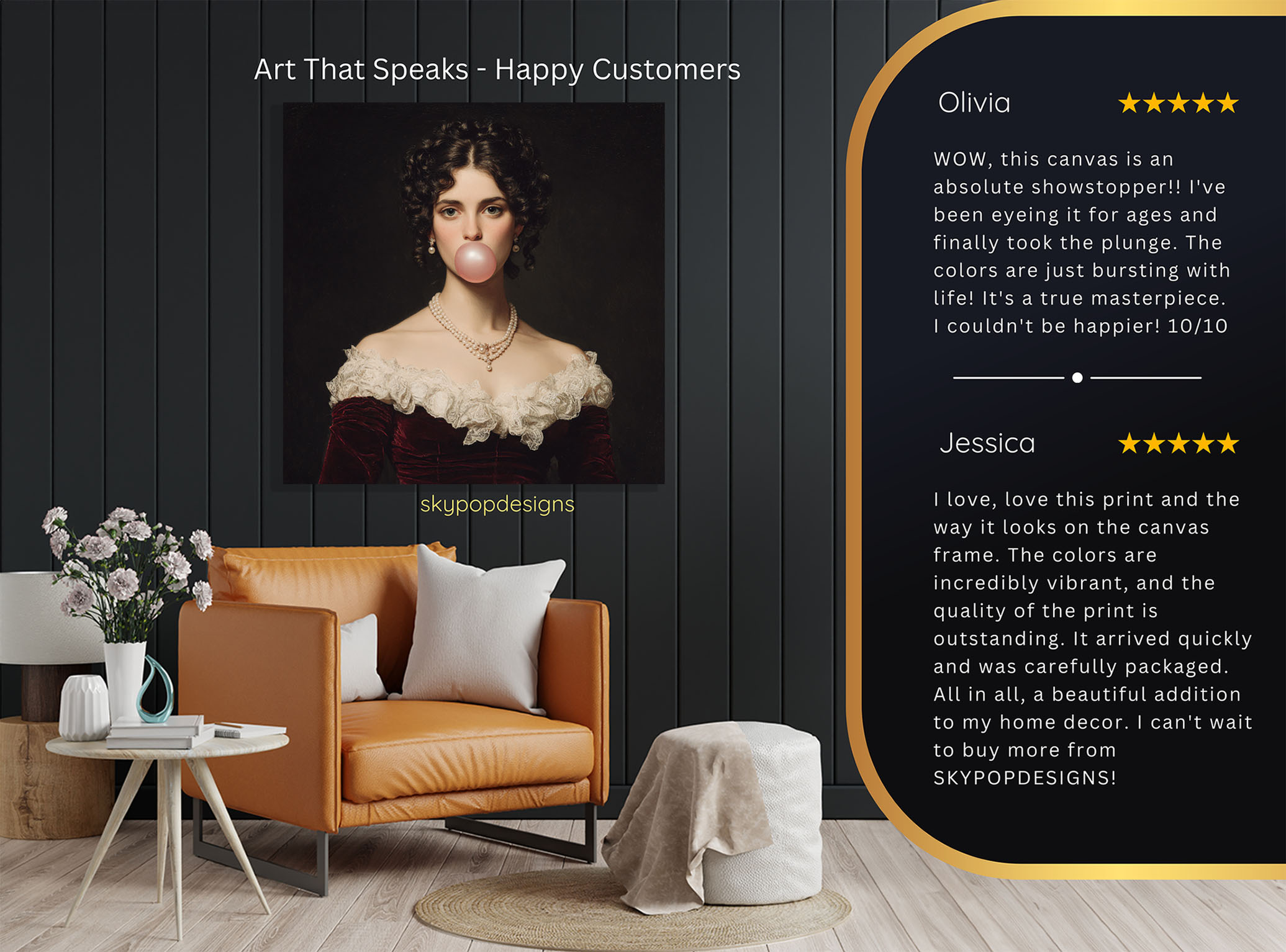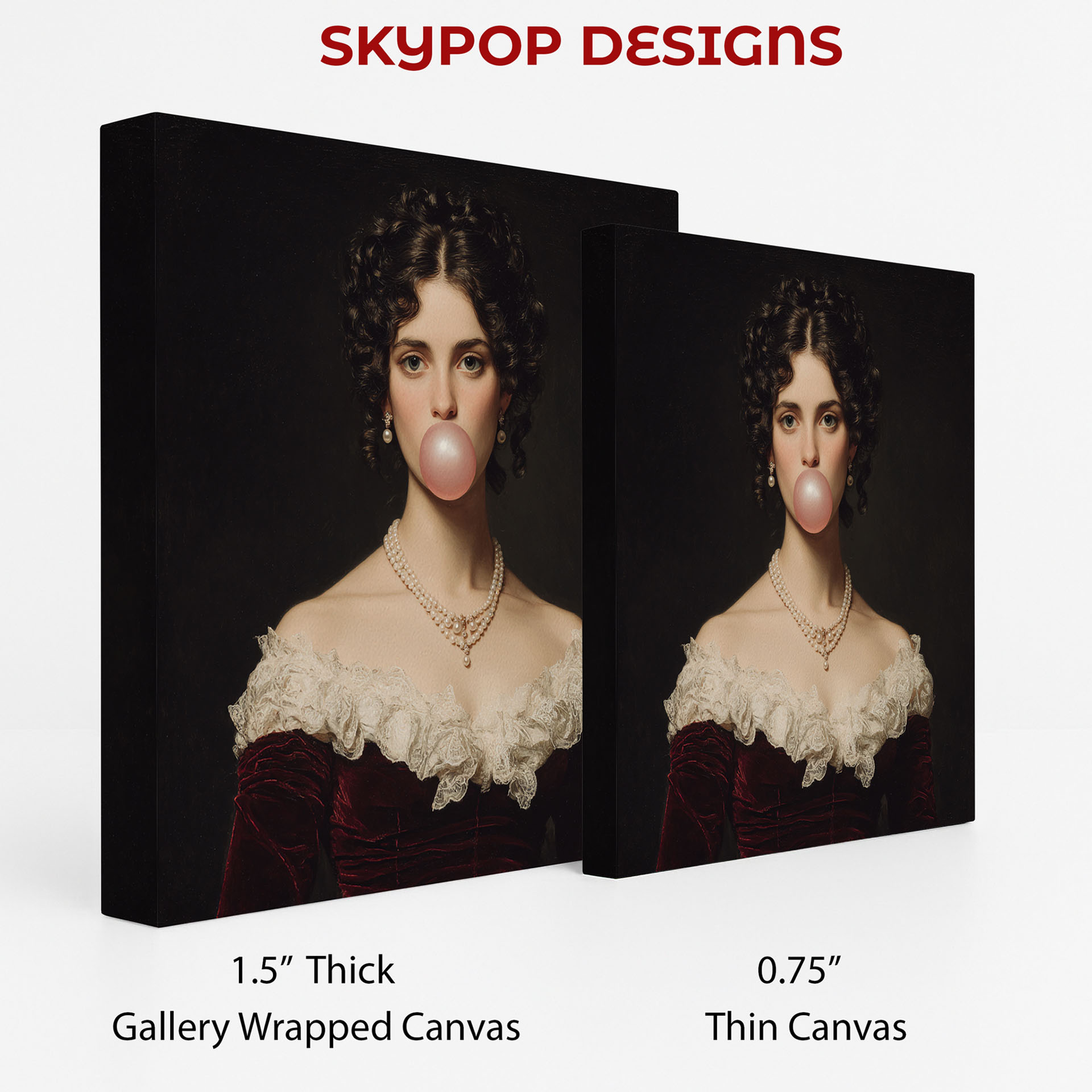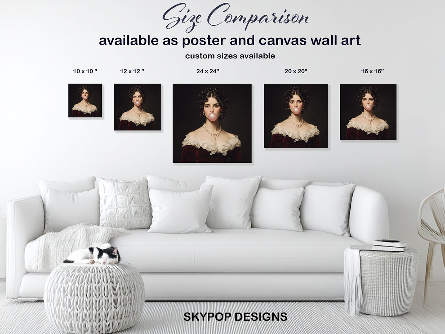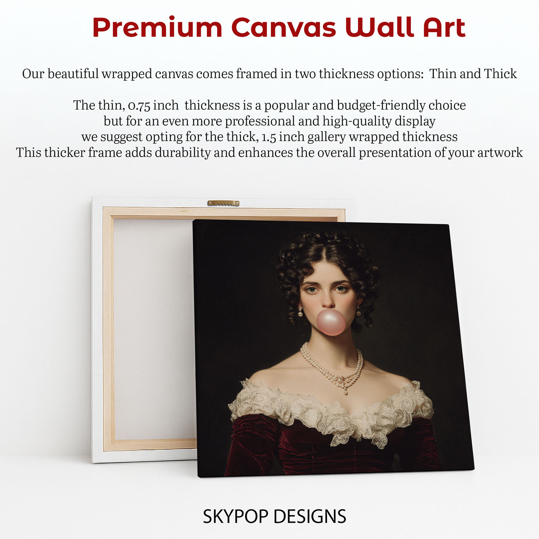 Transform your home with this eye-catching Victorian Lady Blowing Bubble Gum canvas wall art. This provocative poster or canvas wall art beautifully blends classic figurative art with a modern pop art twist, creating a truly unique statement piece. The striking contrast between the historical attire and the contemporary act of blowing bubble gum offers a playful yet sophisticated aesthetic. This vibrant artwork is perfect for adding a touch of glam to your living room wall decor or creating a bold focal point in your bedroom. The rich maroon of her dress and the soft pink of the bubble gum evoke a sense of playful luxury, while the dark background makes the subject pop. Ideal for bohemian interiors seeking an unexpected edge, this canvas wall art also complements modern and eclectic decor styles effortlessly. The detailed portrayal of the lady’s expression and the texture of her dress make this poster a captivating addition to any space. Its size versatility ensures a perfect fit for any wall, from a cozy entryway to a grand dining room. This striking piece also makes a memorable gift for art lovers, birthdays, or housewarmings, bringing a conversation-starting element to any decor. Elevate your space with this unique blend of old-world charm and modern sensibility, a true testament to timeless style with a contemporary flair. Showcase your personality and love for art with this stunning canvas wall art that inspires joy and intrigue. Add this unique poster to your collection and transform your environment today.