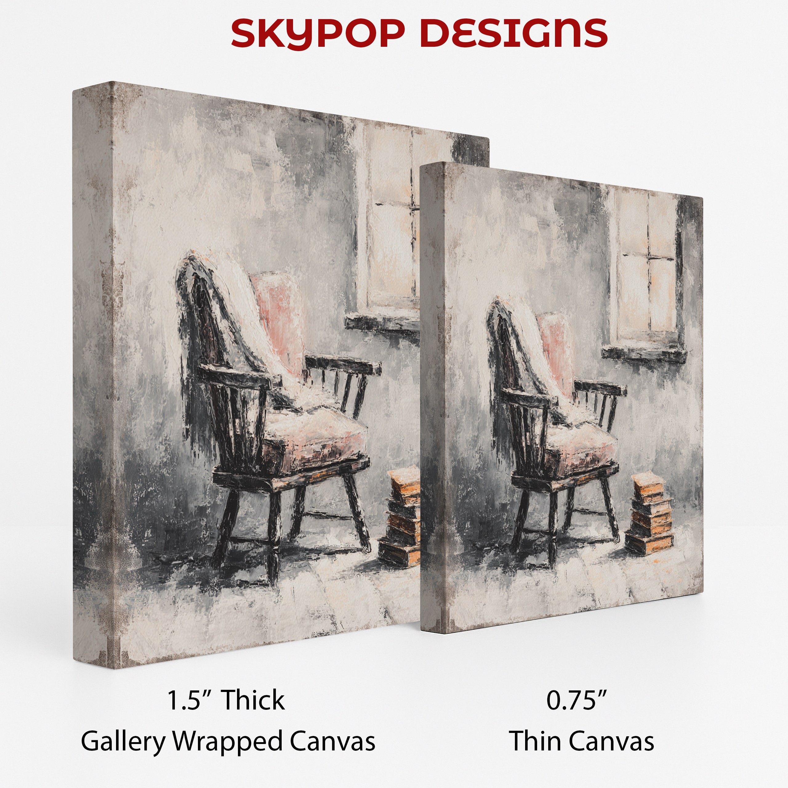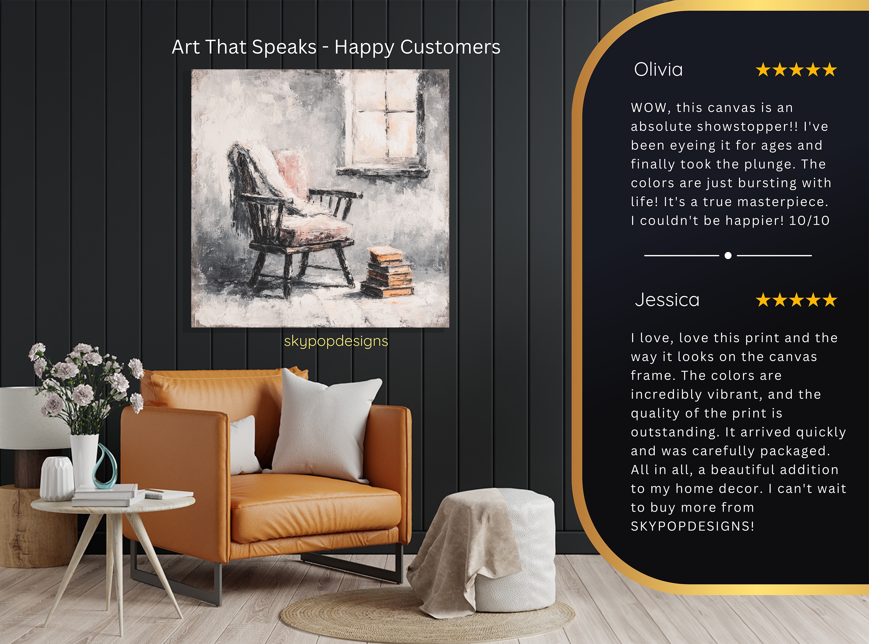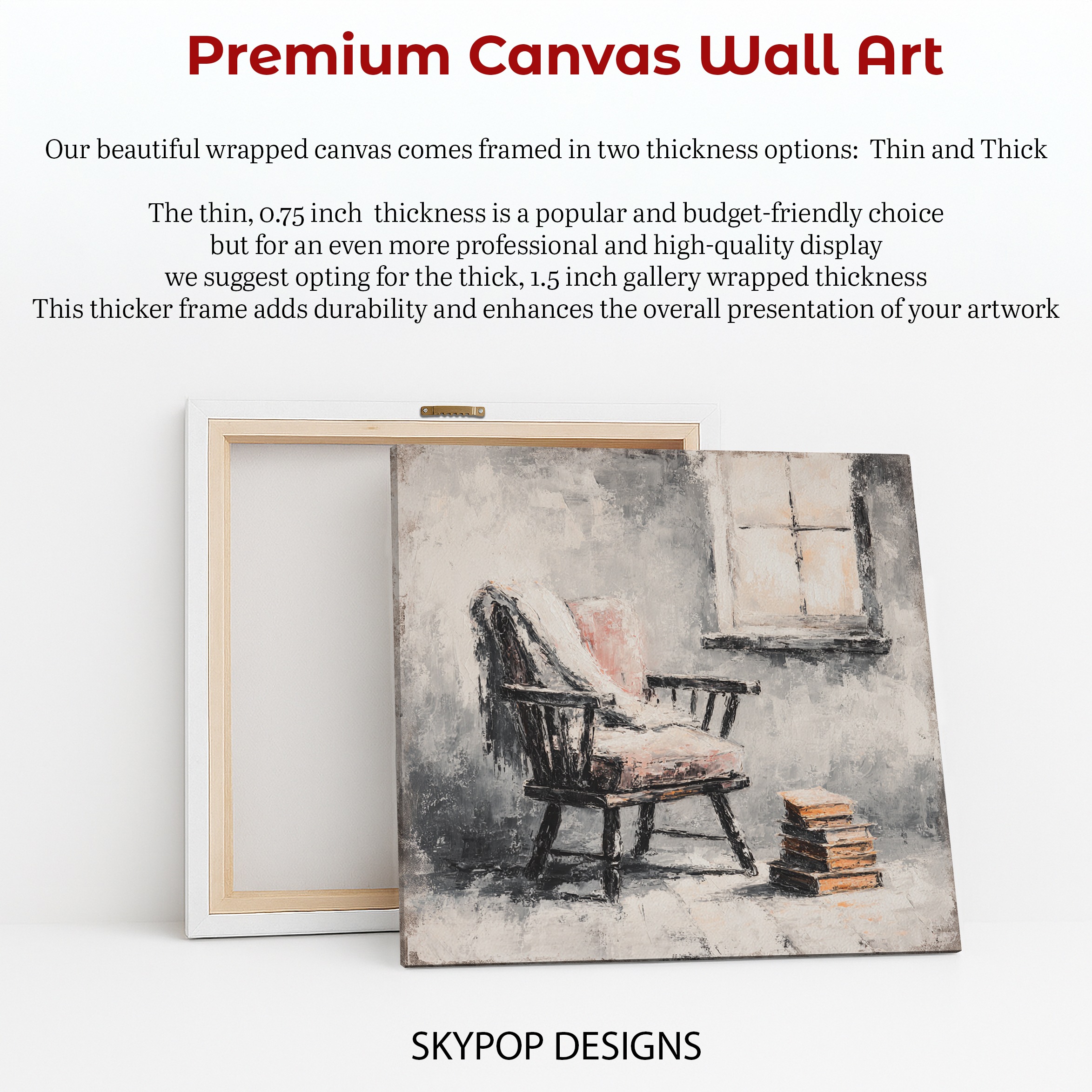 Transform your space with this captivating canvas wall art featuring a cozy reading nook scene. This striking poster captures the essence of quiet contemplation with its minimalist composition of a vintage chair, soft cushion, and stack of books. Perfect for creating a serene atmosphere in your living room or office, this contemporary artwork adds a touch of rustic charm to any decor style. The muted color palette of greys, whites, and blacks is beautifully accented by subtle pink tones, creating a calming visual experience that enhances focus and relaxation. Ideal for book lovers and those who appreciate understated elegance, this canvas art serves as a gentle reminder to slow down and enjoy life’s simple pleasures. The artful blend of textures and brushstrokes brings depth and interest to the piece, making it a versatile addition to Scandinavian-inspired interiors or minimalist spaces. Whether displayed in a cozy bedroom corner or as a statement piece in your home library, this wall art inspires a love for literature and peaceful moments. Elevate your home decor with this timeless representation of comfort and knowledge. Add warmth and character to your walls while celebrating the joy of reading with this stunning canvas artwork.