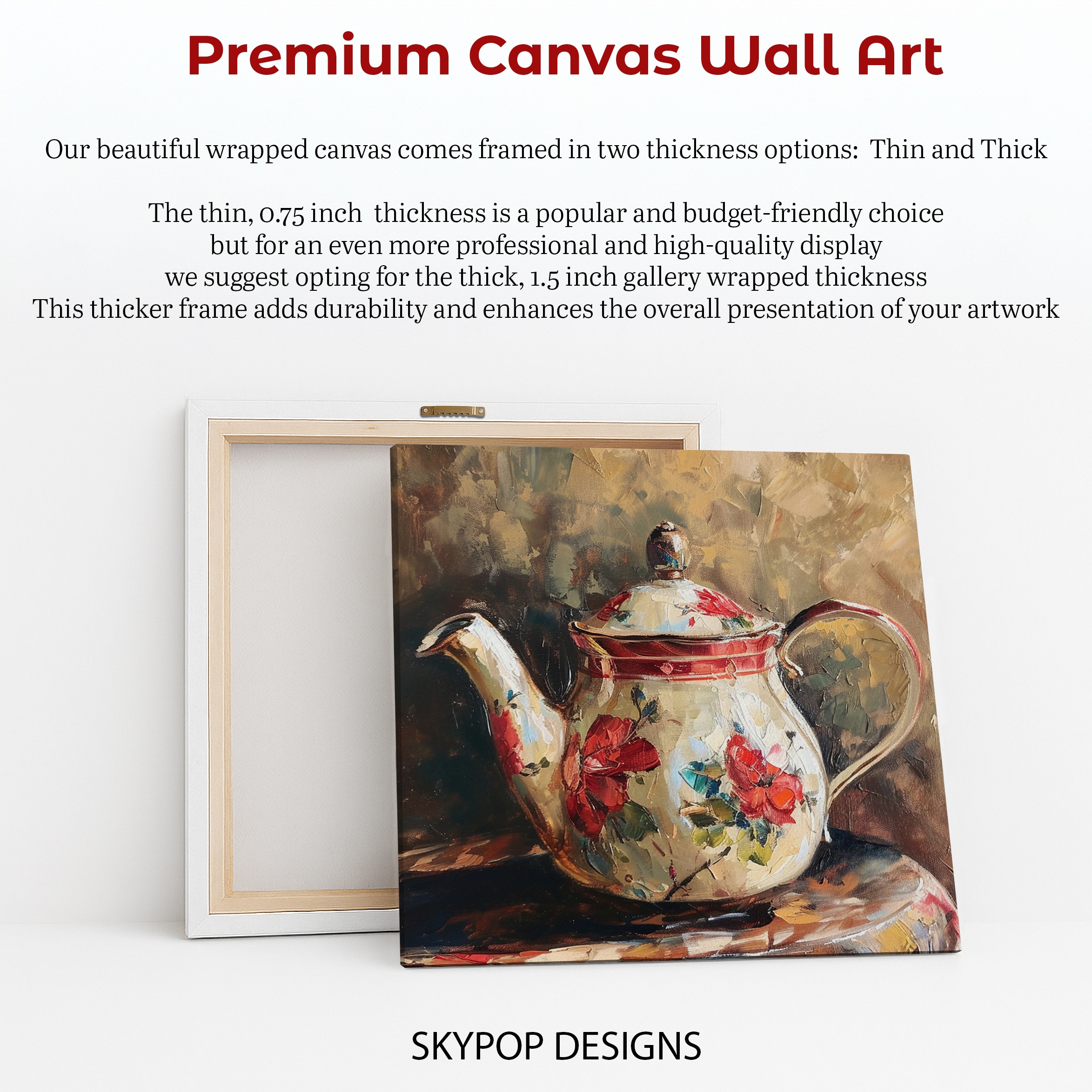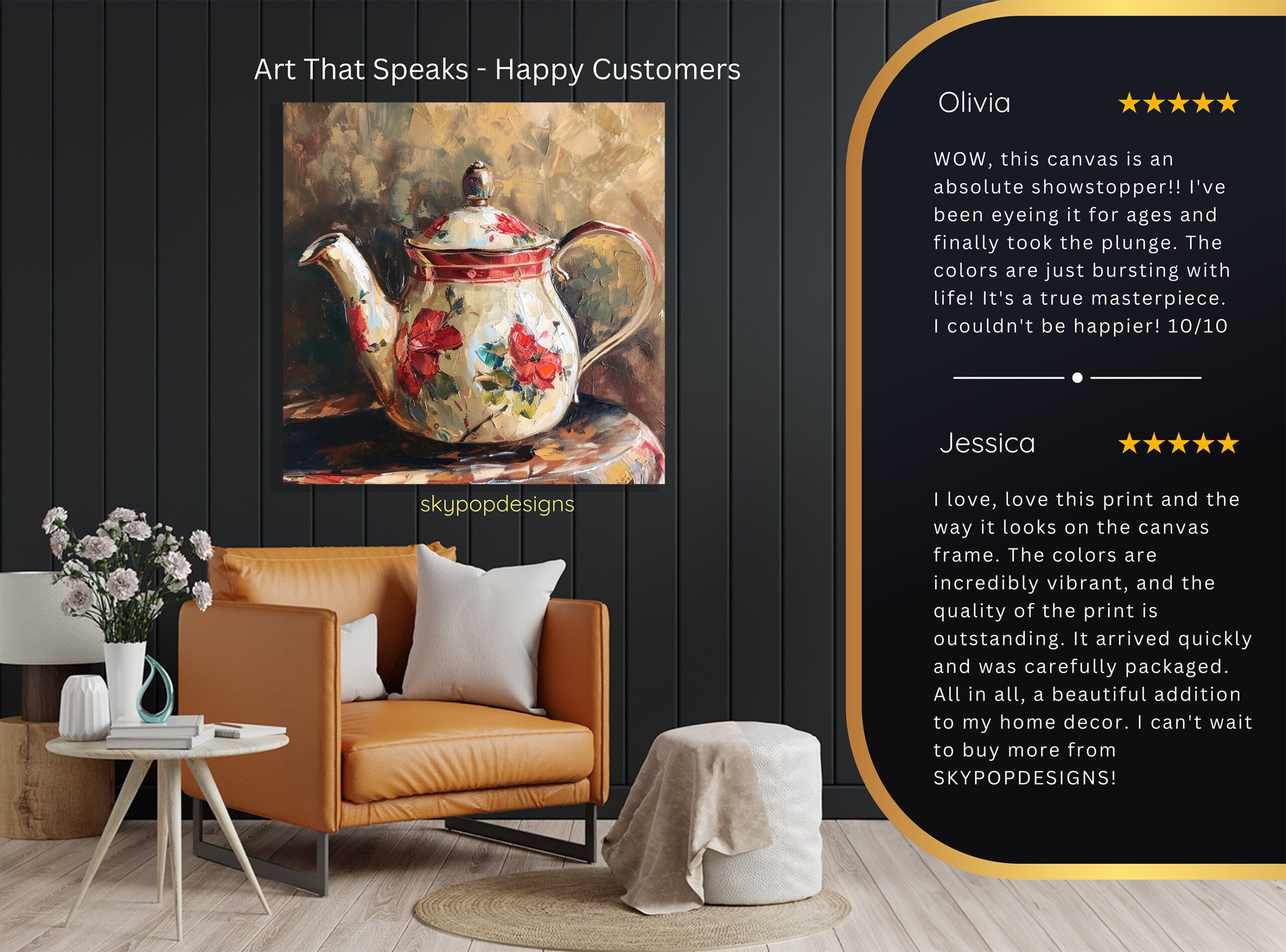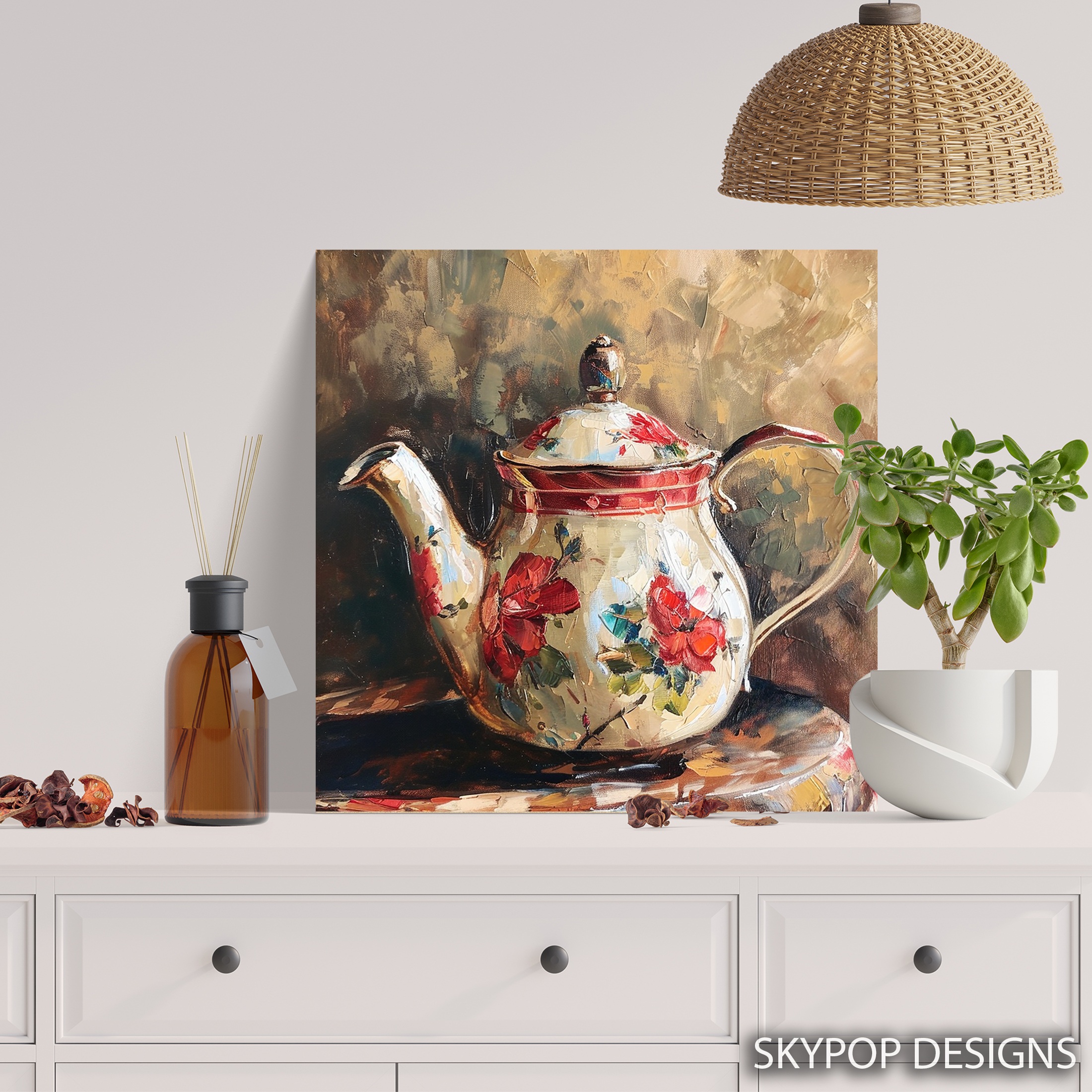 Elevate your home decor with this stunning canvas wall art featuring a beautifully painted vintage teapot. This classic still life poster captures the timeless elegance of traditional tea service with its intricate floral design and rich color palette. The vibrant red poppies adorning the white porcelain teapot create a striking focal point, perfect for adding a touch of warmth to your dining room or kitchen. Ideal for those who love vintage-inspired decor, this canvas art brings a sense of nostalgia and charm to any space. The artist’s skillful brushstrokes and attention to detail bring the teapot to life, showcasing the delicate play of light on its curved surface. This versatile piece works beautifully in traditional, rustic, or country-style interiors, adding a cozy and inviting atmosphere to your home. The golden-brown background adds depth and richness, making this wall art a standout piece in any room. Whether displayed in a sunroom for afternoon tea or as a focal point in your living room, this canvas poster celebrates the art of hospitality and the simple pleasures of daily life. Perfect as a housewarming gift or to refresh your own decor, this high-quality canvas art will be a cherished addition to any home. Transform your space today with this timeless and elegant teapot wall art that brings a touch of vintage charm to modern living.