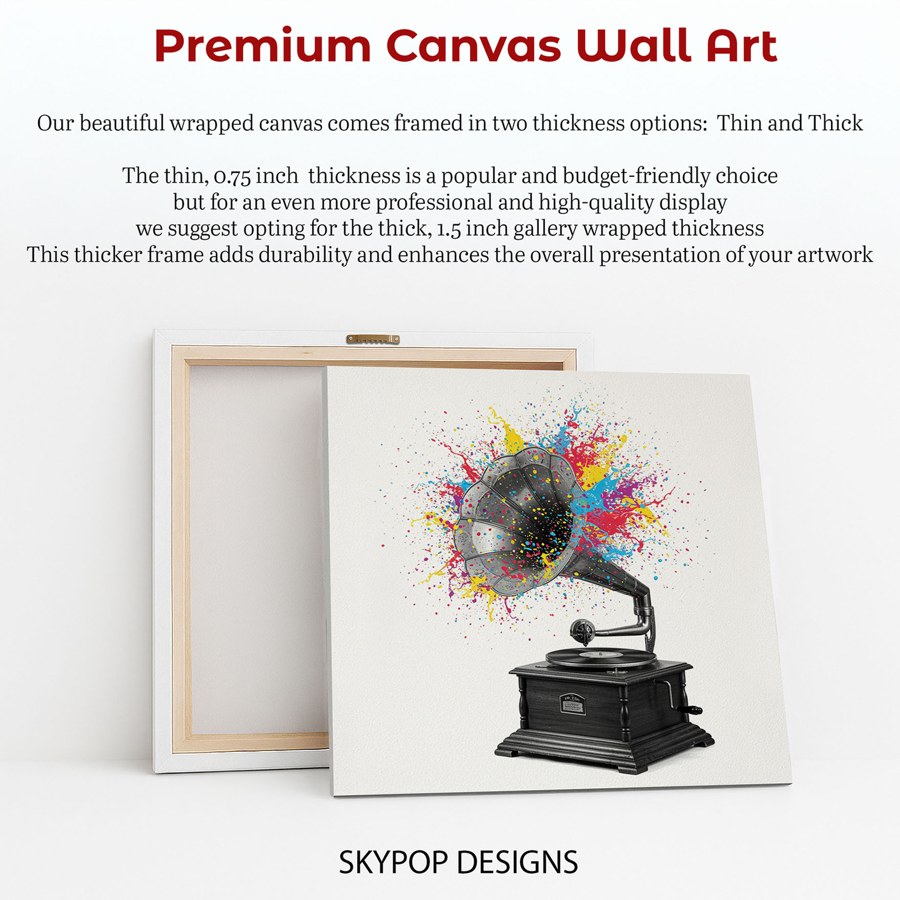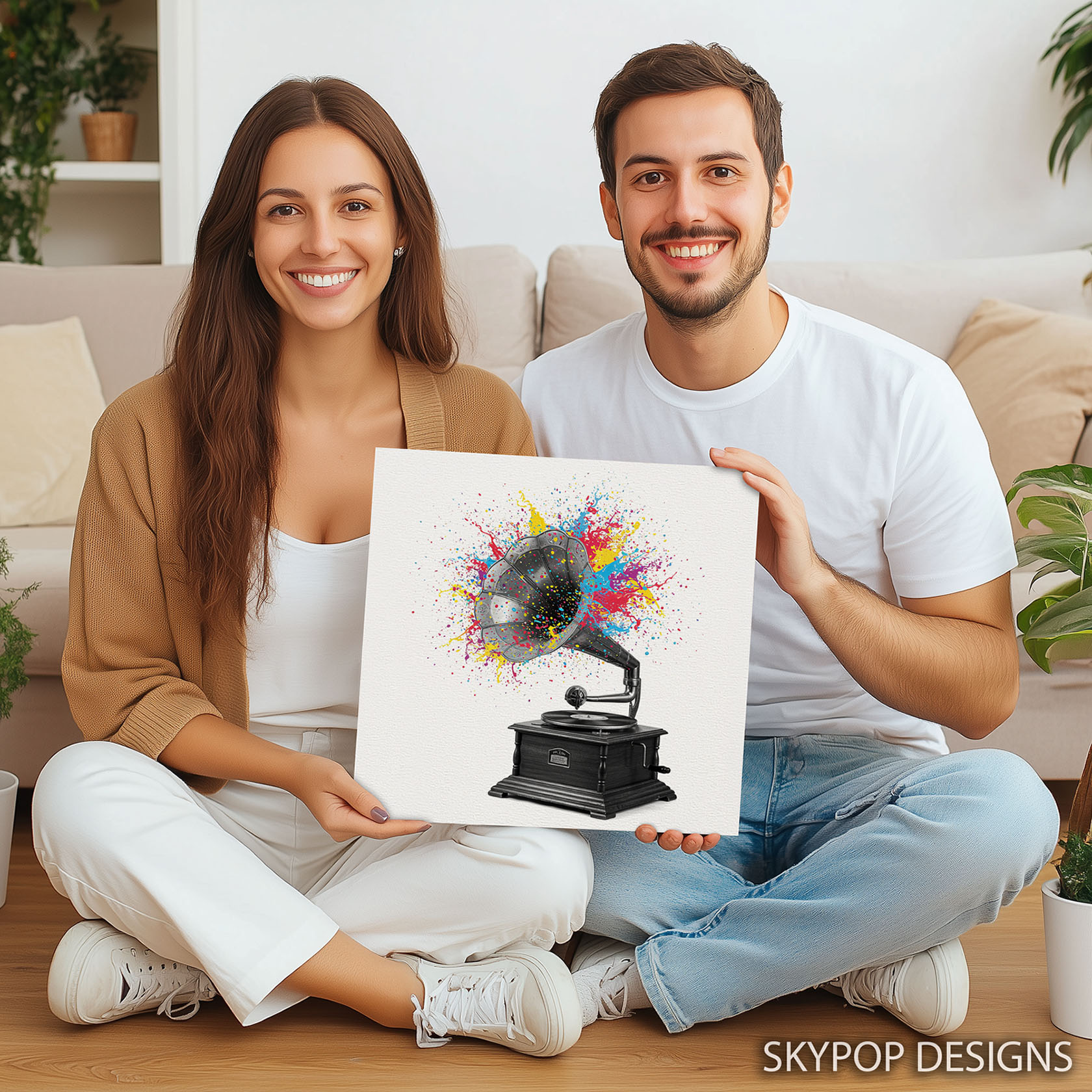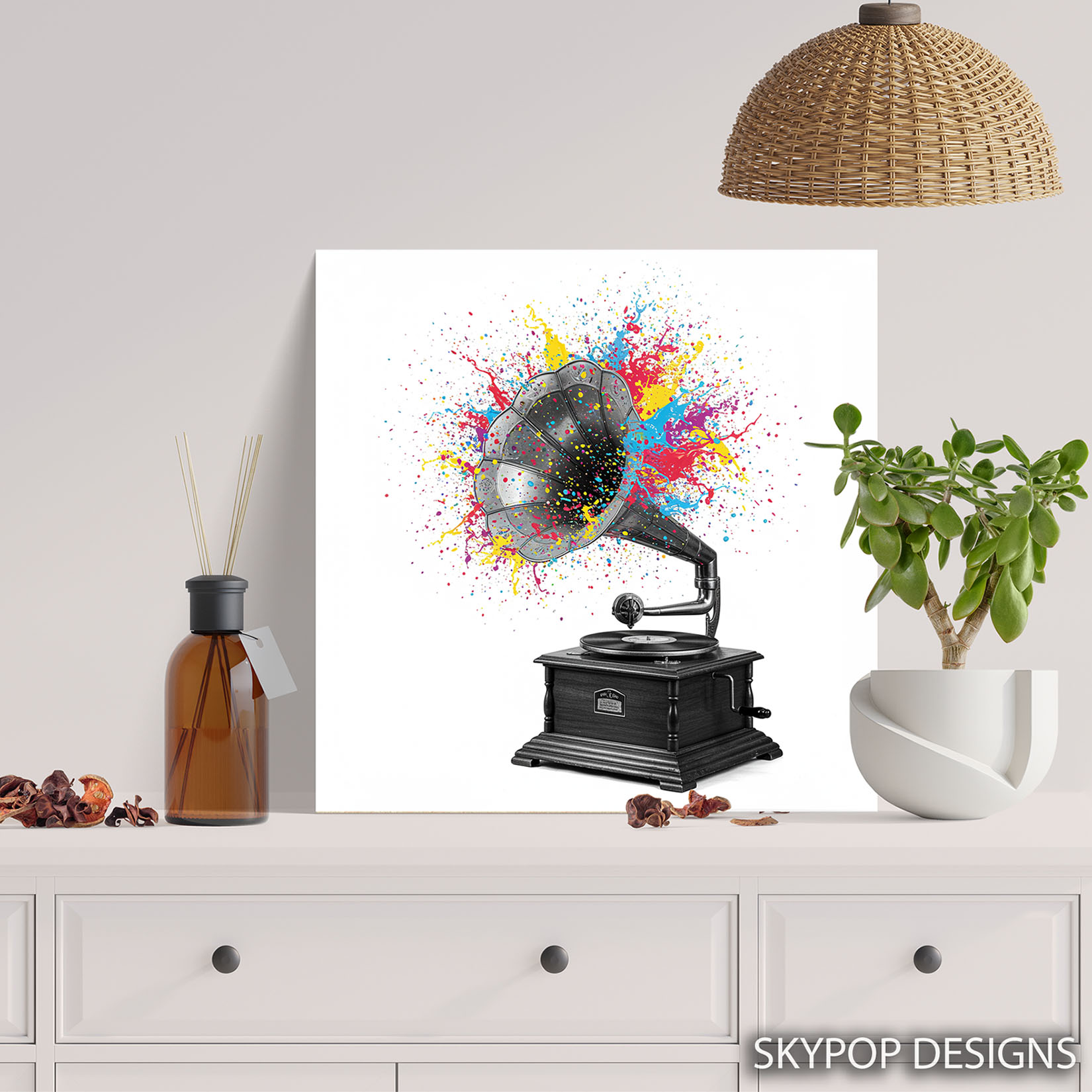 Ignite your passion for music with this vibrant vintage gramophone canvas wall art that explodes with color and sound. This energetic poster or canvas wall art is perfect for transforming any living room or office space into a hub of creative energy. The striking multicolor splashes behind the classic gramophone create a captivating focal point, blending contemporary art with a retro feel that appeals to modern decor sensibilities. Ideal for Bohemian or Pop Art enthusiasts, this piece brings a dynamic and joyful atmosphere to any room. The stark contrast between the monochrome gramophone and the explosion of vibrant hues symbolizes the powerful emotion and boundless creativity that music evokes. This artwork is not just decor; it’s a statement piece that celebrates the timeless appeal of music and art. High-quality printing ensures the vivid colors and intricate details of the gramophone and paint splatters are rendered with stunning clarity. Perfect as a unique gift for music lovers this holiday season or as a housewarming present, this canvas wall art is sure to be a cherished addition. Elevate your home with this exceptionally designed poster that will spark conversations and inspire your daily life. Make this ‘Vintage Gramophone Explosion Art’ the centerpiece of your wall decor collection and let the music play. This striking piece brings life to modern wall decor and celebrates the fusion of classic design and abstract expression. Transform your space with this exciting canvas art today.