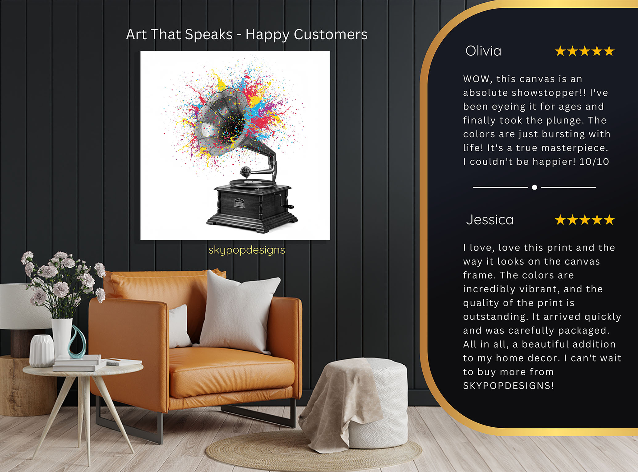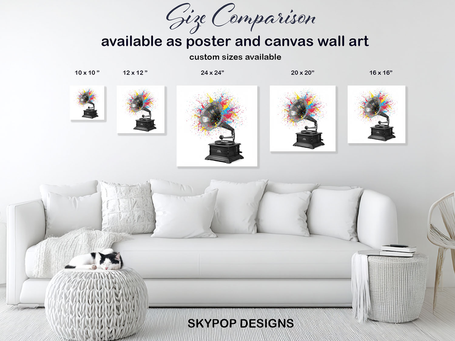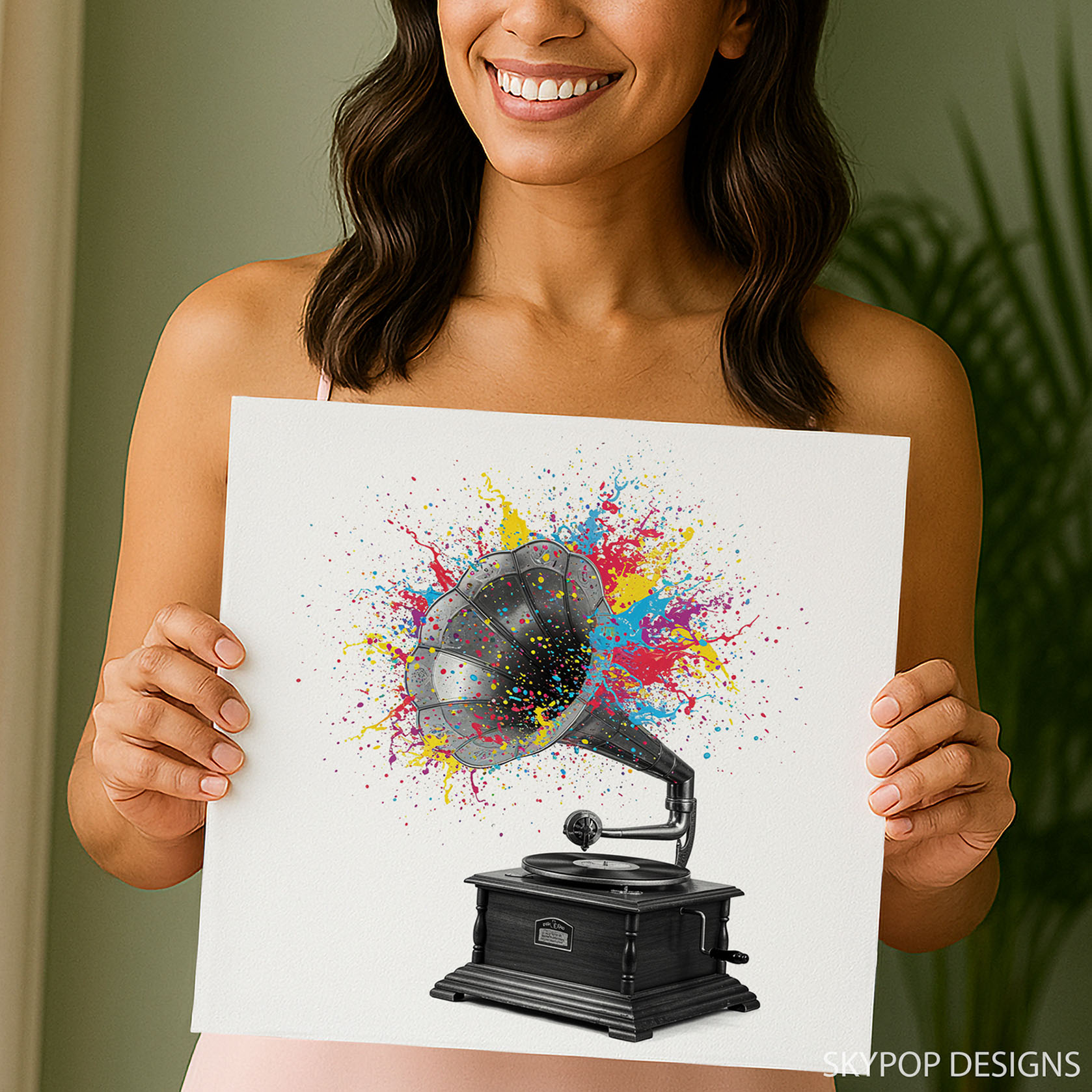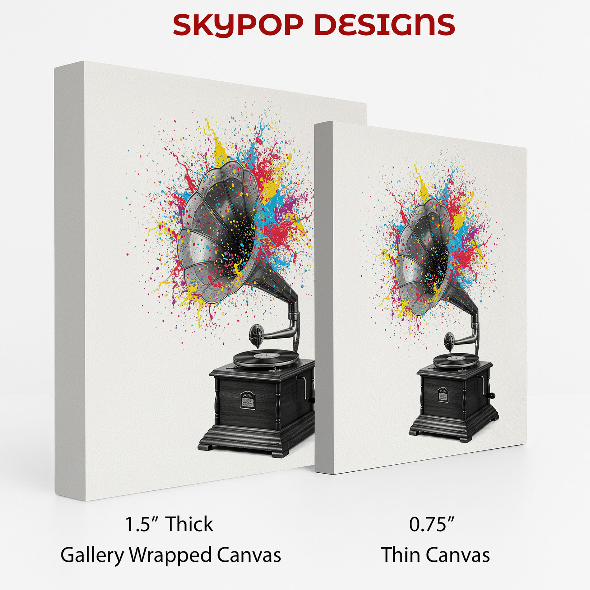 Ignite your passion for music with this vibrant vintage gramophone canvas wall art that explodes with color and sound. This energetic poster or canvas wall art is perfect for transforming any living room or office space into a hub of creative energy. The striking multicolor splashes behind the classic gramophone create a captivating focal point, blending contemporary art with a retro feel that appeals to modern decor sensibilities. Ideal for Bohemian or Pop Art enthusiasts, this piece brings a dynamic and joyful atmosphere to any room. The stark contrast between the monochrome gramophone and the explosion of vibrant hues symbolizes the powerful emotion and boundless creativity that music evokes. This artwork is not just decor; it’s a statement piece that celebrates the timeless appeal of music and art. High-quality printing ensures the vivid colors and intricate details of the gramophone and paint splatters are rendered with stunning clarity. Perfect as a unique gift for music lovers this holiday season or as a housewarming present, this canvas wall art is sure to be a cherished addition. Elevate your home with this exceptionally designed poster that will spark conversations and inspire your daily life. Make this ‘Vintage Gramophone Explosion Art’ the centerpiece of your wall decor collection and let the music play. This striking piece brings life to modern wall decor and celebrates the fusion of classic design and abstract expression. Transform your space with this exciting canvas art today.