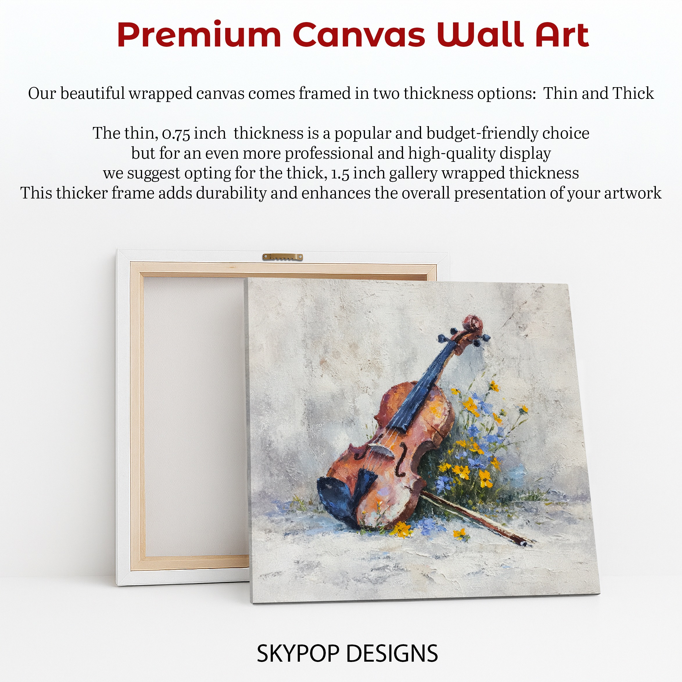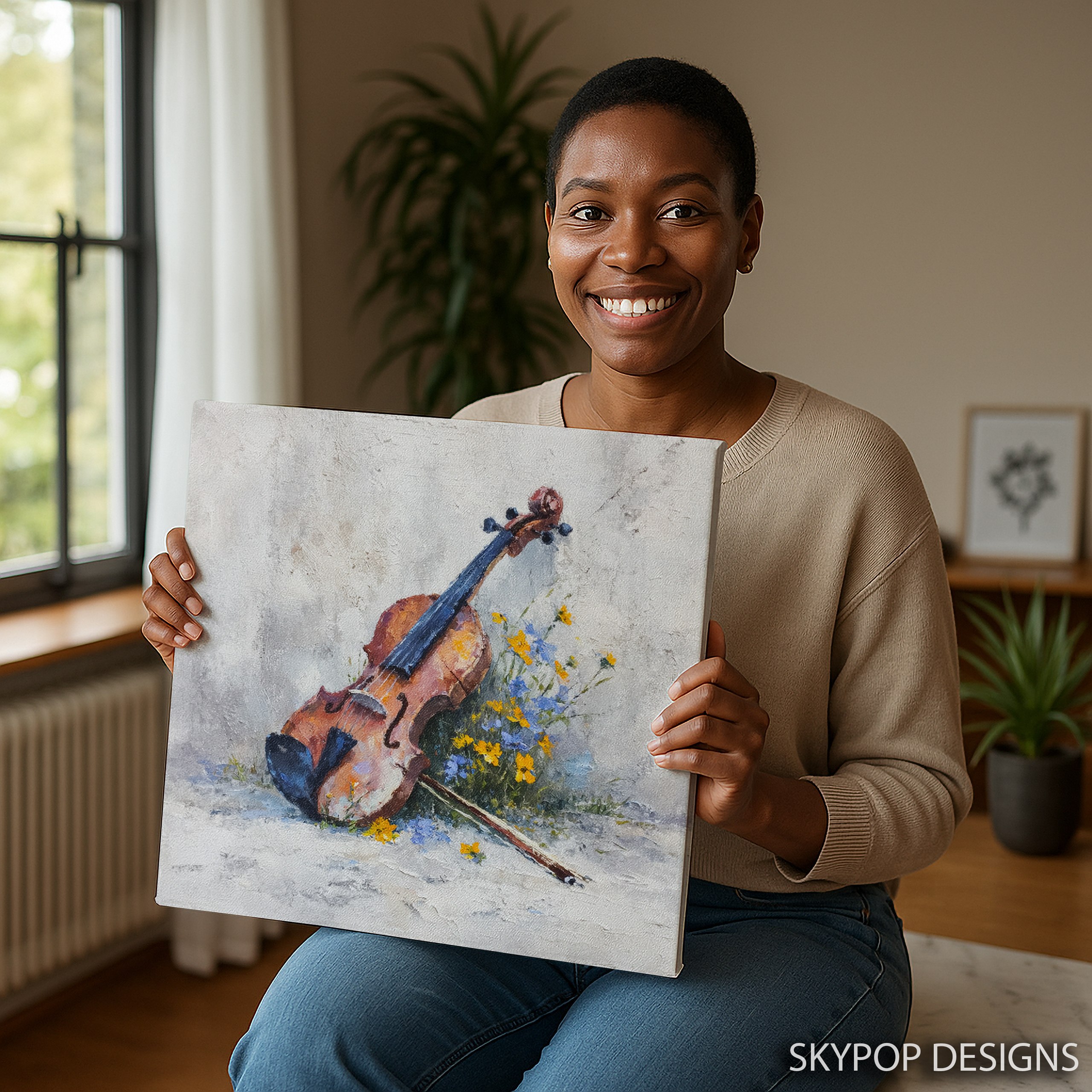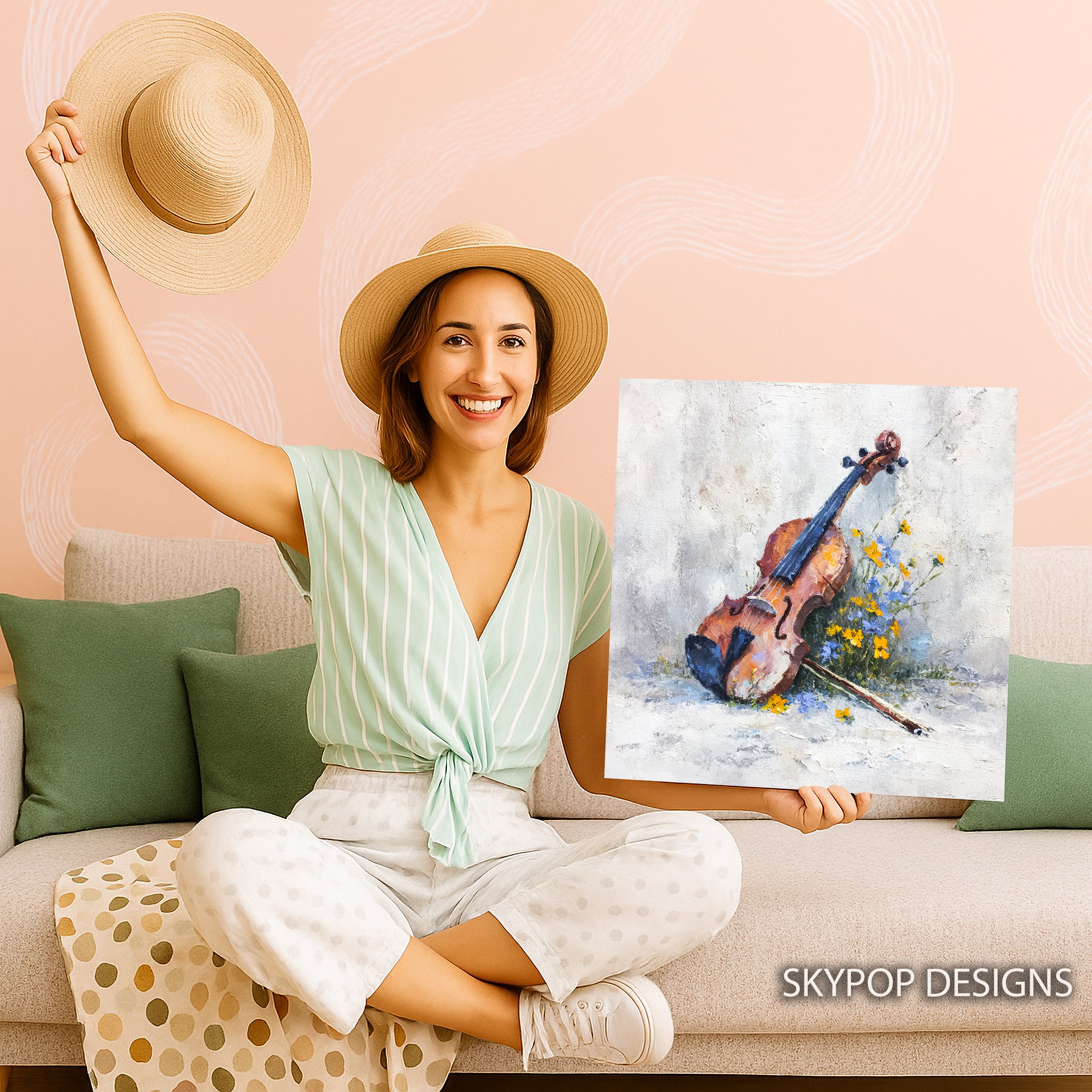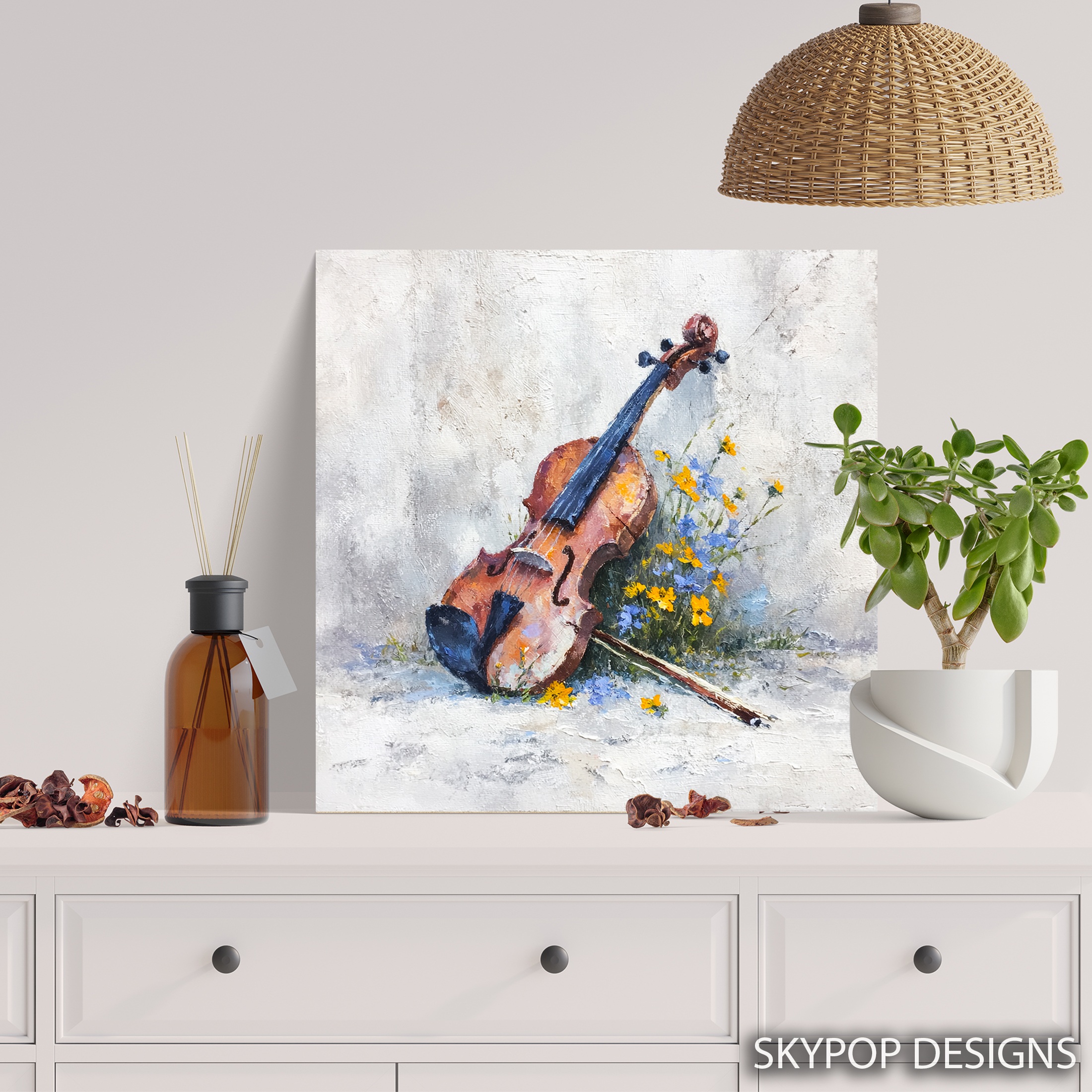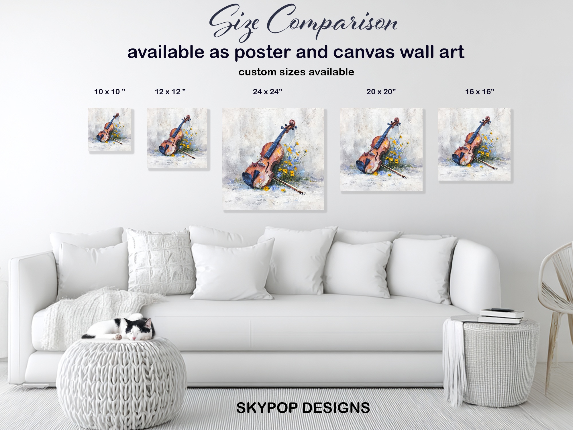 Elevate your home decor with this stunning violin canvas wall art, beautifully capturing the essence of music and nature. This captivating piece showcases a rich brown violin nestled among vibrant yellow and blue wildflowers, creating a perfect harmony of rustic charm and artistic elegance. The delicate brushstrokes and soft color palette make this poster ideal for creating a serene atmosphere in your living room or bedroom. Perfect for music lovers and nature enthusiasts alike, this canvas wall art brings a touch of countryside tranquility to any space. The warm tones of the violin contrast beautifully with the cool blues of the flowers, adding depth and visual interest to your walls. This versatile piece complements various decor styles, from shabby chic to country-inspired interiors. Imagine the calming effect of this artwork in your dining room, setting the mood for intimate gatherings or quiet contemplation. The high-quality printing ensures every detail of the instrument and delicate petals is captured, making it a conversation starter for years to come. Whether you’re looking to add a musical touch to your home office or create a focal point in your music room, this violin and wildflower art is the perfect choice. Transform your space today with this timeless piece that celebrates the beauty of music and nature in perfect harmony.
