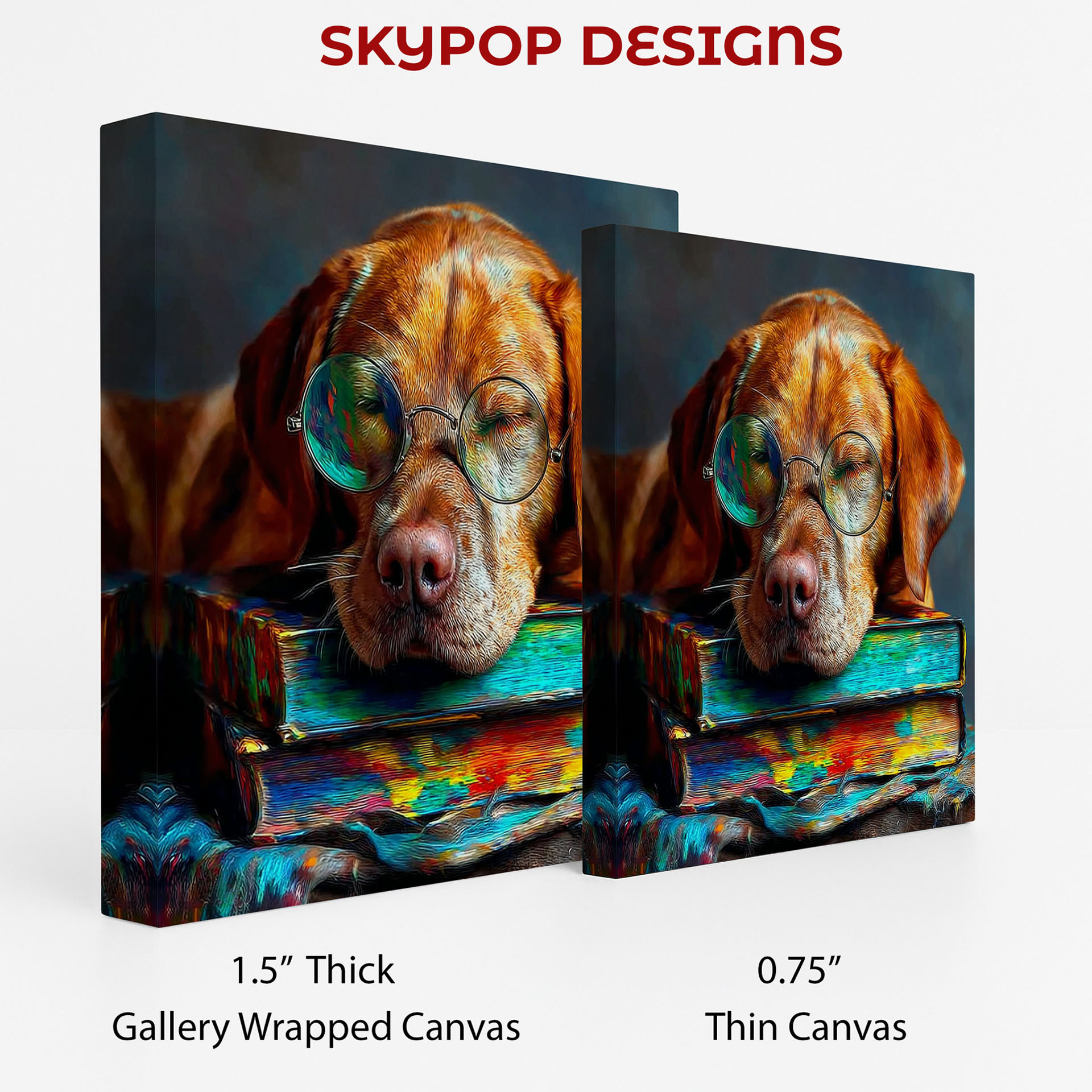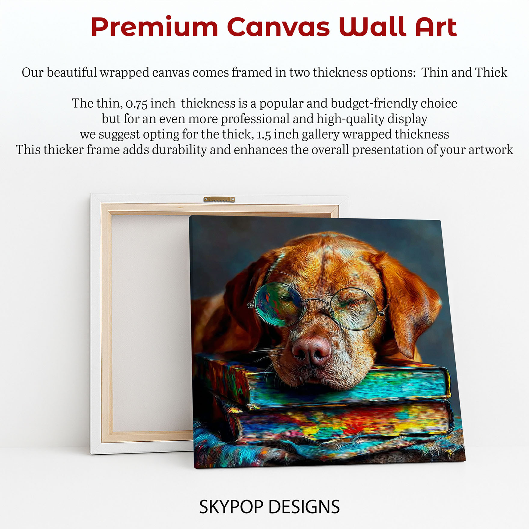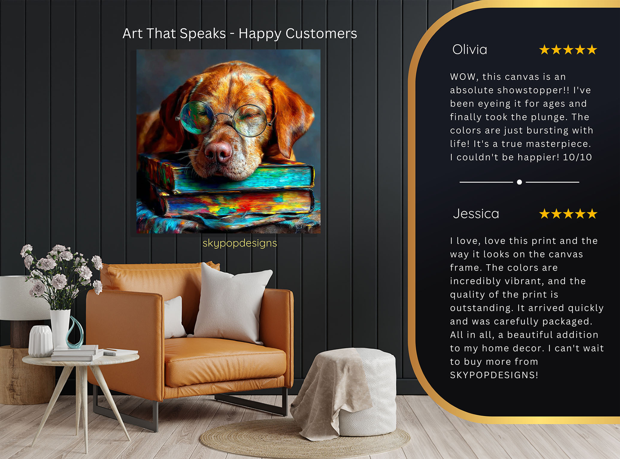 Transform your home into a cozy haven with this captivating Vizsla canvas wall art featuring a clever dog with glasses resting on vibrant books. This poster or canvas wall art is perfect for adding a unique touch to your modern living room decor or inspiring your home office bookshelf. The rich browns of the Vizsla complement the multicolor pop art style of the books, creating a striking visual contrast that brings life to any space. Ideal for bohemian interiors or mid-century modern aesthetics, this animal art piece adds personality and charm. The Vizsla, known for its intelligence and loyalty, is depicted in a whimsical, engaging way that sparks joy and conversation. High-quality printing showcases the artwork’s vibrant textures and intricate details, making this canvas wall art a true statement piece. This versatile poster or canvas wall art is a fantastic addition to a library, study, or even a child’s room, infusing each space with warmth and character. It serves as a perfect gift for dog lovers, bookworms, or anyone looking to elevate their home decor with unique wall art. The lively colors in the books can be a focal point for your decor, while the Vizsla’s calm pose promotes a sense of peace and contemplation. Elevate your walls with this eye-catching Vizsla canvas wall art that celebrates learning and companionship. Make this delightful artwork a focal point of your decor and bring intellectual charm to your home today.
