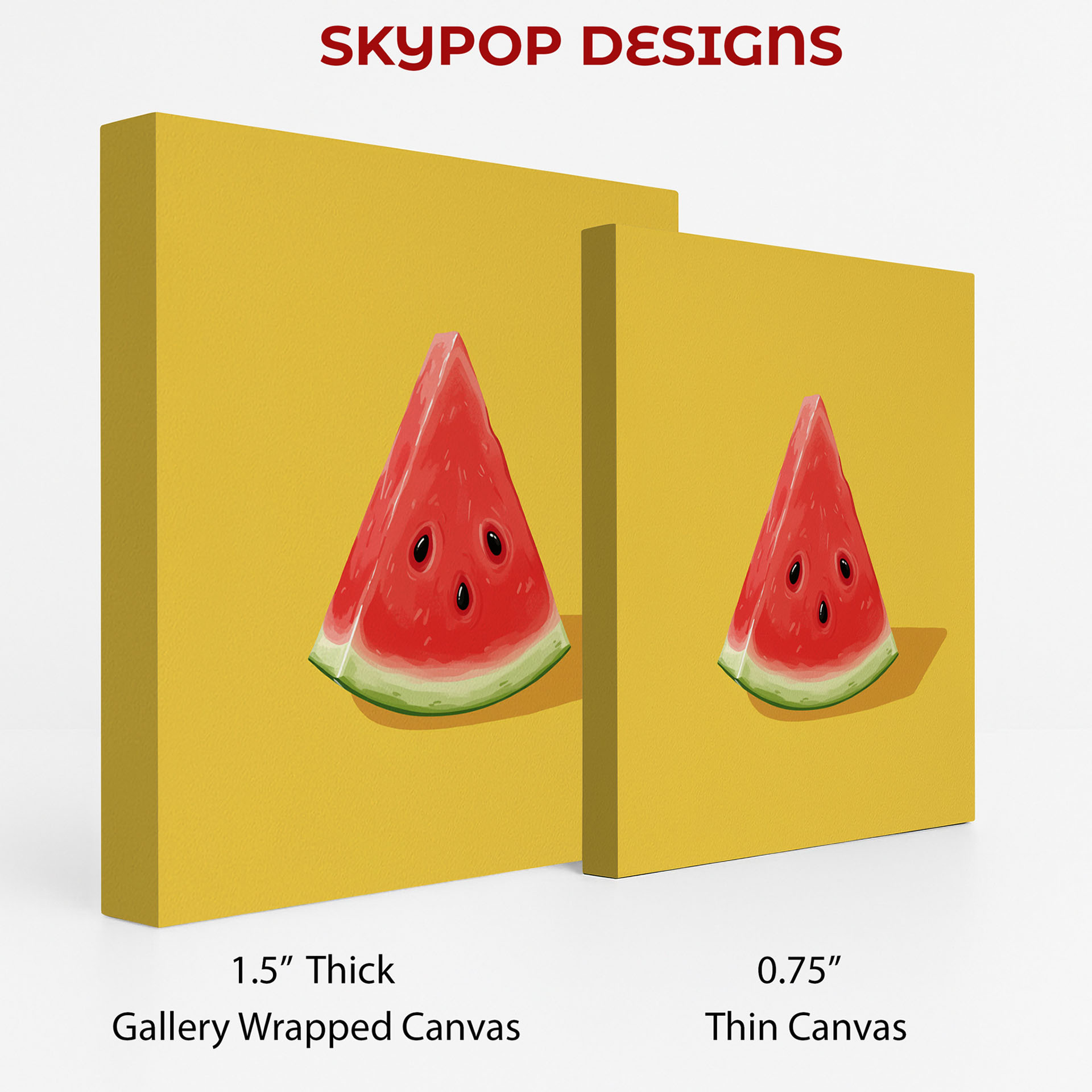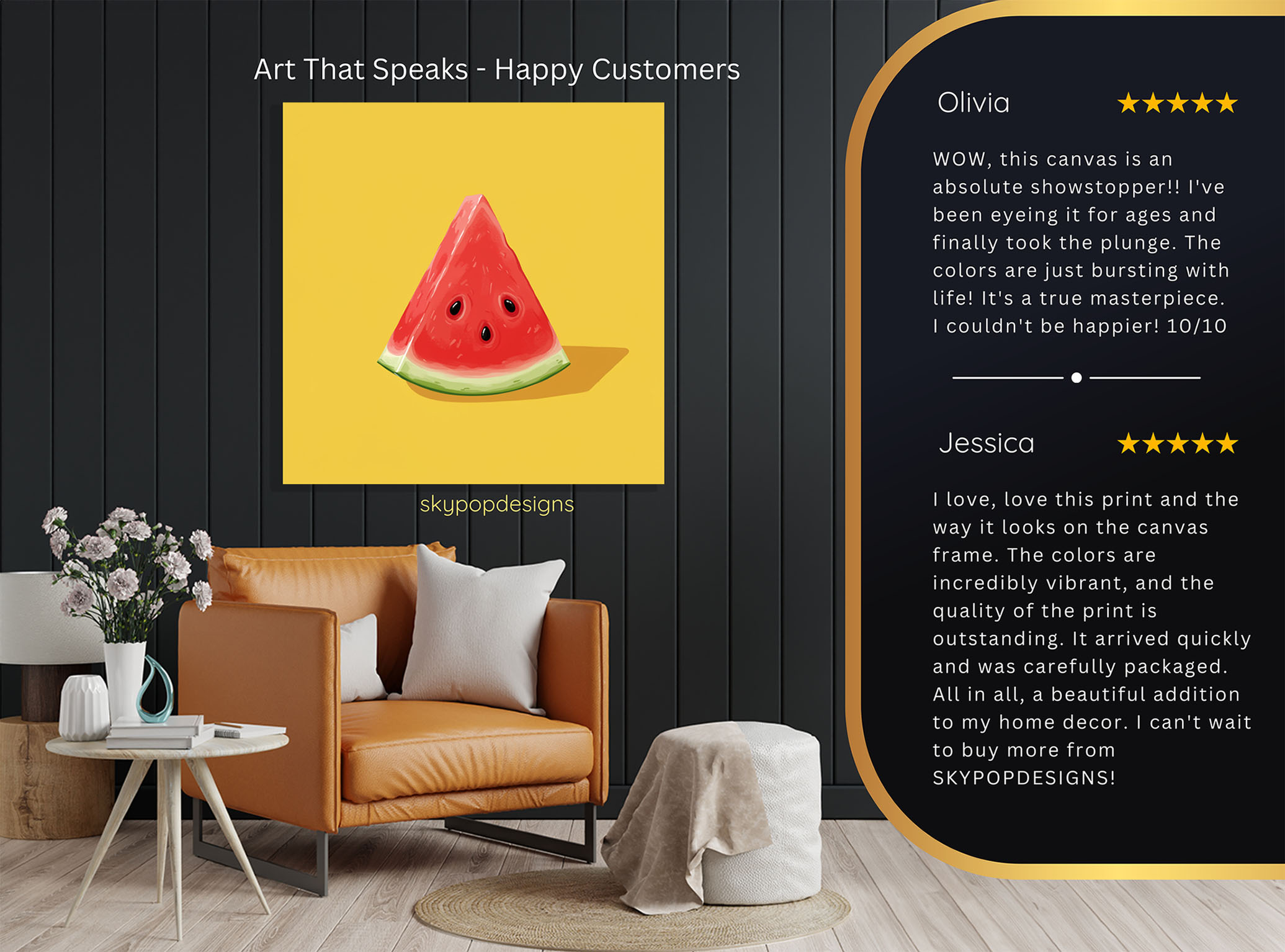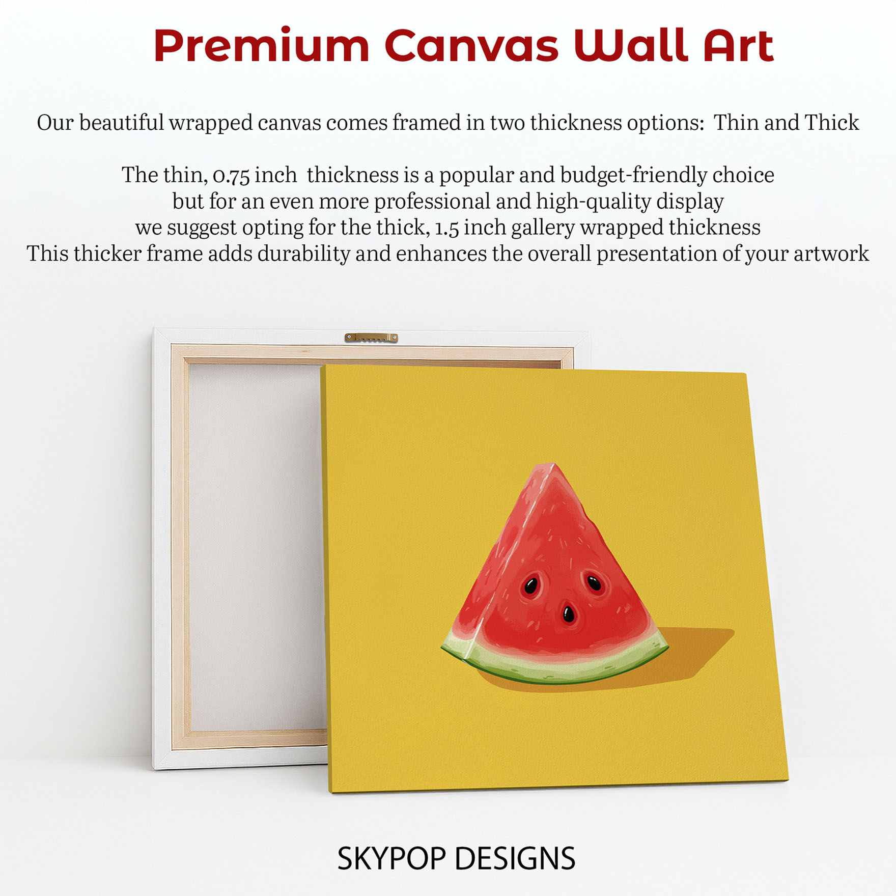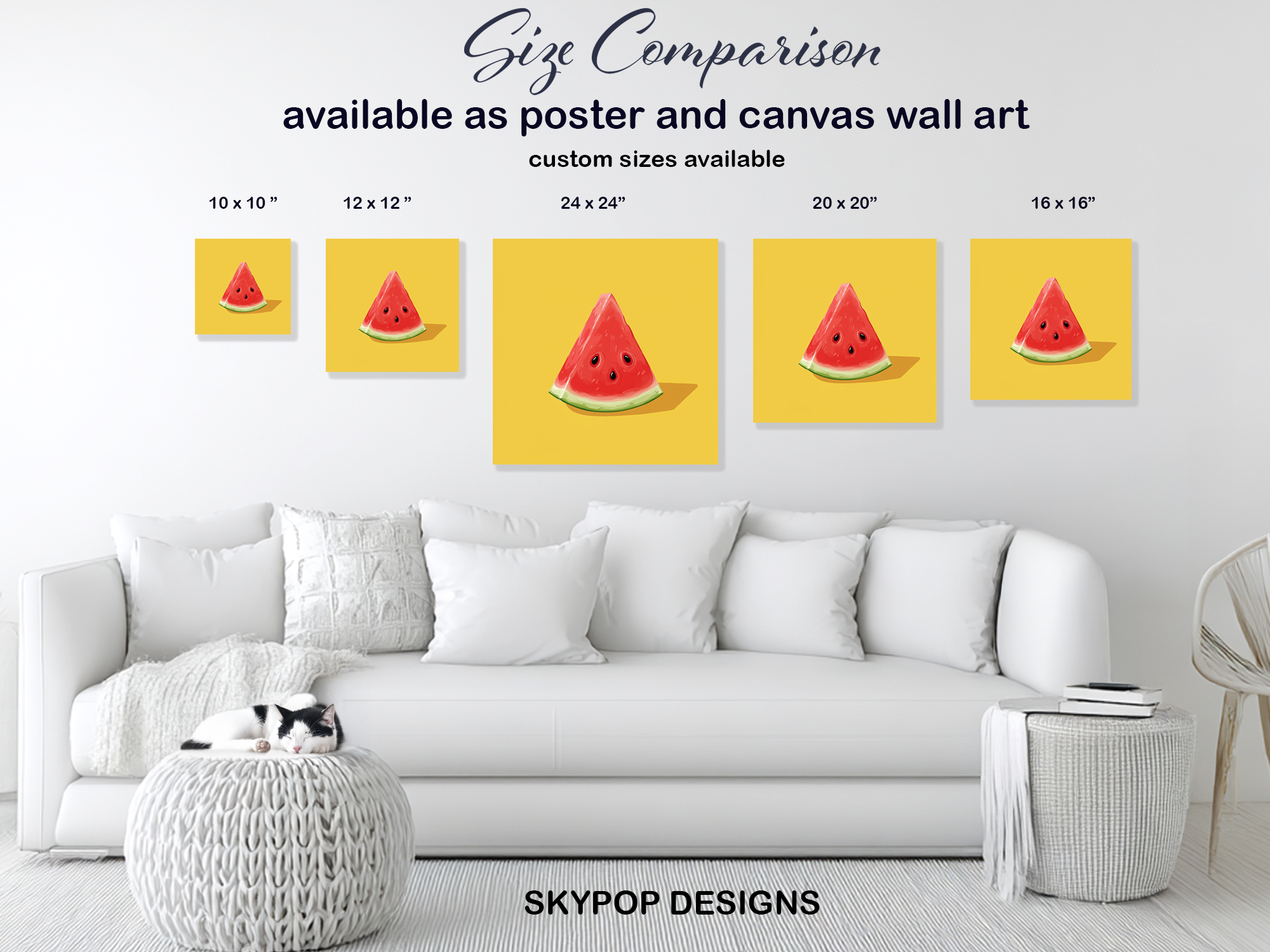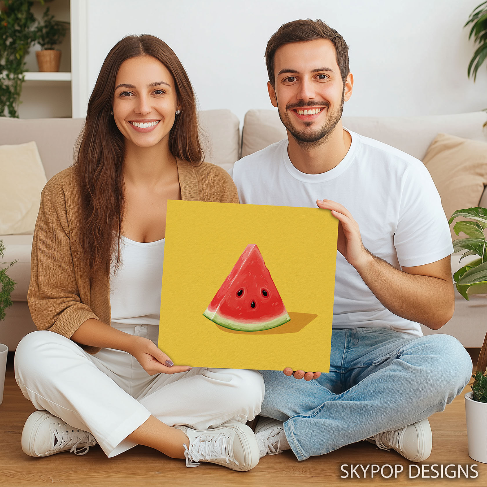Brighten your space with this vibrant watermelon slice canvas wall art that pops with color and modern energy. This eye-catching poster or canvas wall art is a perfect addition for contemporary kitchens or playful children’s rooms, bringing a fresh summer vibe indoors. The striking combination of juicy red watermelon and bright yellow background creates a cheerful and inviting atmosphere. Ideal for modern and Scandinavian decor styles, this piece adds a delightful artistic touch to any room. The clean graphic style and bold colors define this pop art masterpiece, making it a conversation starter. High-quality printing on this canvas wall art ensures the vivid hues and crisp details of the watermelon slice are beautifully showcased. Whether used as a focal point in a living room or as a cheerful accent in a hallway, this artwork inspires happiness and zest for life. This versatile poster or canvas wall art is great for bohemian spaces, adding a touch of playful charm. It also serves as a fantastic gift idea for housewarmings, birthdays, or summer celebrations. Elevate your home decor with this refreshing and energetic watermelon wall art that captures the essence of summer all year round. Add a splash of sweet, vibrant flavor to your walls today with this stunning Watermelon Slice Pop Art.