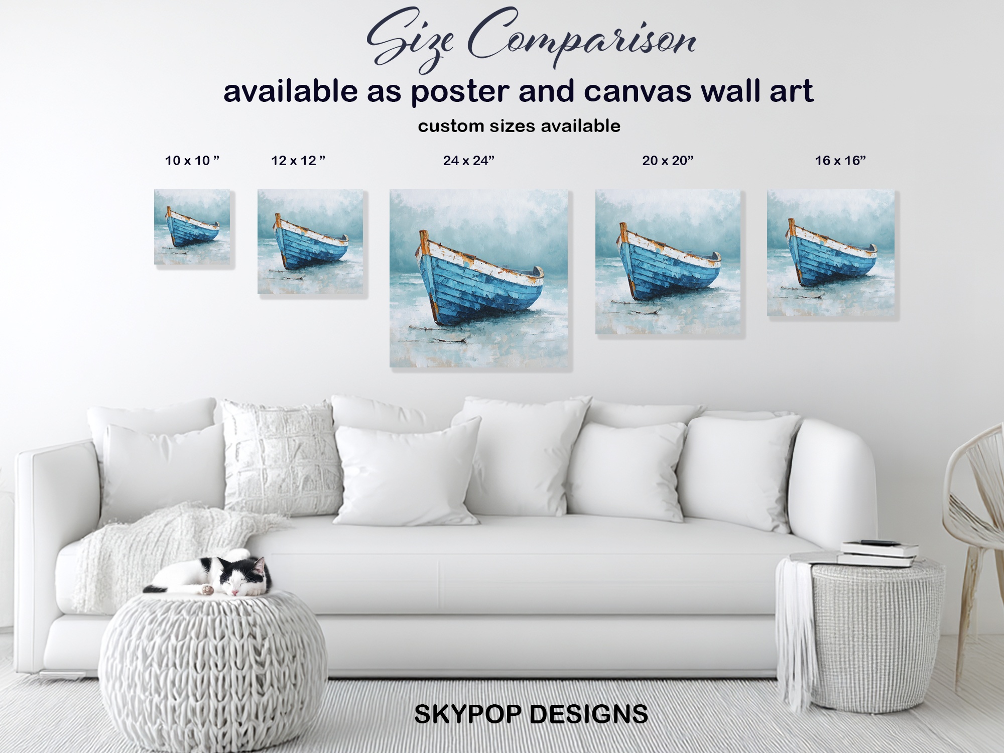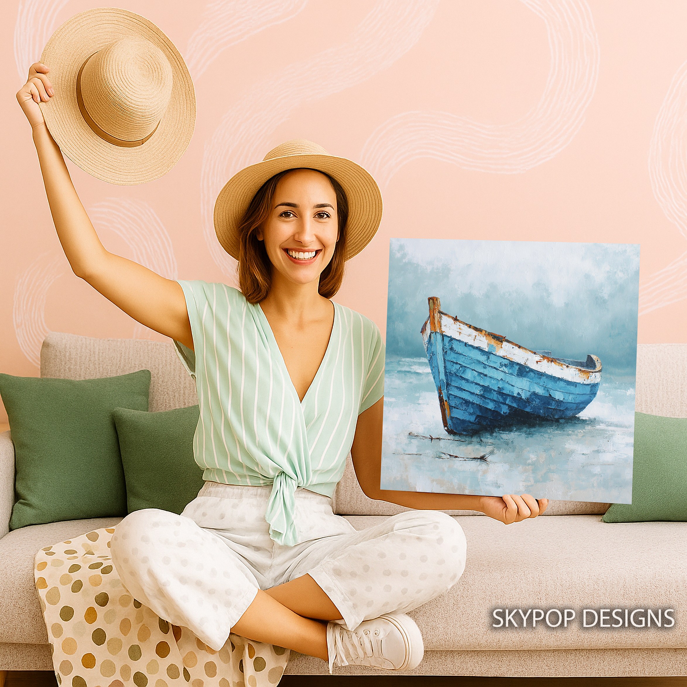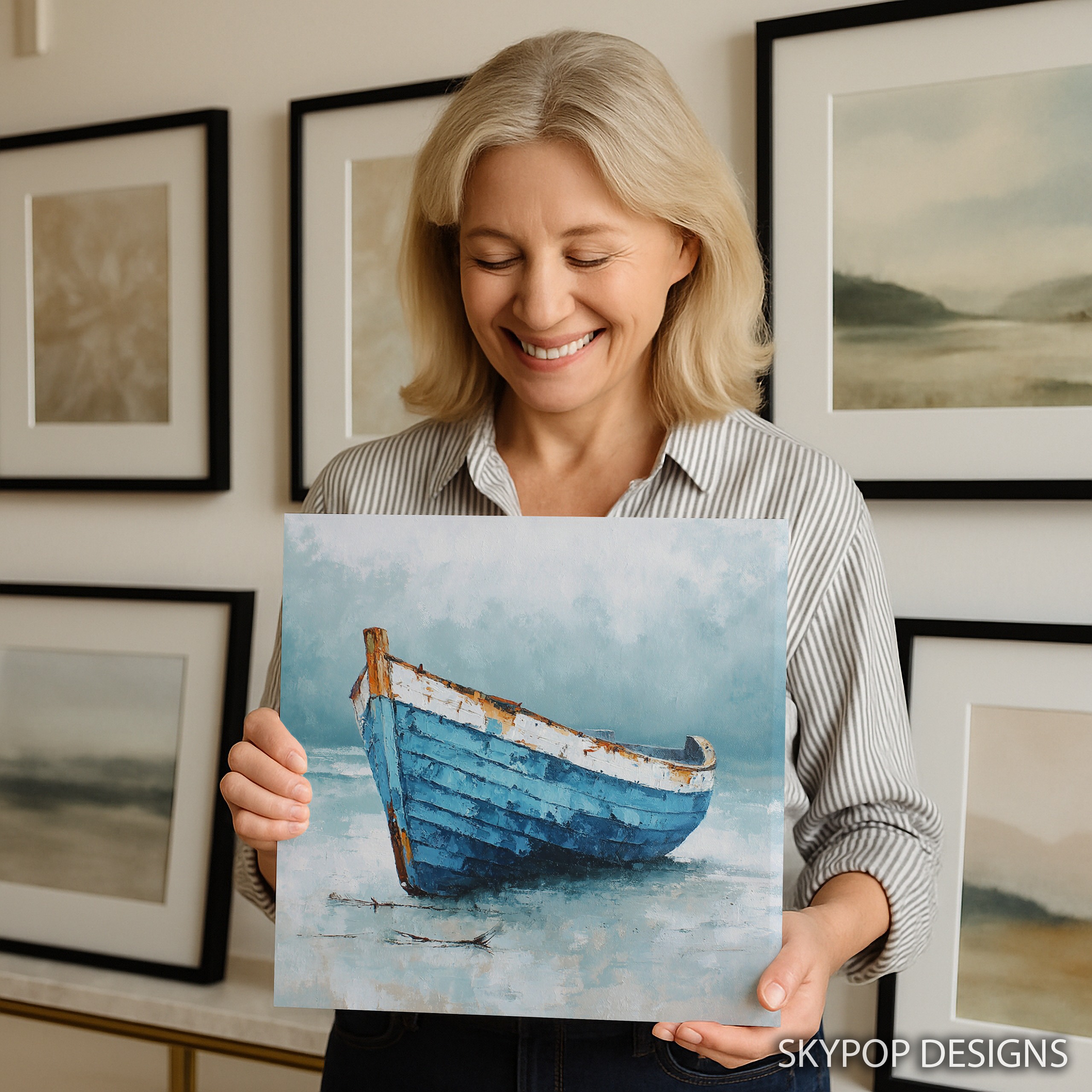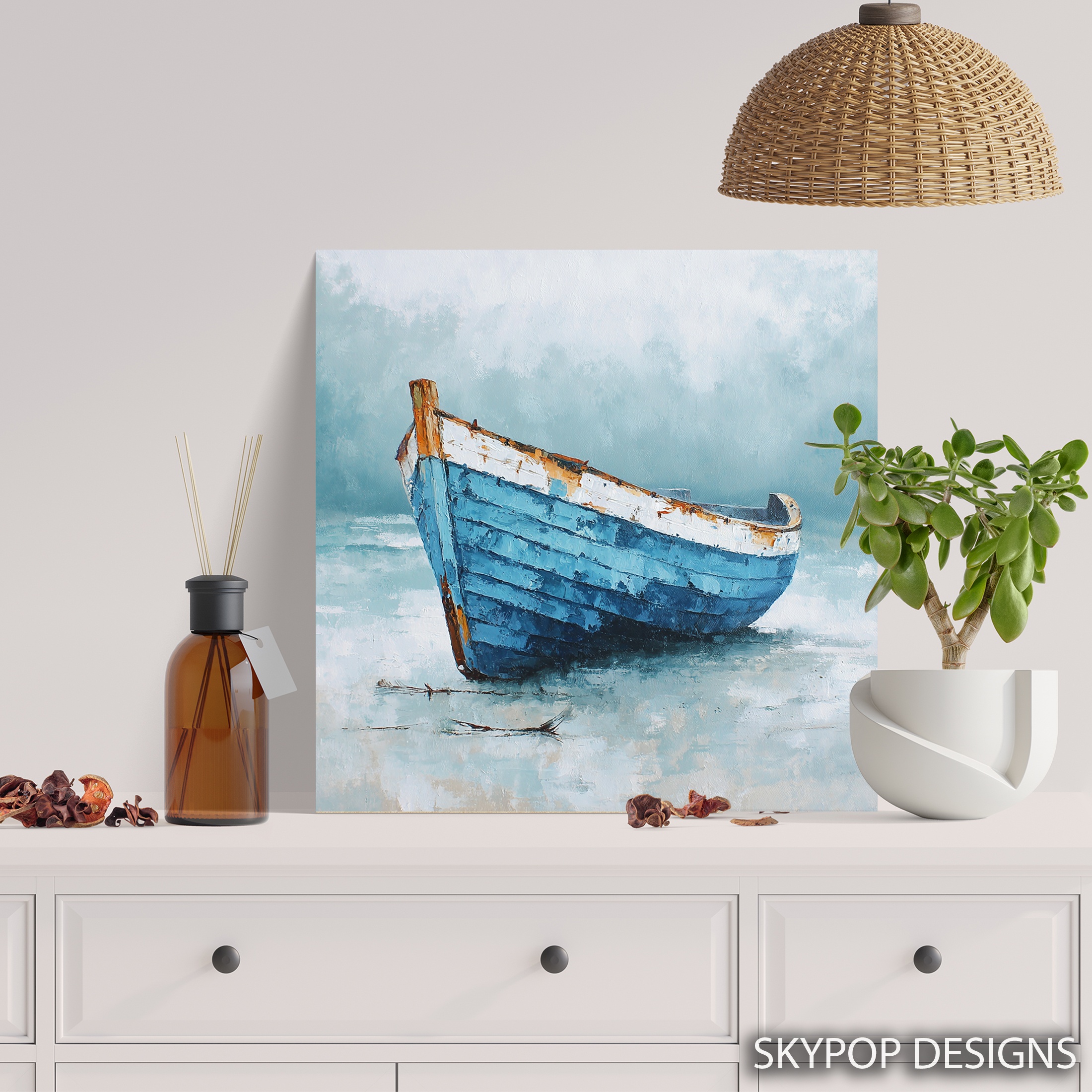 Transform your space with this captivating blue boat canvas wall art, perfect for bringing a touch of coastal charm to any room. The striking image showcases a weathered wooden boat in vibrant shades of blue and white, set against a misty, ethereal background. This stunning poster or canvas print instantly evokes feelings of seaside serenity and nostalgia. Ideal for coastal-inspired decor, the piece adds depth and character to living rooms, bedrooms, or bathrooms. The textured brushstrokes and muted color palette create a sense of timeless beauty, making it a versatile addition to both modern and rustic interiors. The boat’s worn appearance tells a story of adventure and resilience, inspiring viewers to dream of ocean journeys and quiet harbors. This high-quality wall art serves as a focal point in minimalist spaces or complements existing nautical themes. Perfect as a housewarming gift or to refresh your seasonal decor, it adapts beautifully to various room sizes and styles. The artwork’s calming blue tones can help create a relaxing atmosphere in bedrooms or bathrooms, while its nostalgic charm adds warmth to entryways and living areas. Elevate your home’s ambiance with this unique blend of contemporary style and timeless coastal imagery. Make this eye-catching blue boat art the centerpiece of your wall decor collection today.