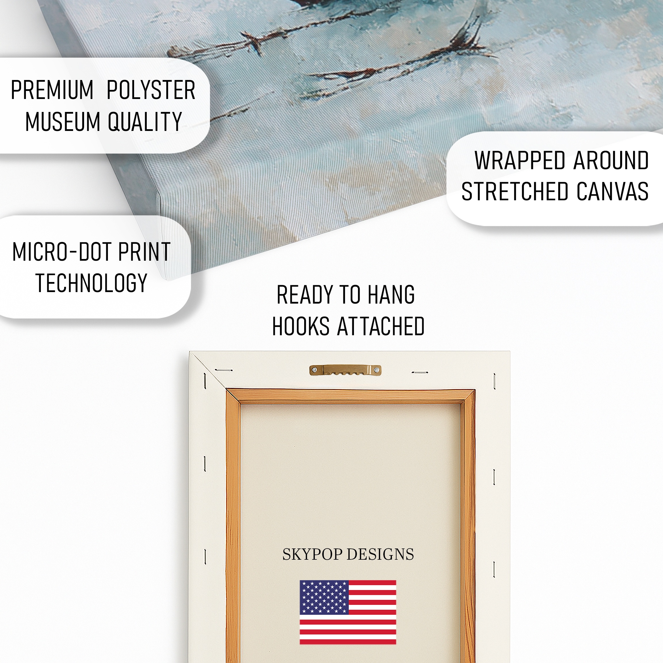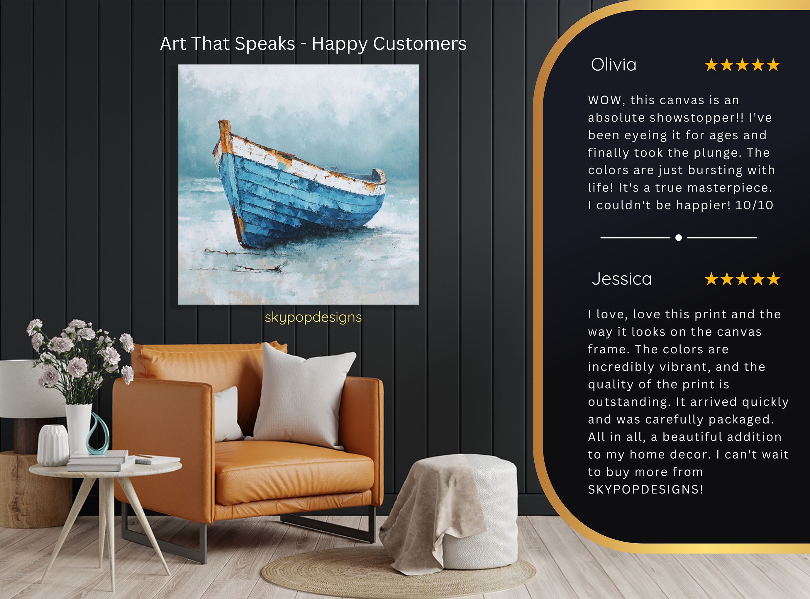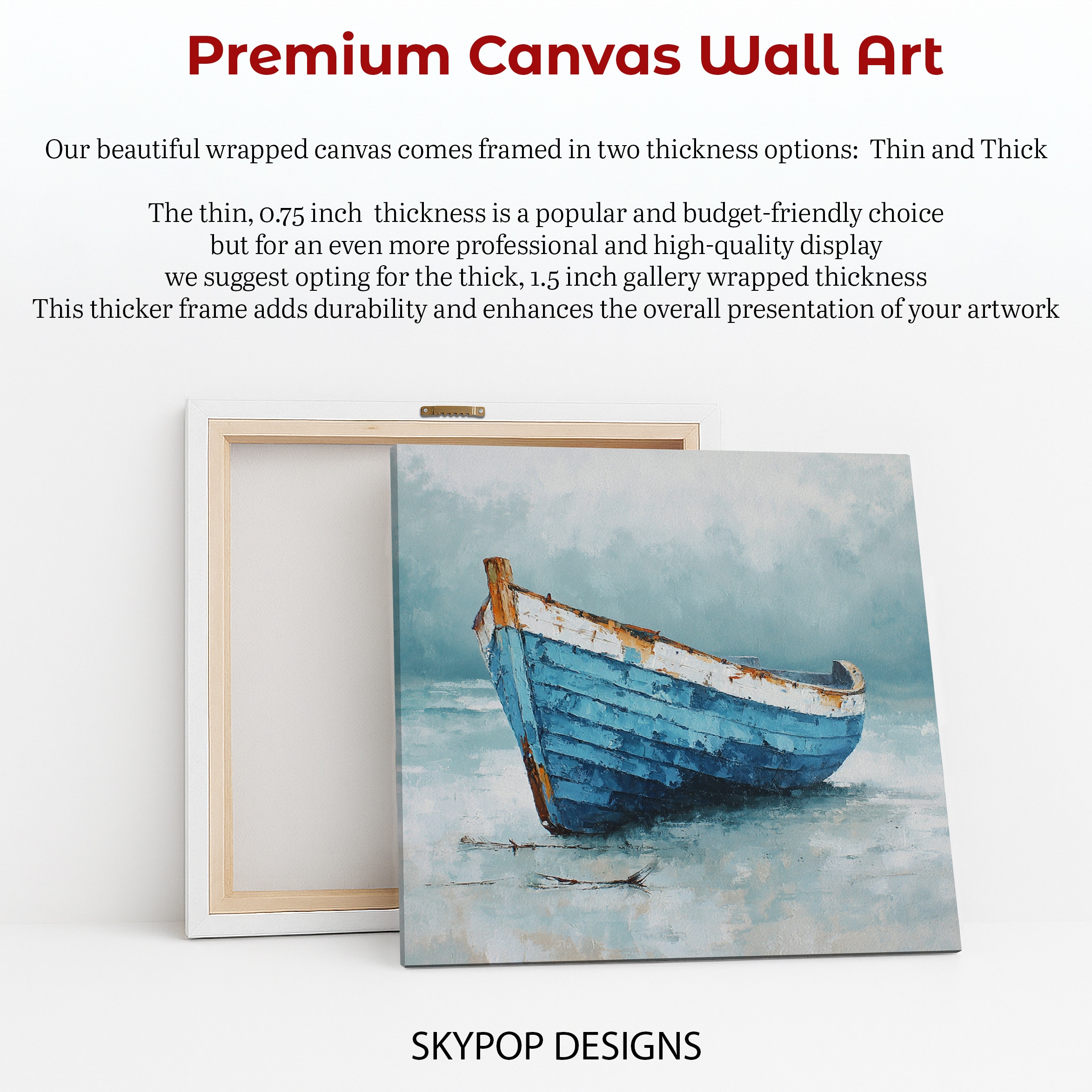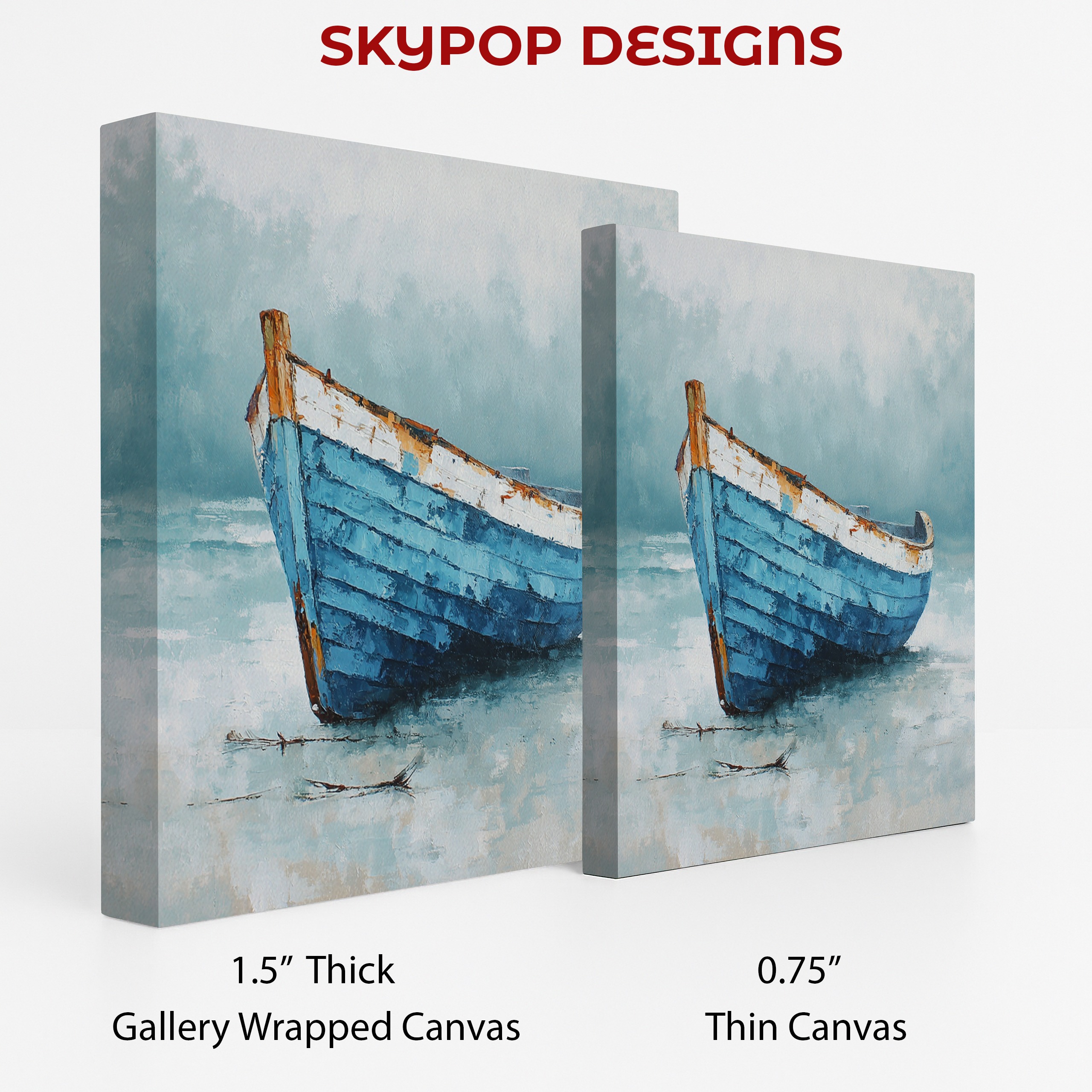 Transform your space with this captivating blue boat canvas wall art, perfect for bringing a touch of coastal charm to any room. The striking image showcases a weathered wooden boat in vibrant shades of blue and white, set against a misty, ethereal background. This stunning poster or canvas print instantly evokes feelings of seaside serenity and nostalgia. Ideal for coastal-inspired decor, the piece adds depth and character to living rooms, bedrooms, or bathrooms. The textured brushstrokes and muted color palette create a sense of timeless beauty, making it a versatile addition to both modern and rustic interiors. The boat’s worn appearance tells a story of adventure and resilience, inspiring viewers to dream of ocean journeys and quiet harbors. This high-quality wall art serves as a focal point in minimalist spaces or complements existing nautical themes. Perfect as a housewarming gift or to refresh your seasonal decor, it adapts beautifully to various room sizes and styles. The artwork’s calming blue tones can help create a relaxing atmosphere in bedrooms or bathrooms, while its nostalgic charm adds warmth to entryways and living areas. Elevate your home’s ambiance with this unique blend of contemporary style and timeless coastal imagery. Make this eye-catching blue boat art the centerpiece of your wall decor collection today.