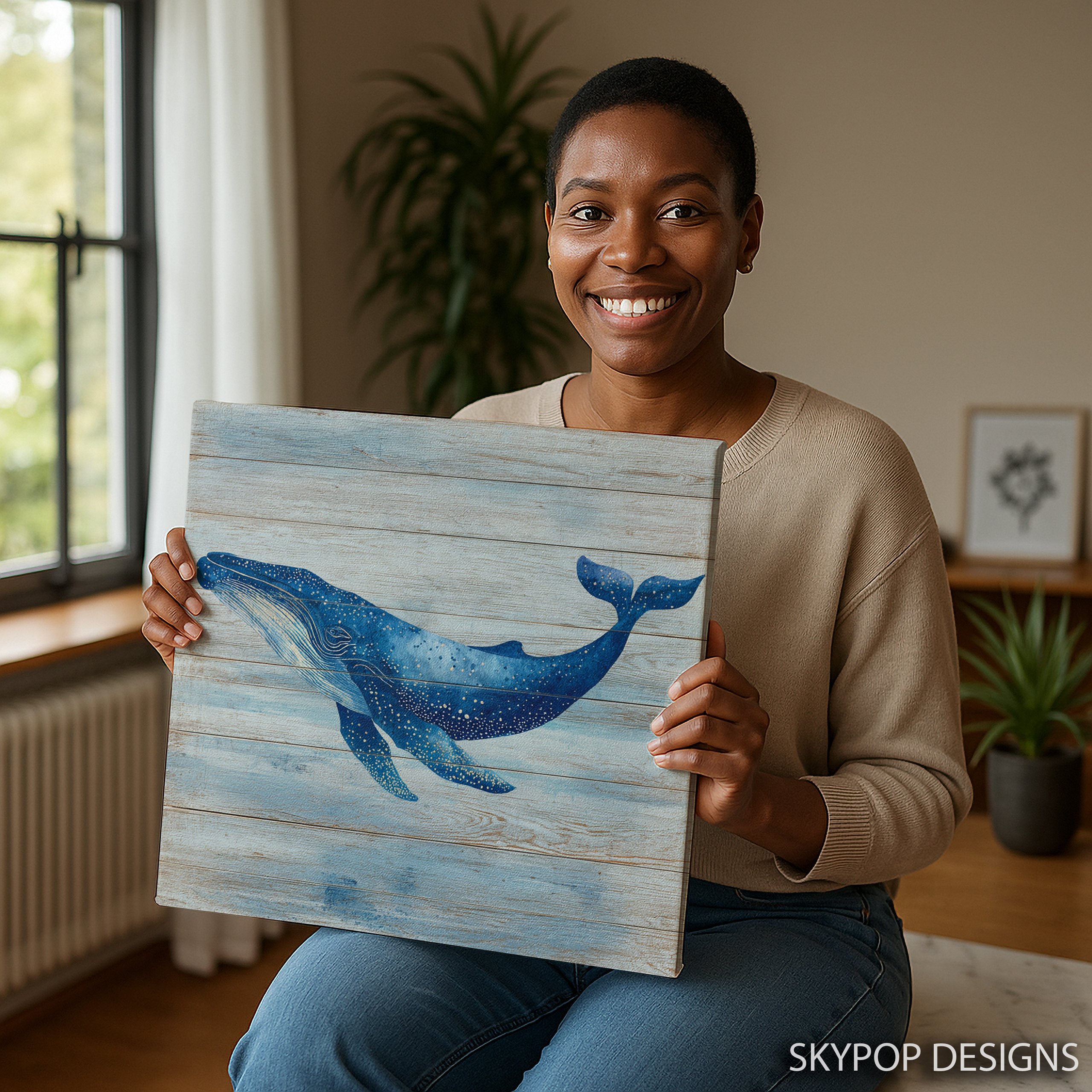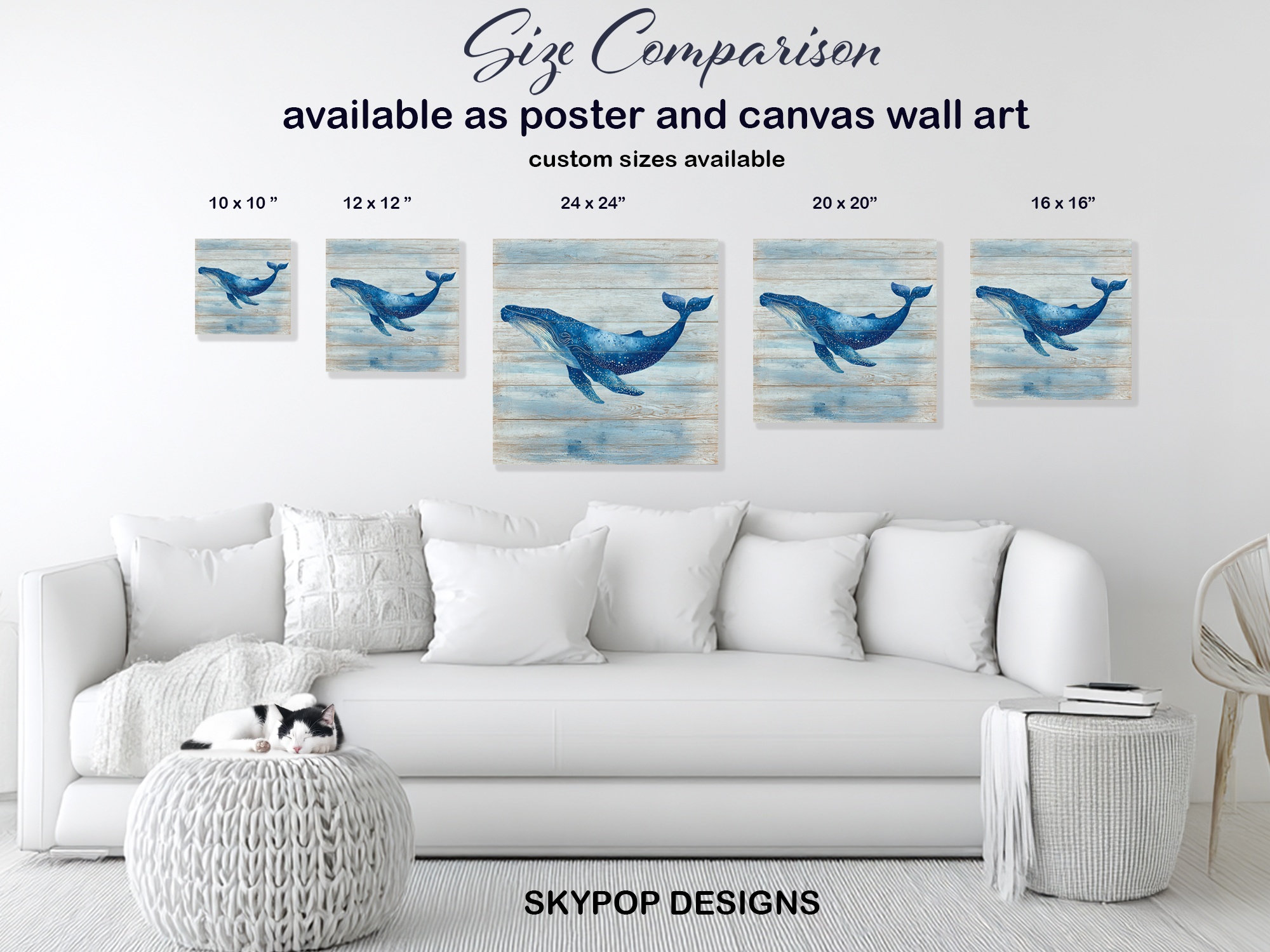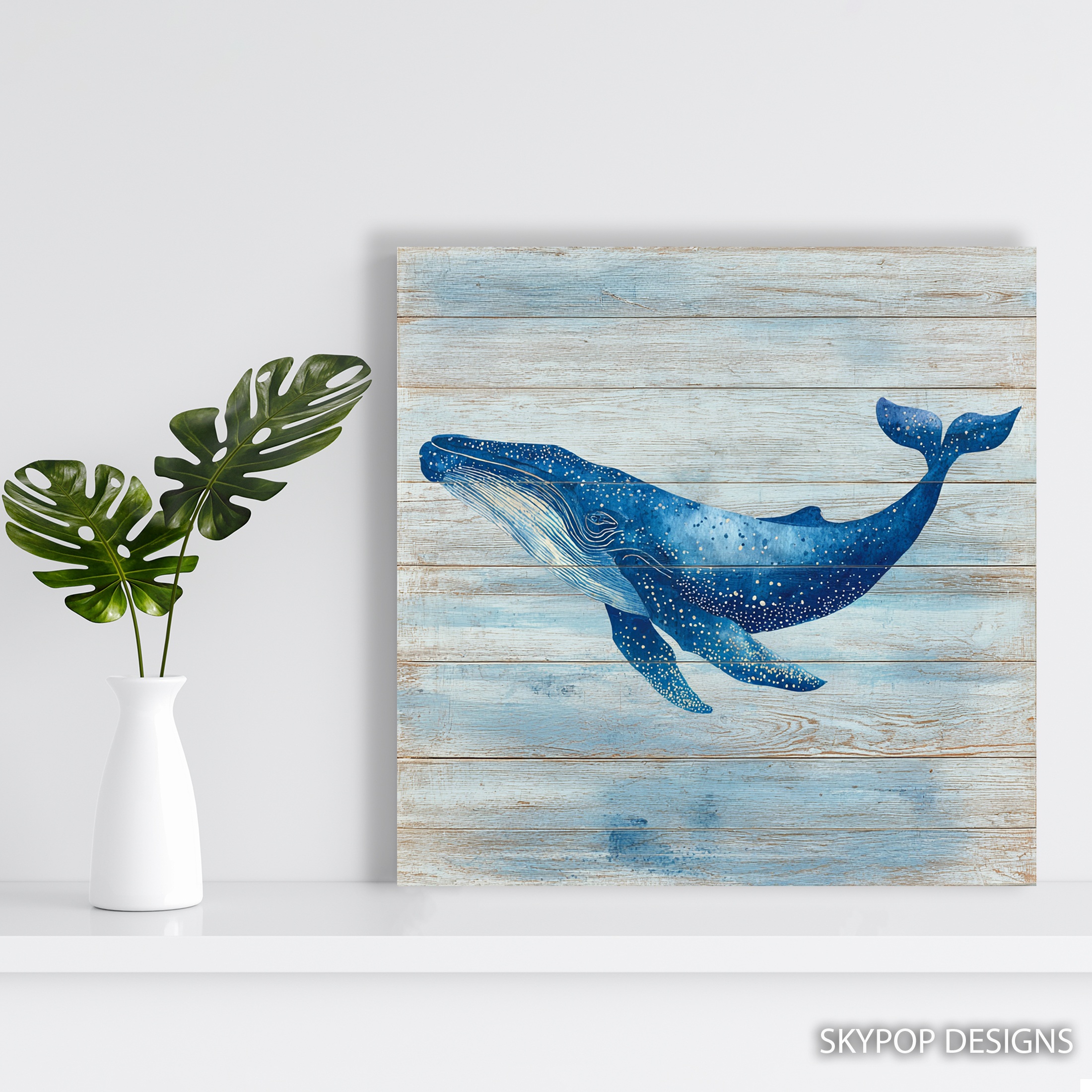 Dive into serenity with this stunning blue whale canvas wall art, perfect for transforming your space into a coastal oasis. The majestic whale, adorned with shimmering gold speckles, swims gracefully across a weathered wood background, creating a captivating blend of rustic charm and modern elegance. This eye-catching poster brings the calming essence of the ocean into your home, making it ideal for contemporary bathrooms, coastal-themed bedrooms, or modern living rooms seeking a touch of nature. The deep blue hues of the whale evoke a sense of tranquility, while the gold accents add a luxurious sparkle that catches the light beautifully. Versatile in size, this canvas art works wonderfully as a statement piece or as part of a curated gallery wall. The detailed artwork captures the whale’s gentle eye and streamlined form, celebrating the beauty of marine life. Perfect as a thoughtful housewarming gift or to elevate your own decor, this whale wall art inspires a connection to nature and the sea. The high-quality printing ensures every intricate detail shines, from the textured wood grain to the whale’s starry pattern. Whether you’re creating a relaxing bathroom retreat, a serene bedroom sanctuary, or a nature-inspired office space, this whale artwork brings a sense of wonder and coastal calm. Enhance your home’s atmosphere with this unique blend of animal art and contemporary style that celebrates the majesty of the ocean. Transform your walls and bring the beauty of the sea indoors with this enchanting whale canvas art today.