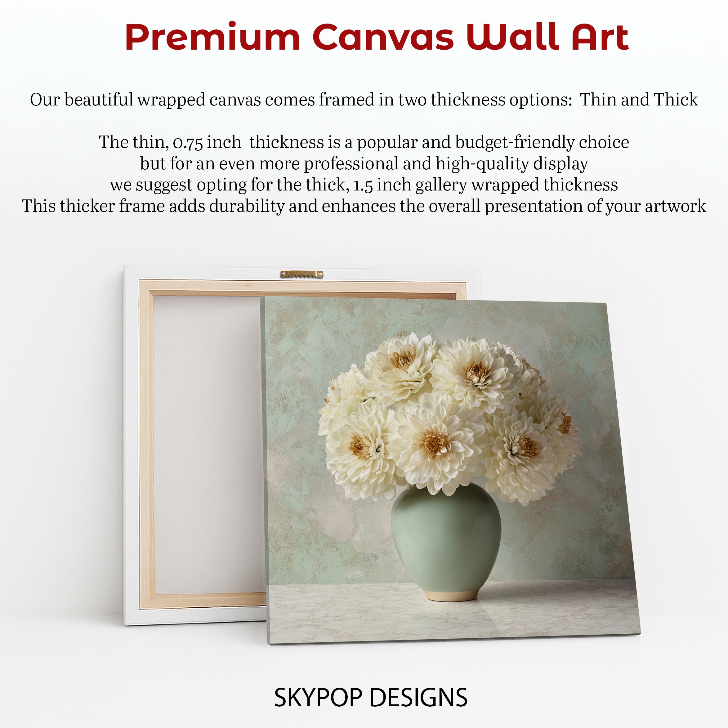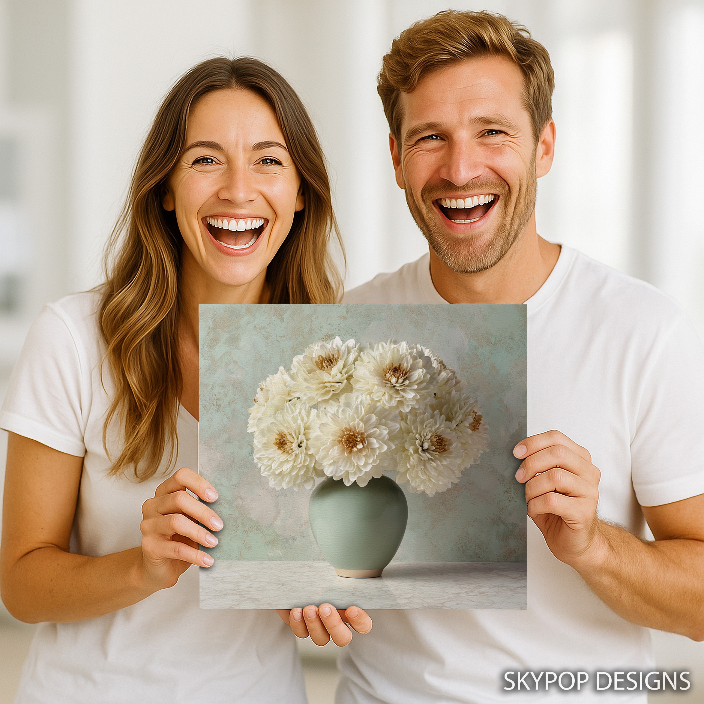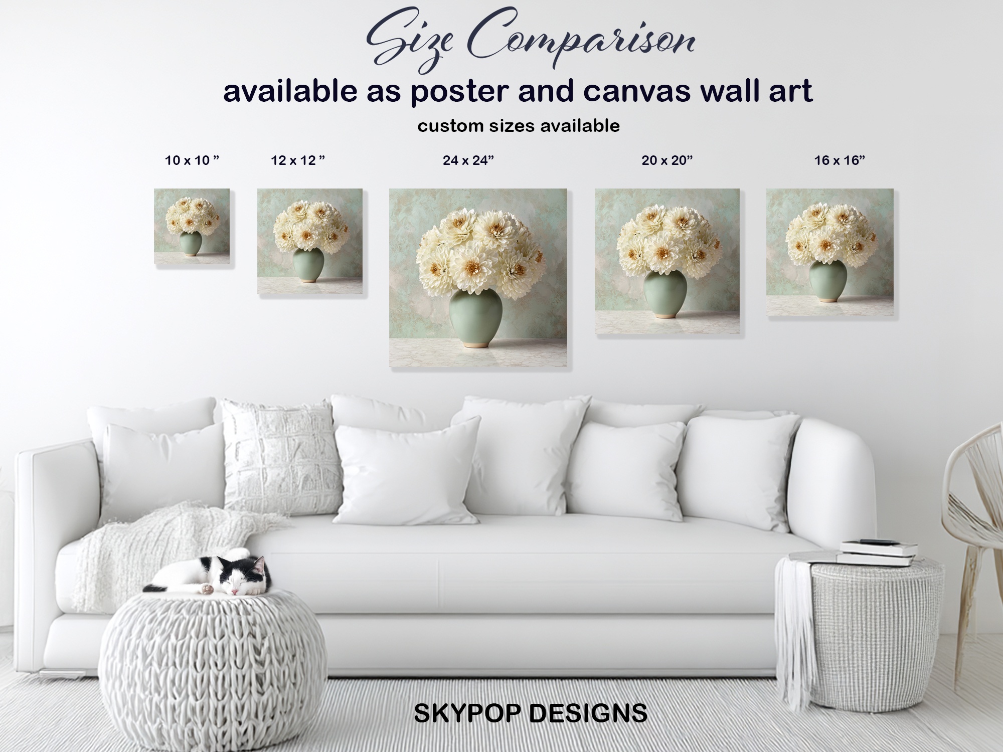 Elevate your home decor with this stunning white dahlia bouquet canvas wall art, capturing the timeless elegance of classic floral arrangements. This breathtaking poster showcases a lush display of creamy white dahlias in full bloom, artfully arranged in a soft green vase against a delicate, textured background. Perfect for adding a touch of sophistication to your living room or creating a serene focal point in your bedroom, this canvas art brings the beauty of nature indoors. The neutral color palette of whites and soft greens complements a wide range of interior styles, from shabby chic to traditional French country decor. Ideal for enhancing dining room ambiance or welcoming guests in your entryway, this floral still life print exudes tranquility and refined taste. The high-quality canvas ensures every petal is rendered in exquisite detail, creating a lifelike presence that will draw admiration from visitors. Whether you’re looking to refresh your seasonal decor or searching for the perfect housewarming gift, this versatile artwork adapts beautifully to various spaces and occasions. Transform your walls with this timeless floral masterpiece, celebrating the simple yet profound beauty of white dahlias in full bloom. Bring a touch of classic elegance to your home today with this captivating dahlia bouquet wall art.